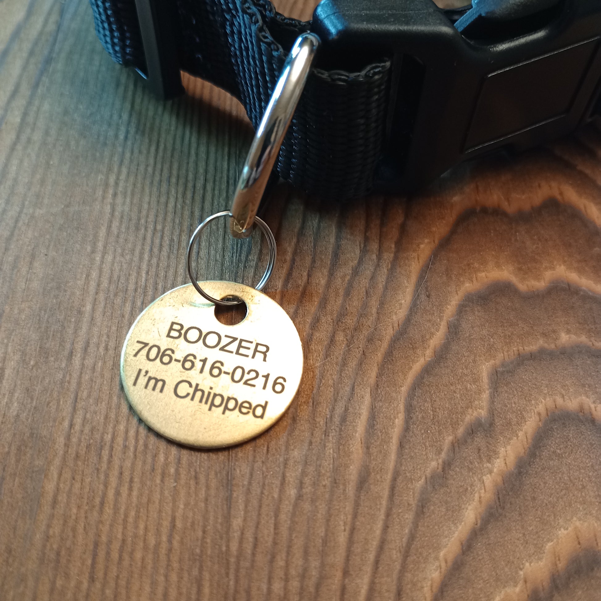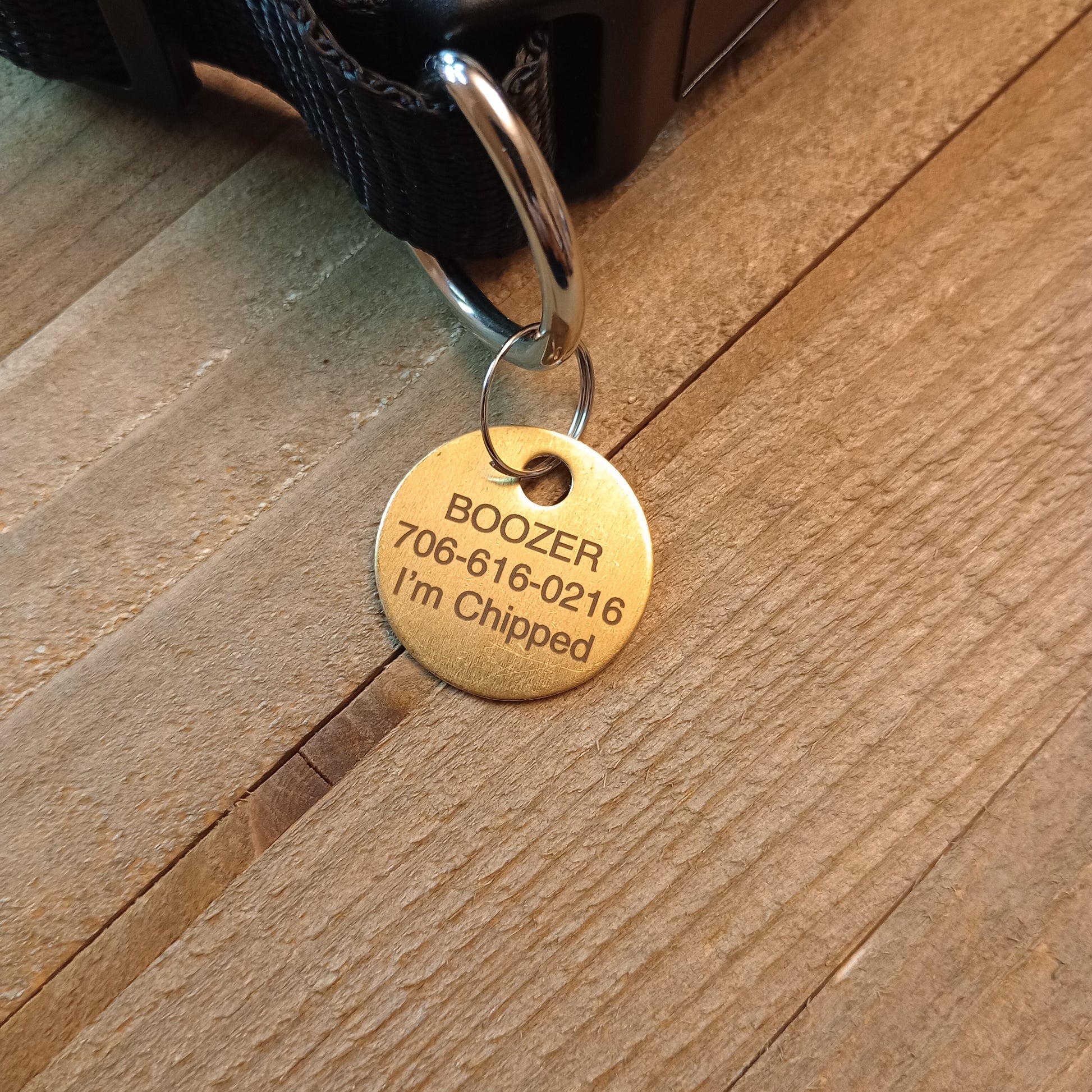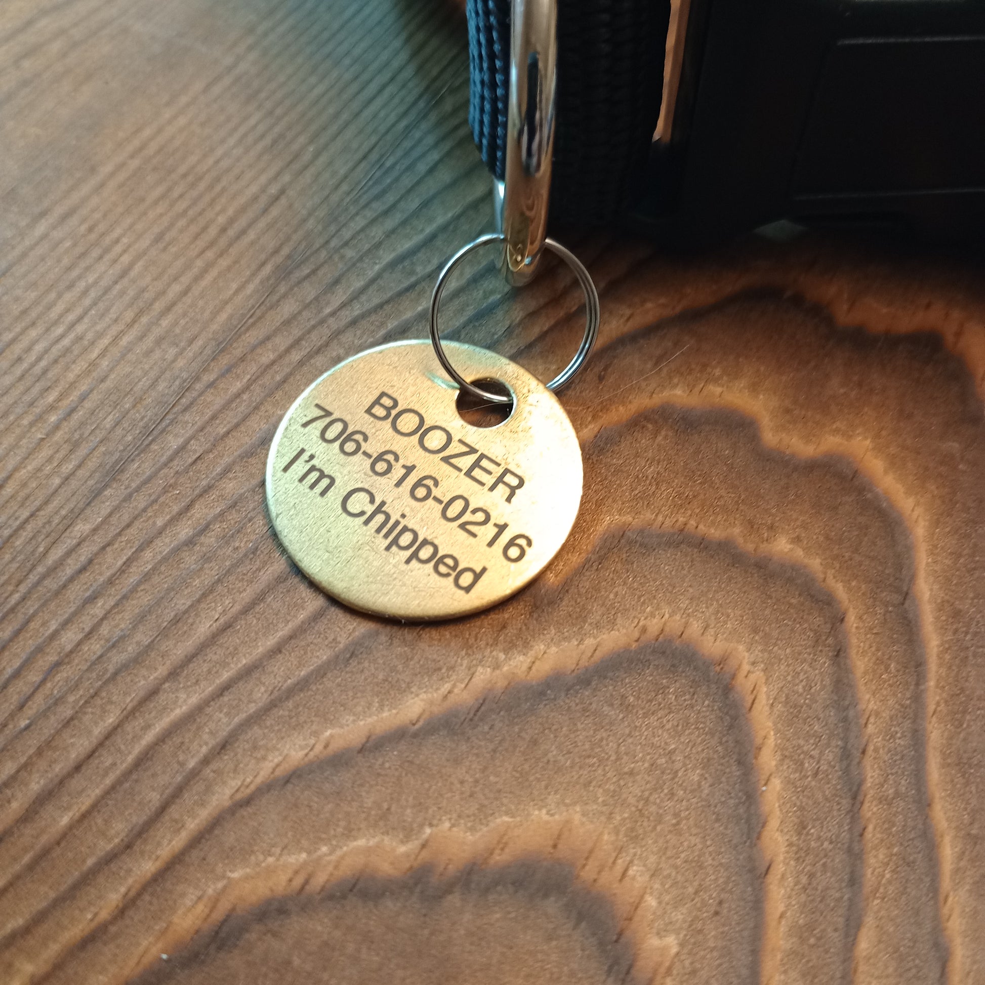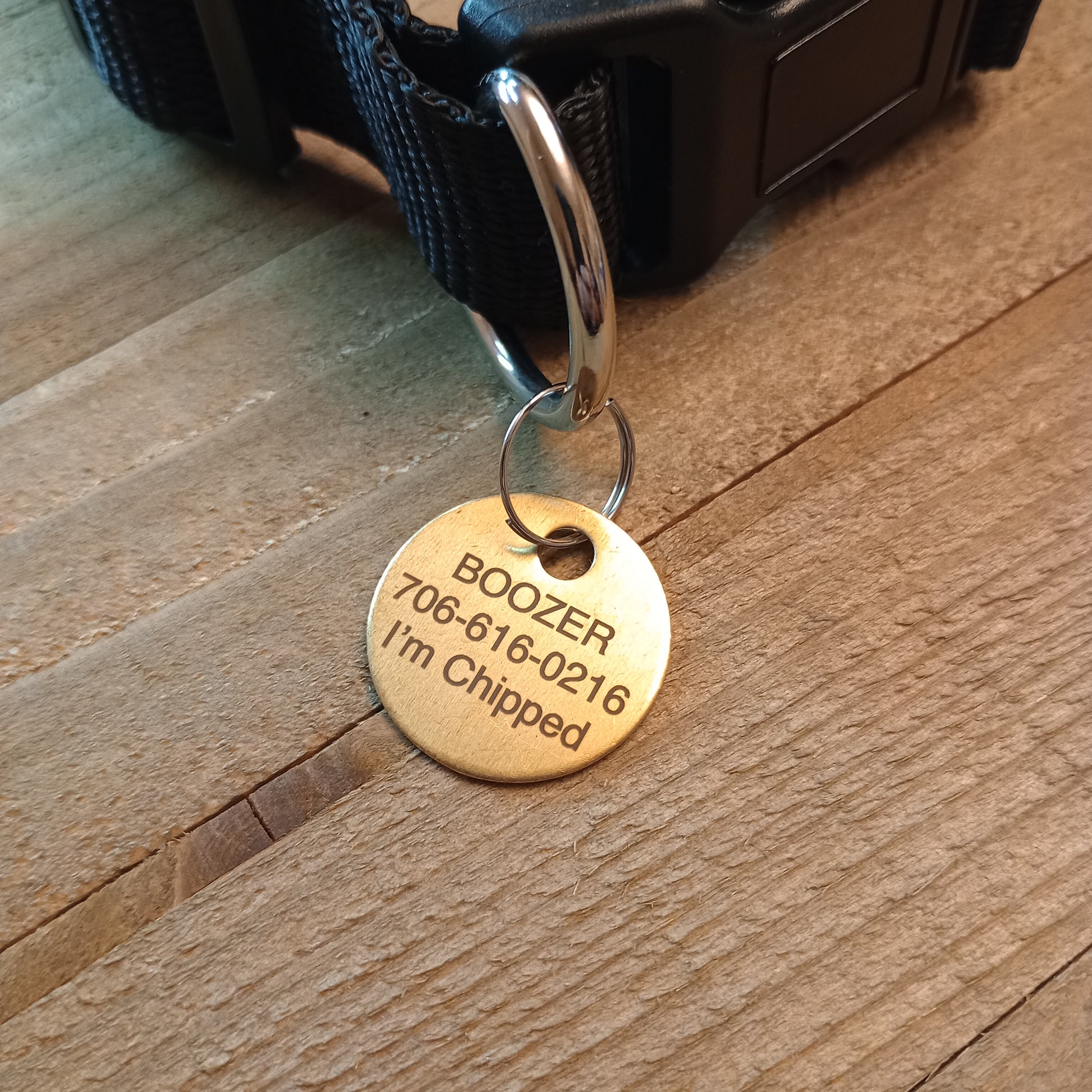 This is a 1 inch in diameter solid brass pet tag which is able to have 4 lines of text engraved on the front and back.