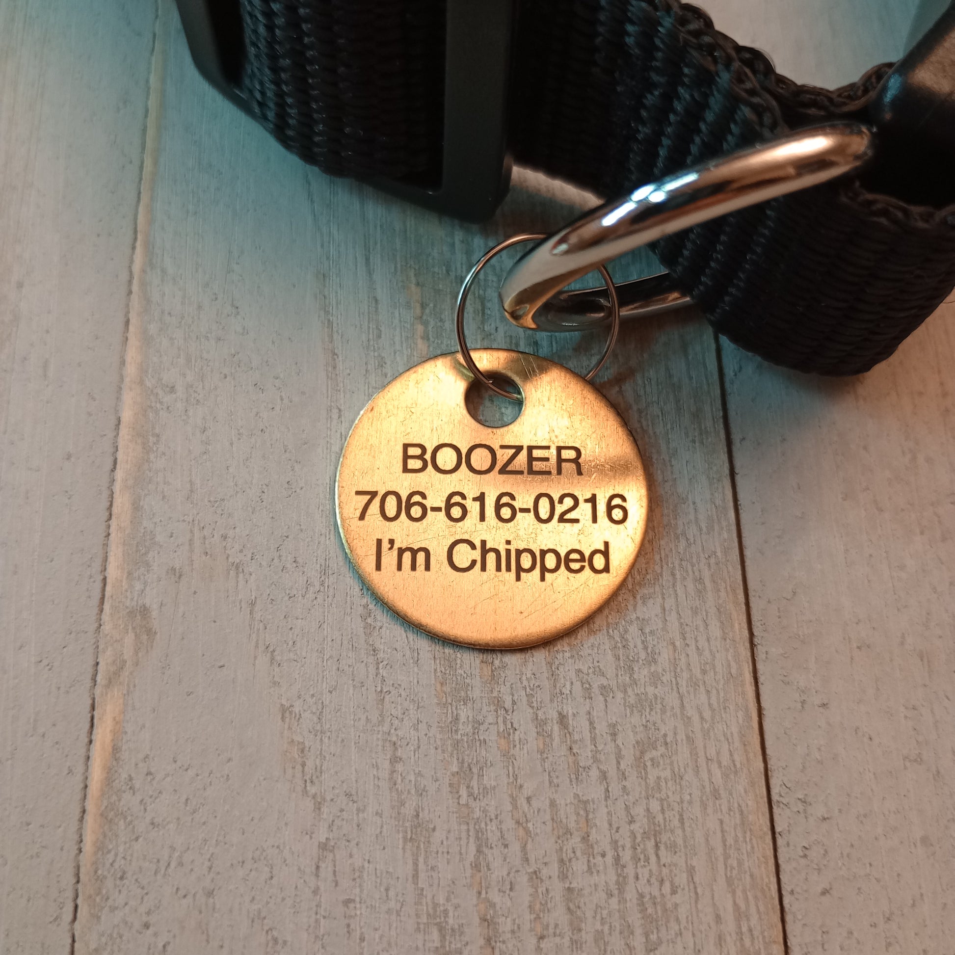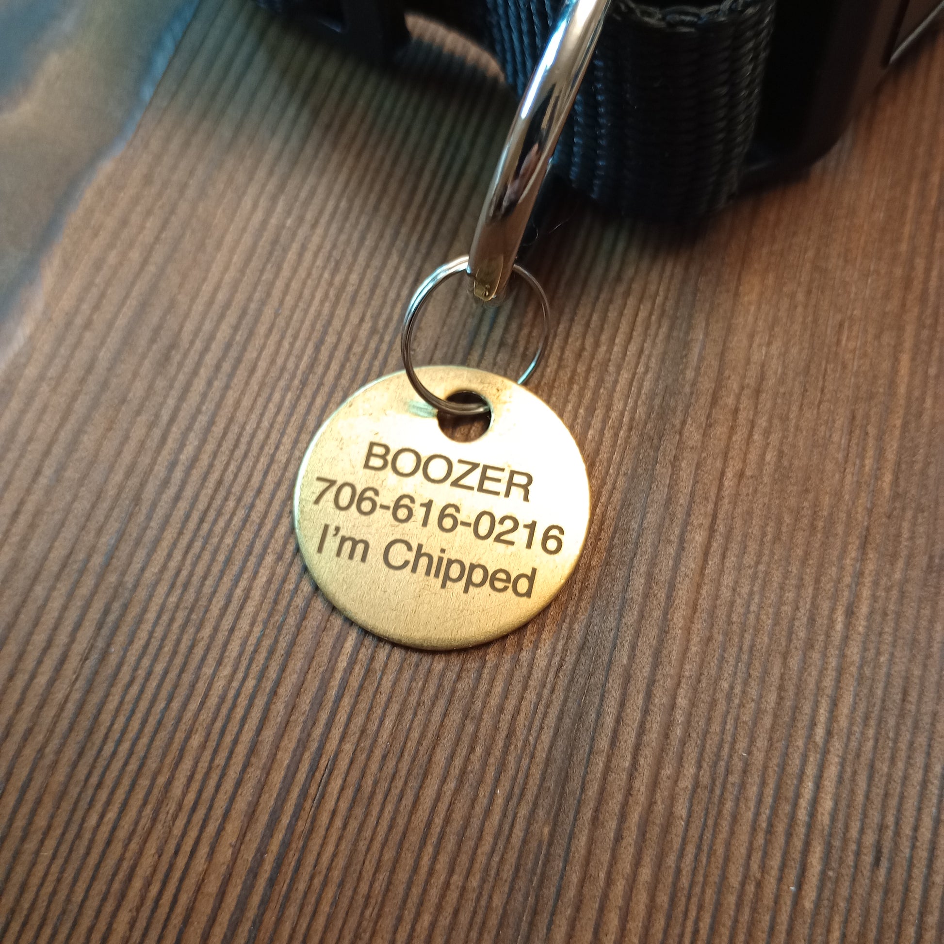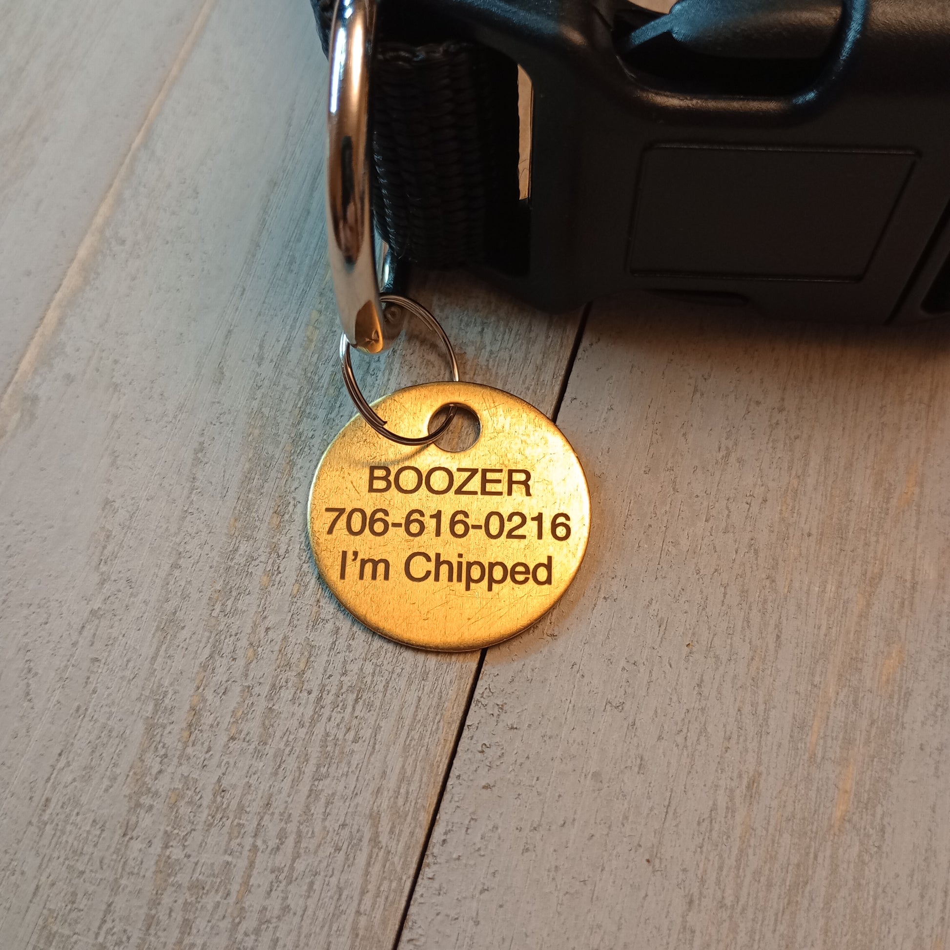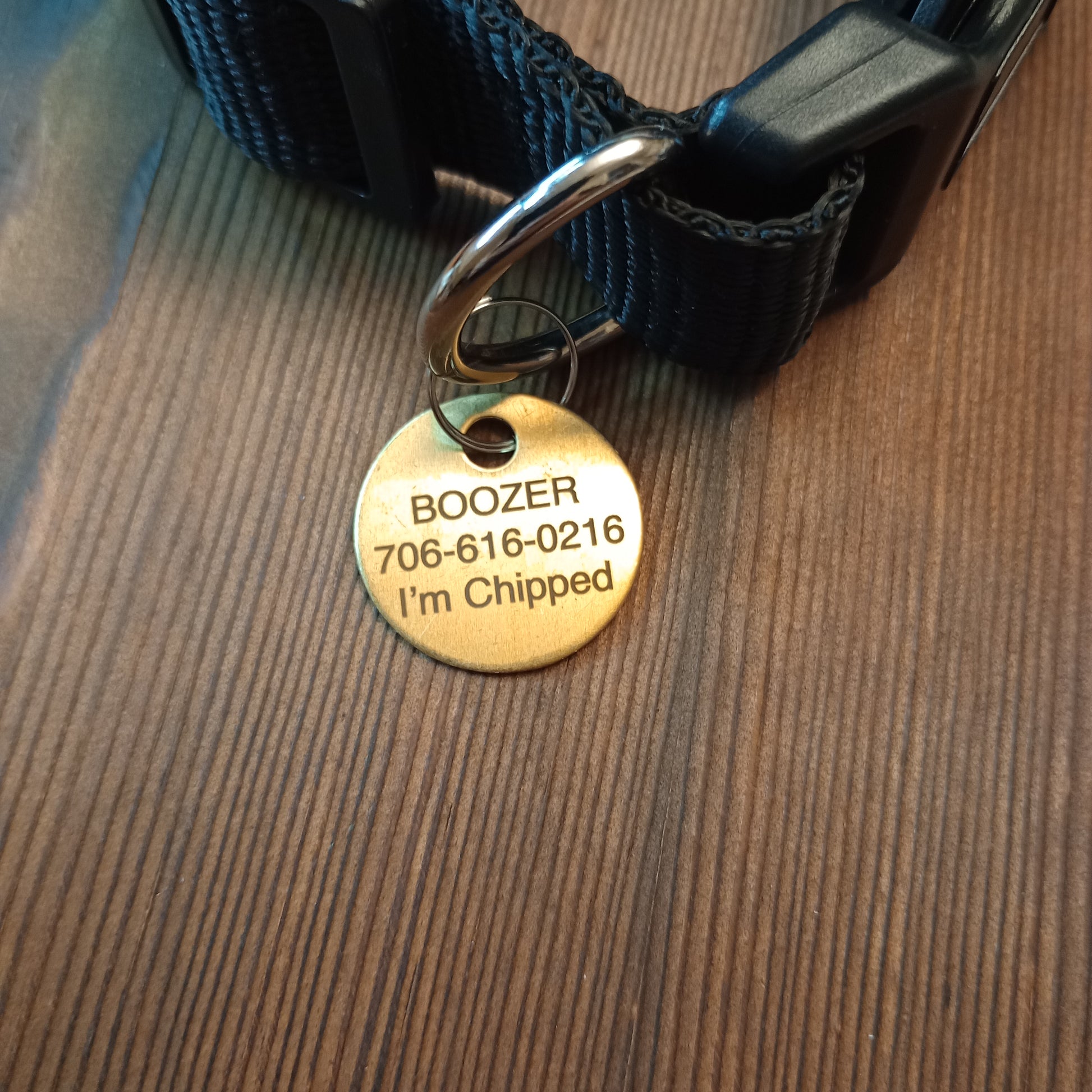 This is a 1 inch in diameter solid brass pet tag which is able to have 4 lines of text engraved on the front and back.