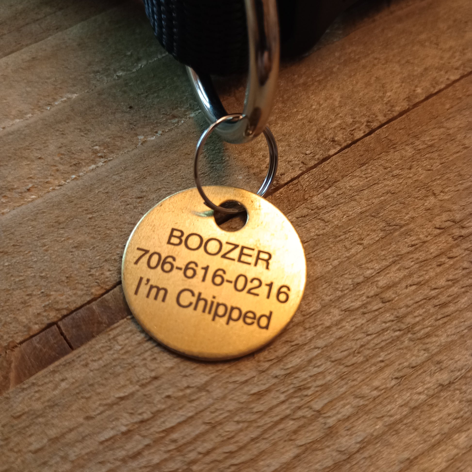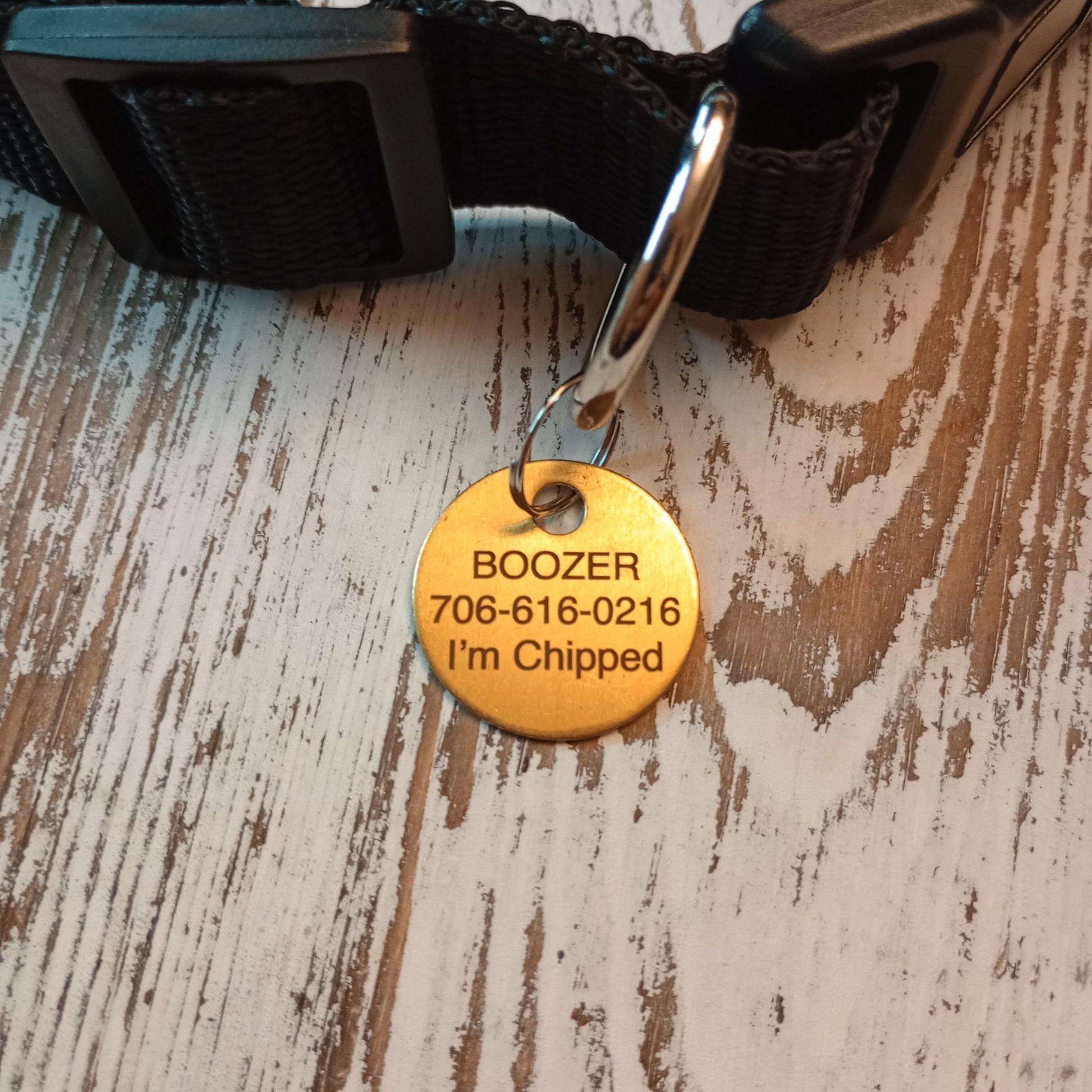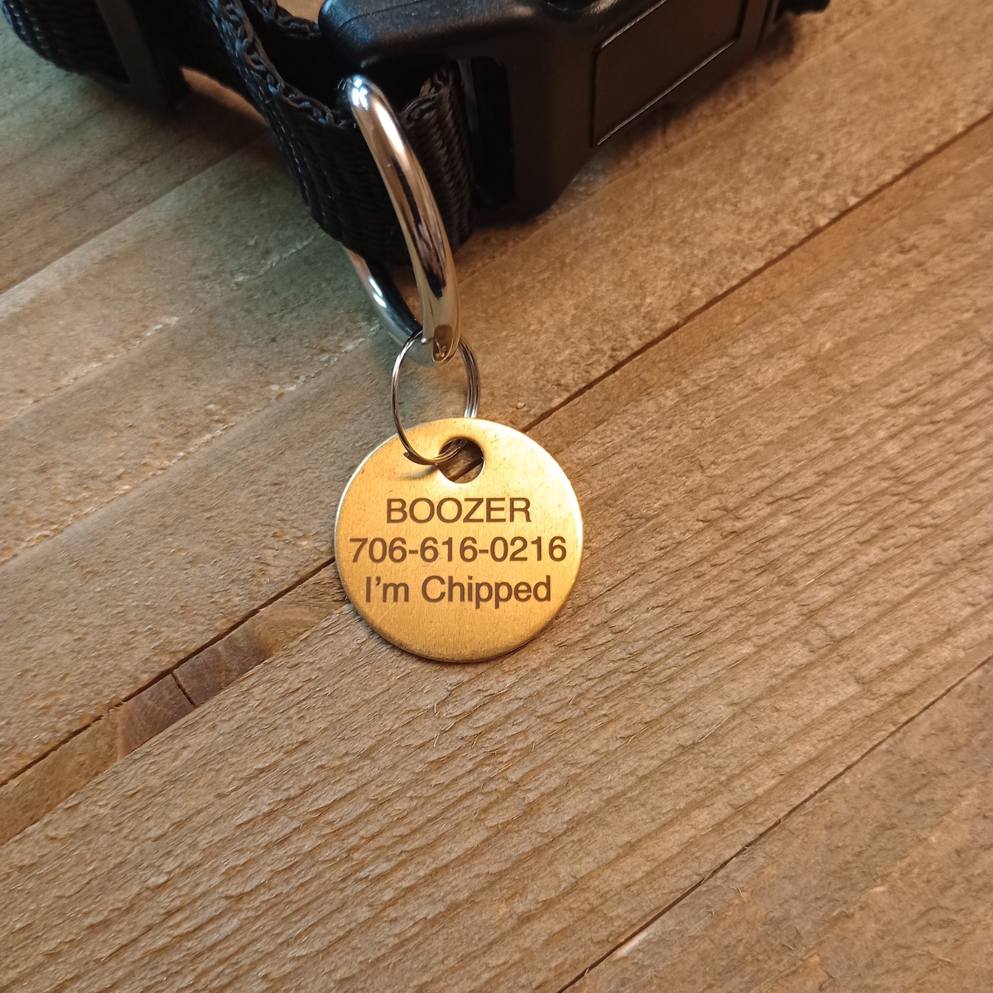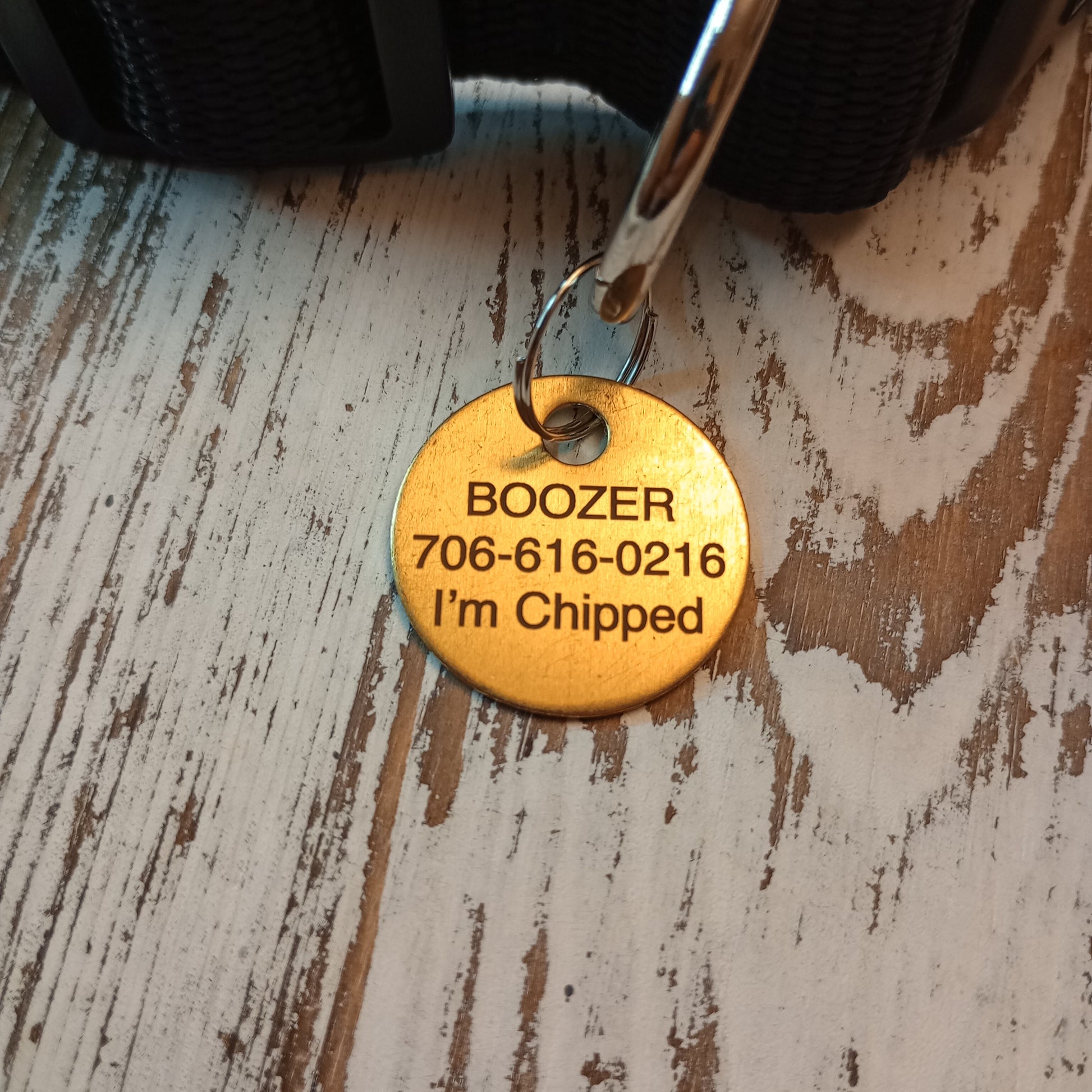 This is a 1 inch in diameter solid brass pet tag which is able to have 4 lines of text engraved on the front and back.