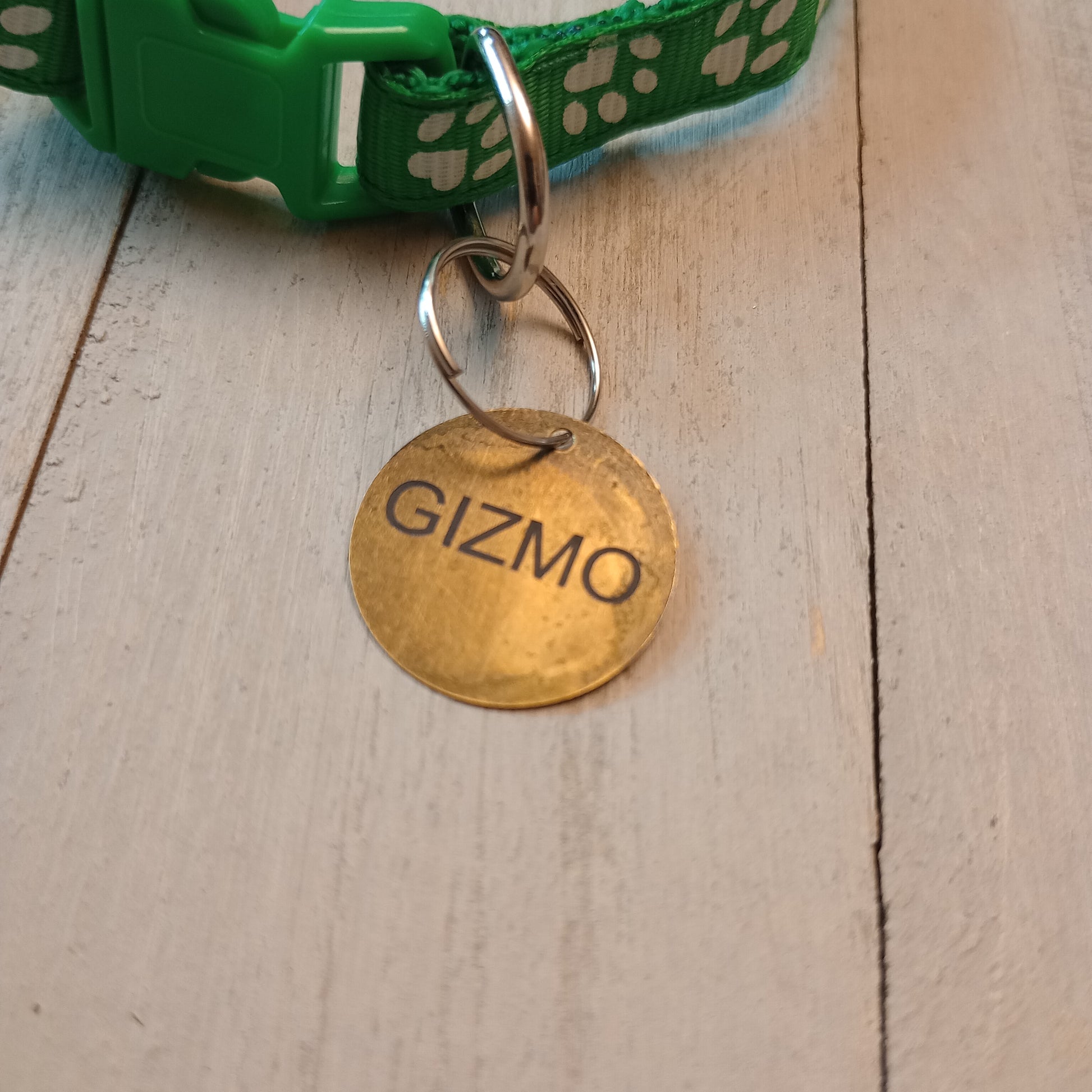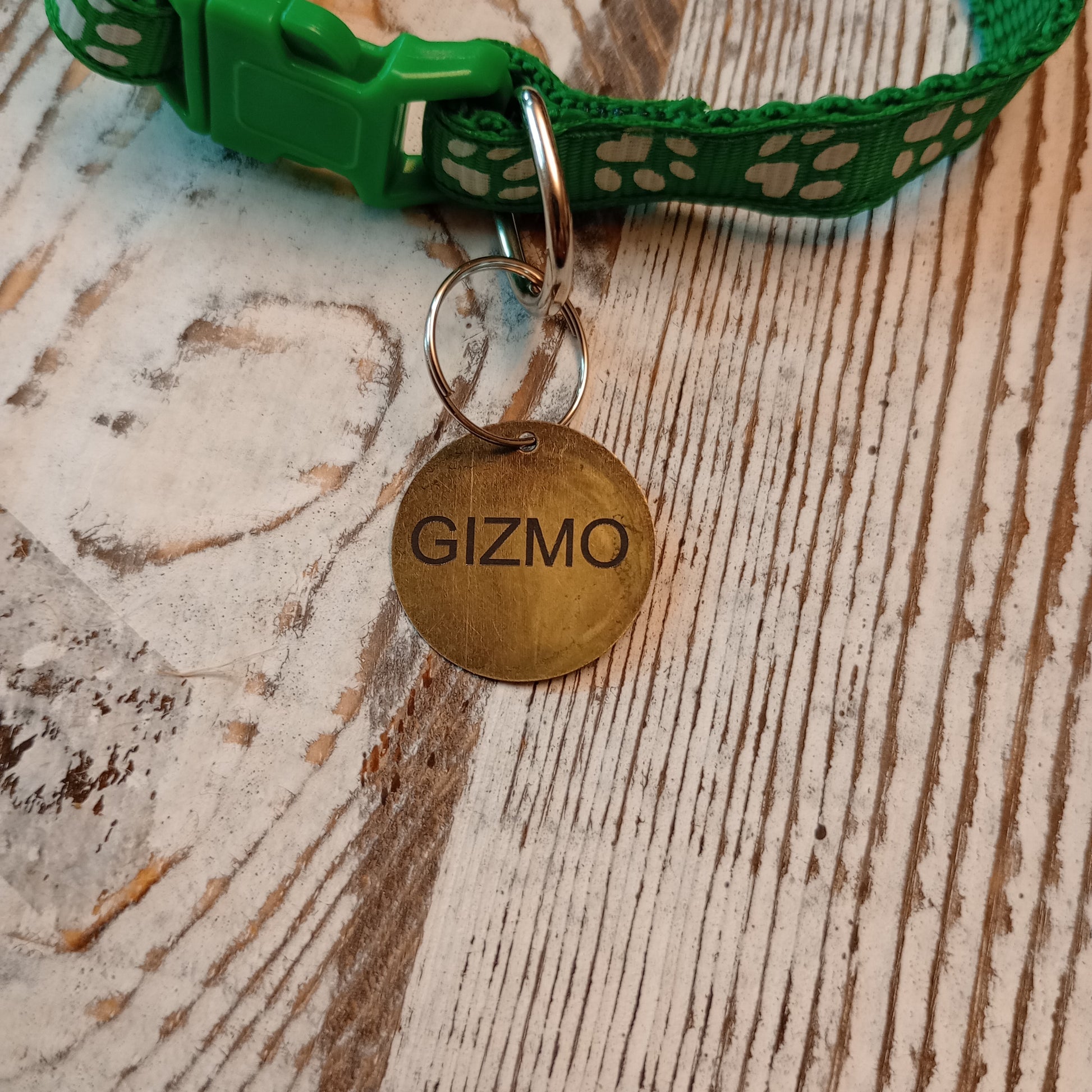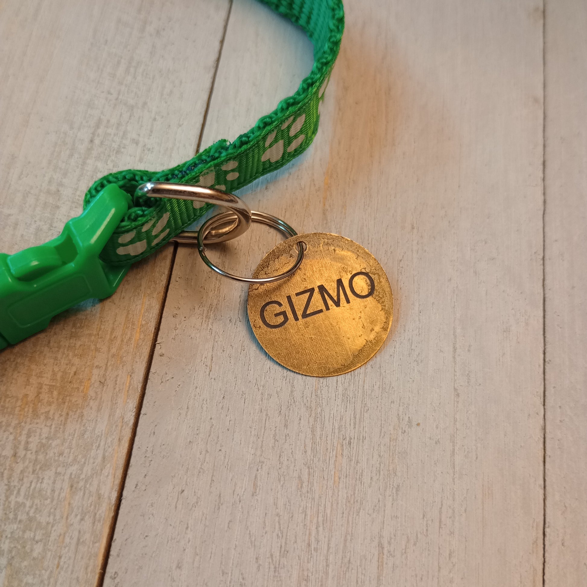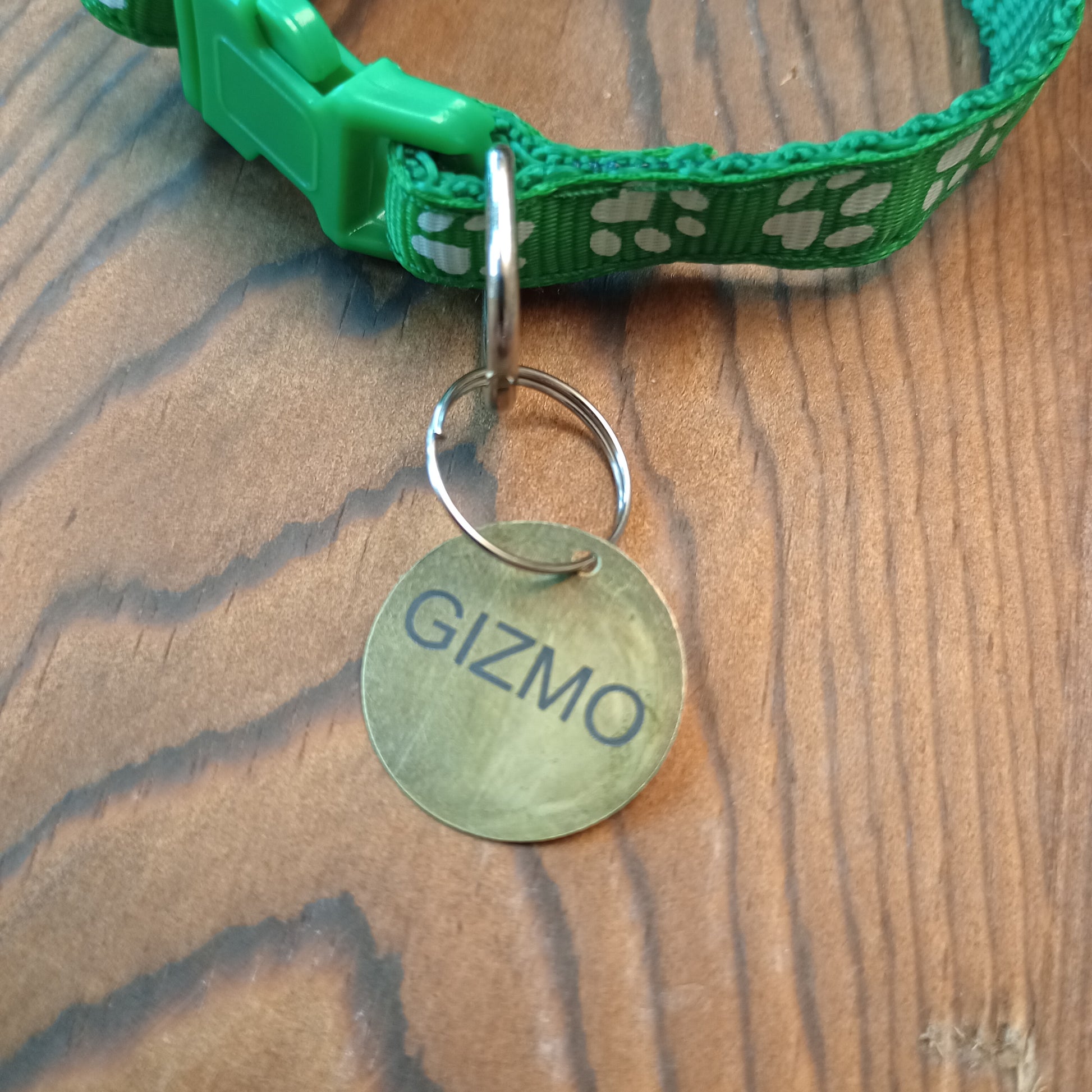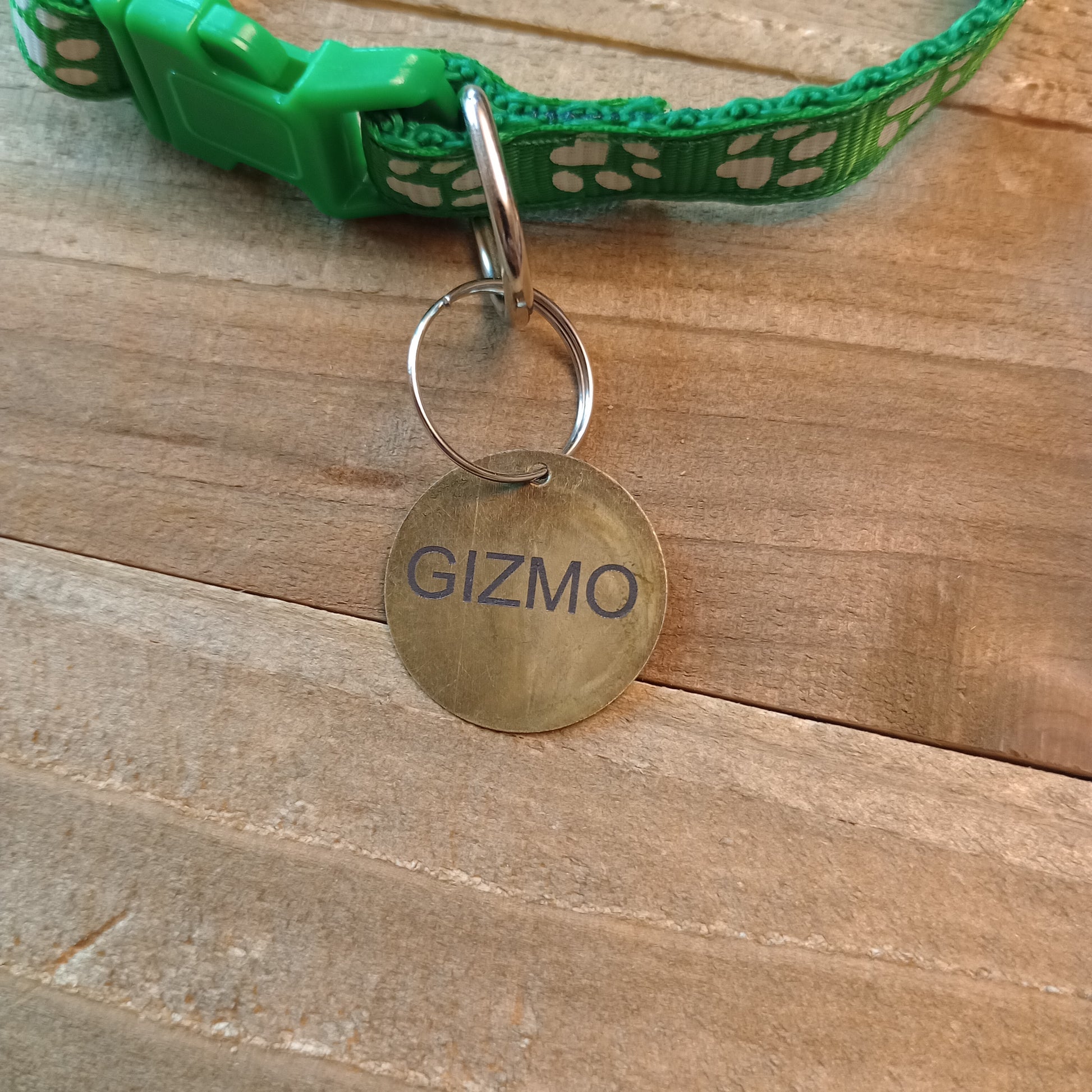 This is a 3/4 inch in diameter solid brass pet tag which is able to have 3 lines of text engraved on the front and back.