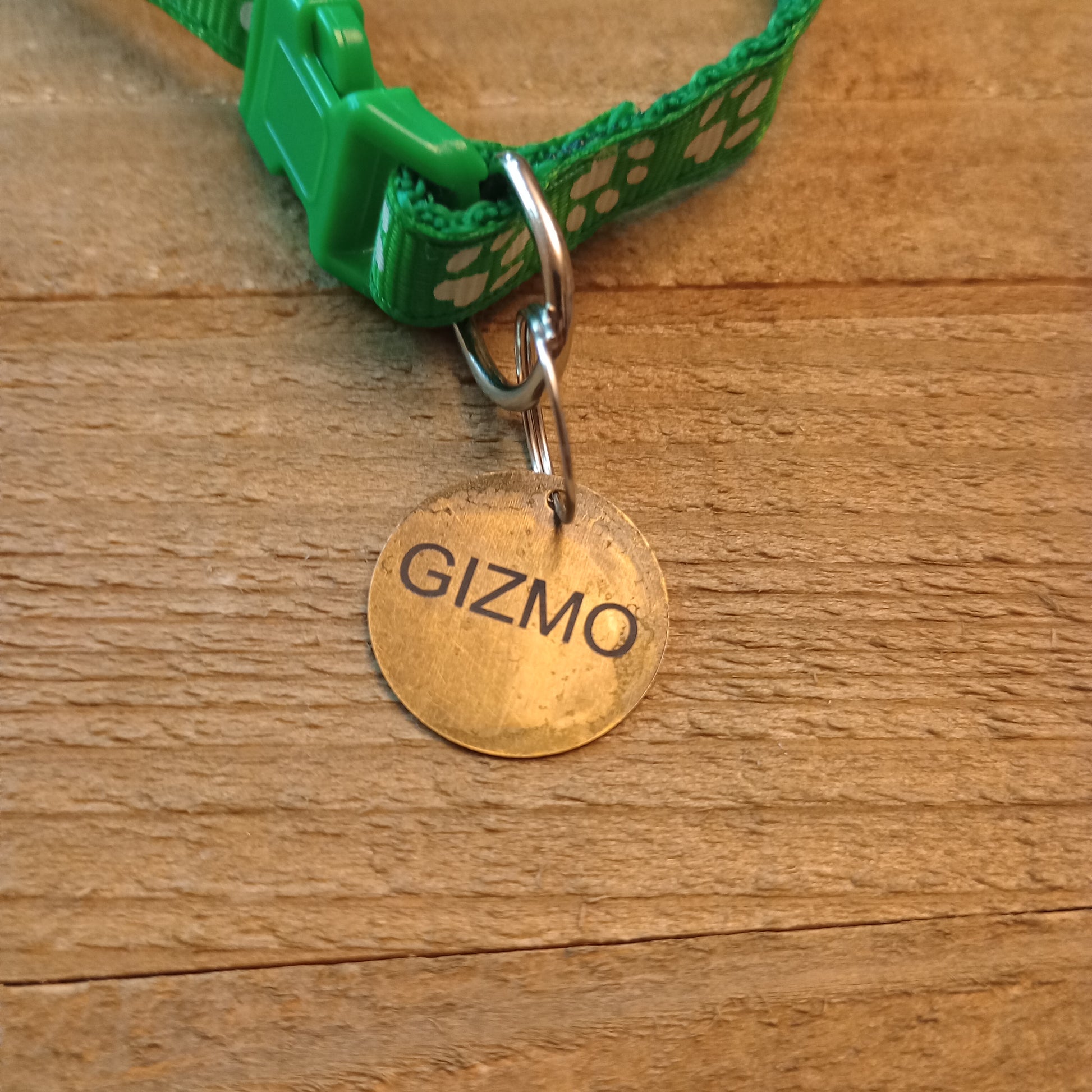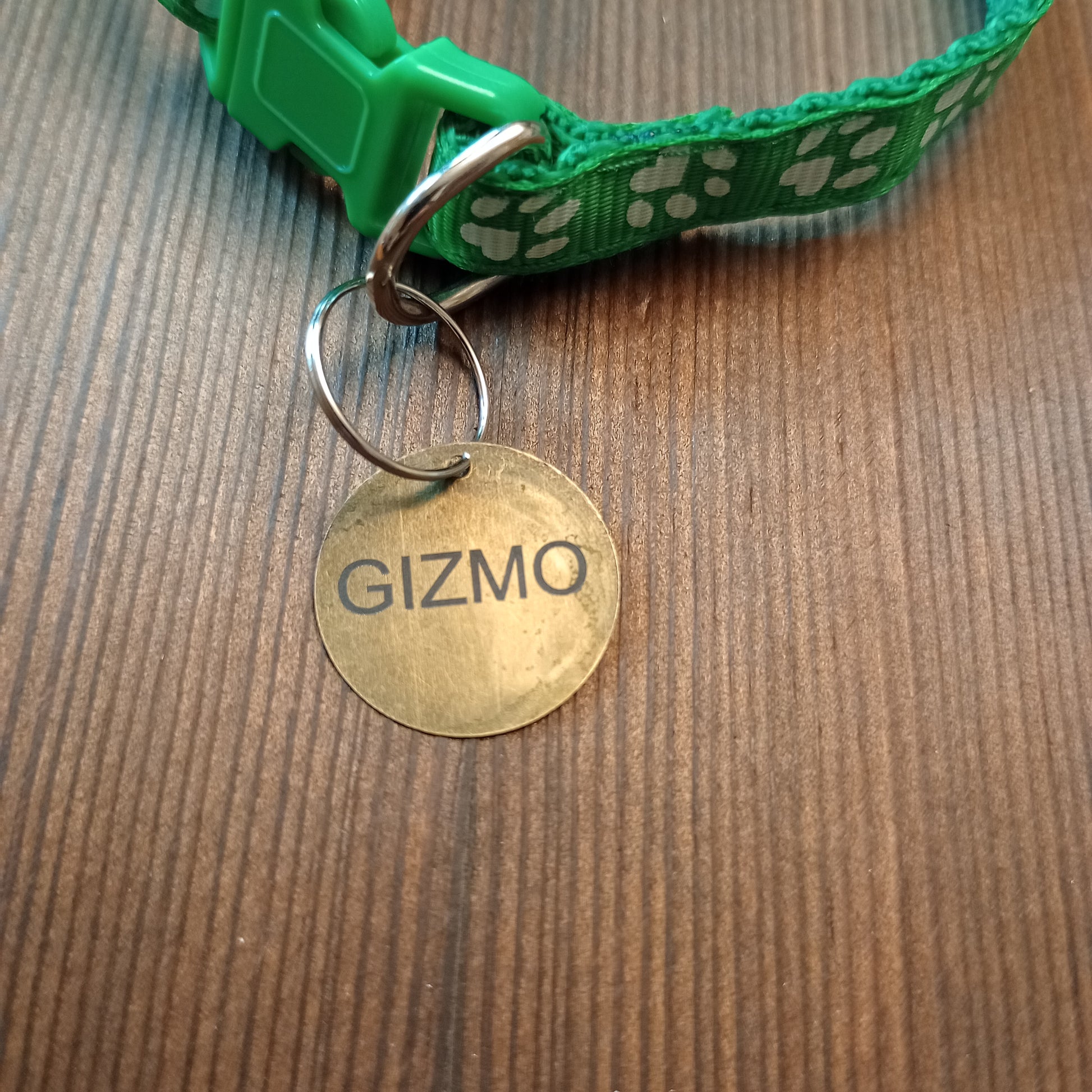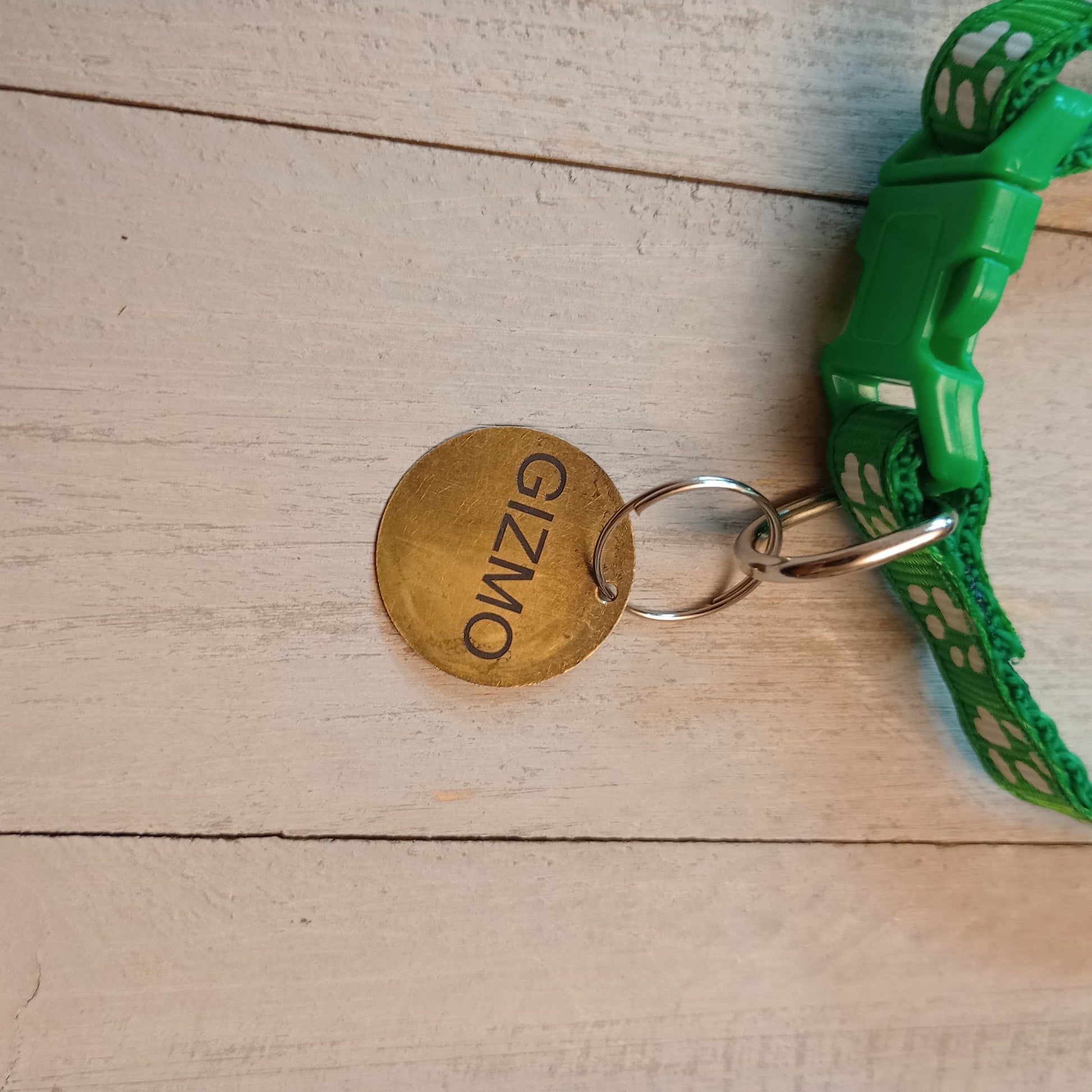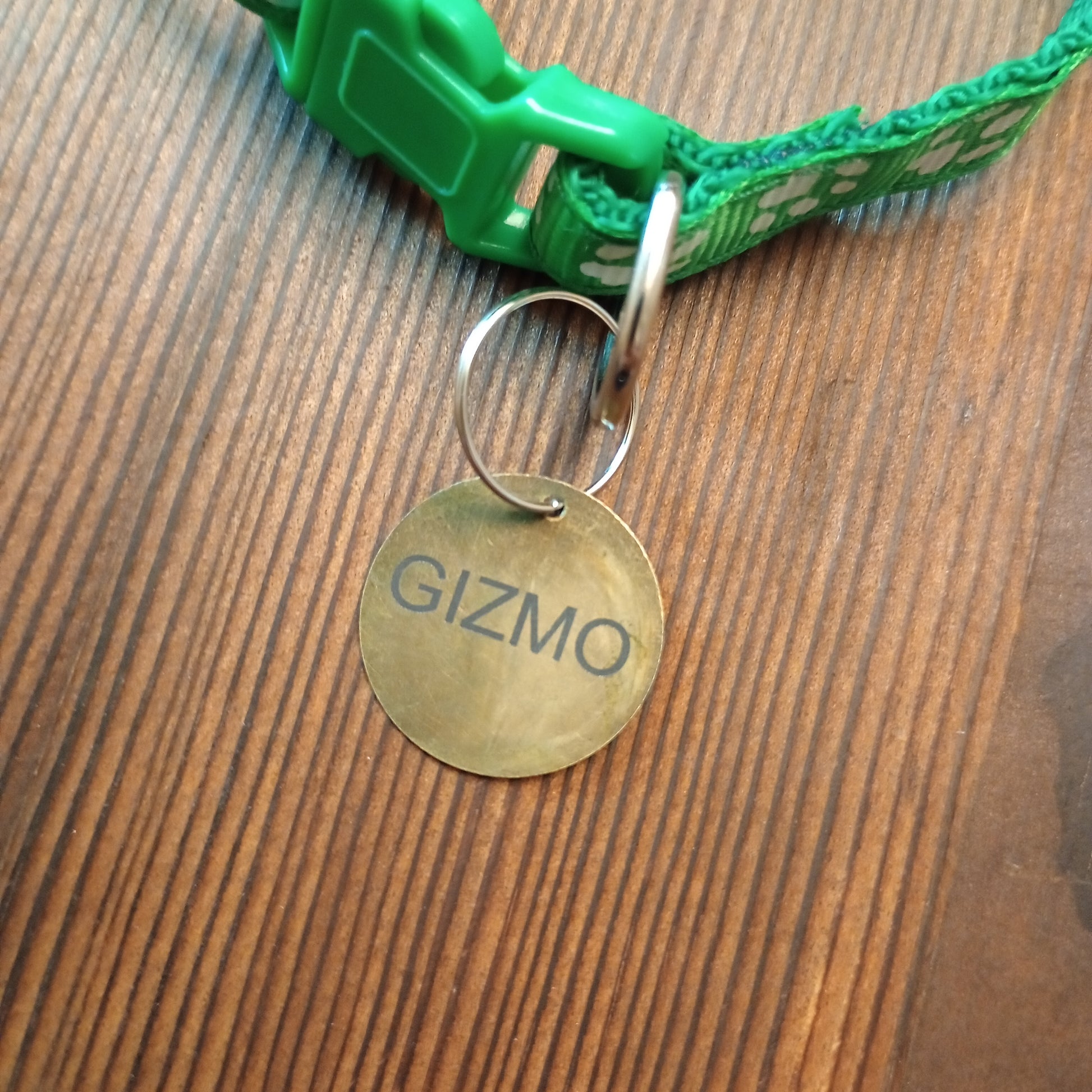 This is a 3/4 inch in diameter solid brass pet tag which is able to have 3 lines of text engraved on the front and back.