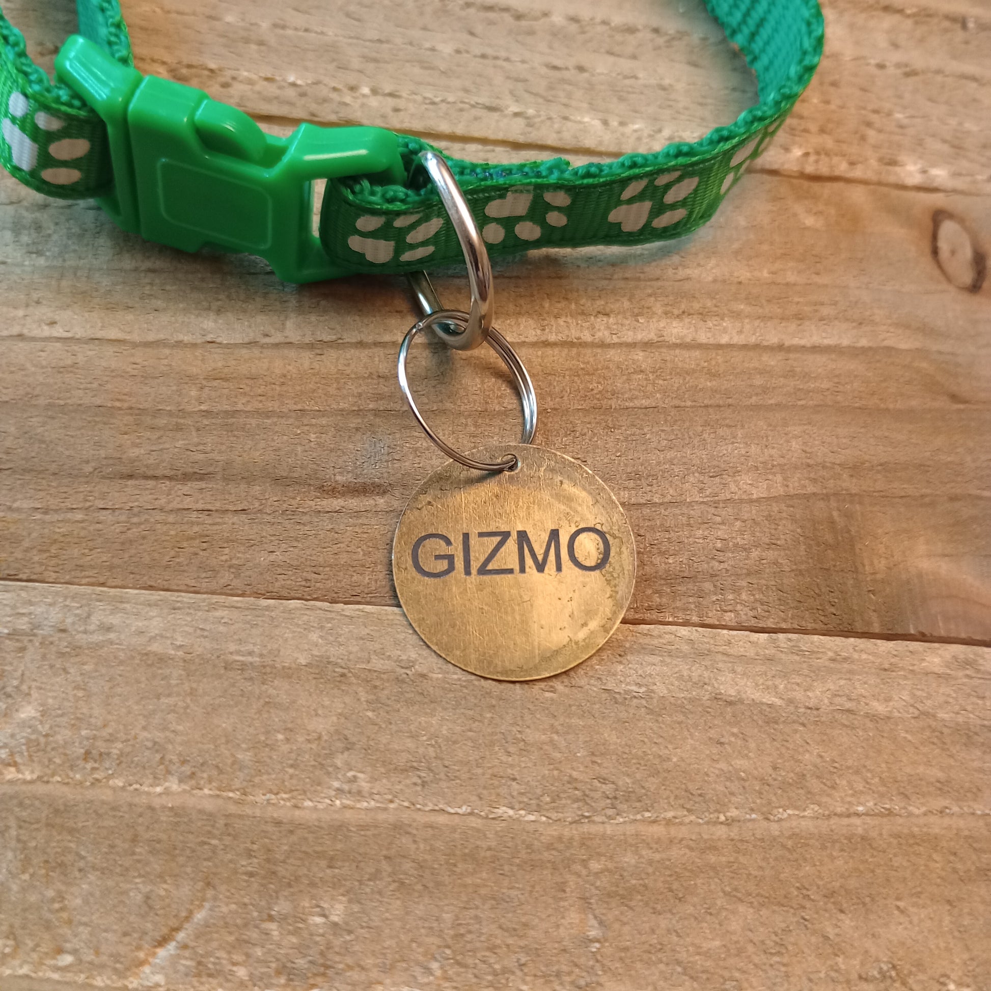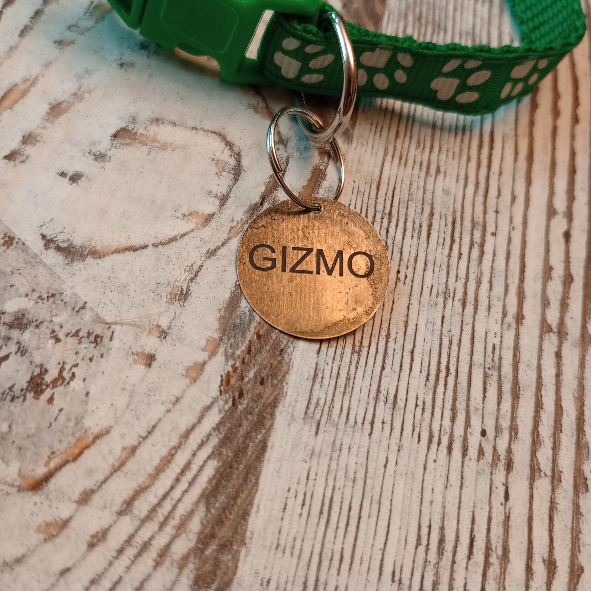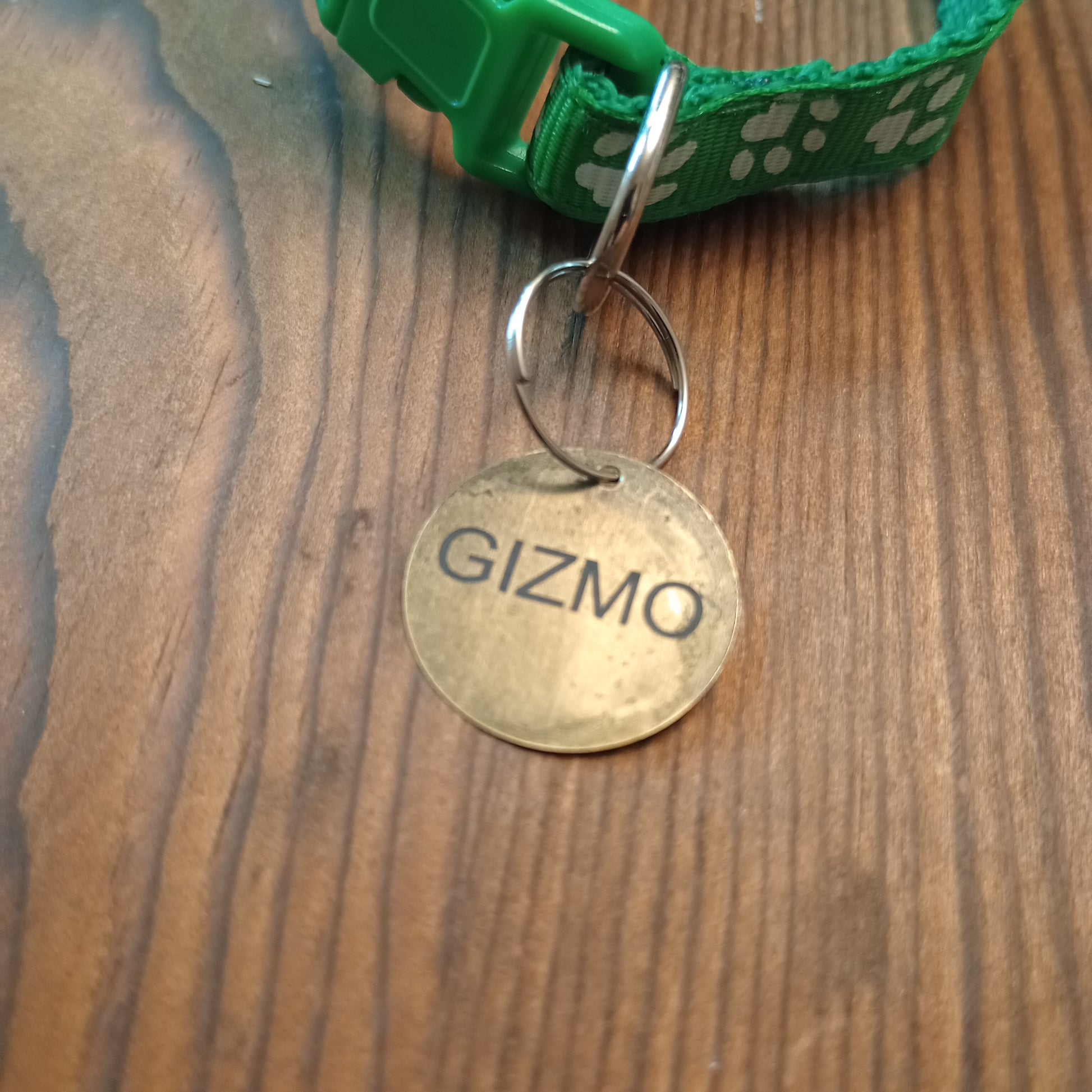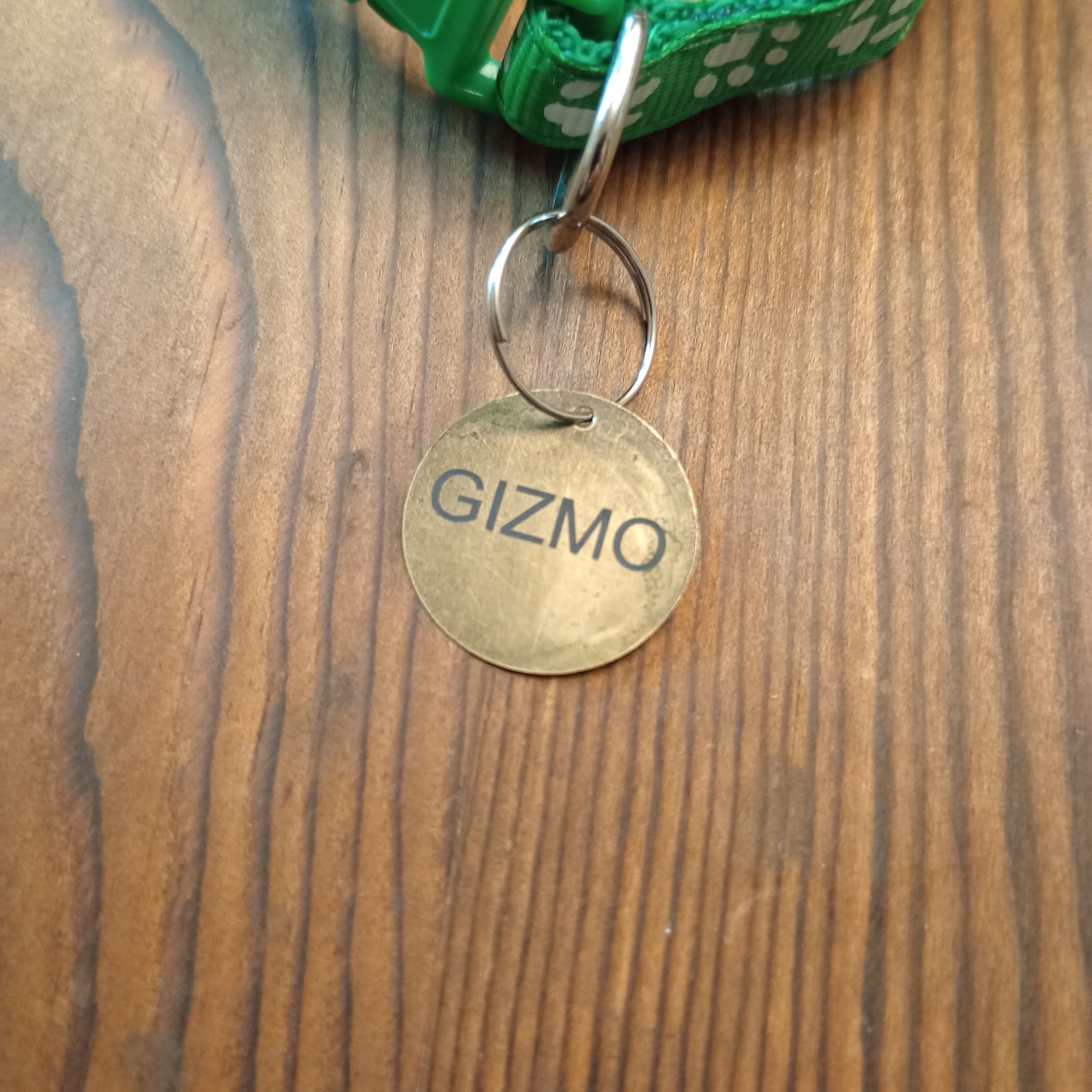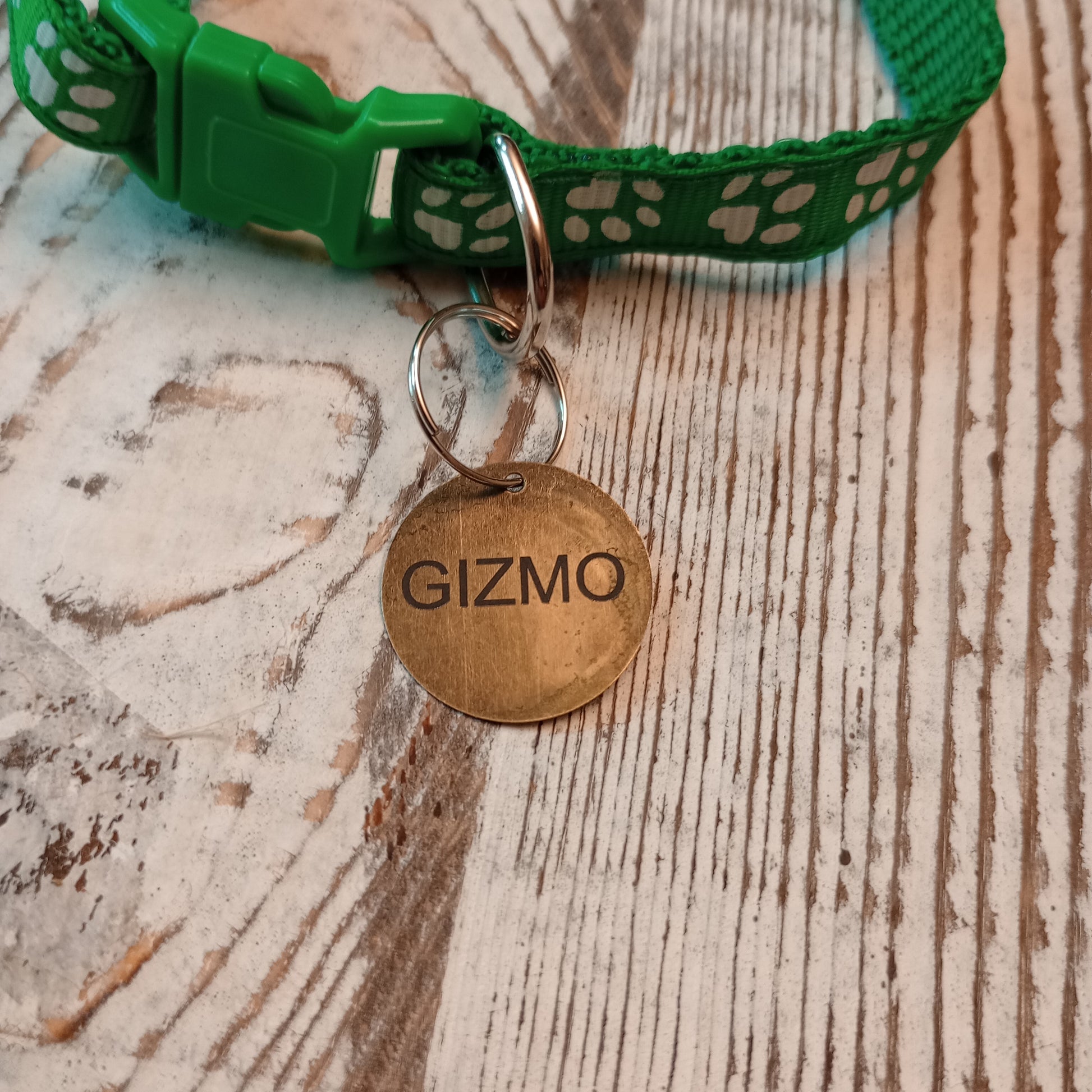 This is a 3/4 inch in diameter solid brass pet tag which is able to have 3 lines of text engraved on the front and back.