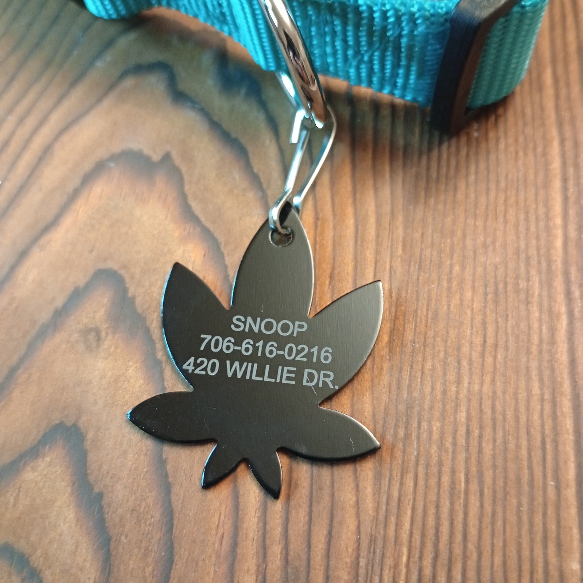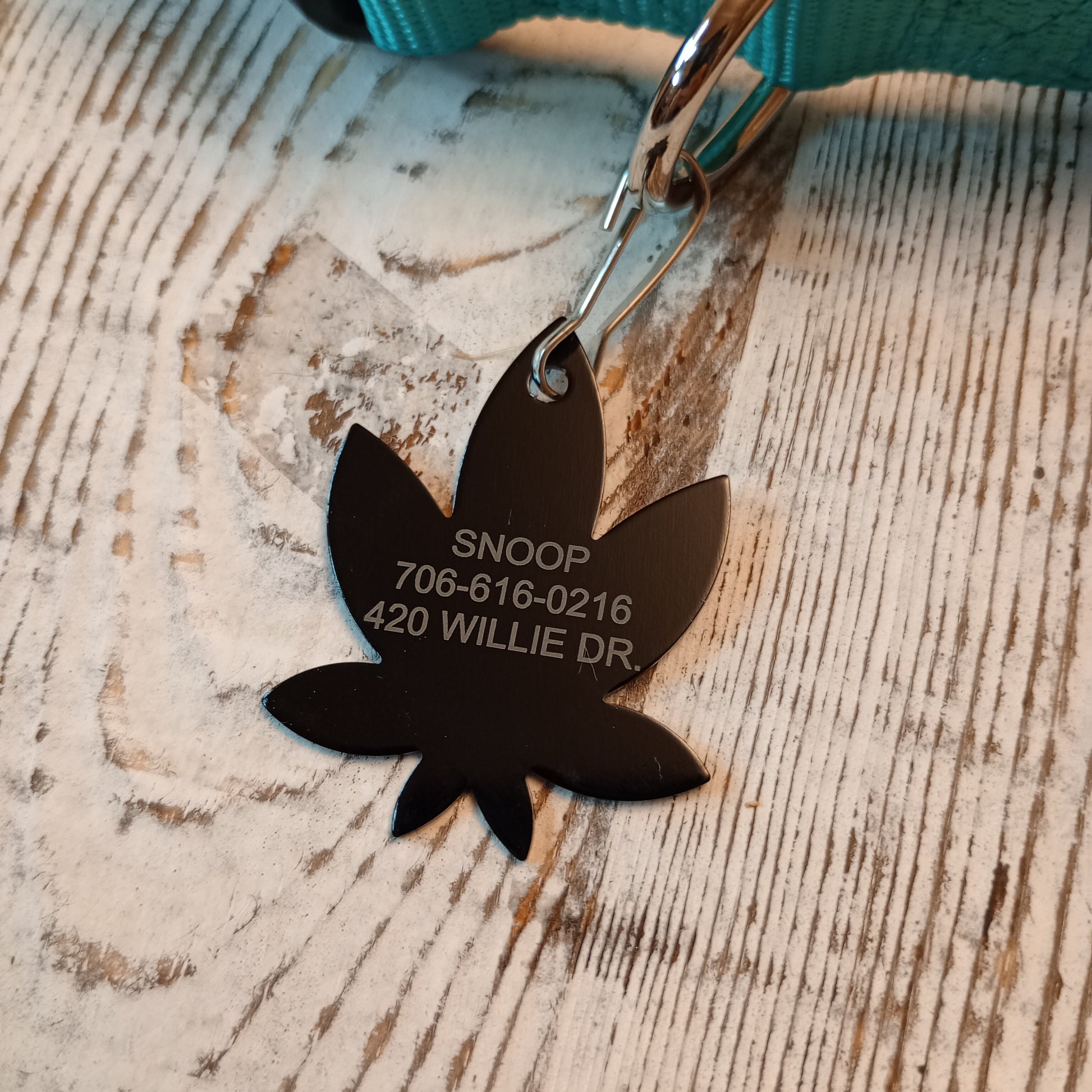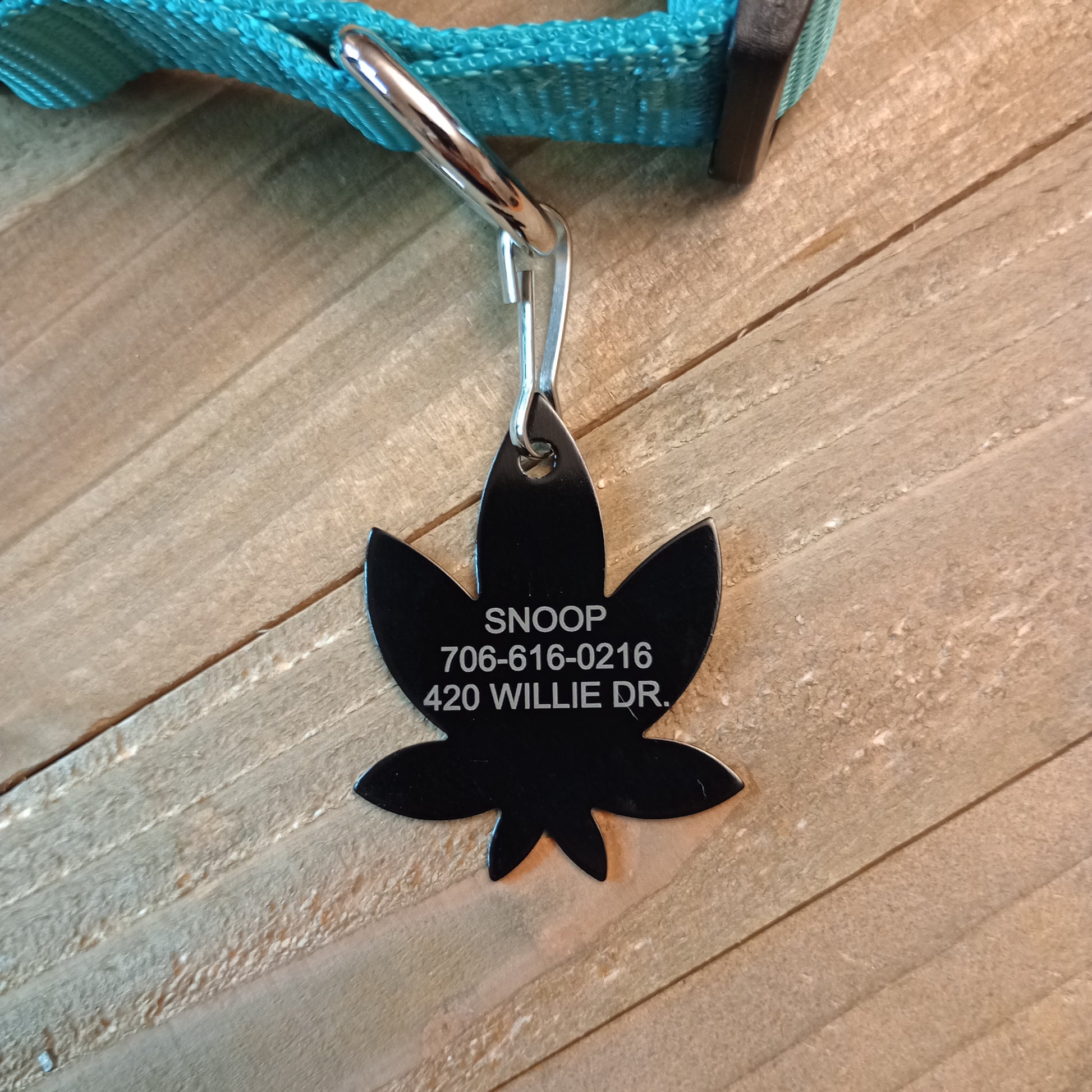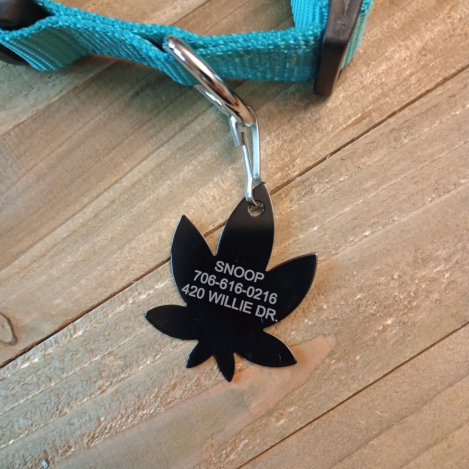 This Black 420 Friendly Style Pet Tag is anodized aluminum that allows for 3 lines of text to be engraved on the front and 3 lines of text to be engraved on the back. The shape of the pet tag resembles a marijuana leaf.