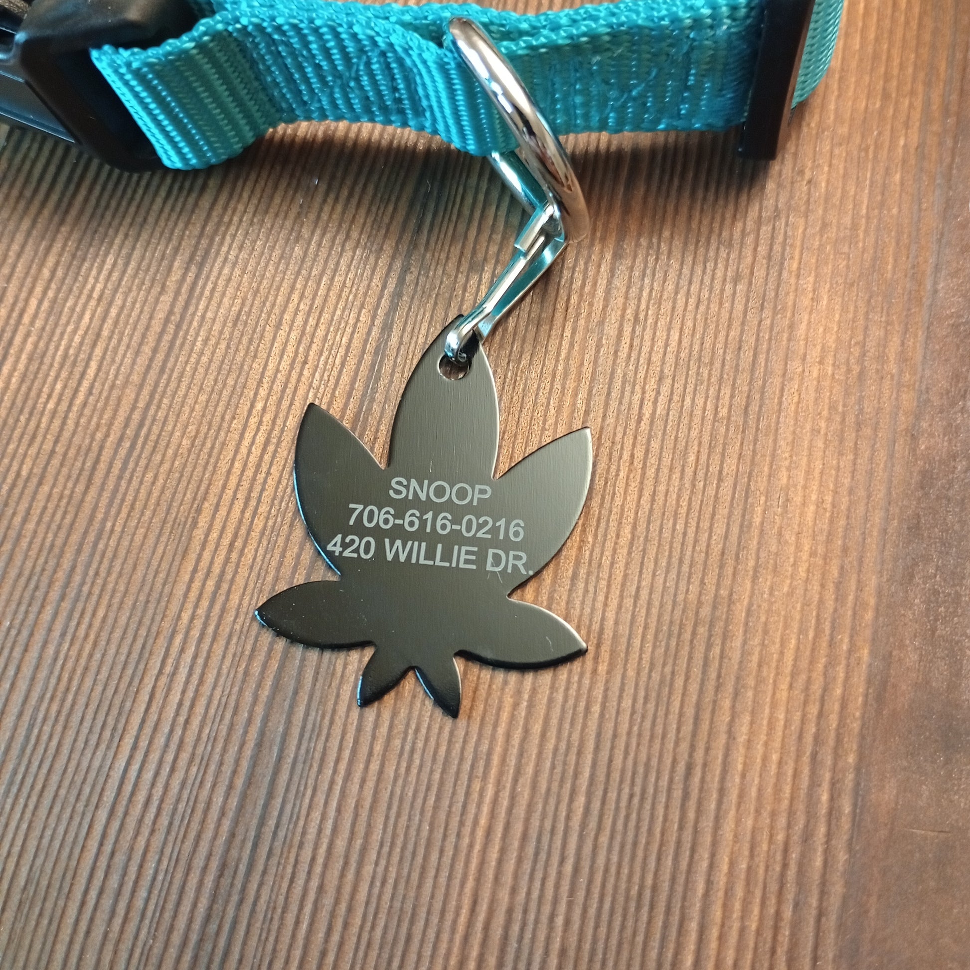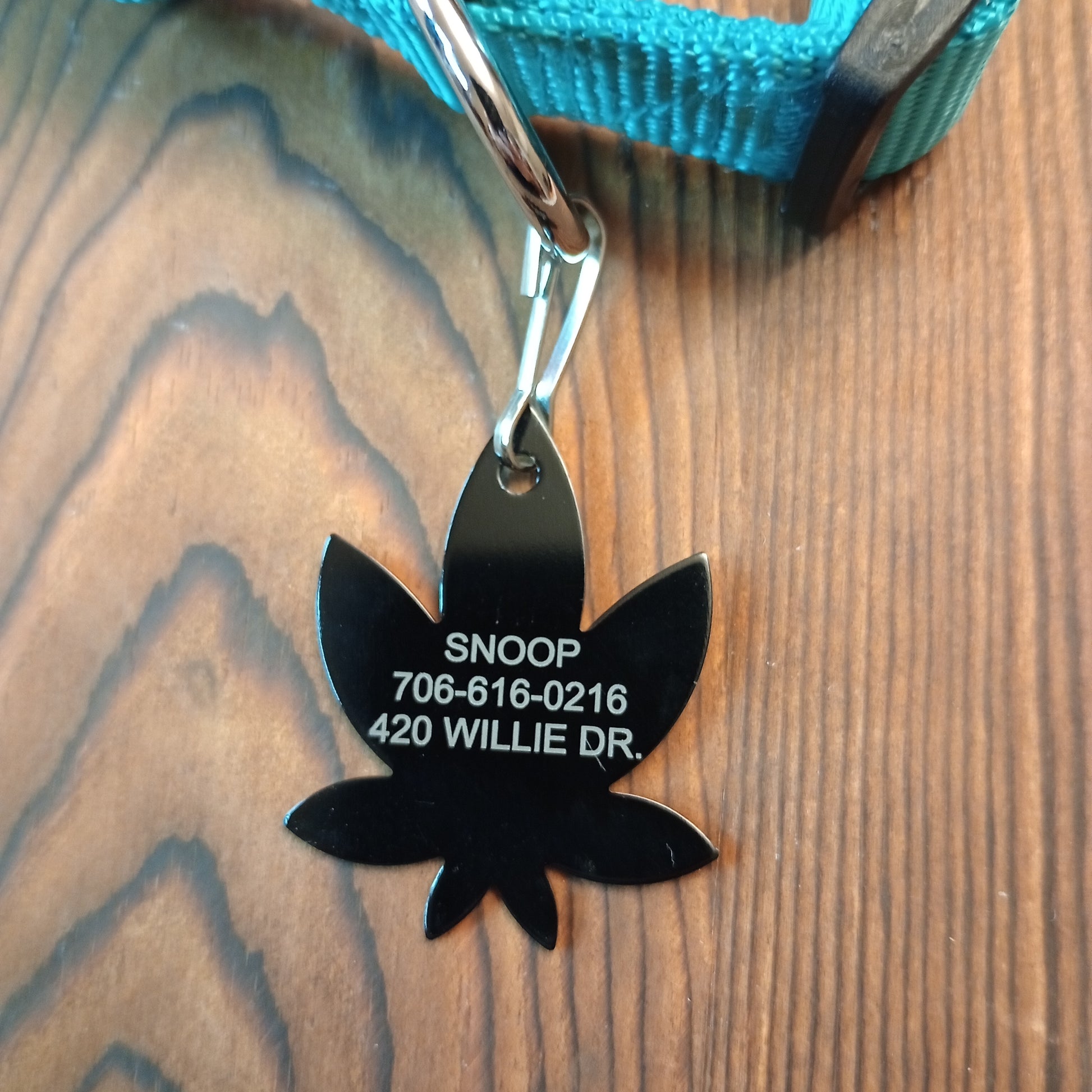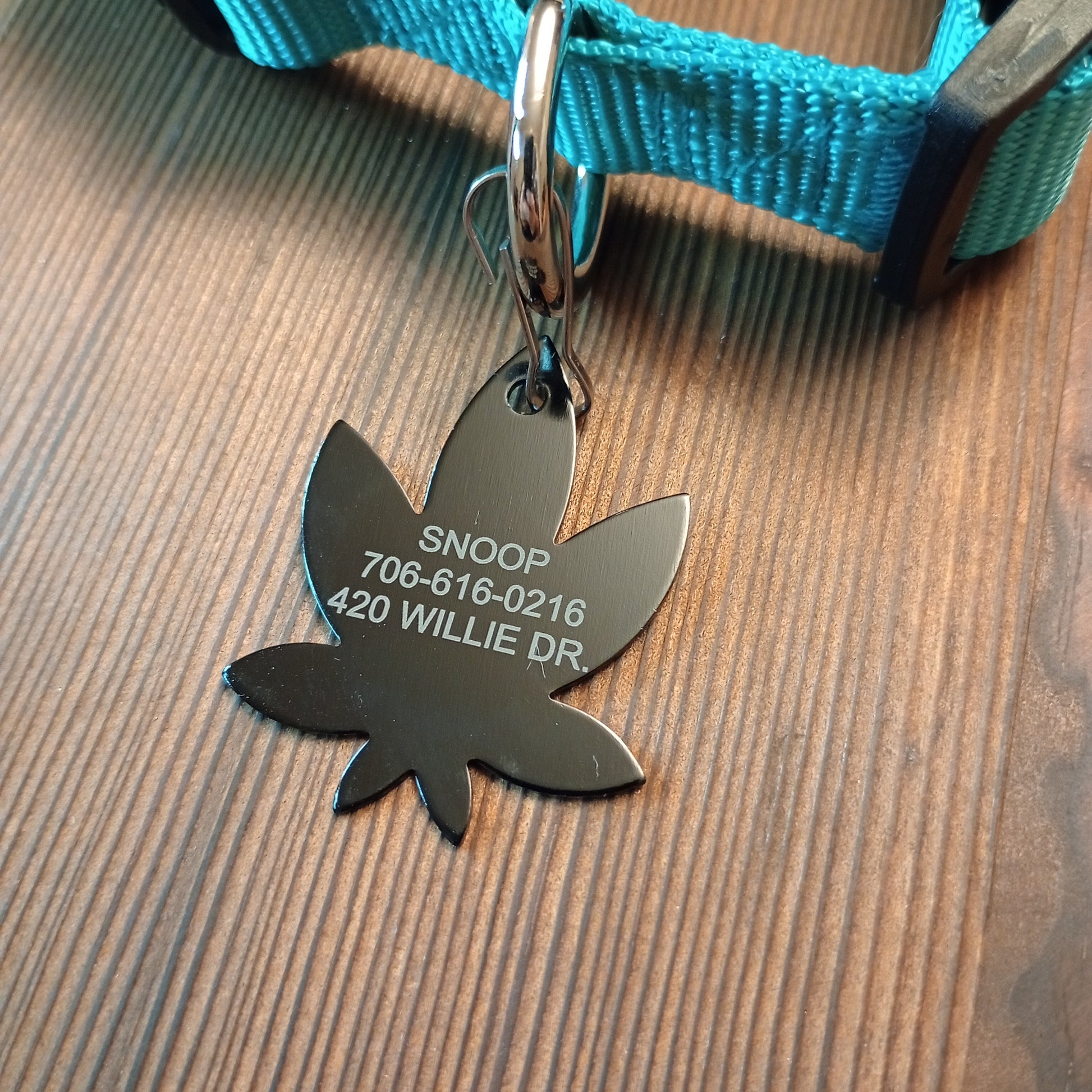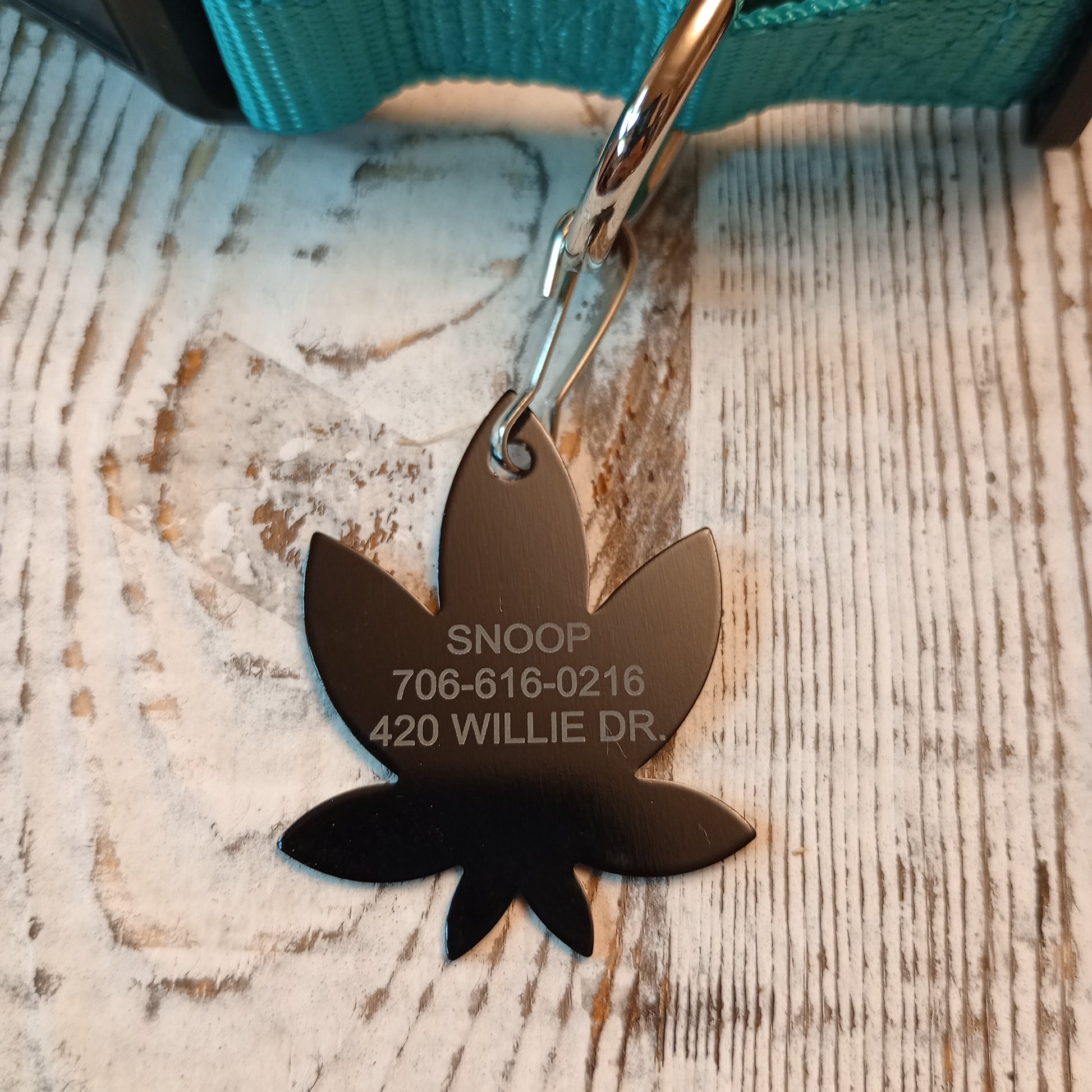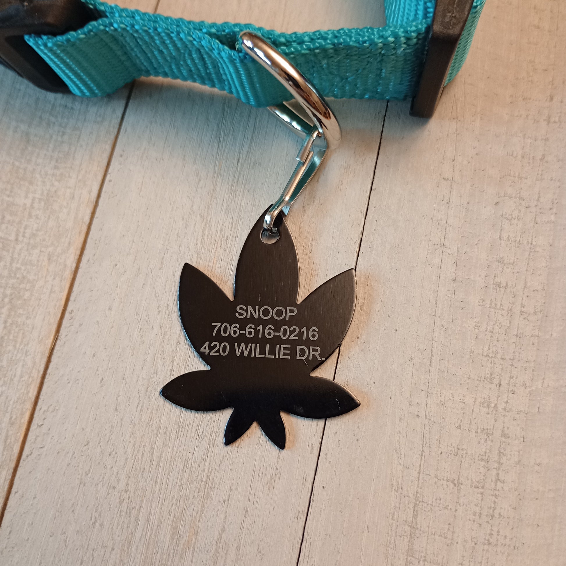 This Black 420 Friendly Style Pet Tag is anodized aluminum that allows for 3 lines of text to be engraved on the front and 3 lines of text to be engraved on the back. The shape of the pet tag resembles a marijuana leaf.