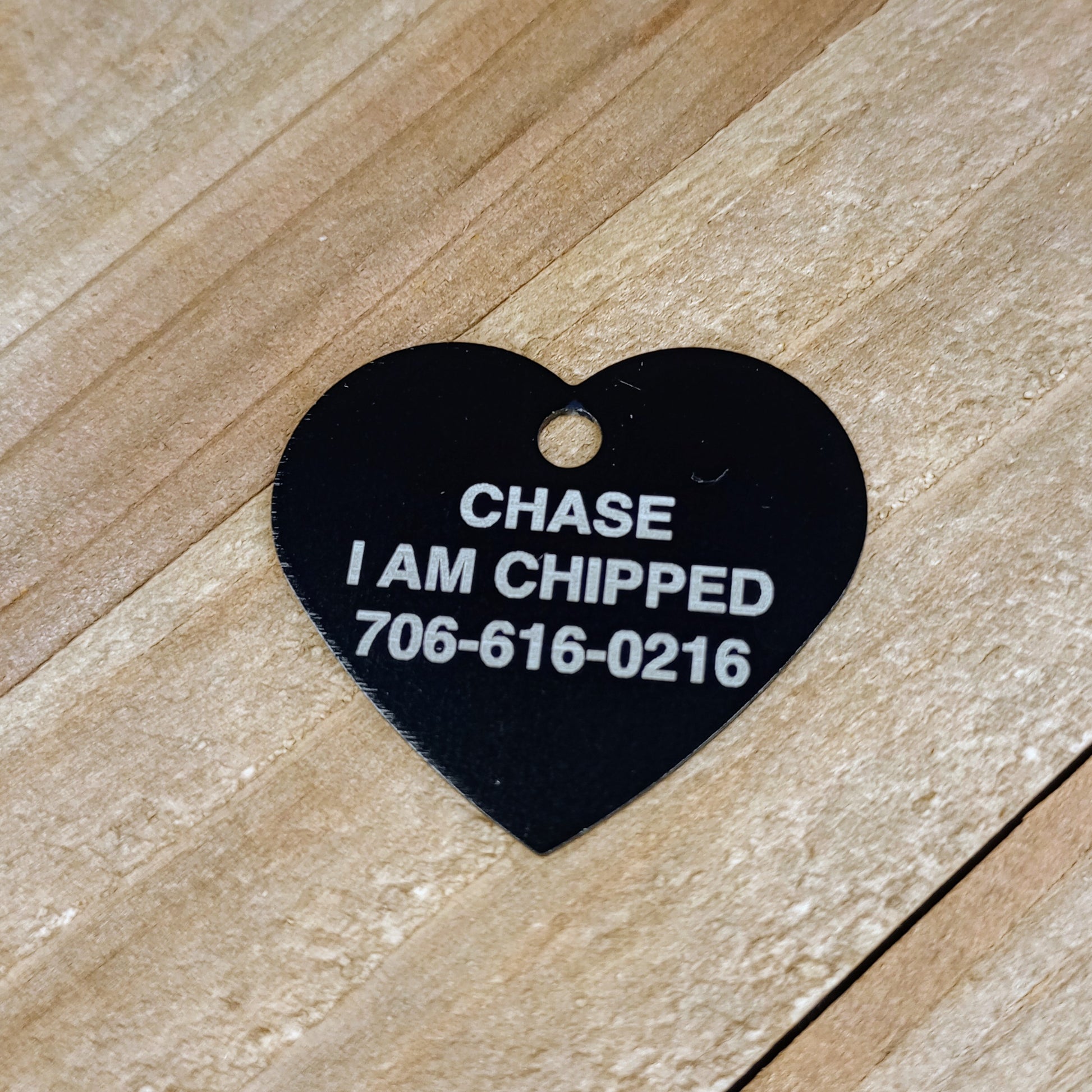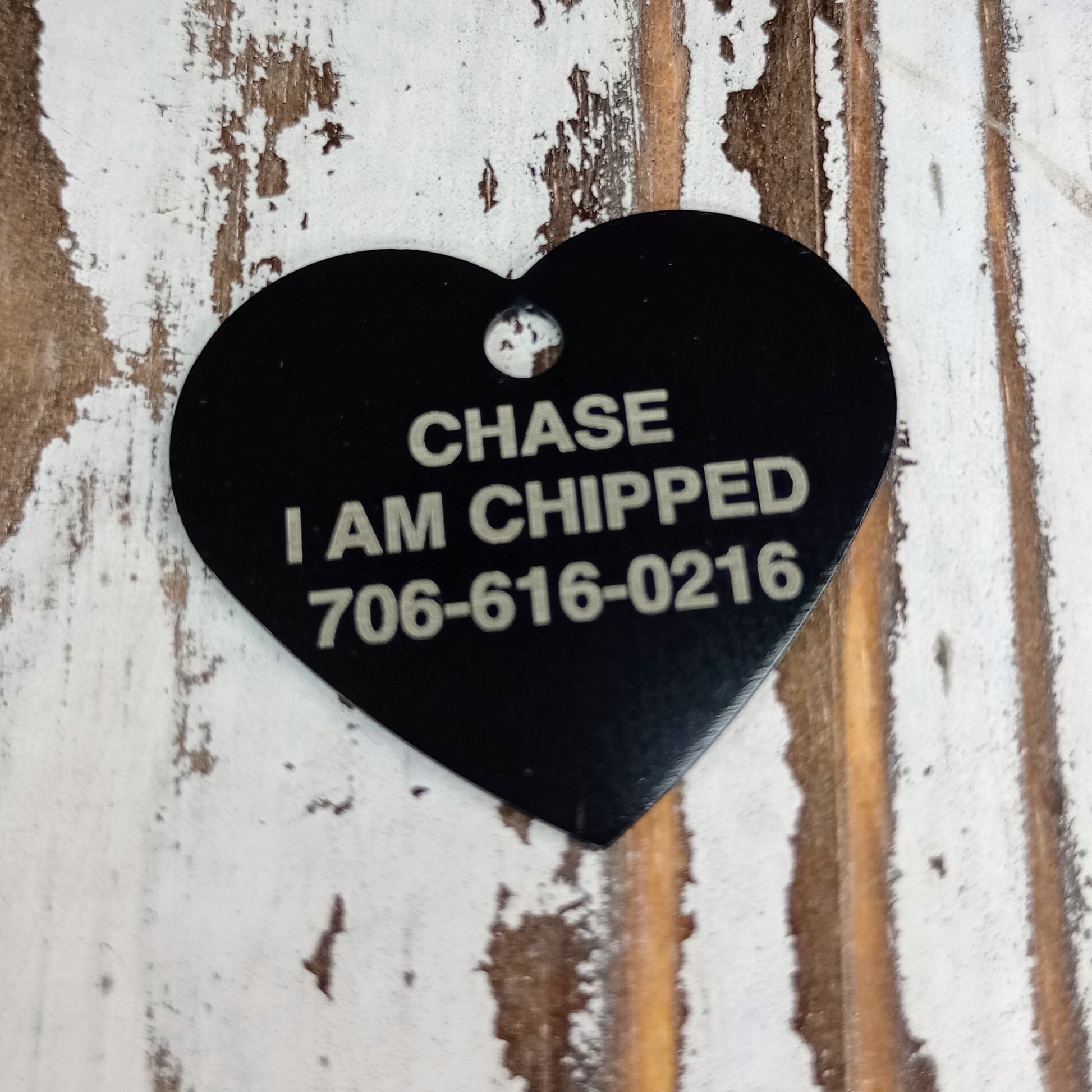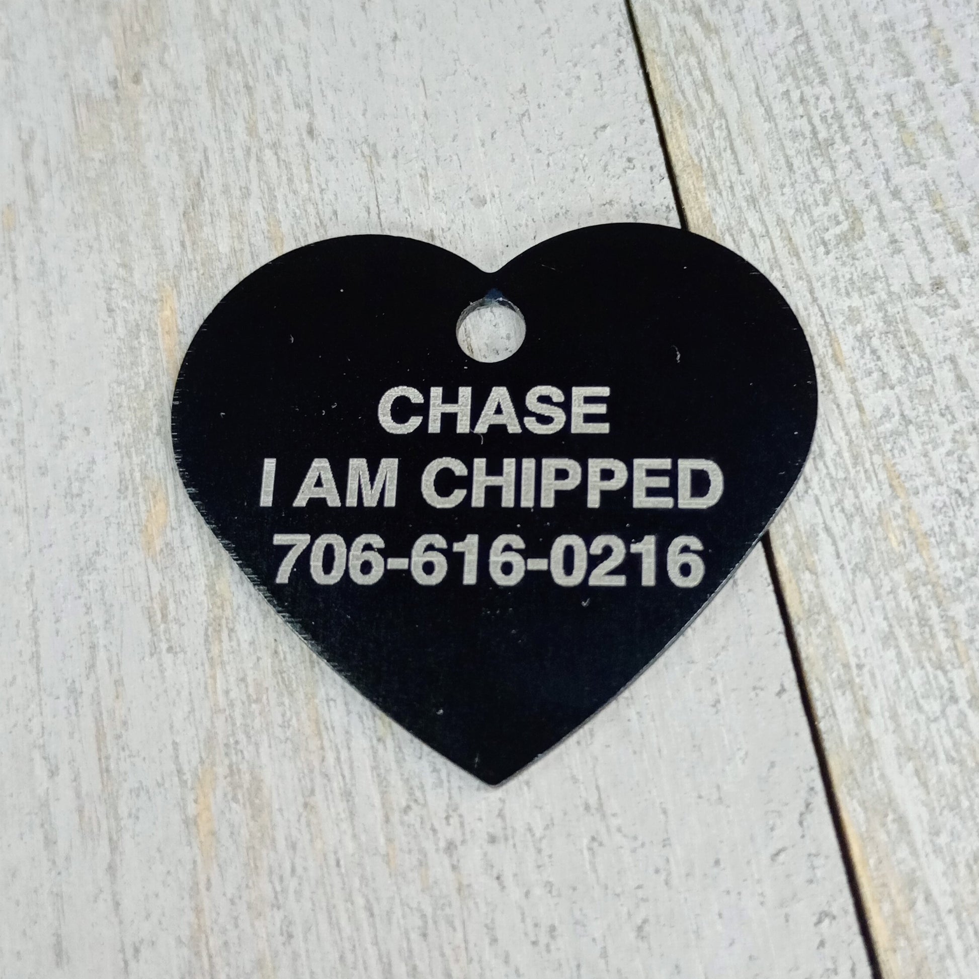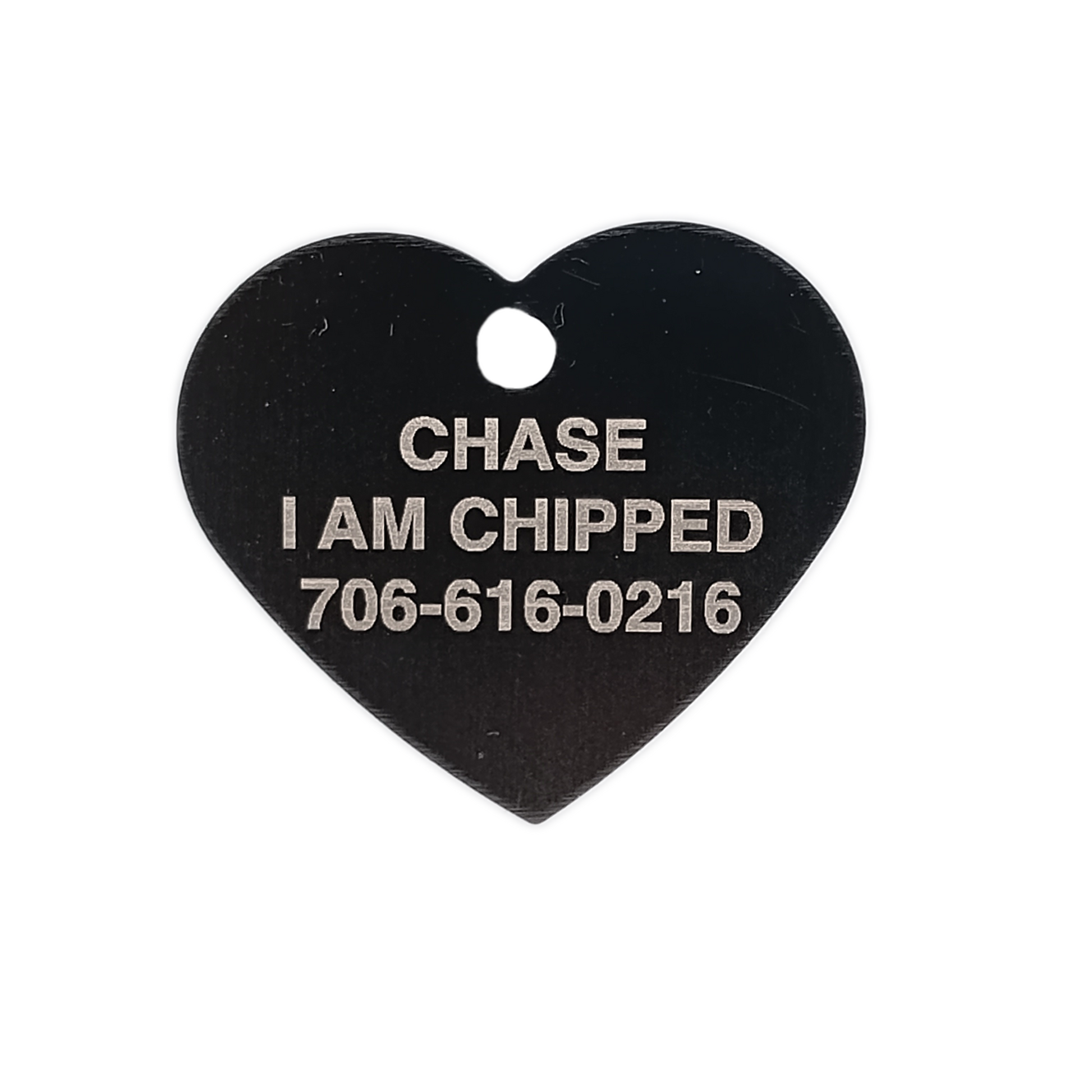 This Black Heart Shaped Pet Tag is anodized aluminum that allows for 4 lines of text to be engraved on the front and lines of text to be engraved on the back.