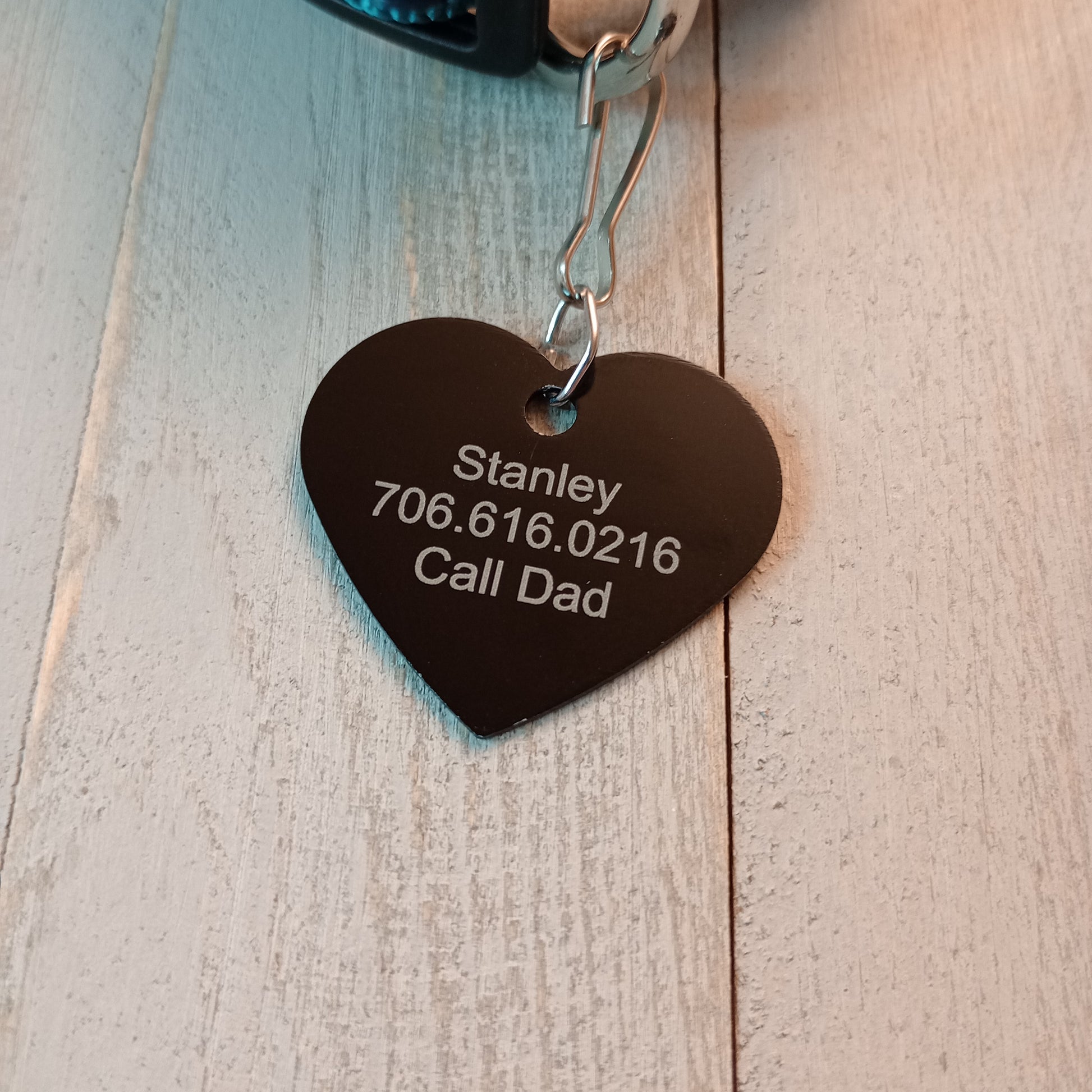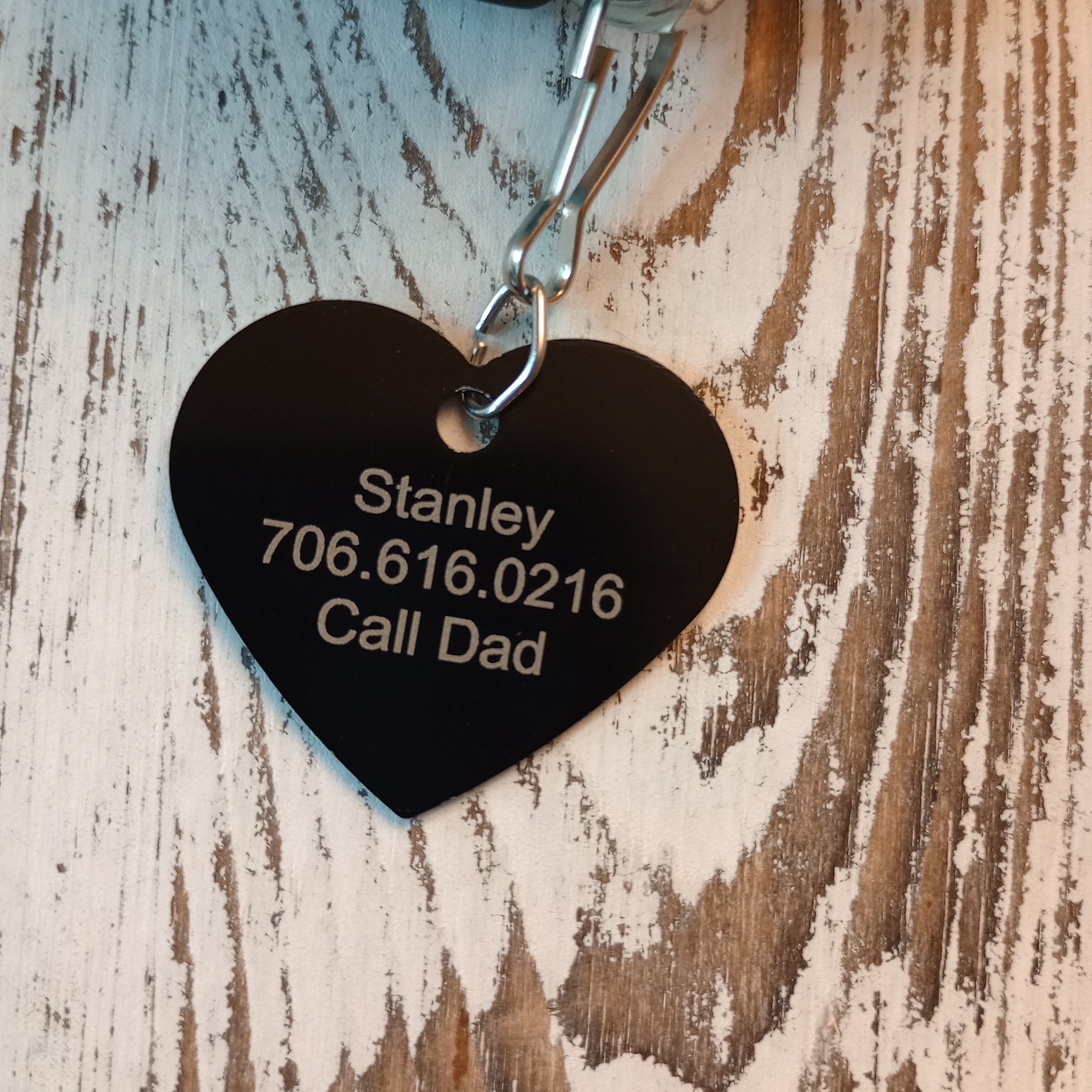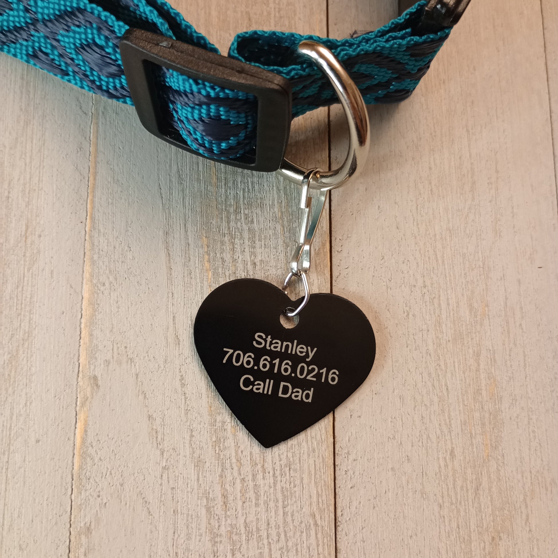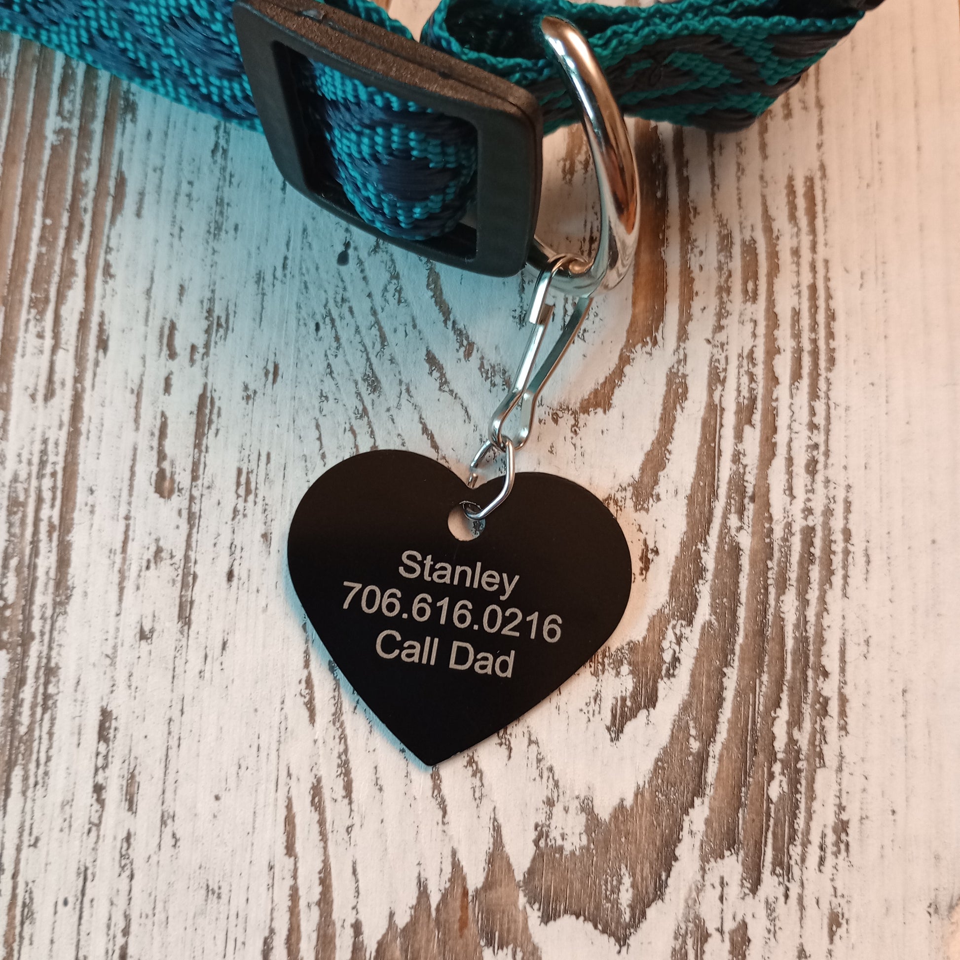 This Black Heart Shaped Pet Tag is anodized aluminum that allows for 4 lines of text to be engraved on the front and lines of text to be engraved on the back.