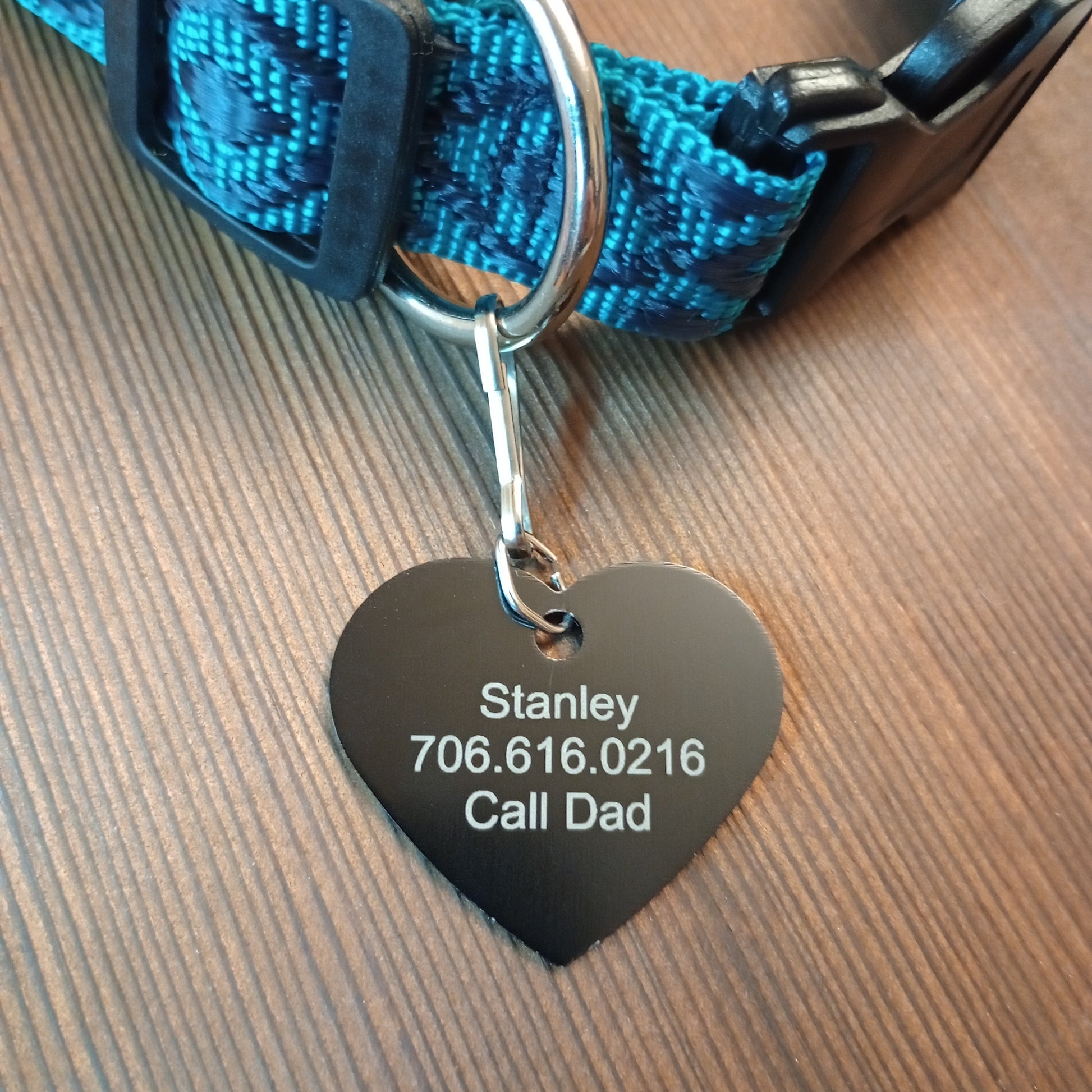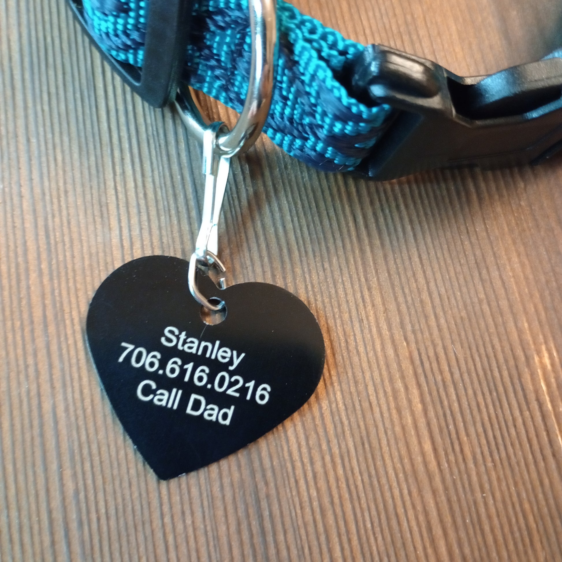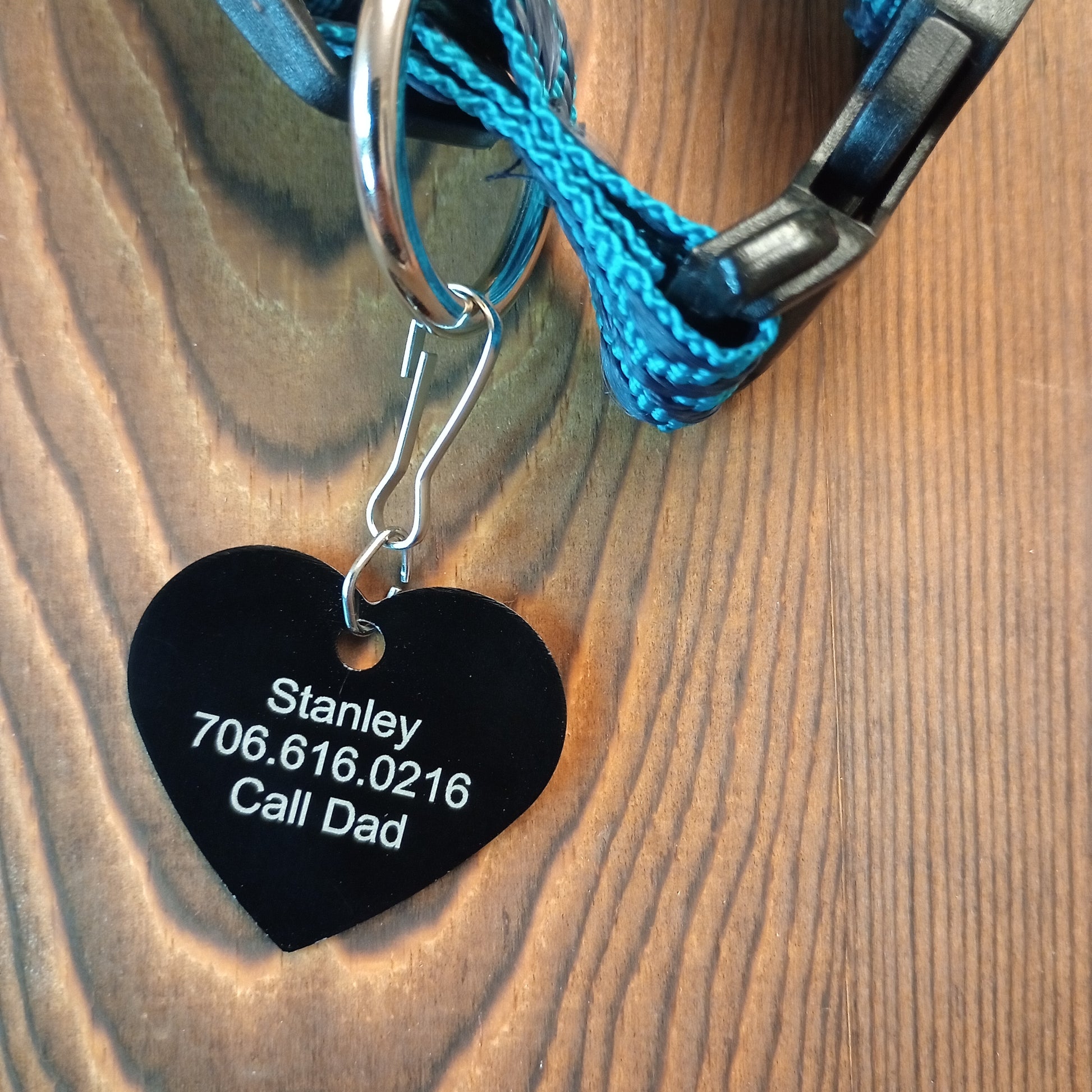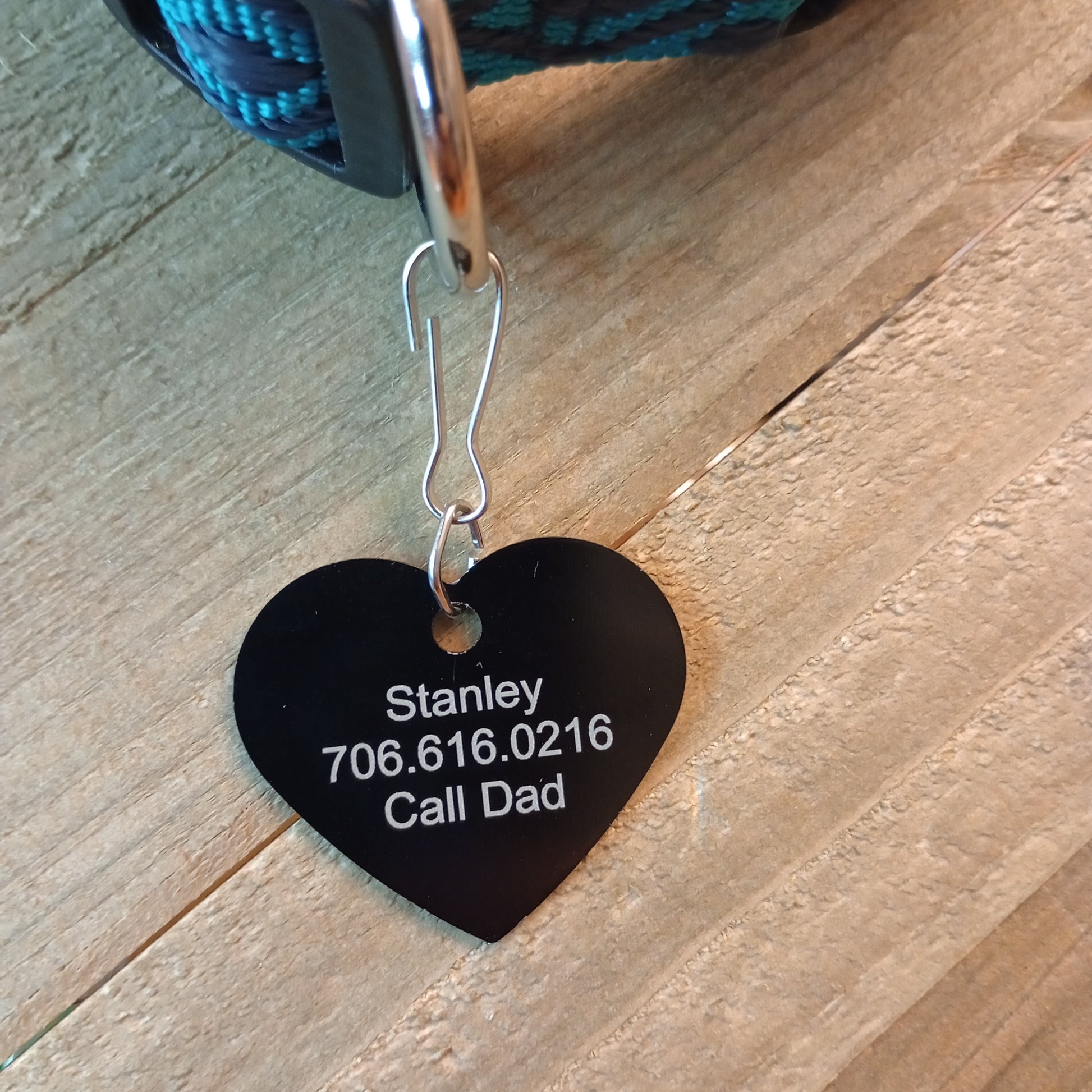 This Black Heart Shaped Pet Tag is anodized aluminum that allows for 4 lines of text to be engraved on the front and lines of text to be engraved on the back.