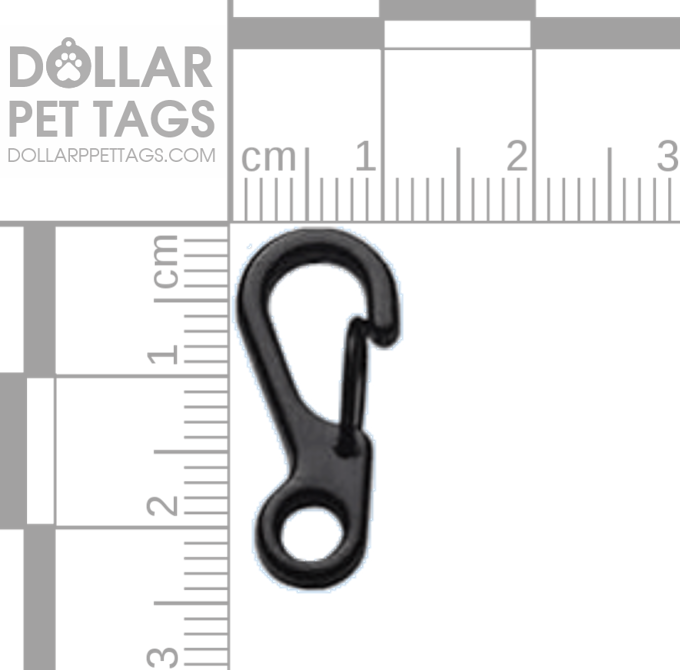 This black mini spring clip carabiner is made of a zinc alloy and electroplated. The spring clip allows this to be easily removed or put on a leash or collar. The opening of the clip is about 6 mm which is a little less than a quarter of an inch.