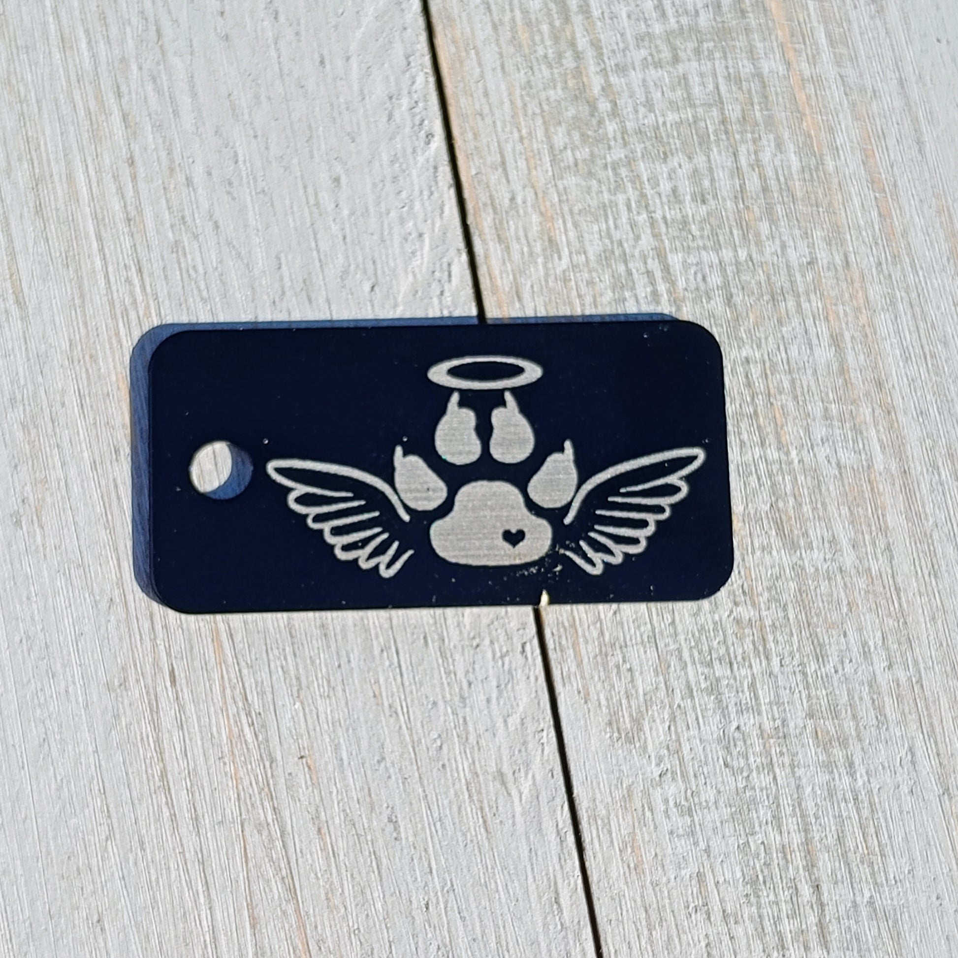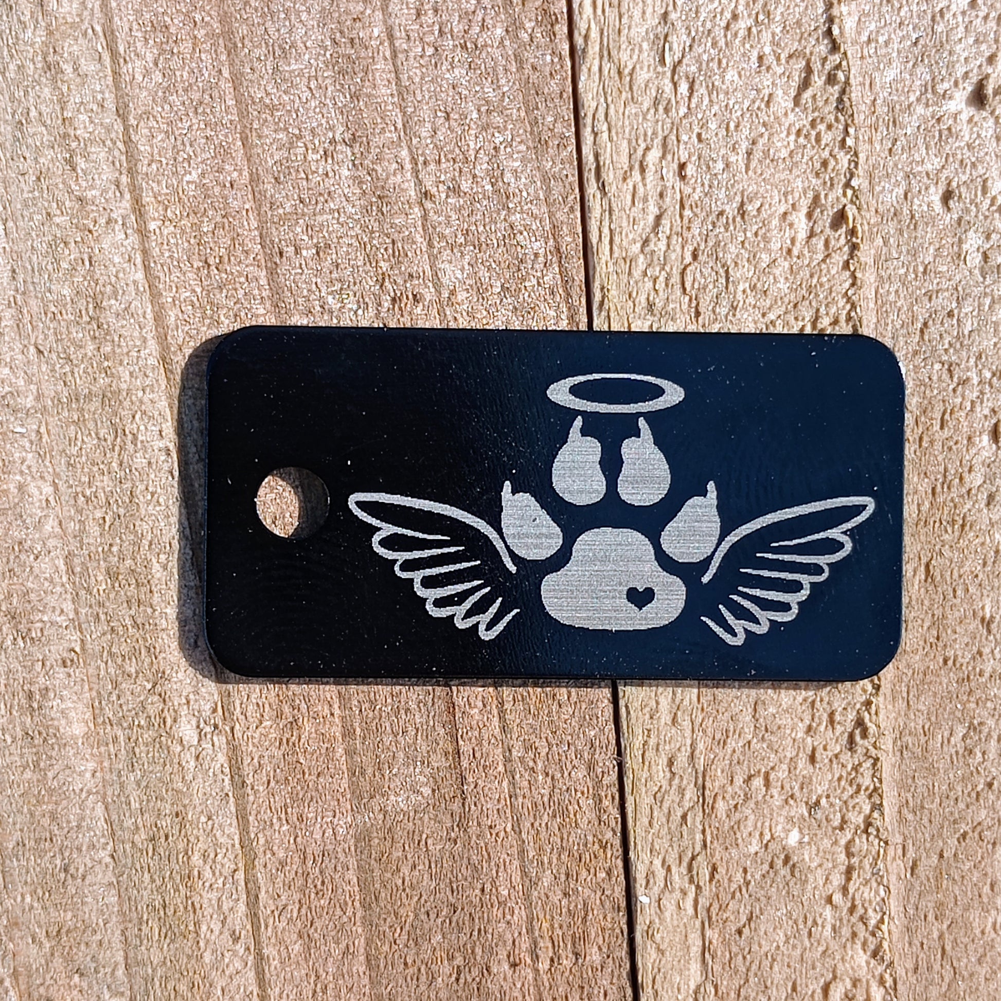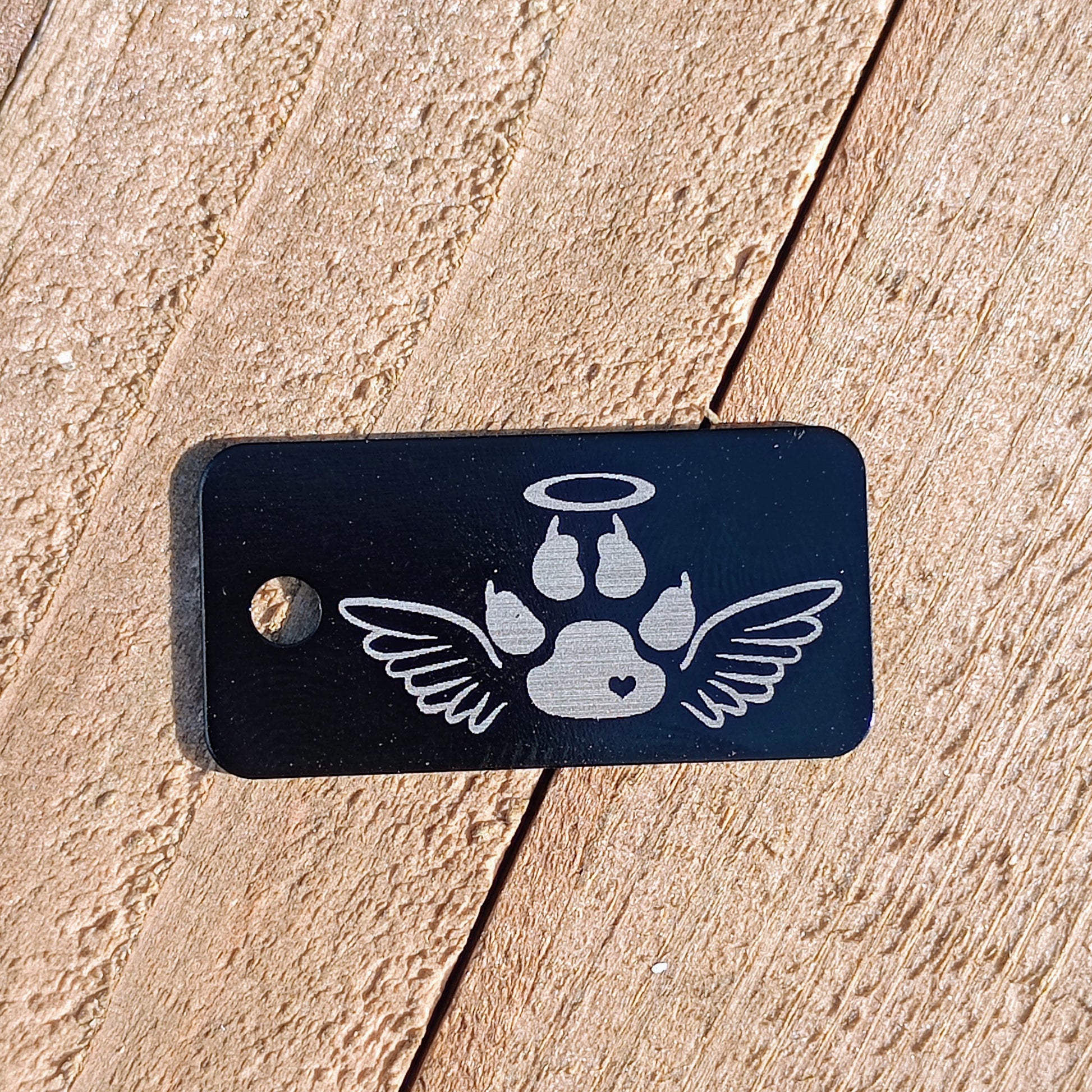This Black Rectangular Tag is anodized aluminum and has a design of a cat paw with angel wings and a halo. This is designed to be used on a keychain and will have a split ring and jump ring included to use attaching it to a keychain.