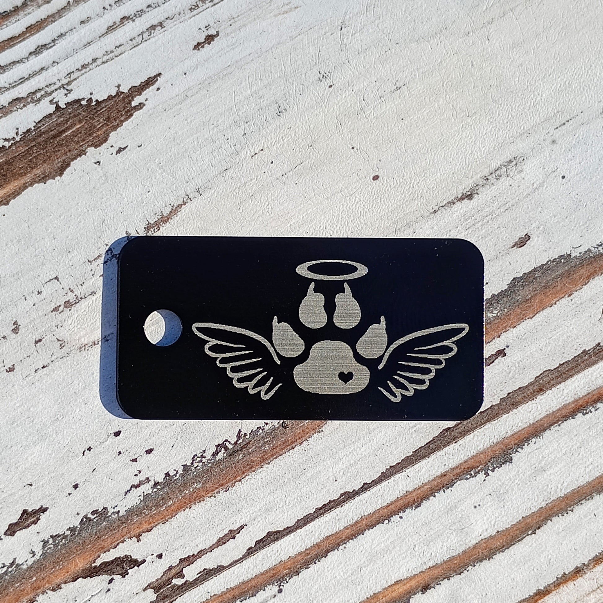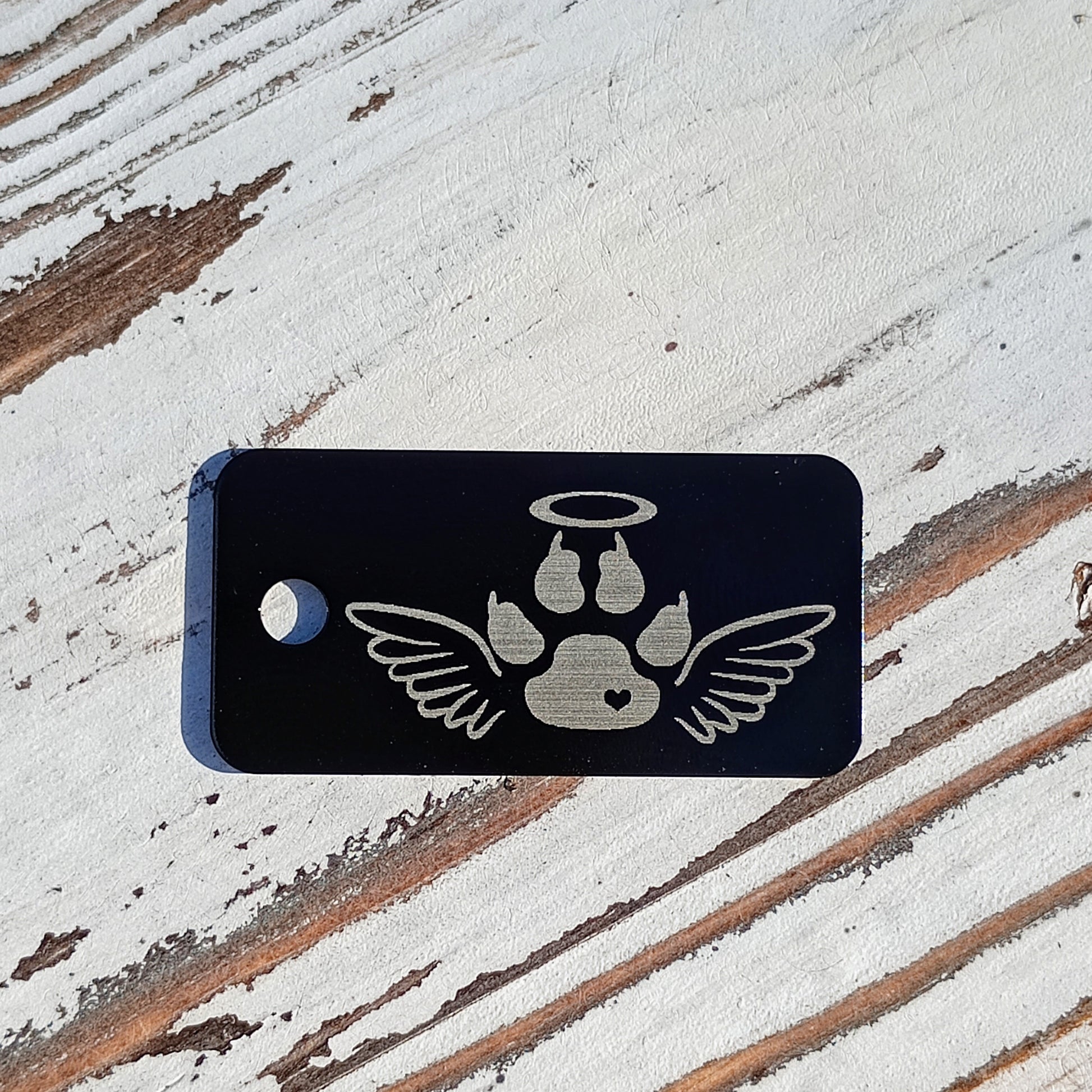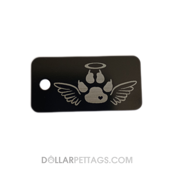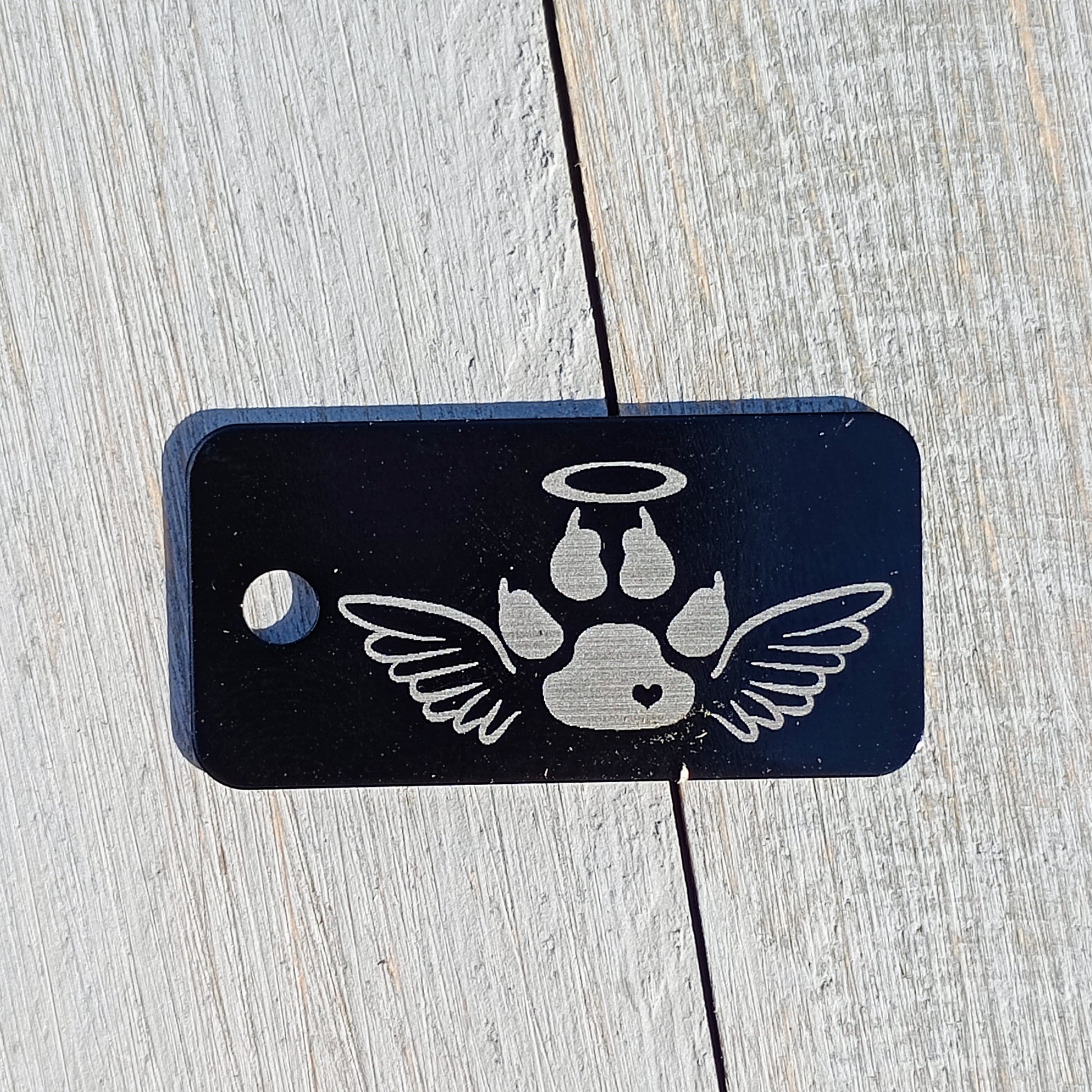 This Black Rectangular Tag is anodized aluminum and has a design of a cat paw with angel wings and a halo. This is designed to be used on a keychain and will have a split ring and jump ring included to use attaching it to a keychain.