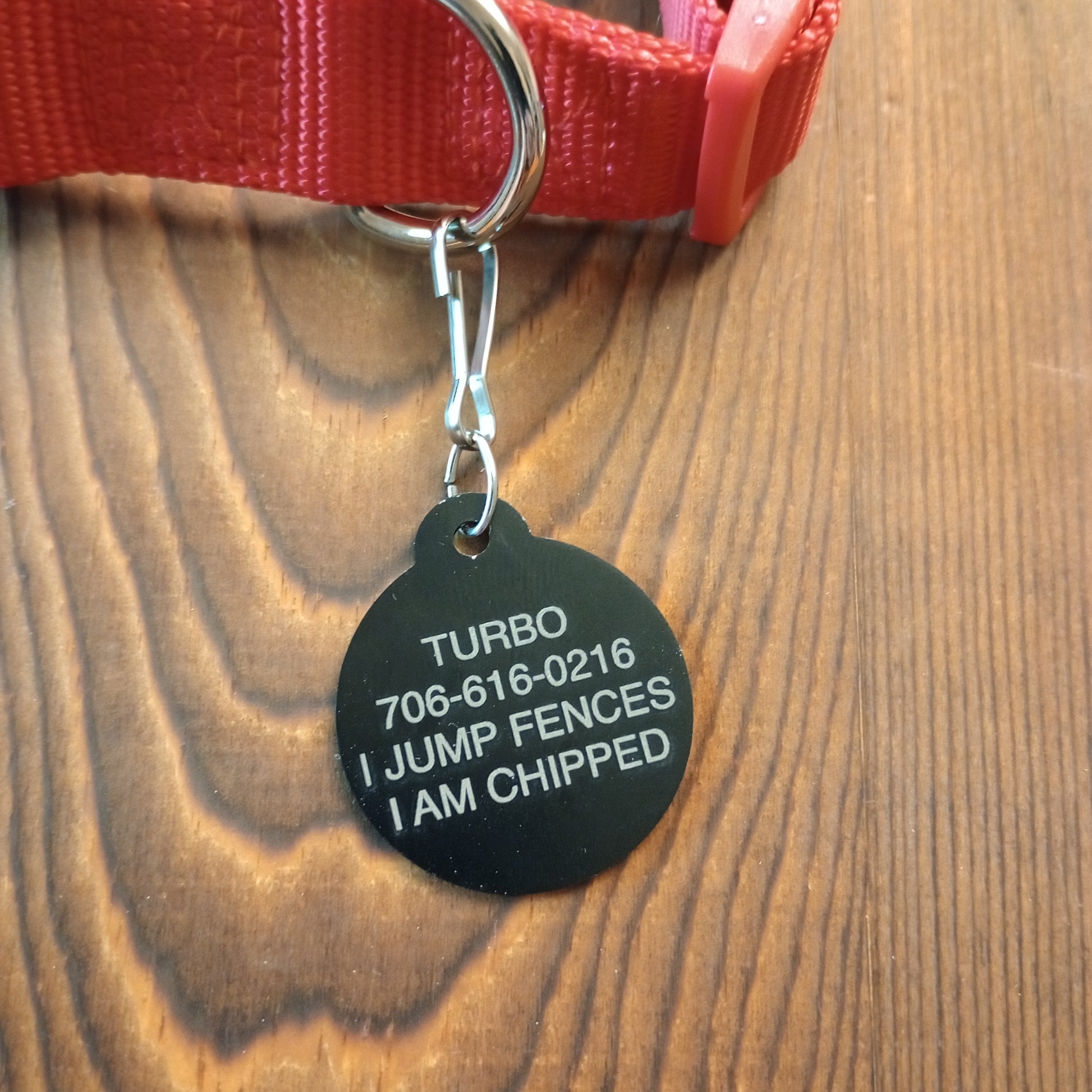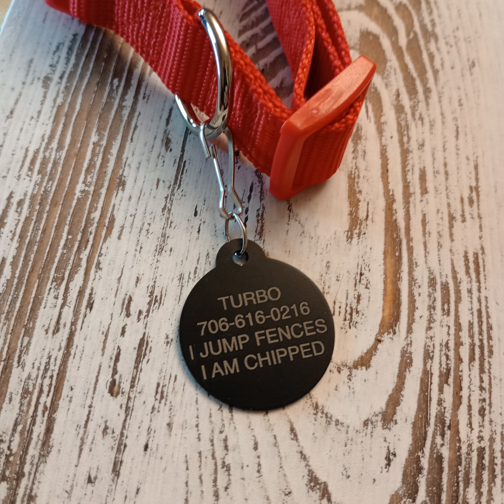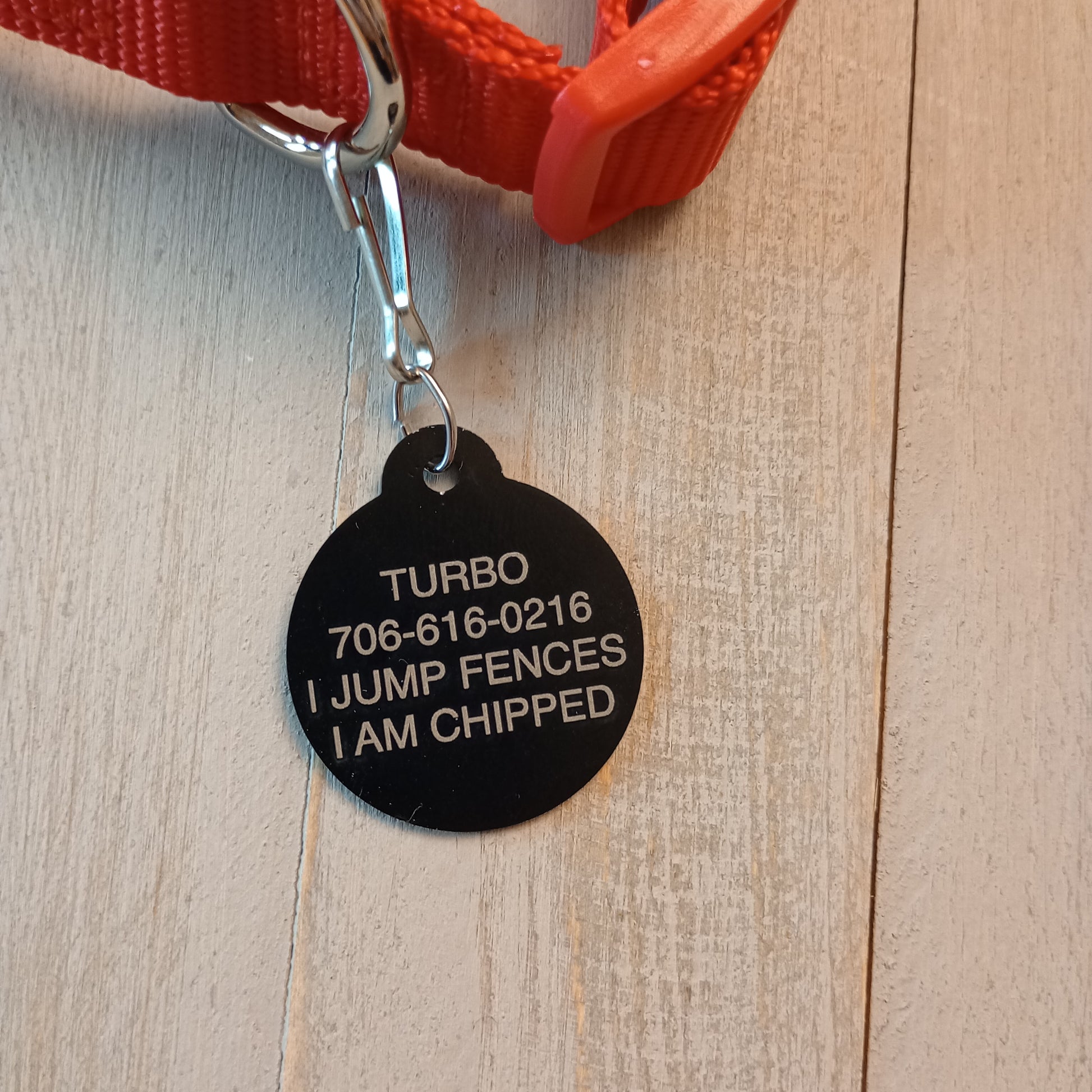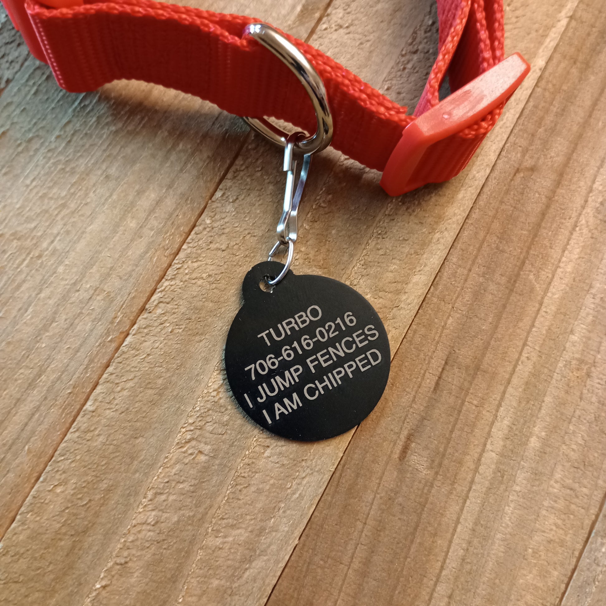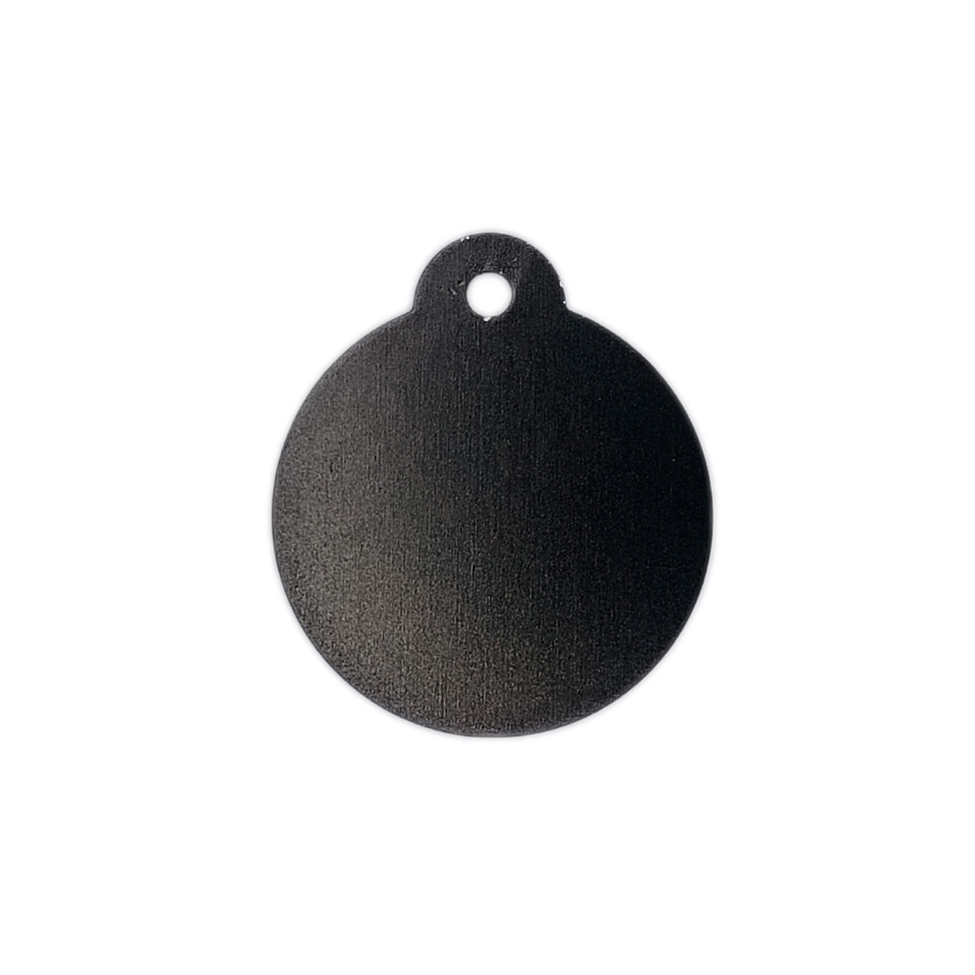 This Black Round 1 and 1/4 inch Pet Tag is anodized aluminum that allows for 4 lines of text to be engraved on the front and 4 lines of text to be engraved on the back.