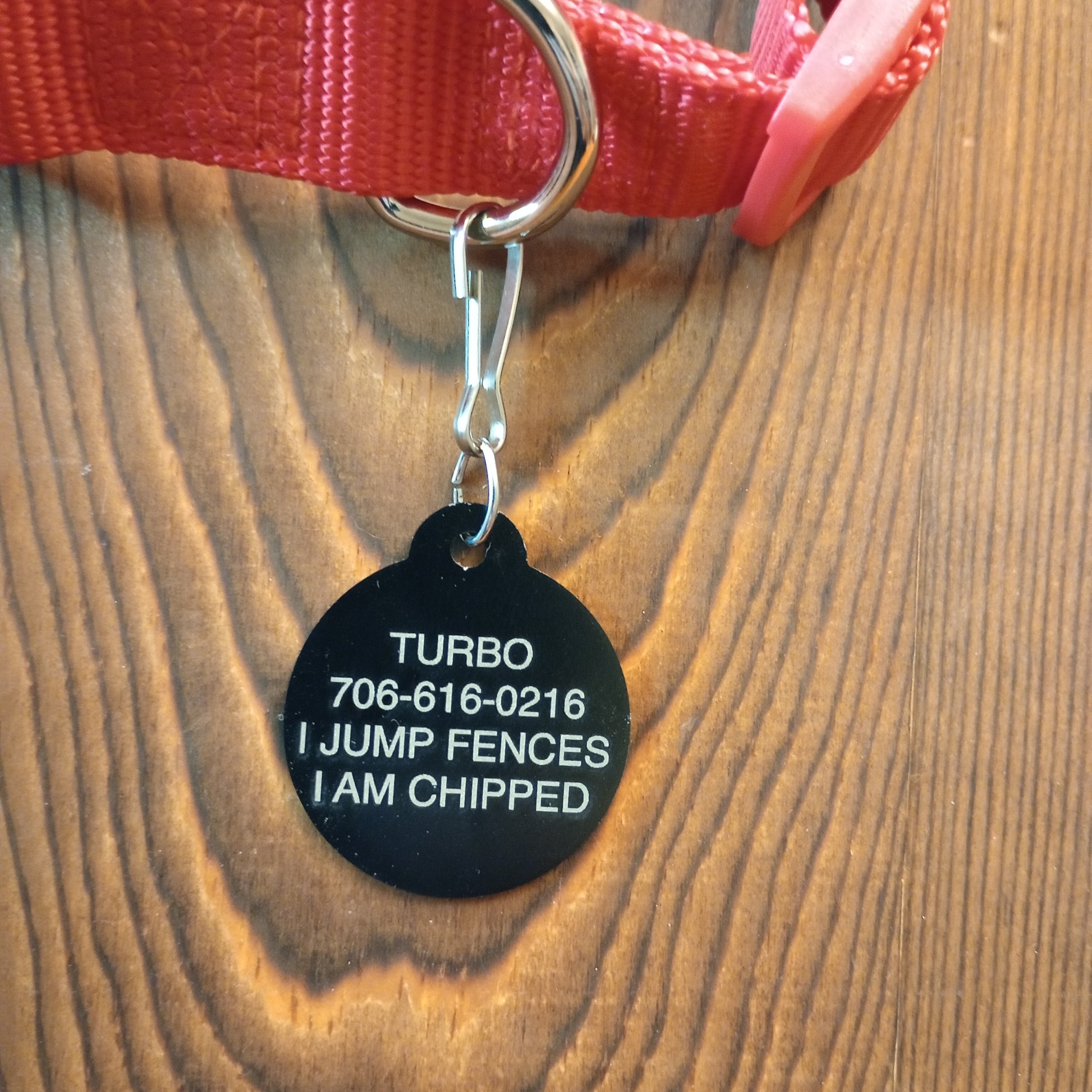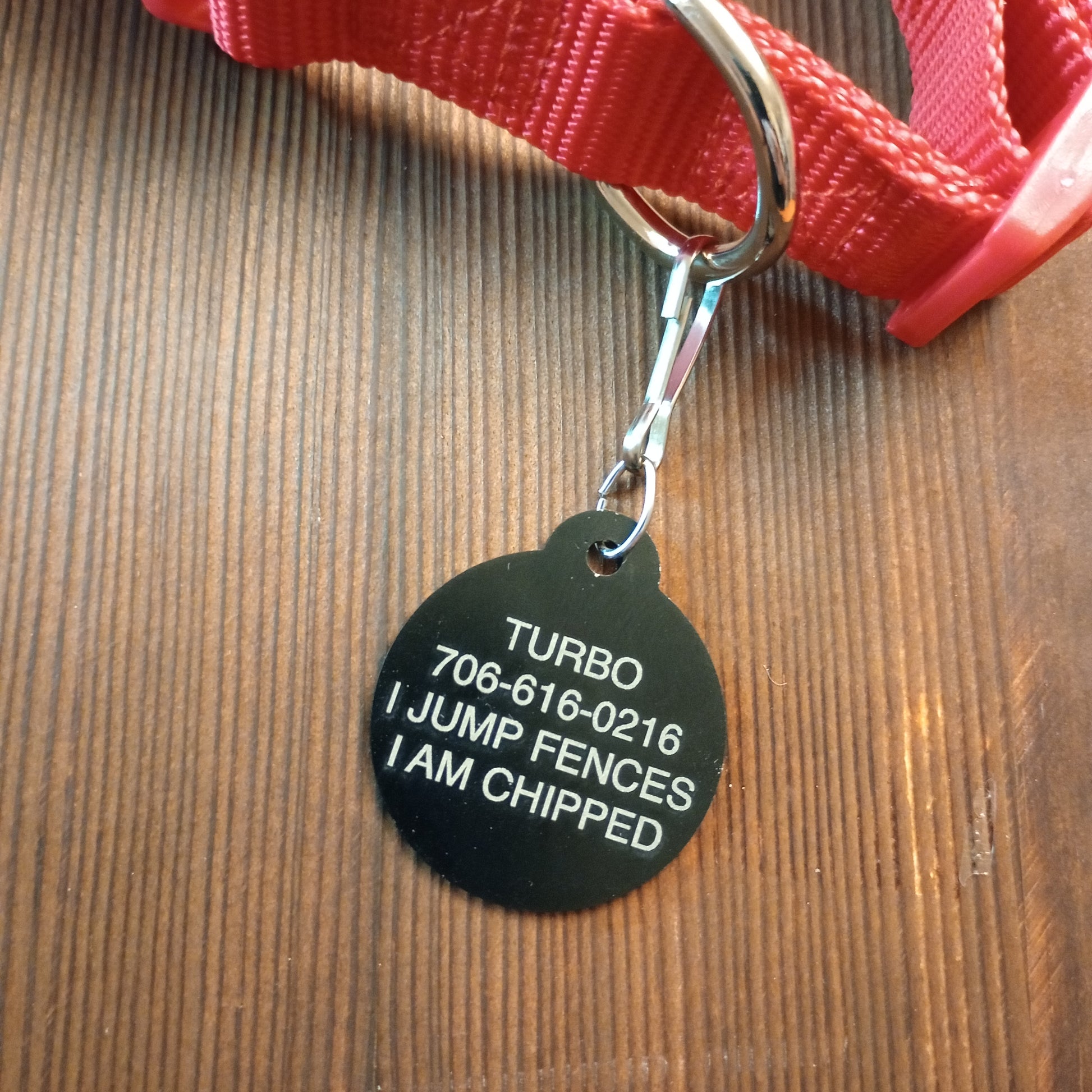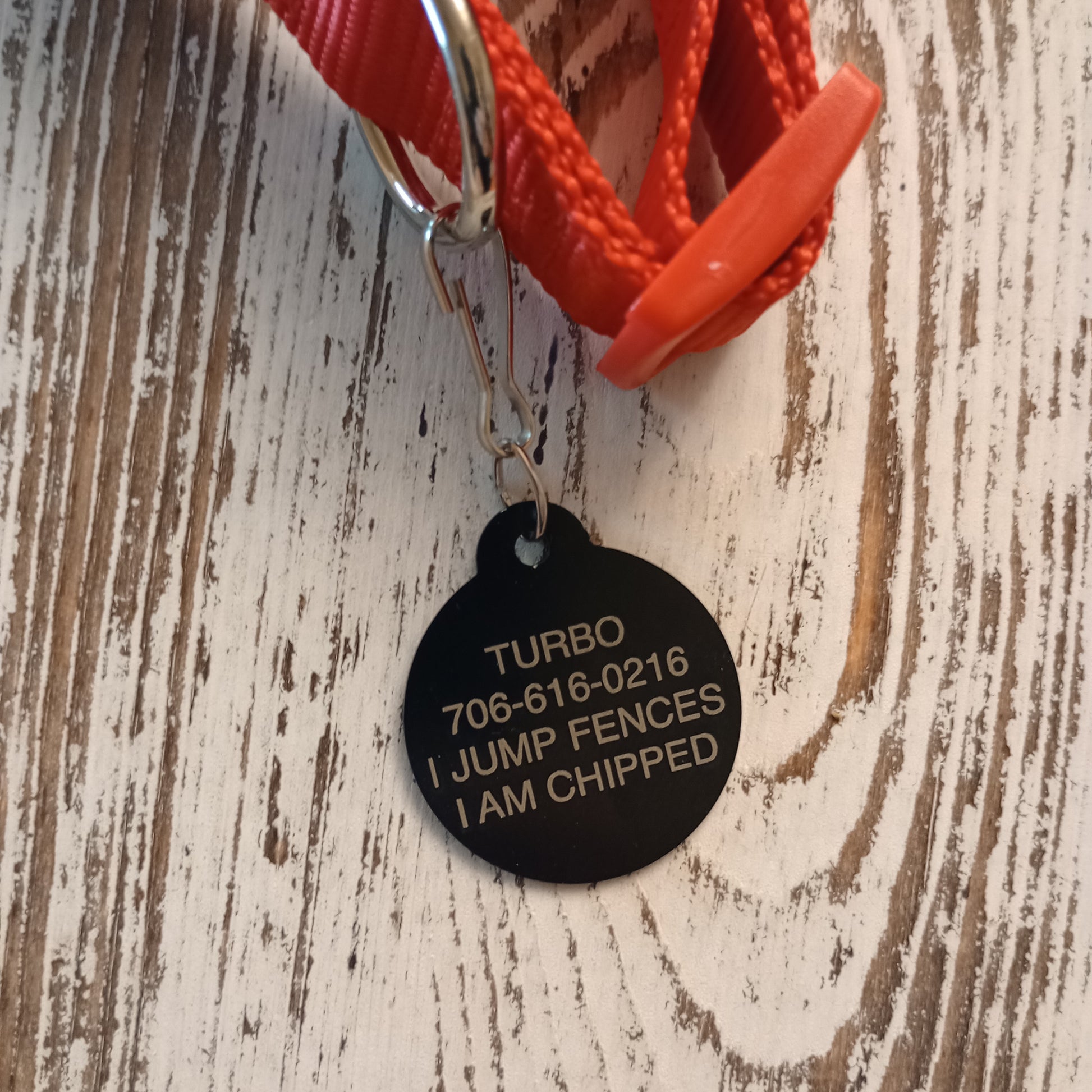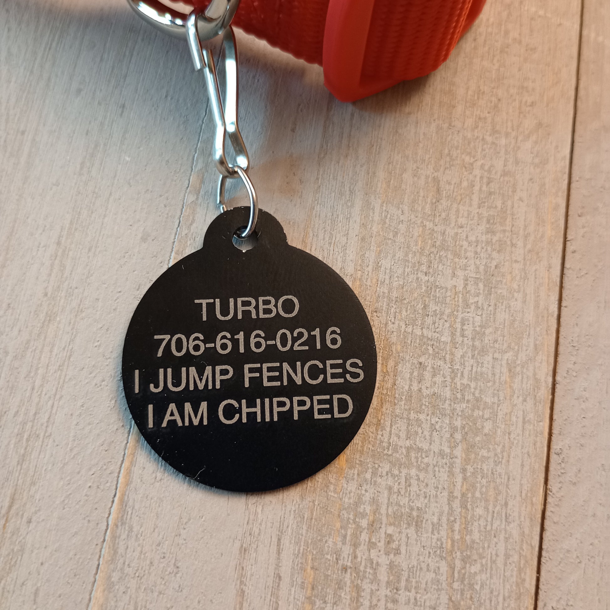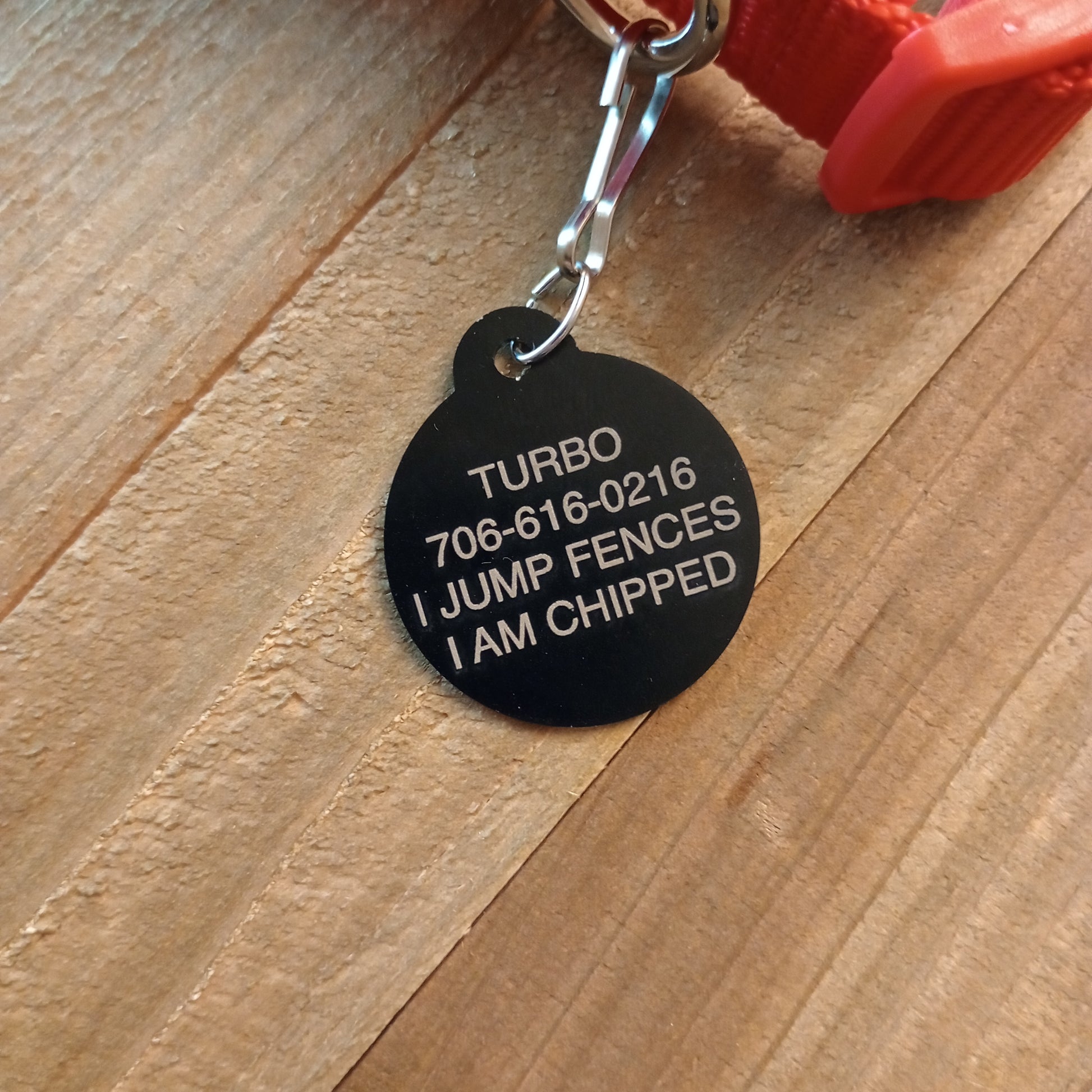This Black Round 1 and 1/4 inch Pet Tag is anodized aluminum that allows for 4 lines of text to be engraved on the front and 4 lines of text to be engraved on the back.
