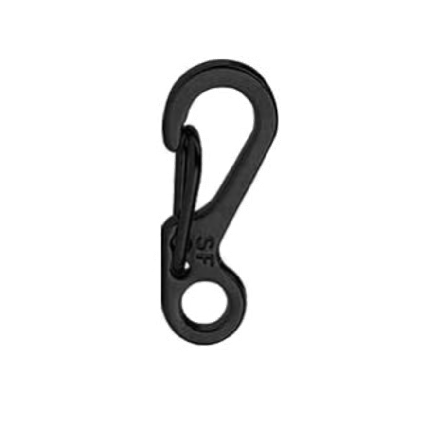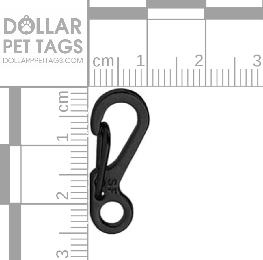 This black SF mini spring clip carabiner is made of aluminum allow with a nickel-free plating. The spring clip allows this to be easily removed or put on a leash or collar. The opening of the clip is about 7 mm which is about 1/4 inch.