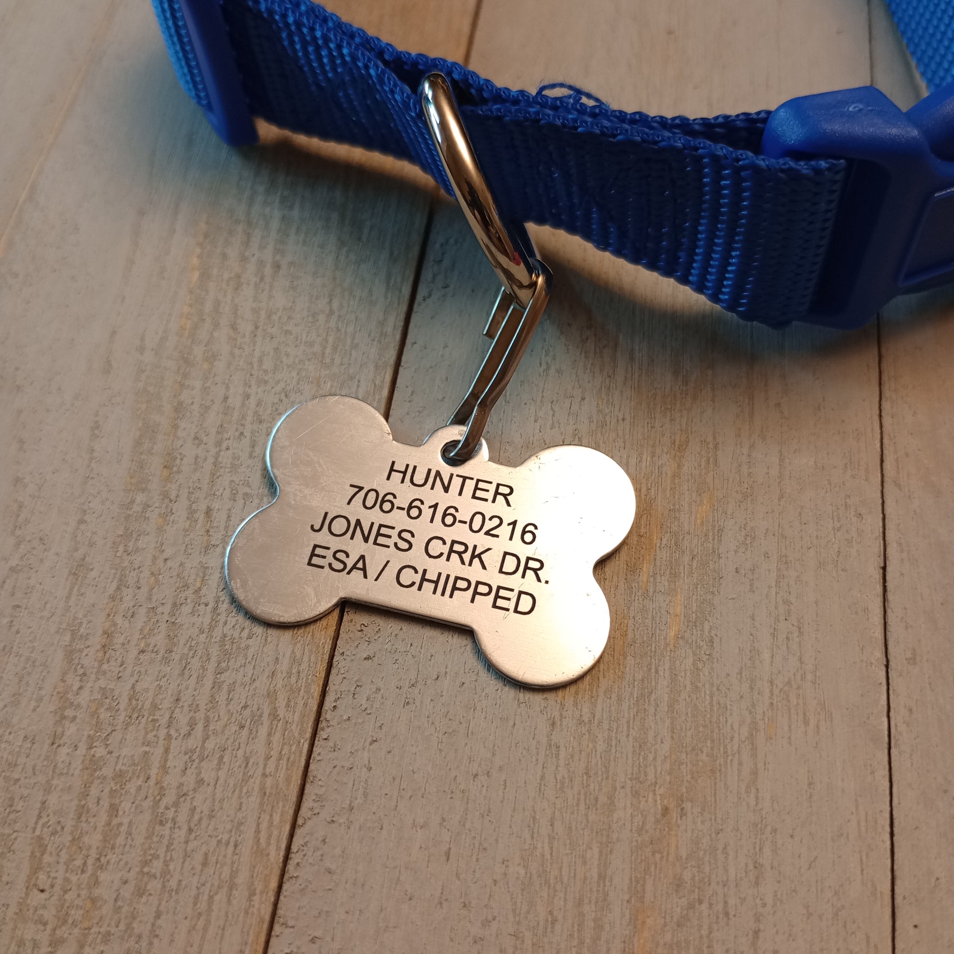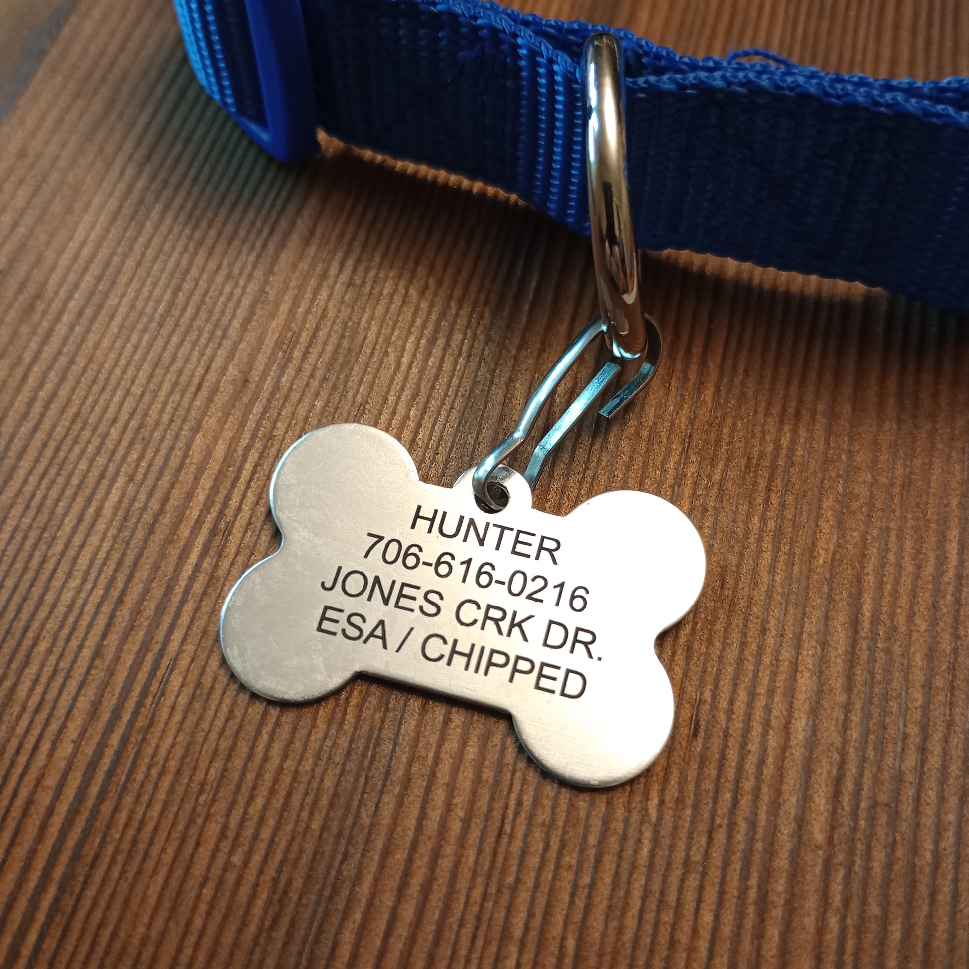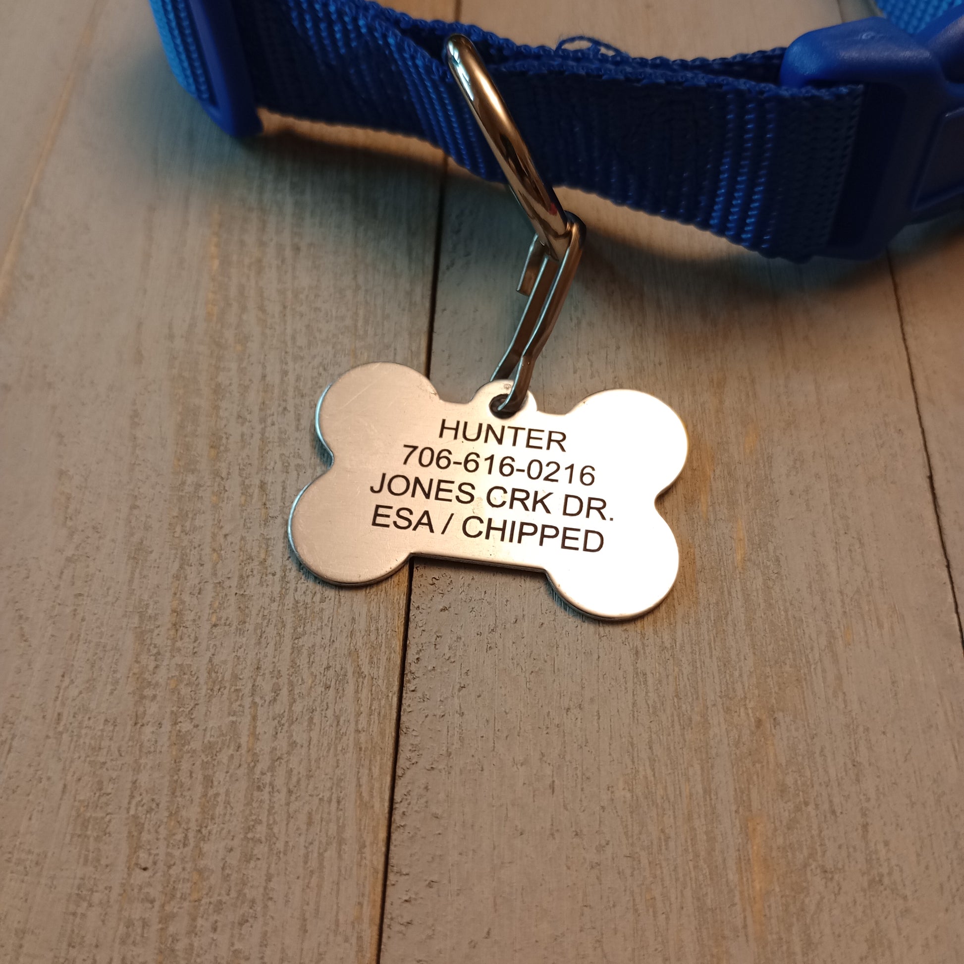 Maximum text limits: If you have more text that you would like to fit on the tag than the online store allows for the customization, reach out to us using the contact page at the top of the site. The limits are typically set so that the text can look good based on the engravable area for the pet tag. In most cases, we can add a lot more text, but the size of the text will have to decrease due to the engravable space.