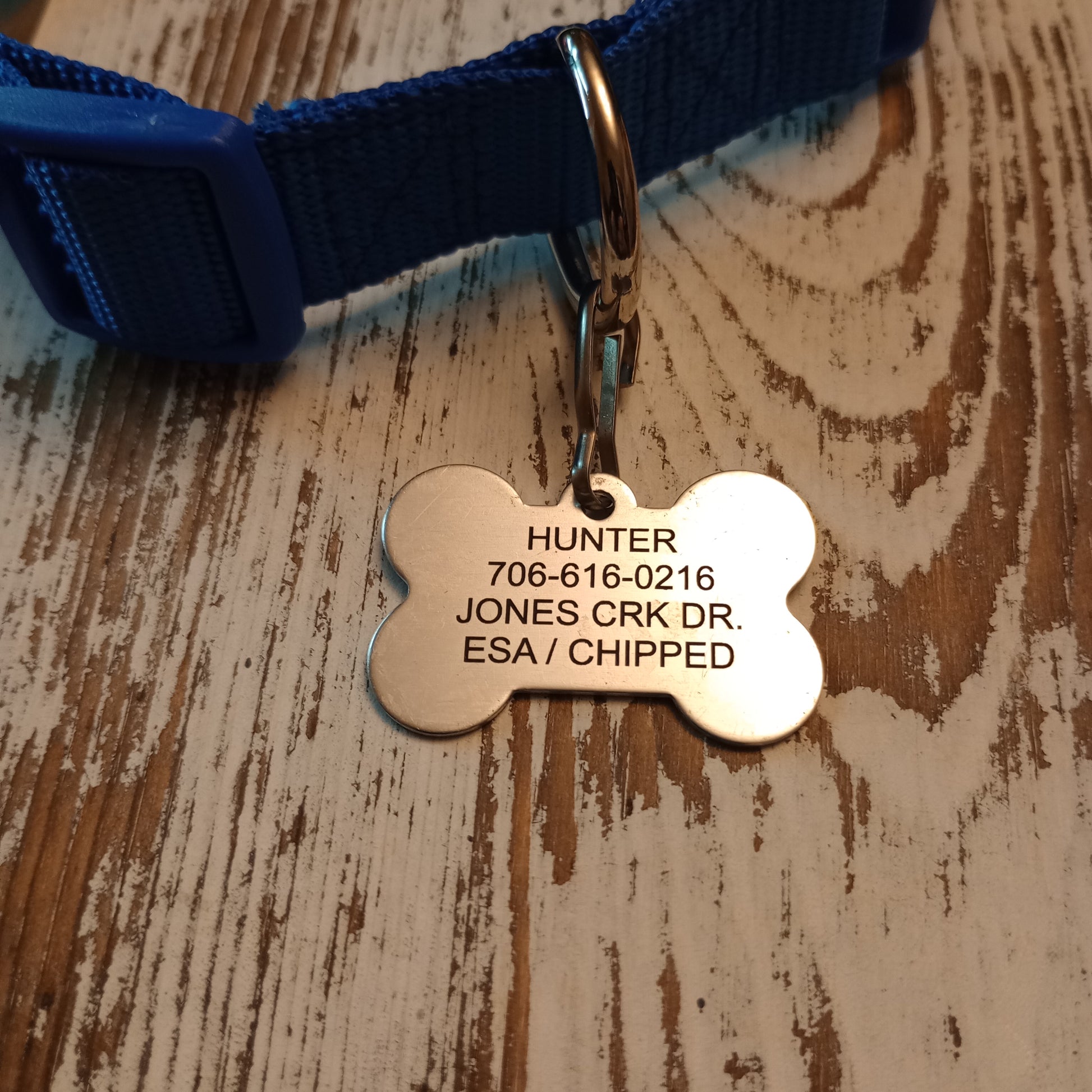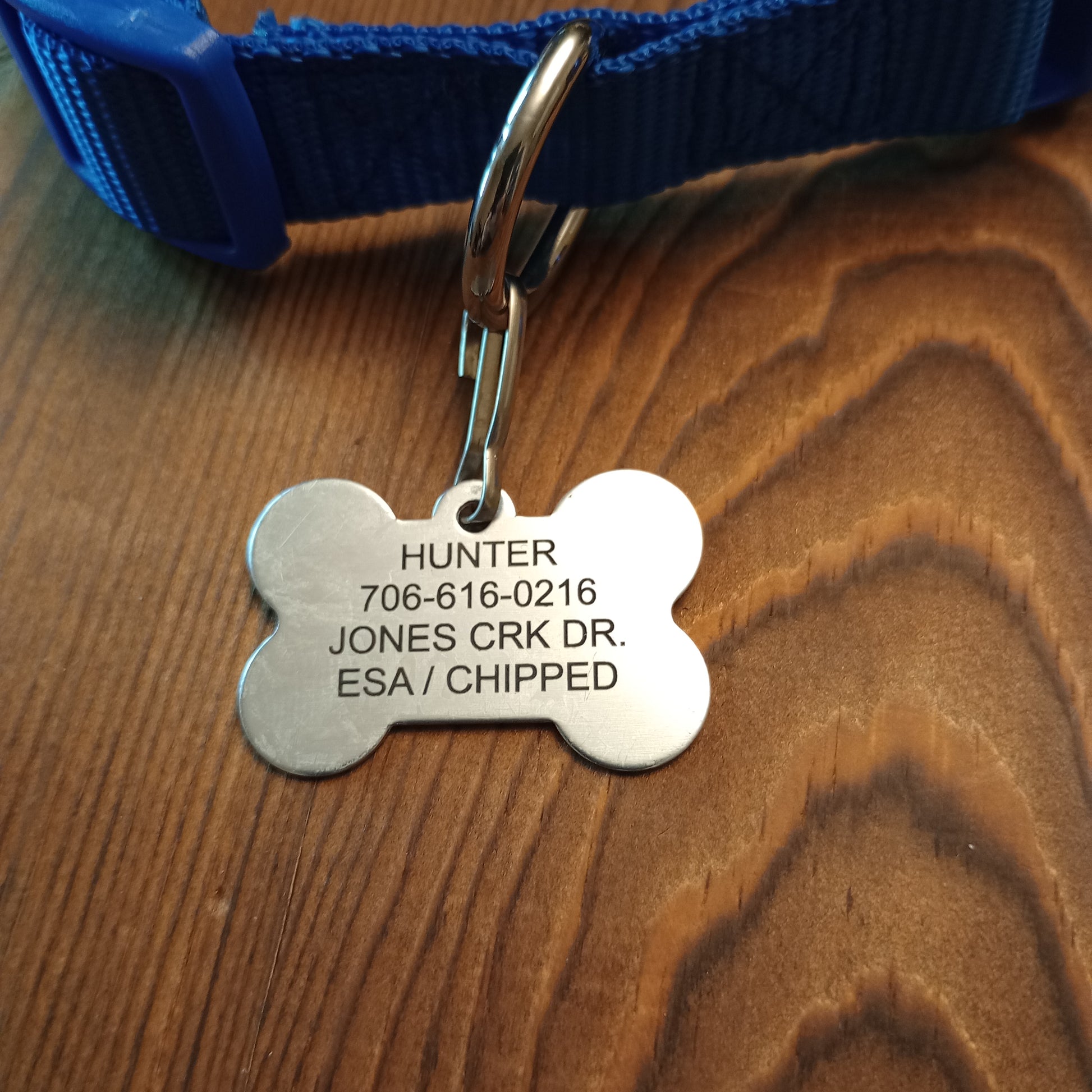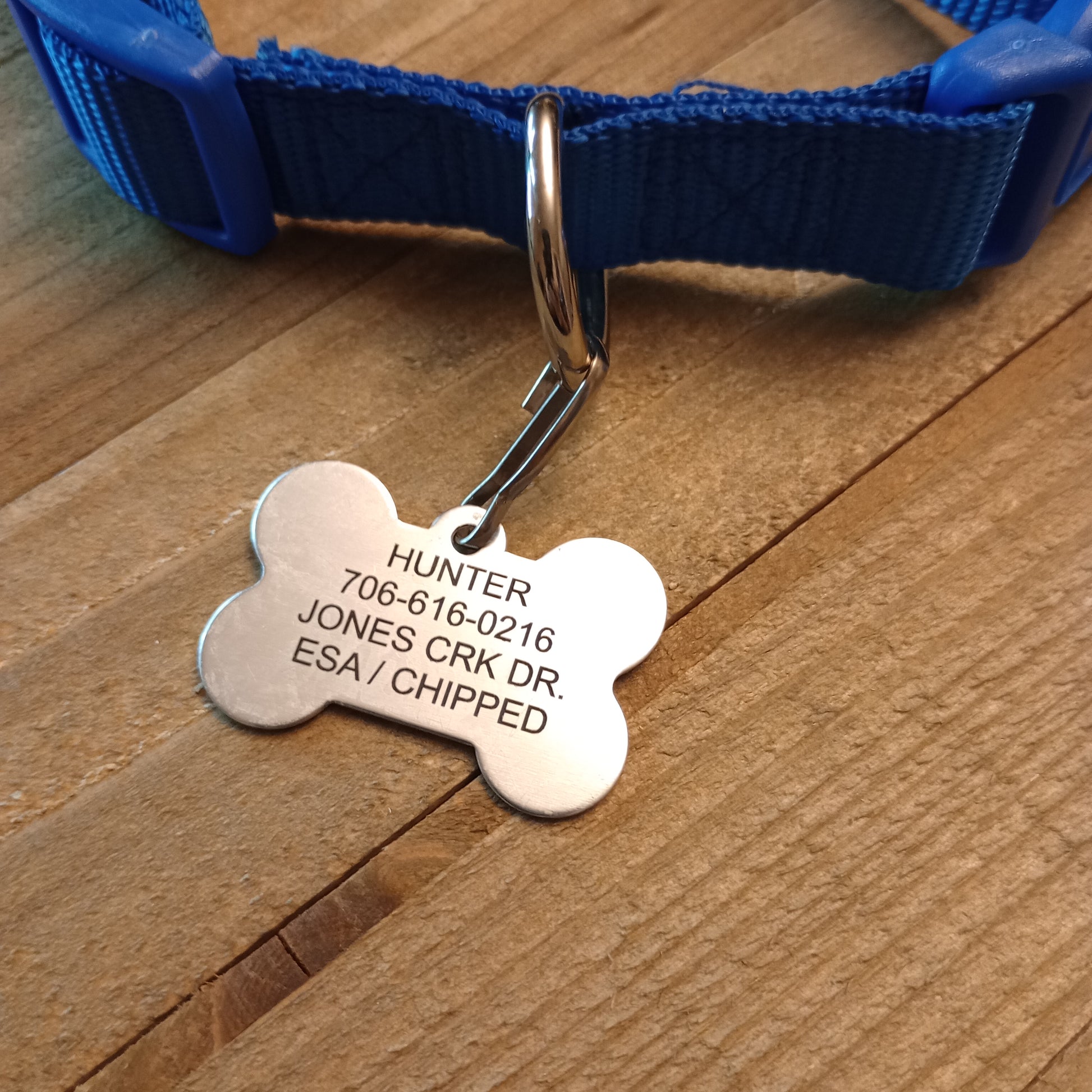 Maximum text limits: If you have more text that you would like to fit on the tag than the online store allows for the customization, reach out to us using the contact page at the top of the site. The limits are typically set so that the text can look good based on the engravable area for the pet tag. In most cases, we can add a lot more text, but the size of the text will have to decrease due to the engravable space.