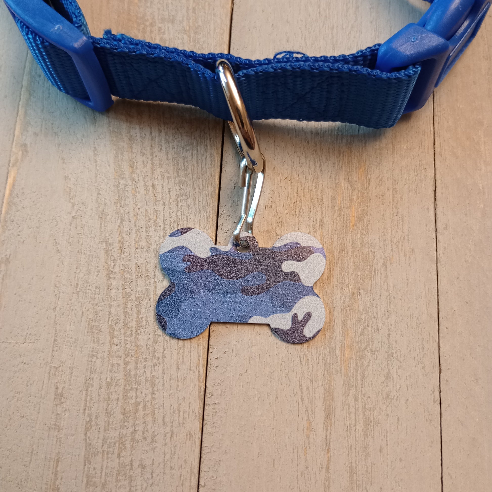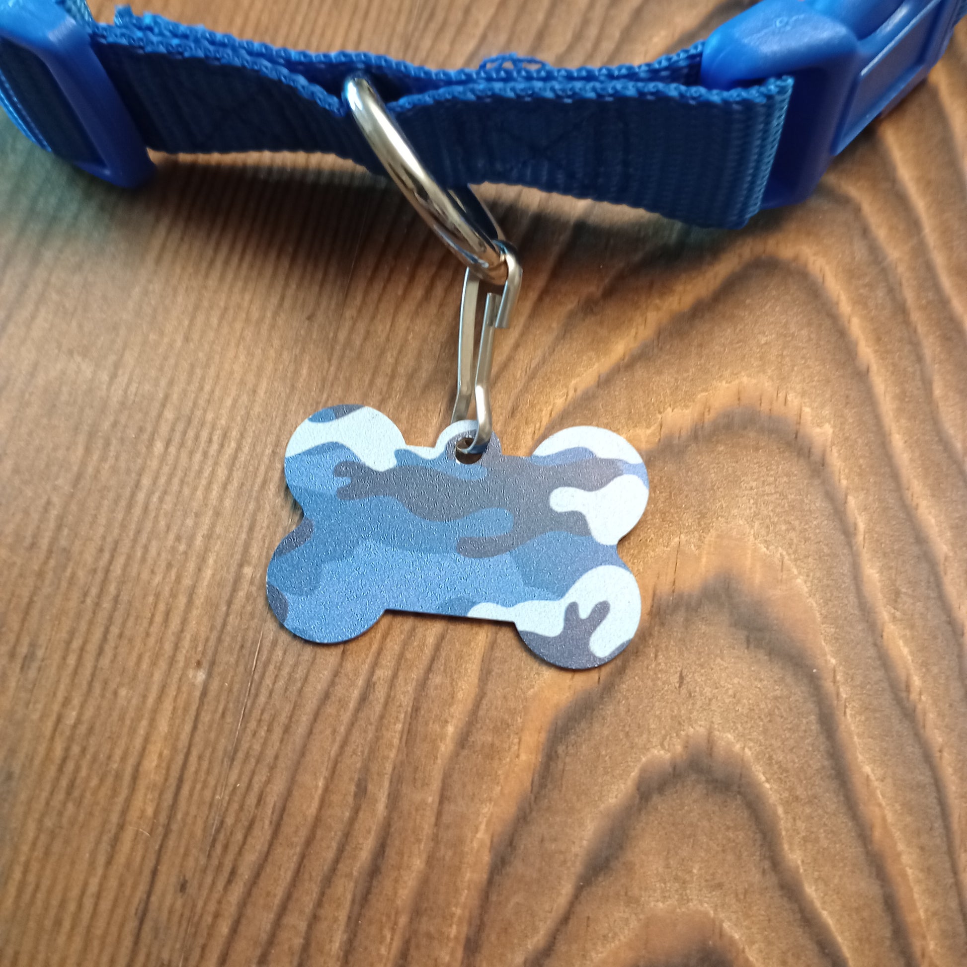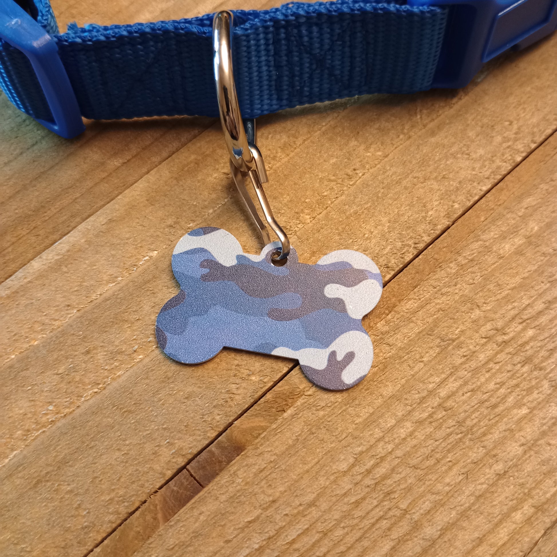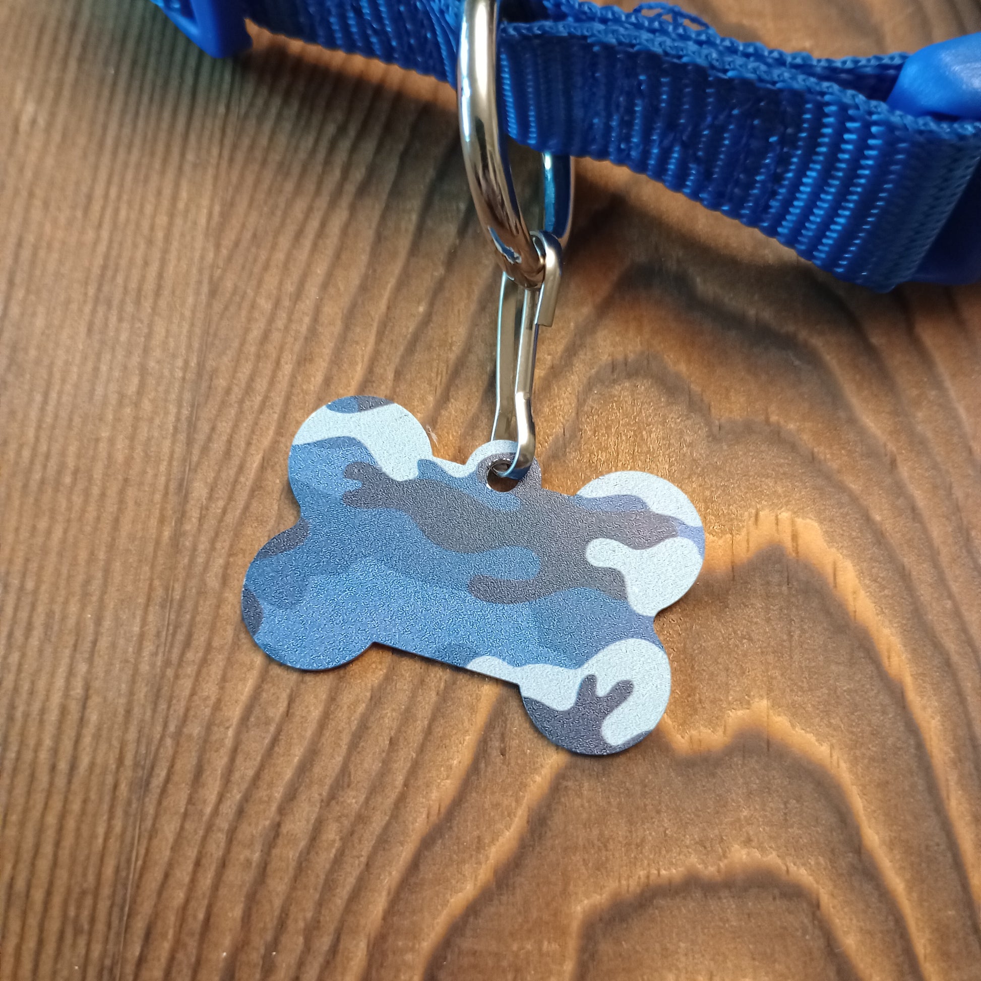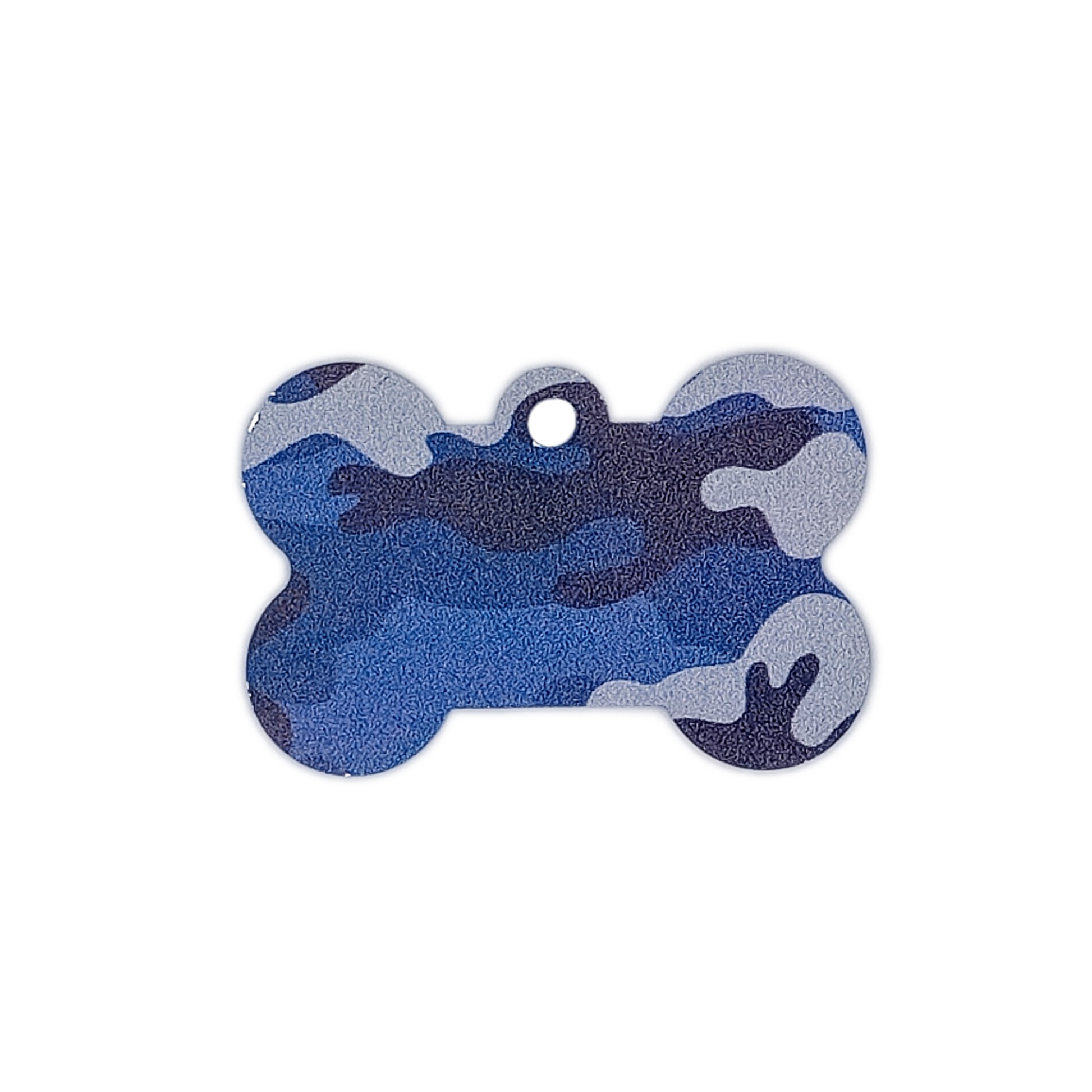 This Blue Camouflage Bone Shaped Pet Tag is anodized aluminum that allows for 4 lines of text on the back only. The back of the tag is silver colored with no camouflage design.