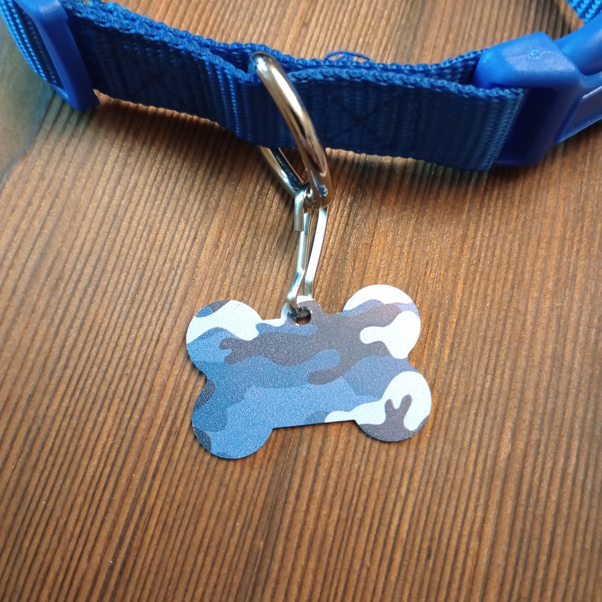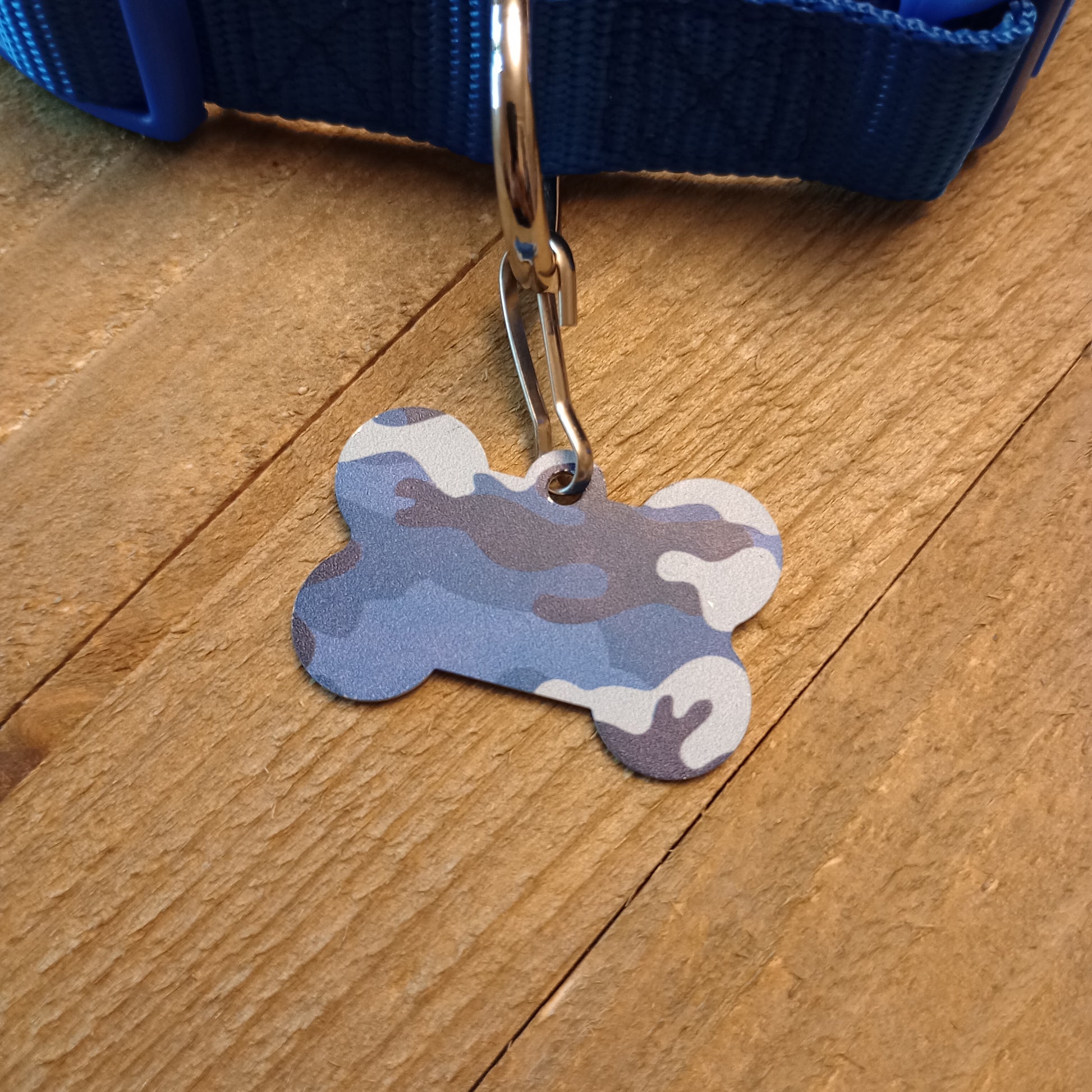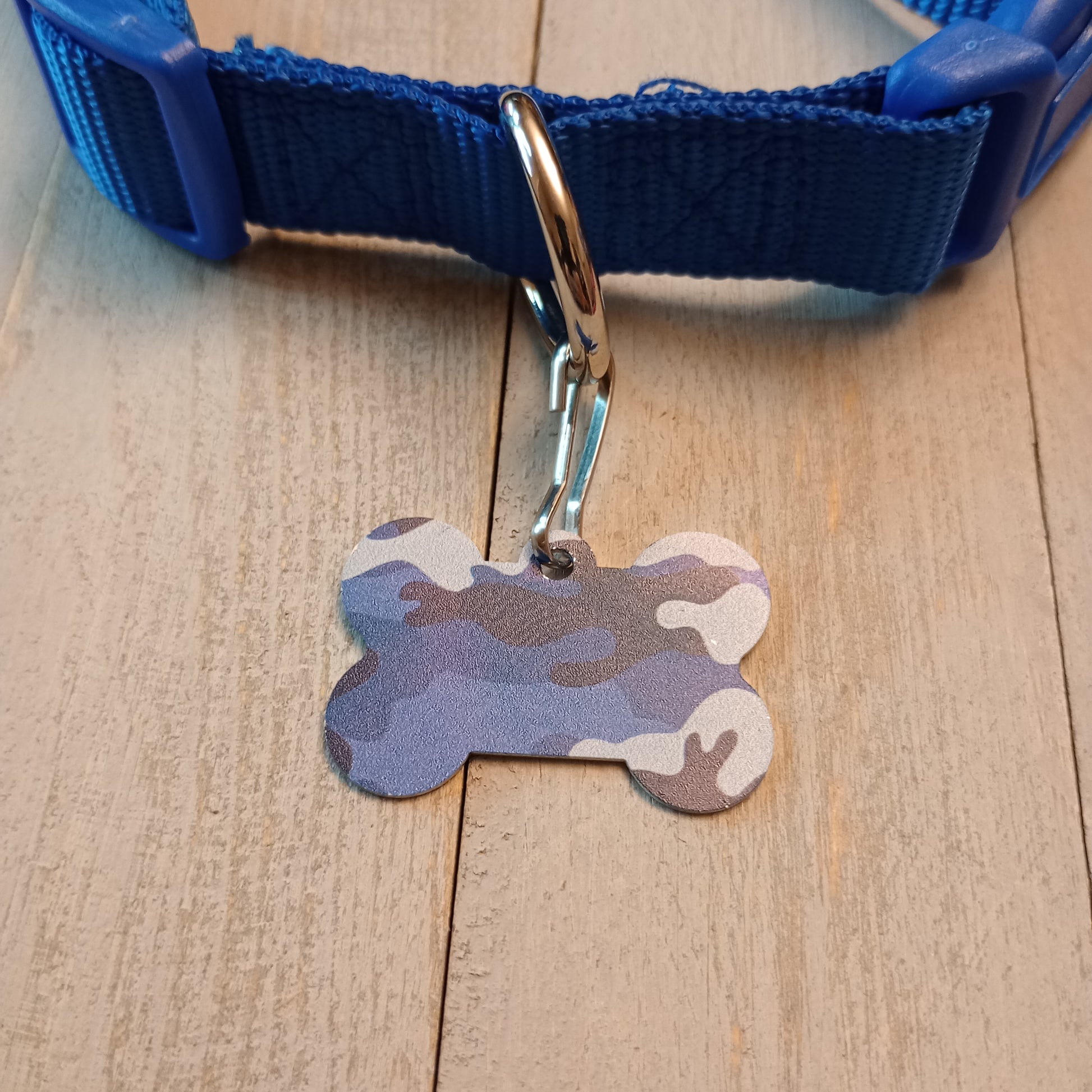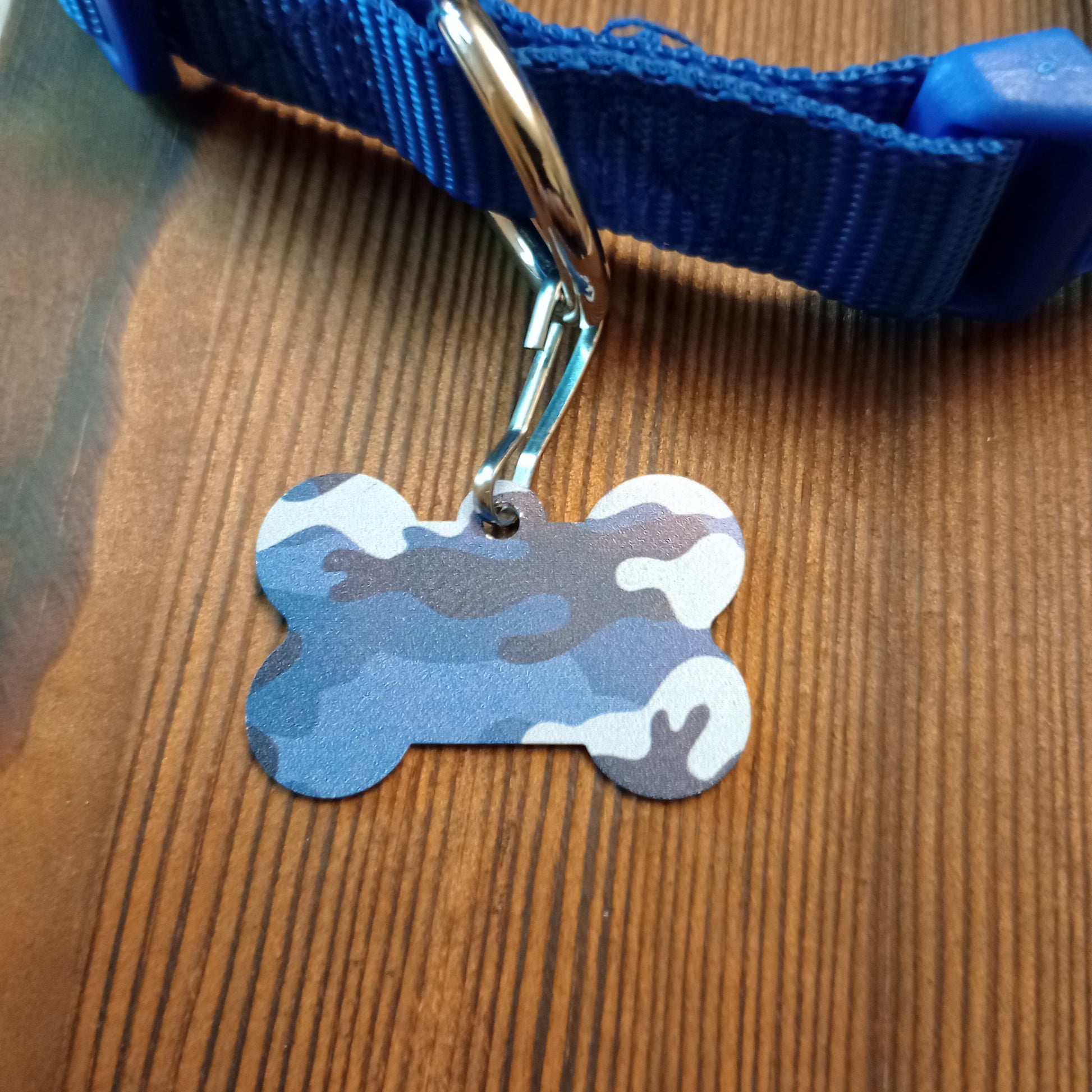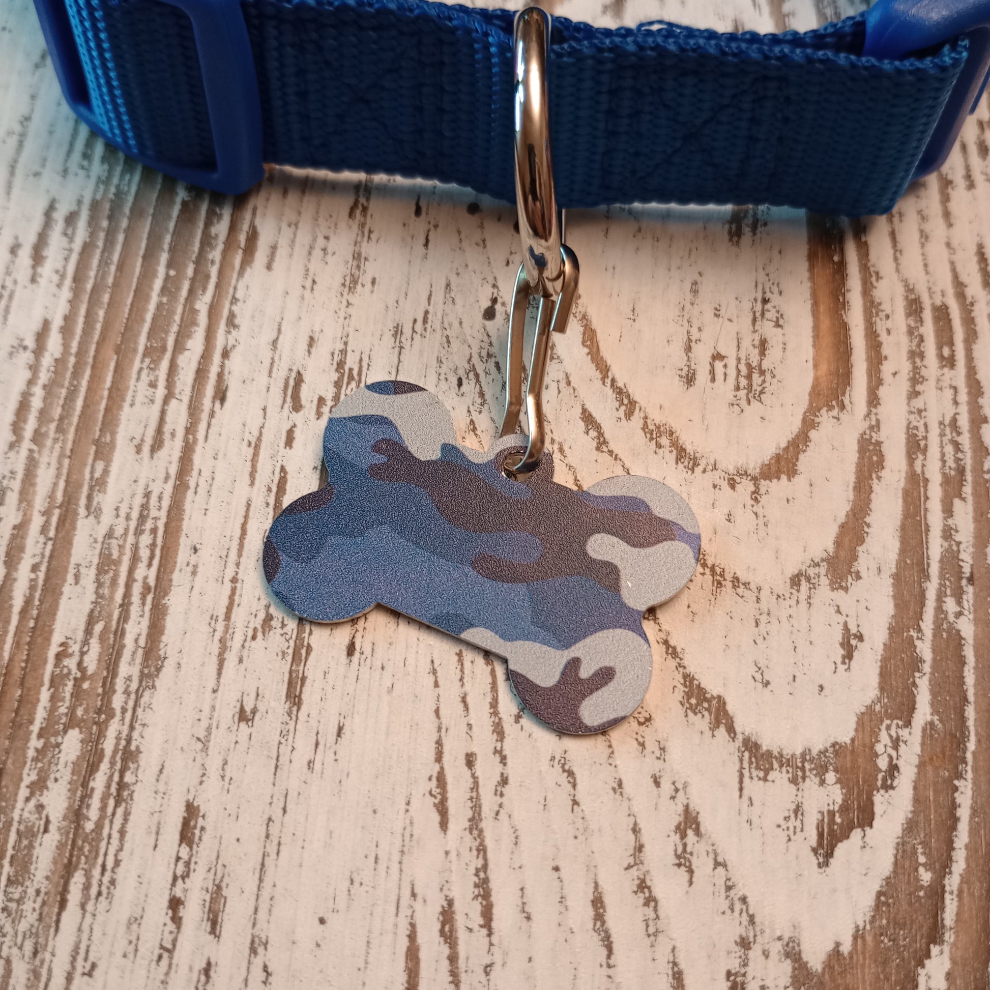 This Blue Camouflage Bone Shaped Pet Tag is anodized aluminum that allows for 4 lines of text on the back only. The back of the tag is silver colored with no camouflage design.