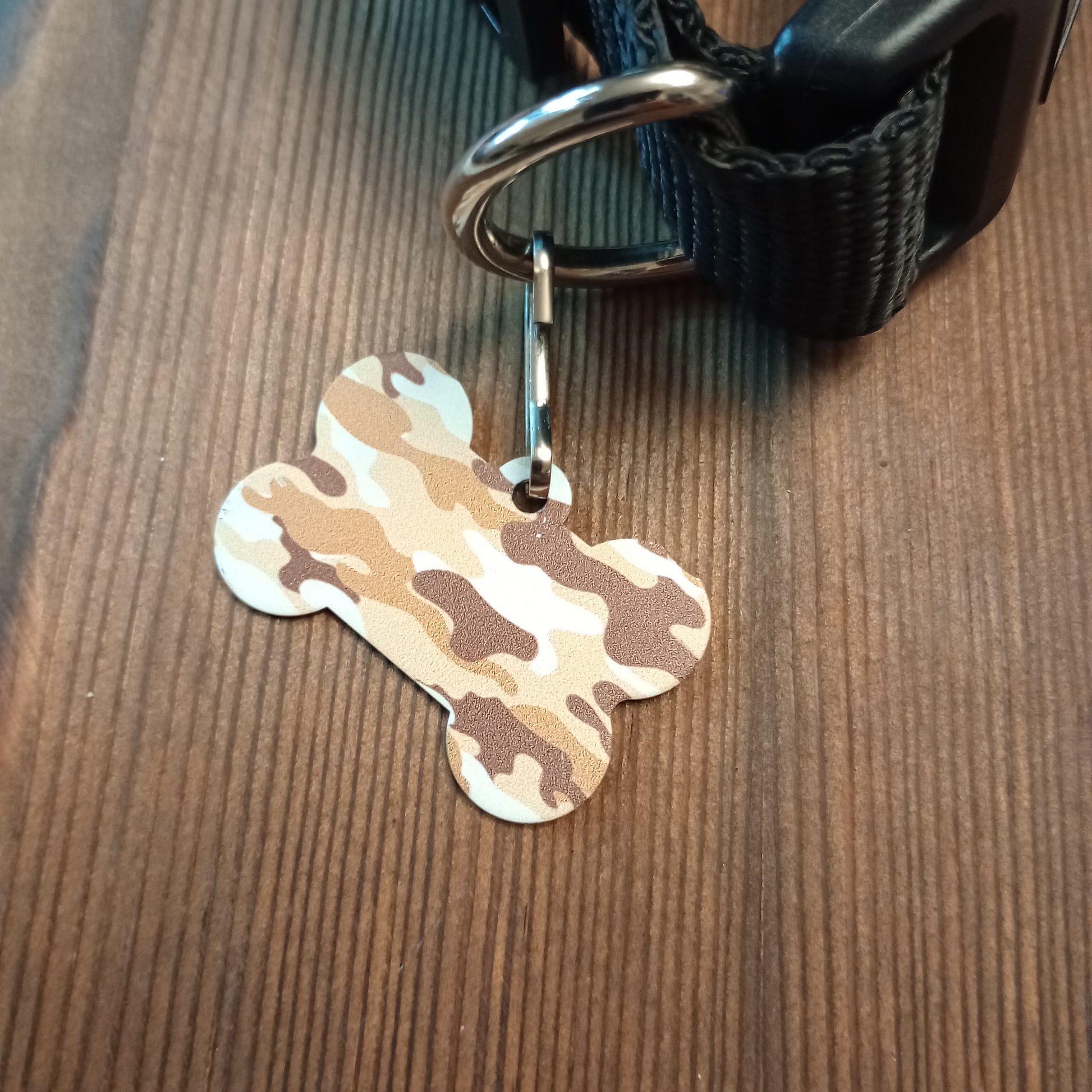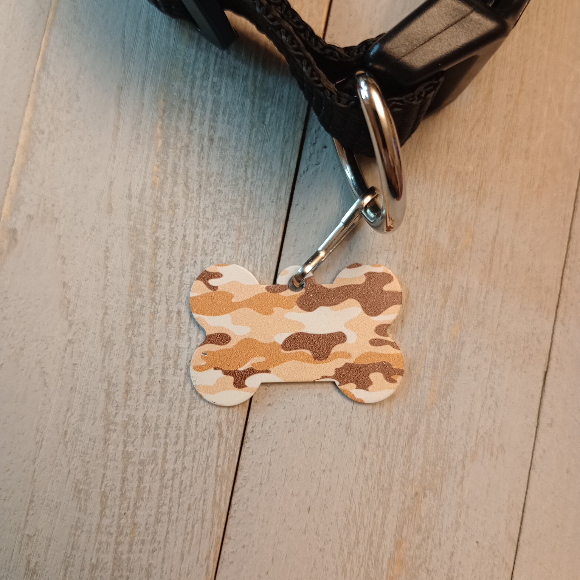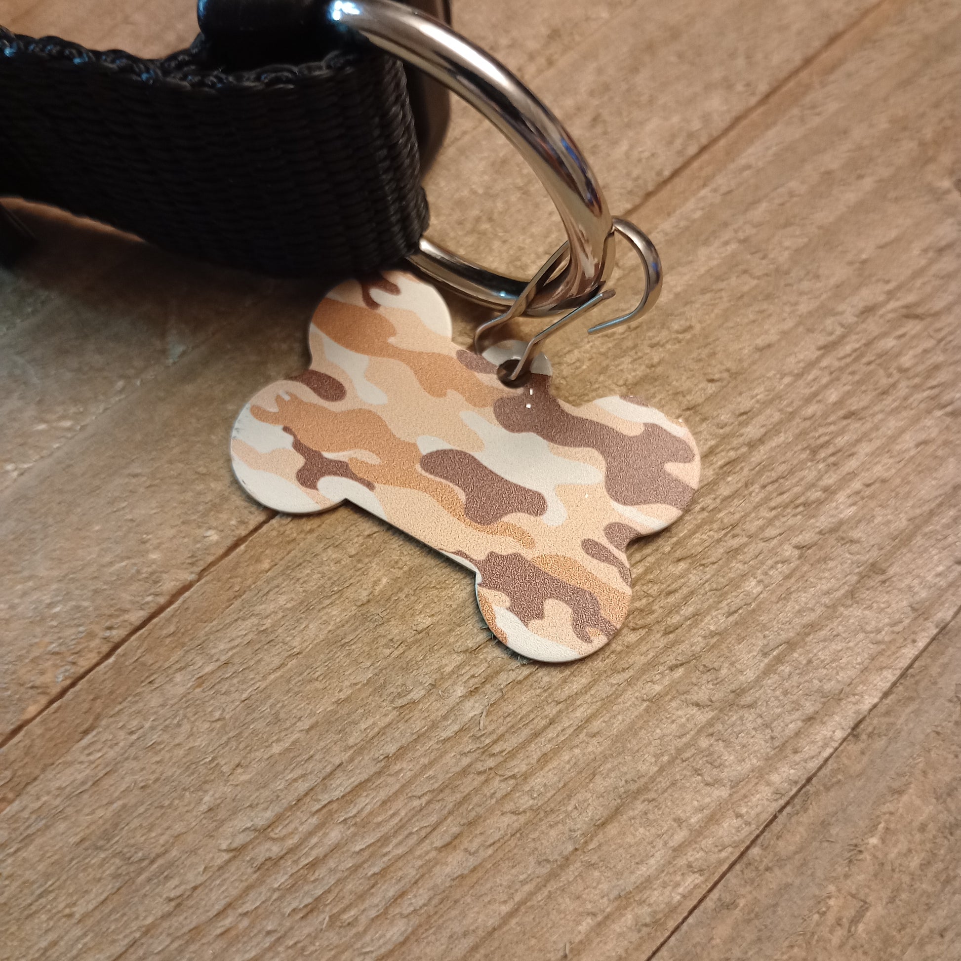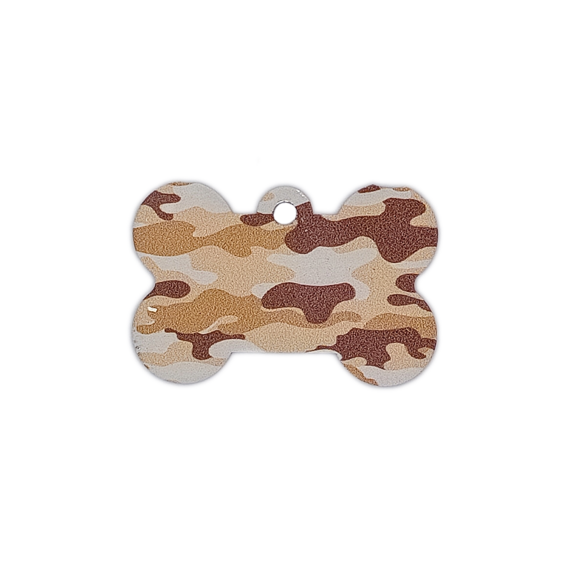 This Brown Camouflage Bone Shaped Pet Tag is anodized aluminum that allows for 4 lines of text on the back only. The back of the tag is silver colored with no camouflage design.