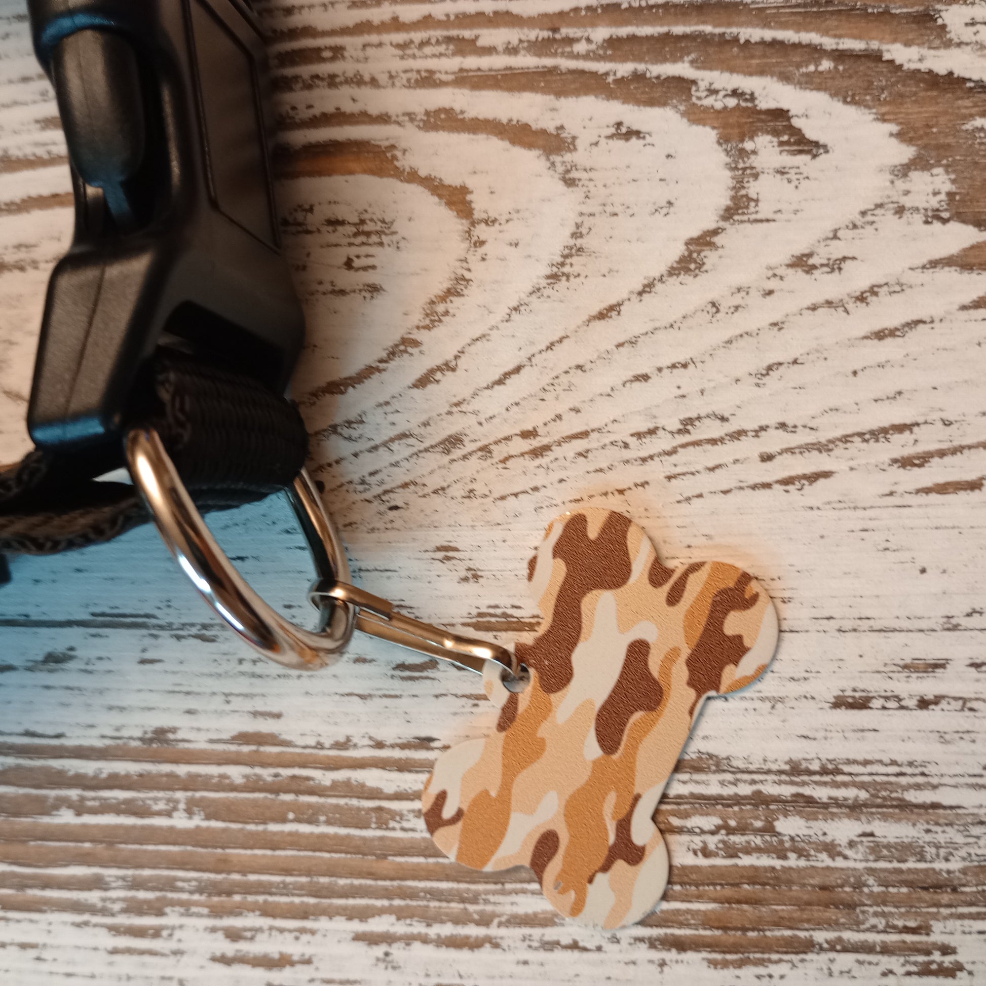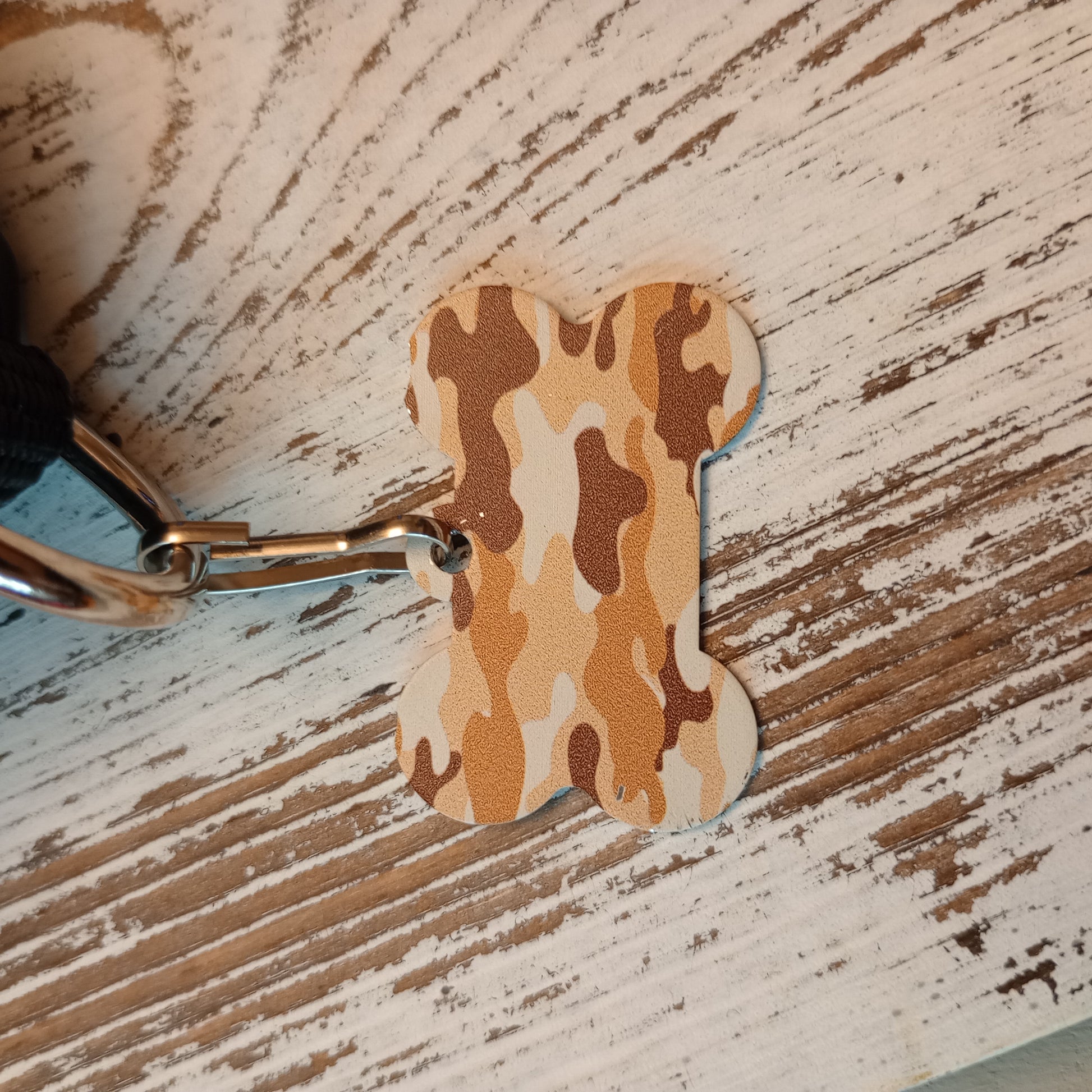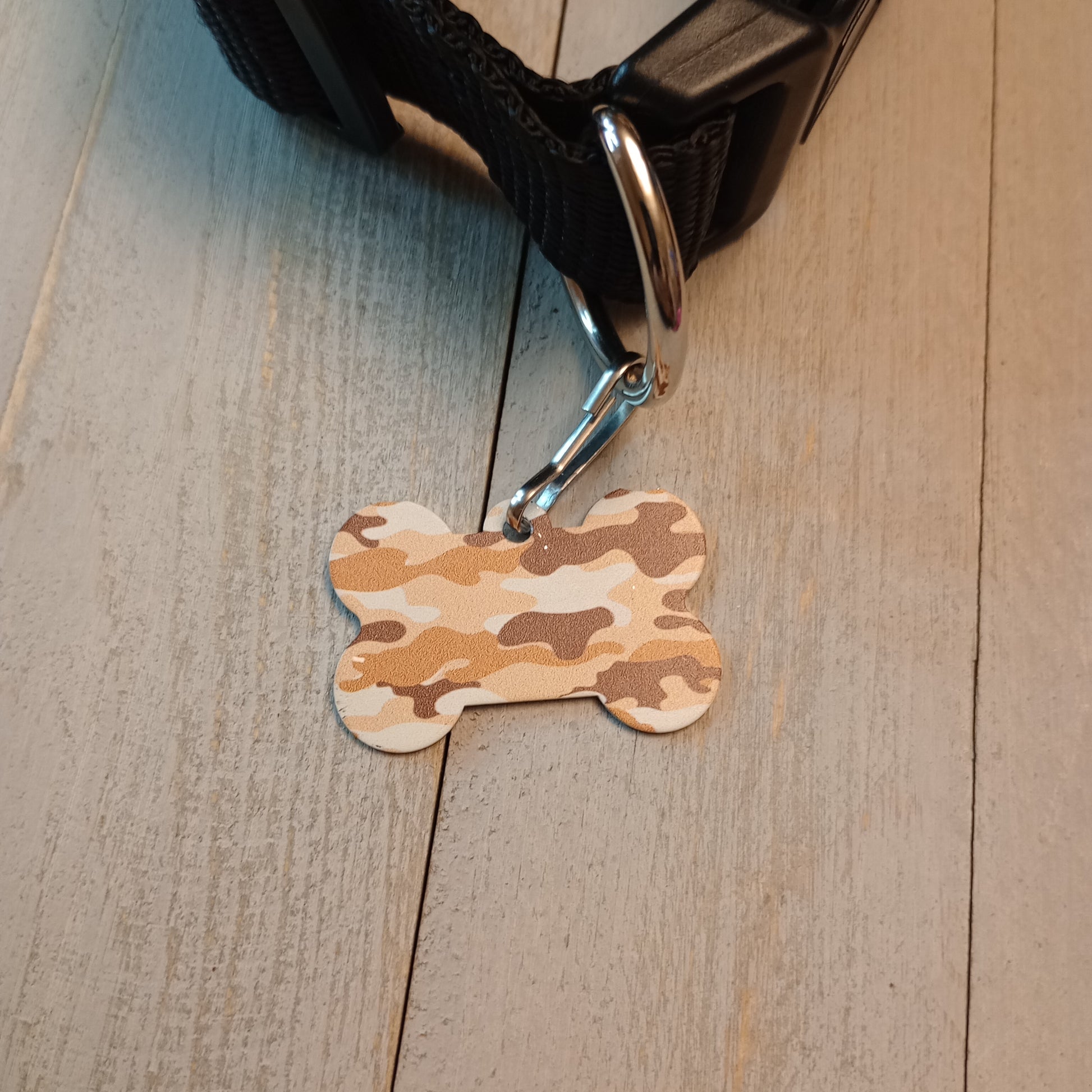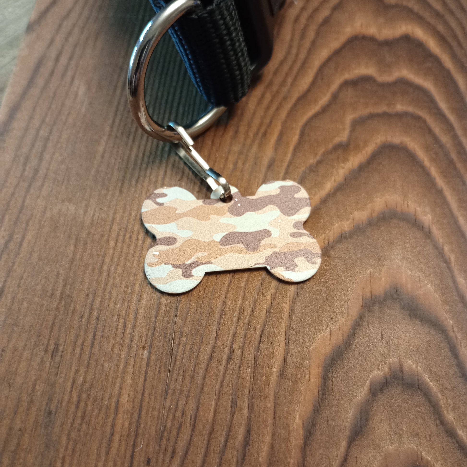 This Brown Camouflage Bone Shaped Pet Tag is anodized aluminum that allows for 4 lines of text on the back only. The back of the tag is silver colored with no camouflage design.