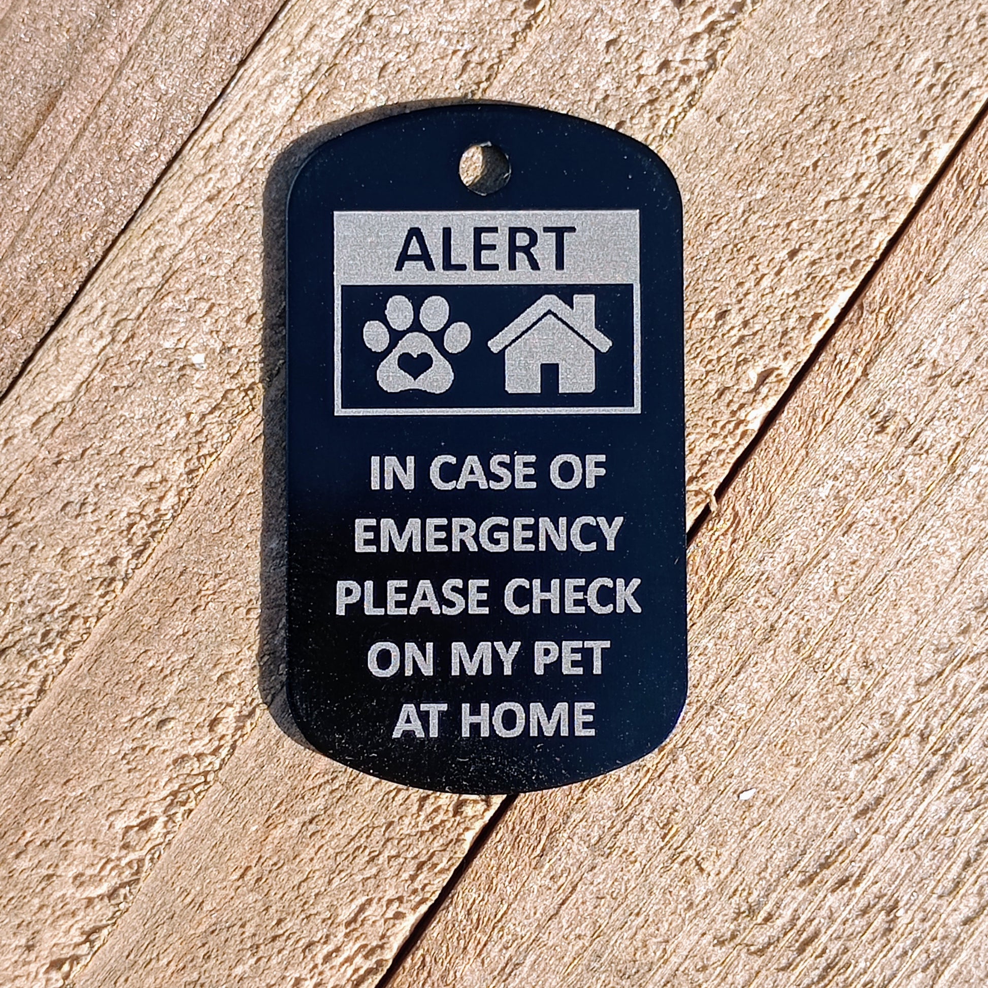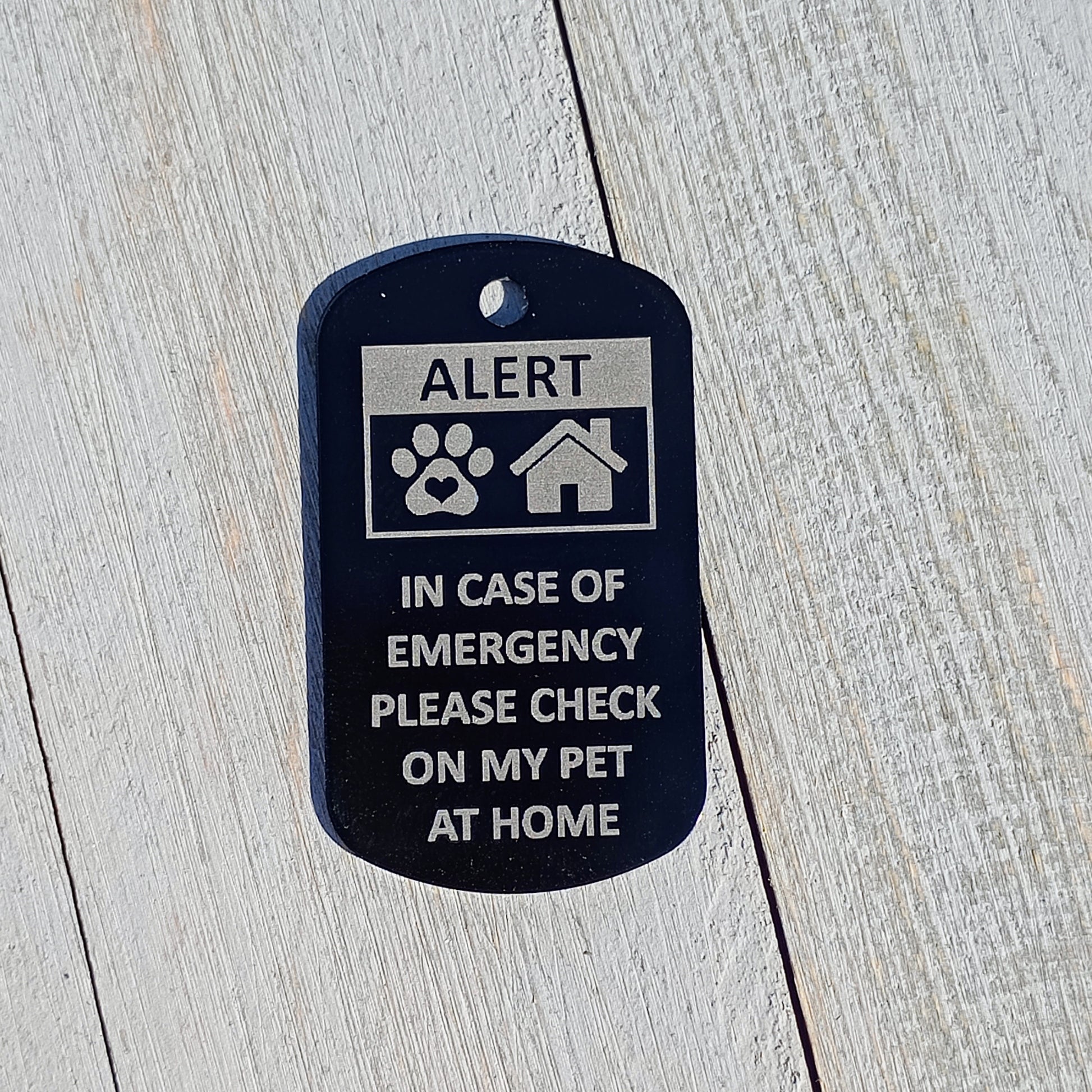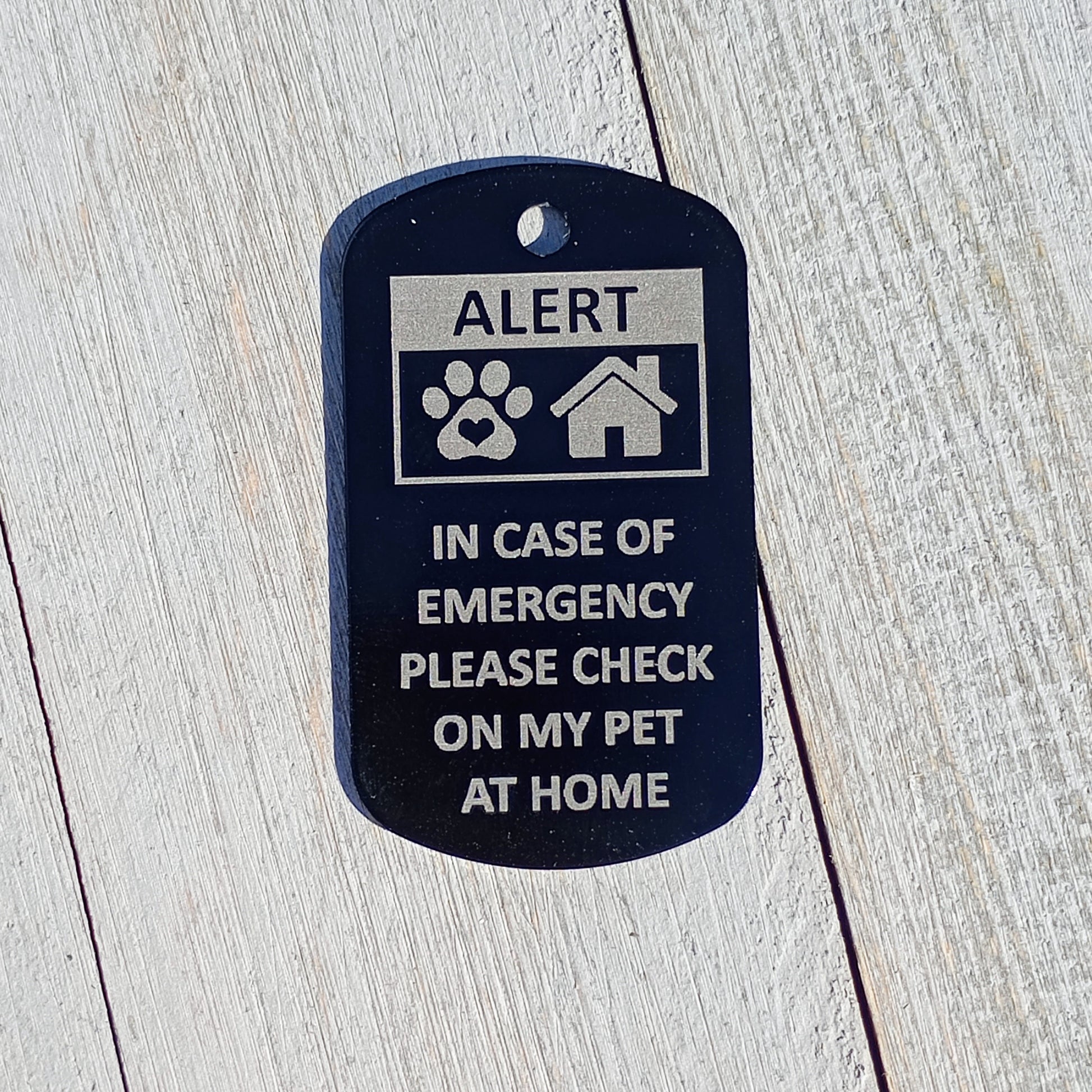 This Black Military Style Tag is anodized aluminum and has a design engraved that says "In case of emergency please check on my pet". This is designed to be used on a keychain and will have a split ring and jump ring included to use attaching it to a keychain.