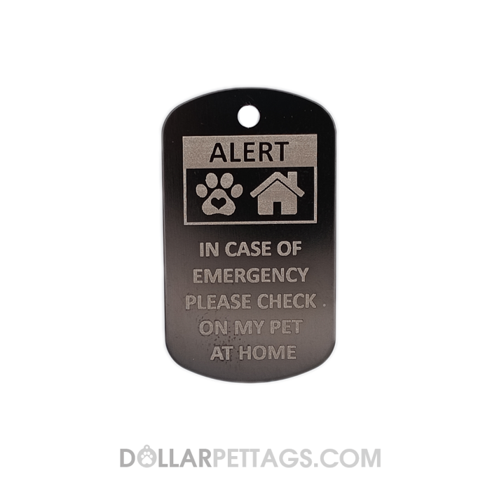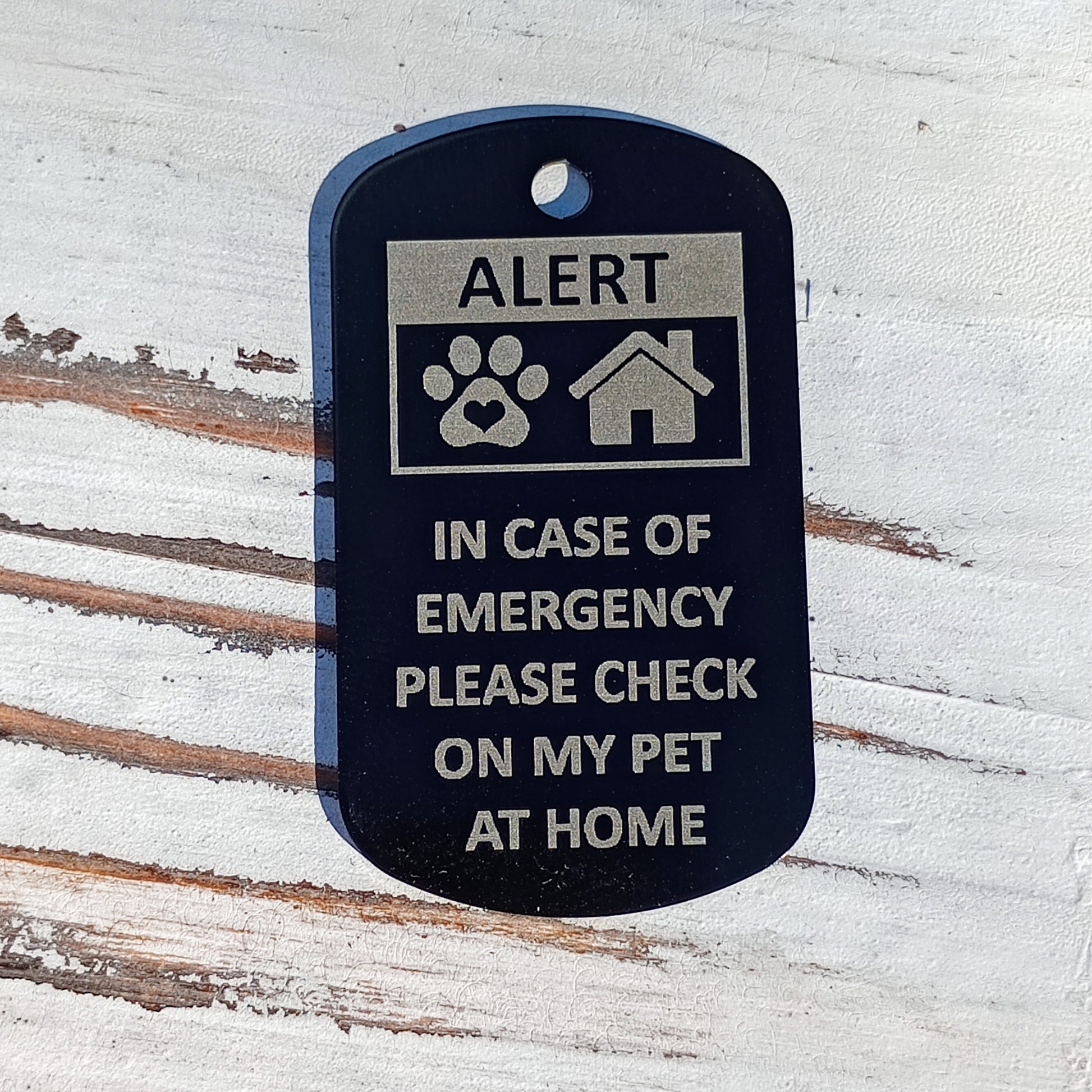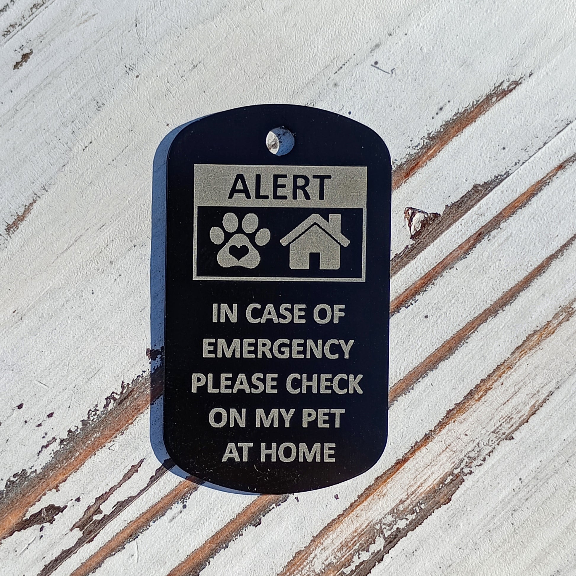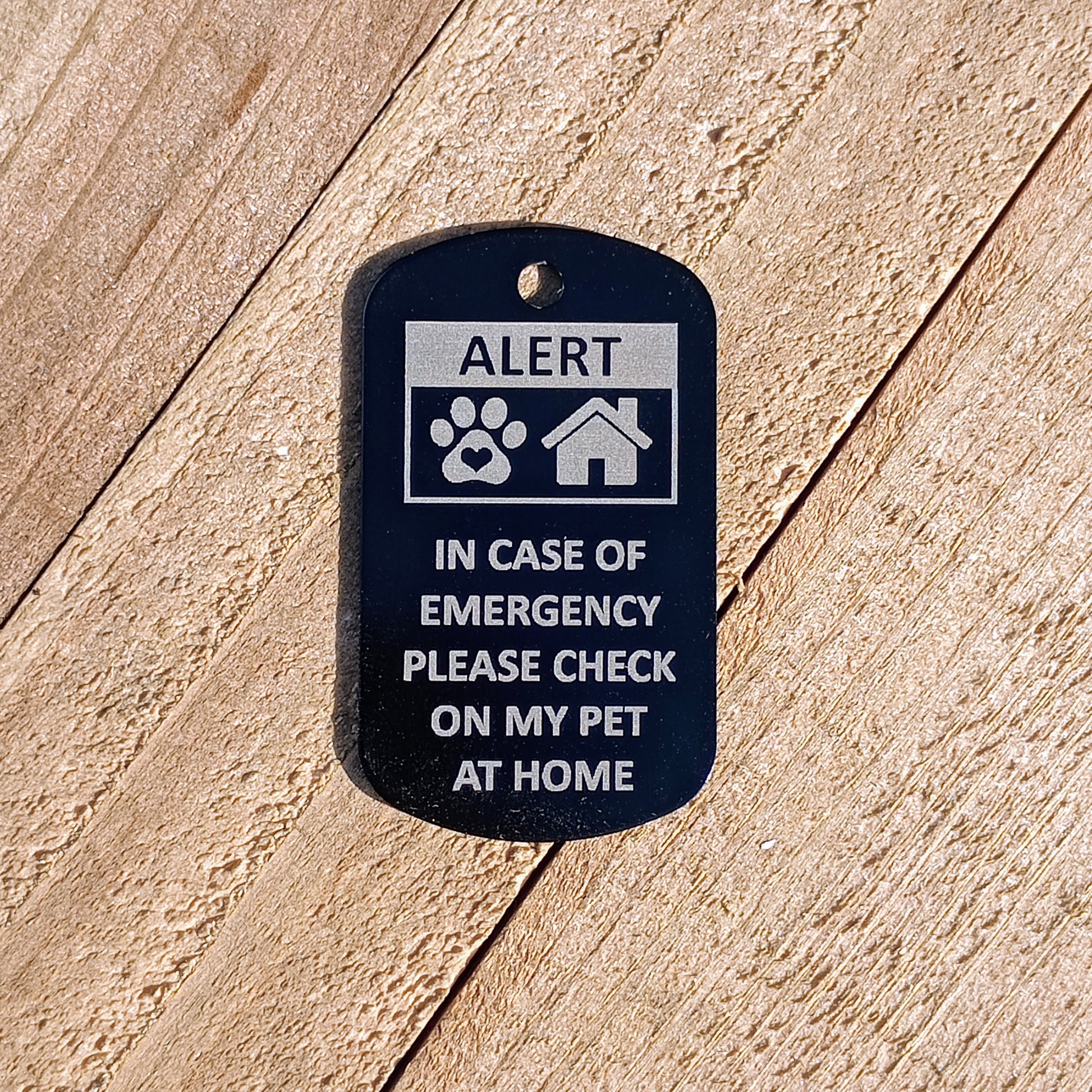 This Black Military Style Tag is anodized aluminum and has a design engraved that says "In case of emergency please check on my pet". This is designed to be used on a keychain and will have a split ring and jump ring included to use attaching it to a keychain.