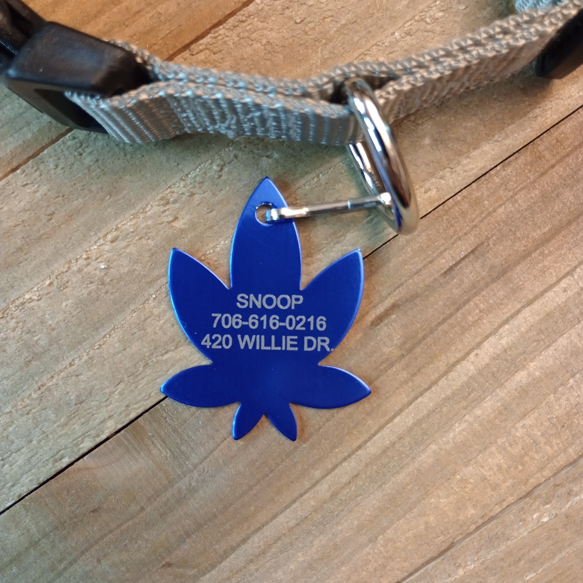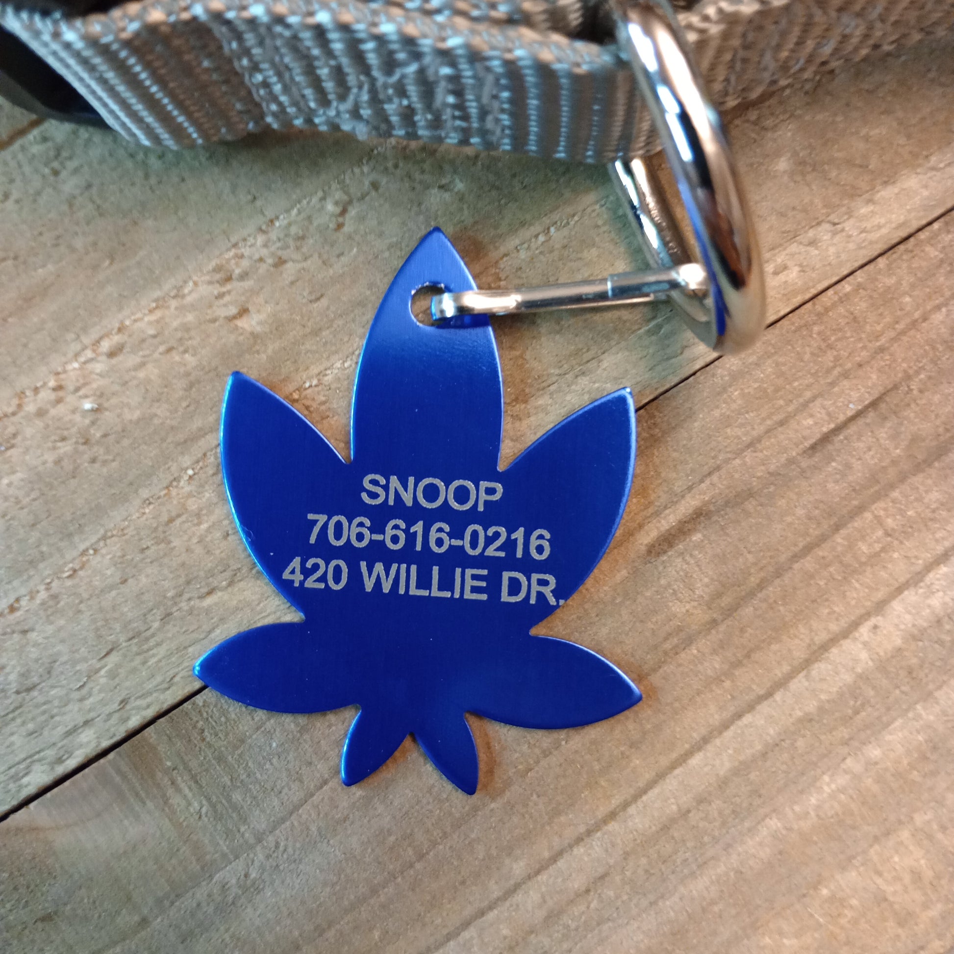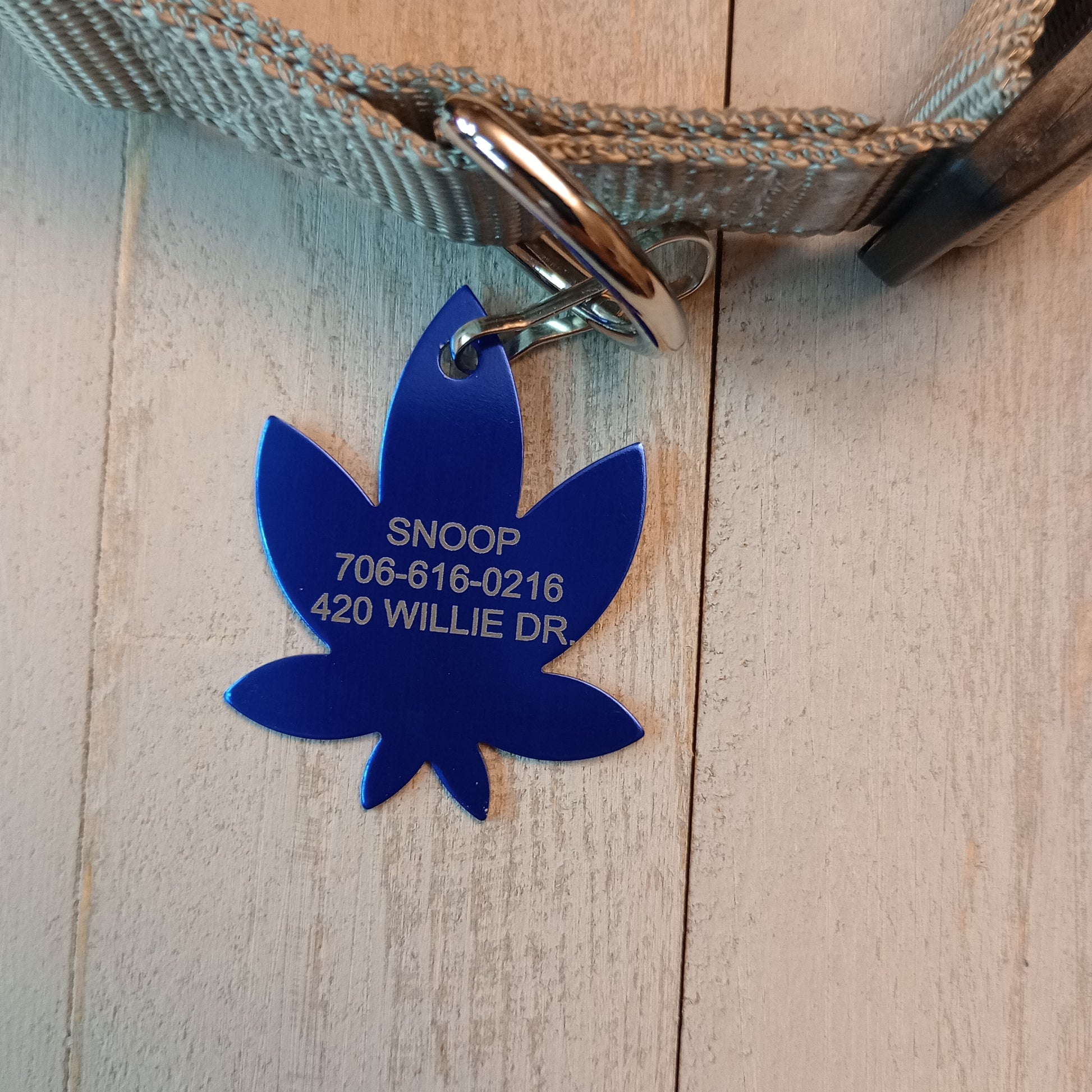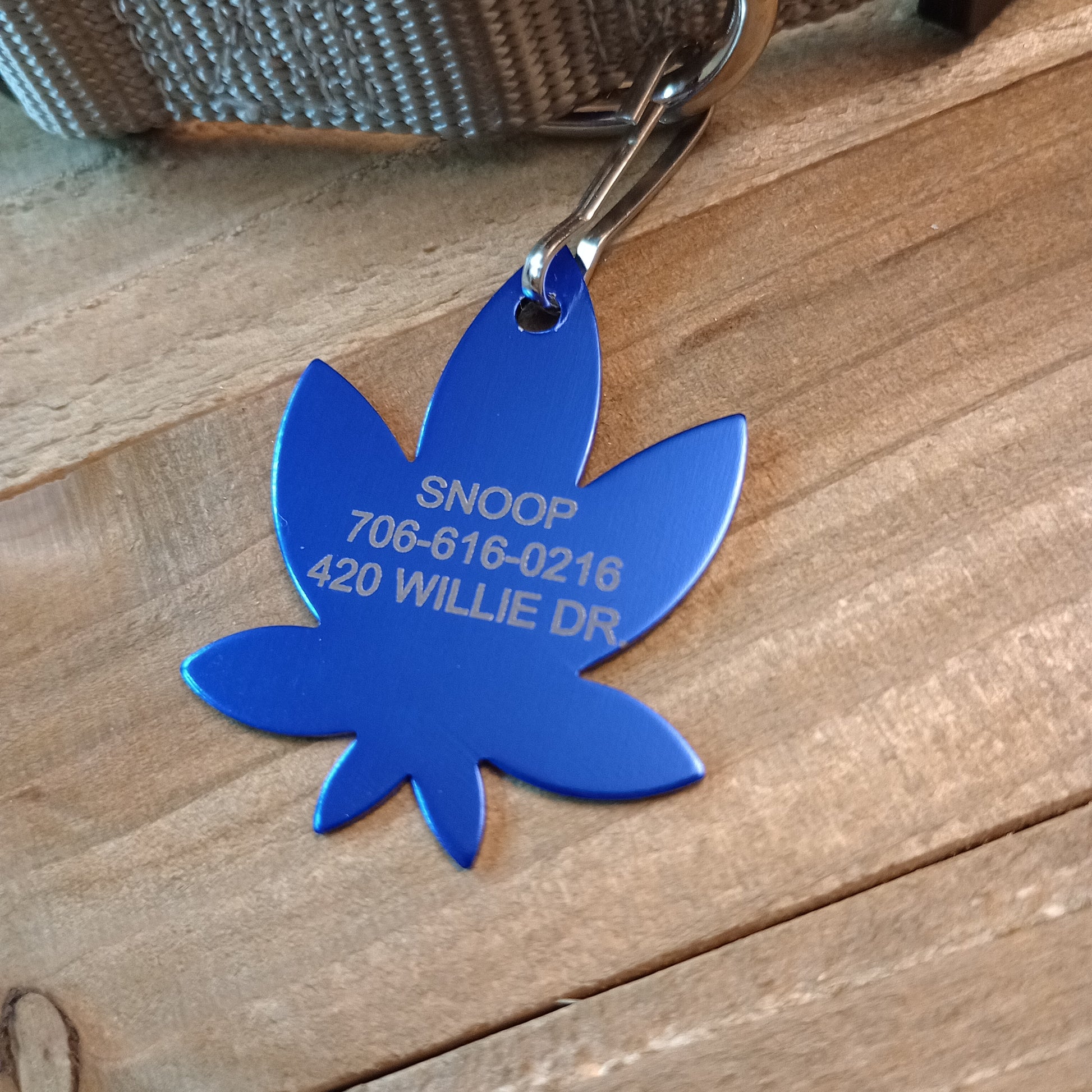 This Dark Blue 420 Friendly Style Pet Tag is anodized aluminum that allows for 3 lines of text to be engraved on the front and 3 lines of text to be engraved on the back. The shape of the pet tag resembles a marijuana leaf.