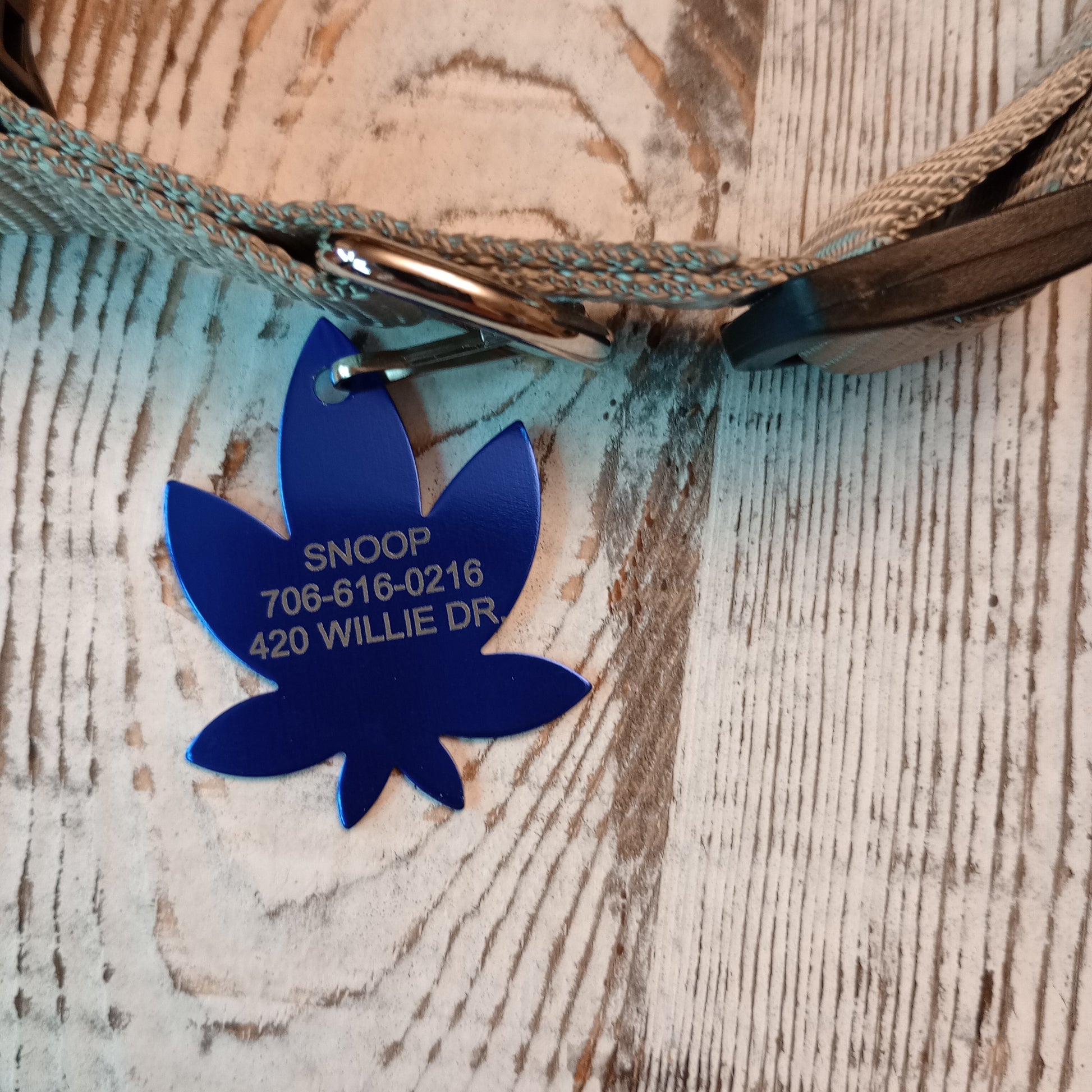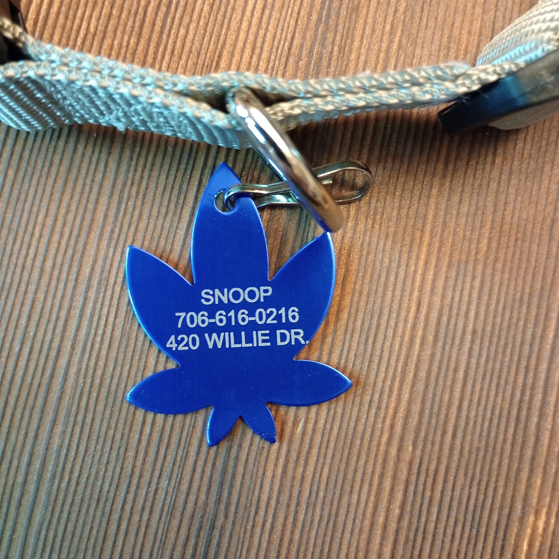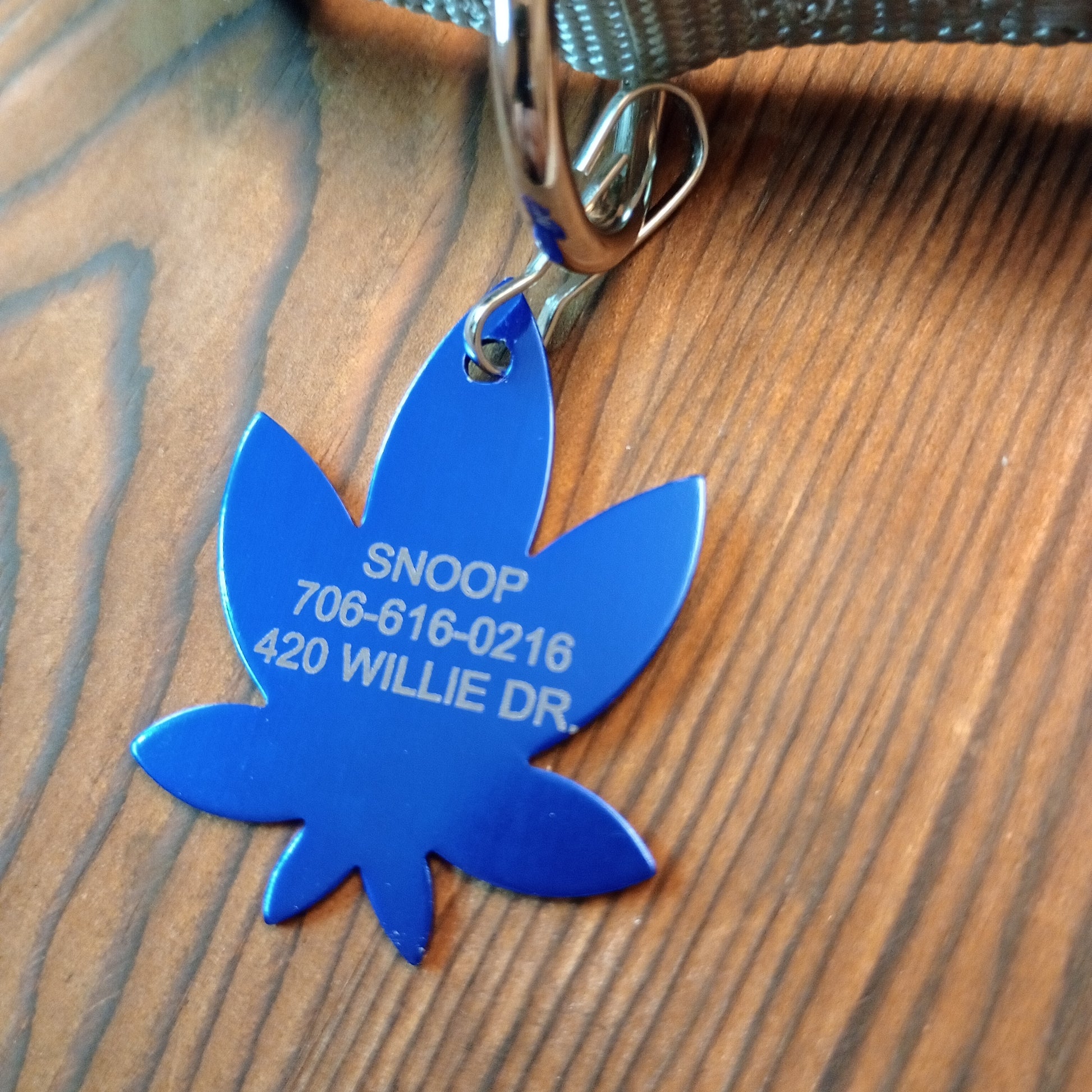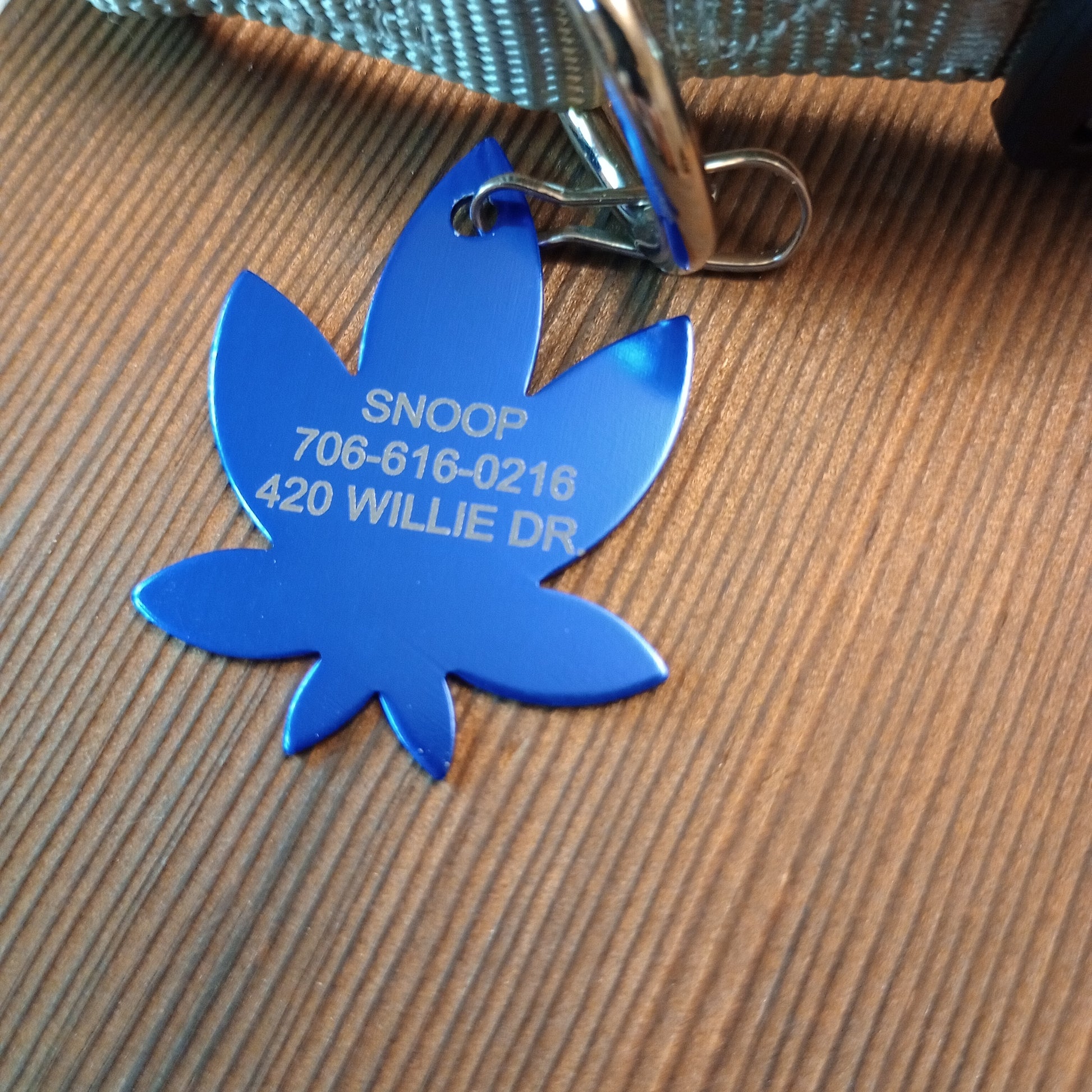 This Dark Blue 420 Friendly Style Pet Tag is anodized aluminum that allows for 3 lines of text to be engraved on the front and 3 lines of text to be engraved on the back. The shape of the pet tag resembles a marijuana leaf.