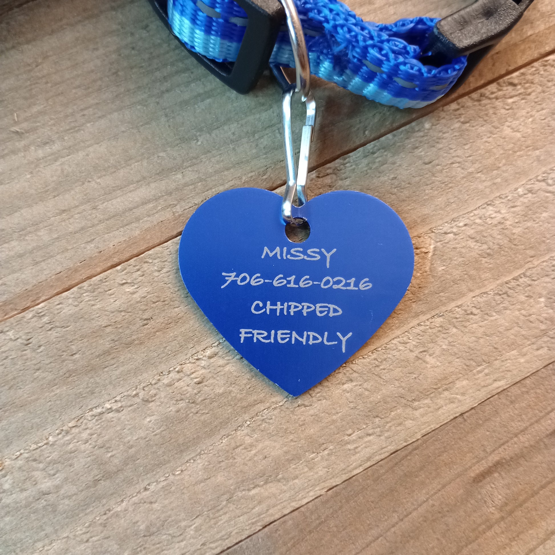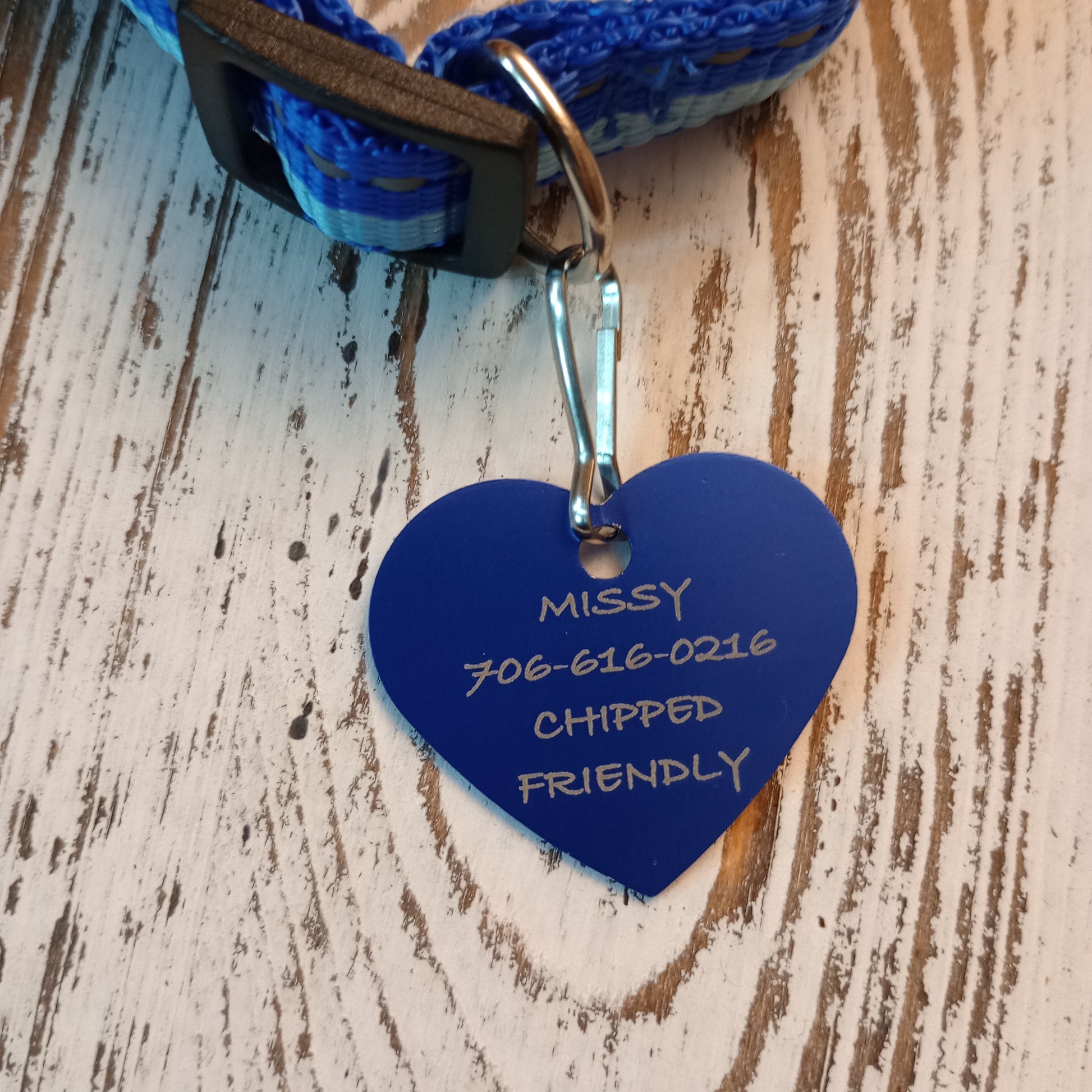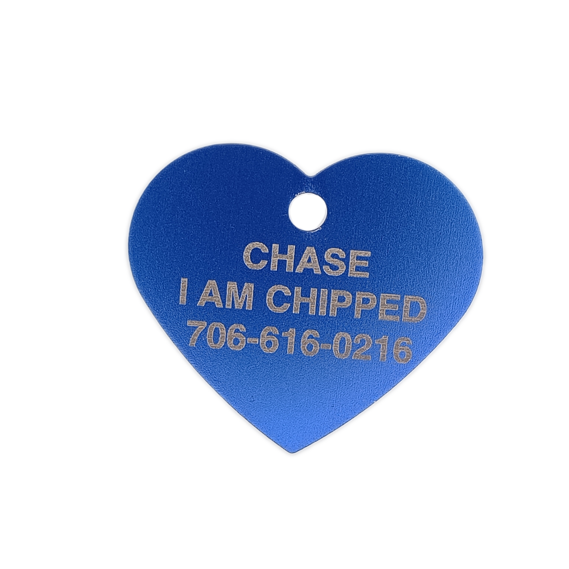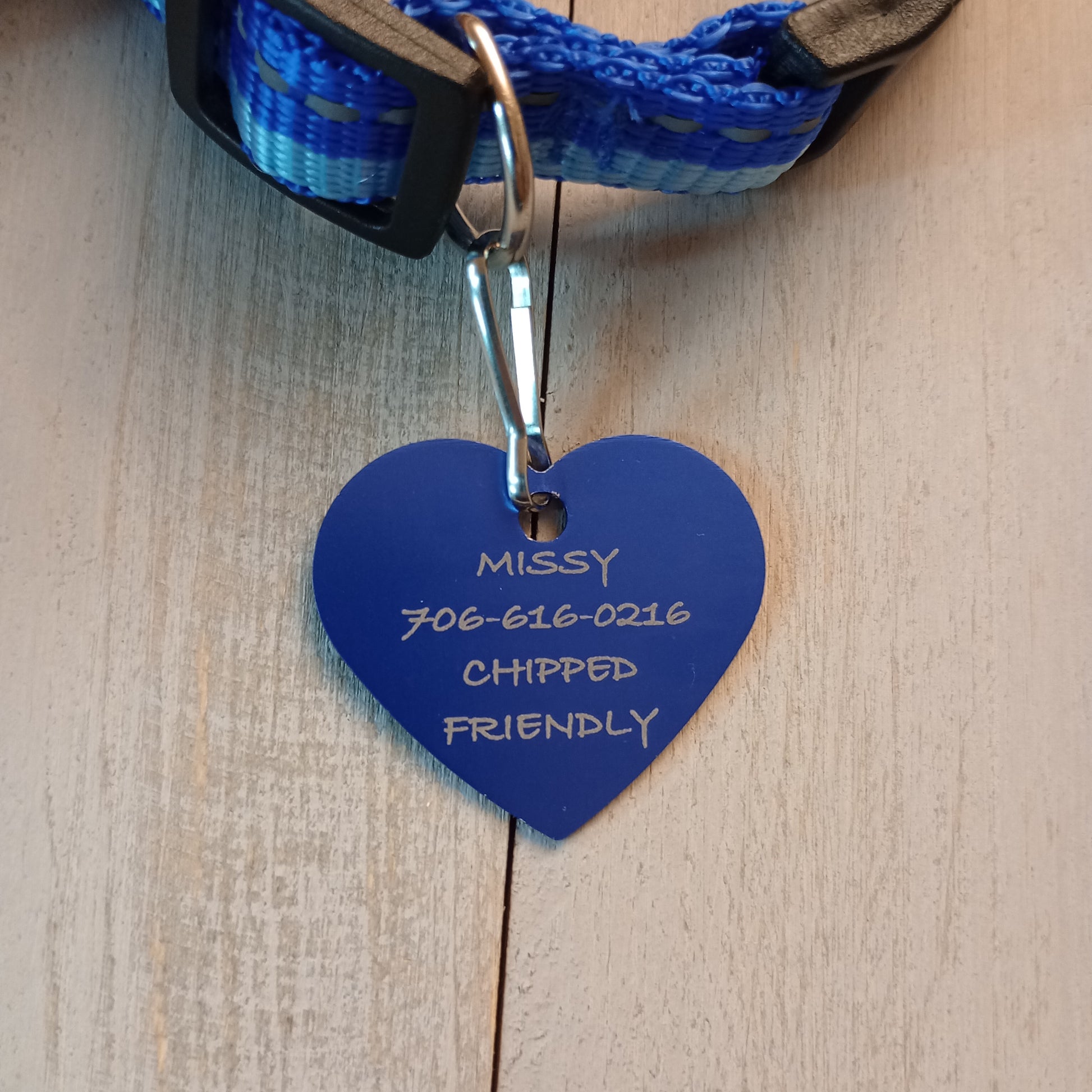 This Dark Blue Heart Shaped Pet Tag is anodized aluminum that allows for 4 lines of text to be engraved on the front and lines of text to be engraved on the back.