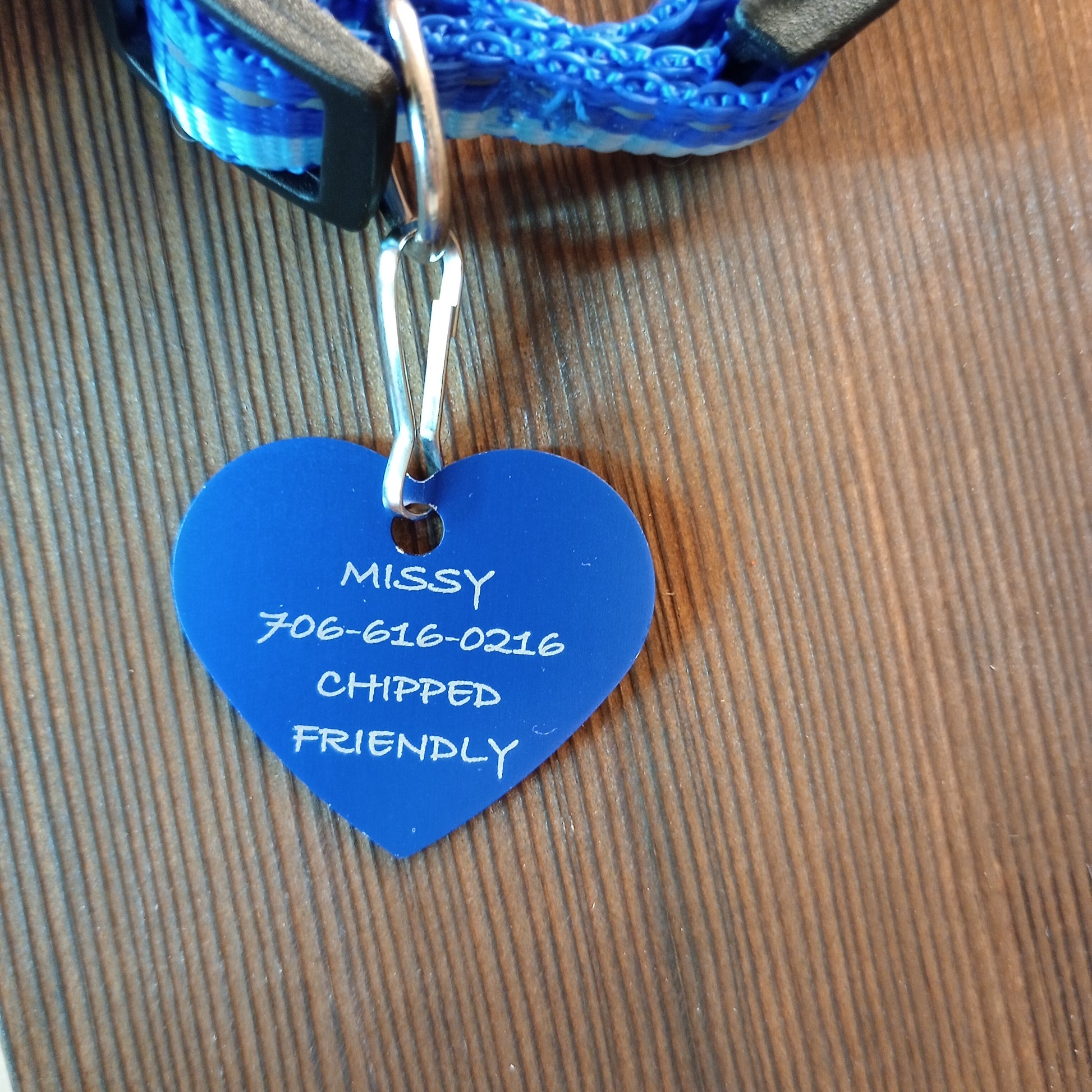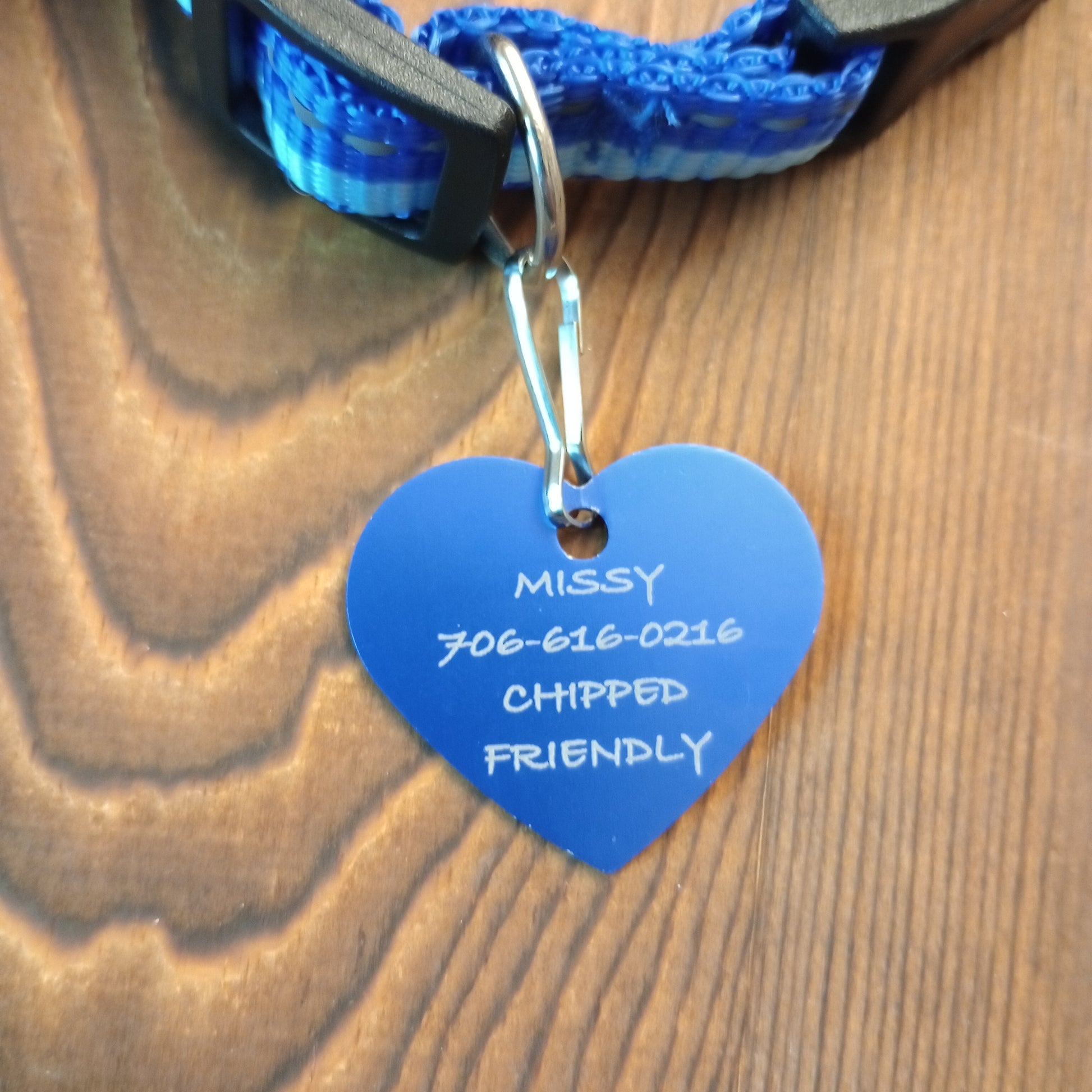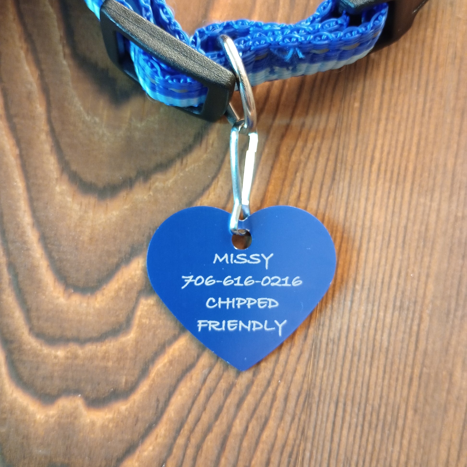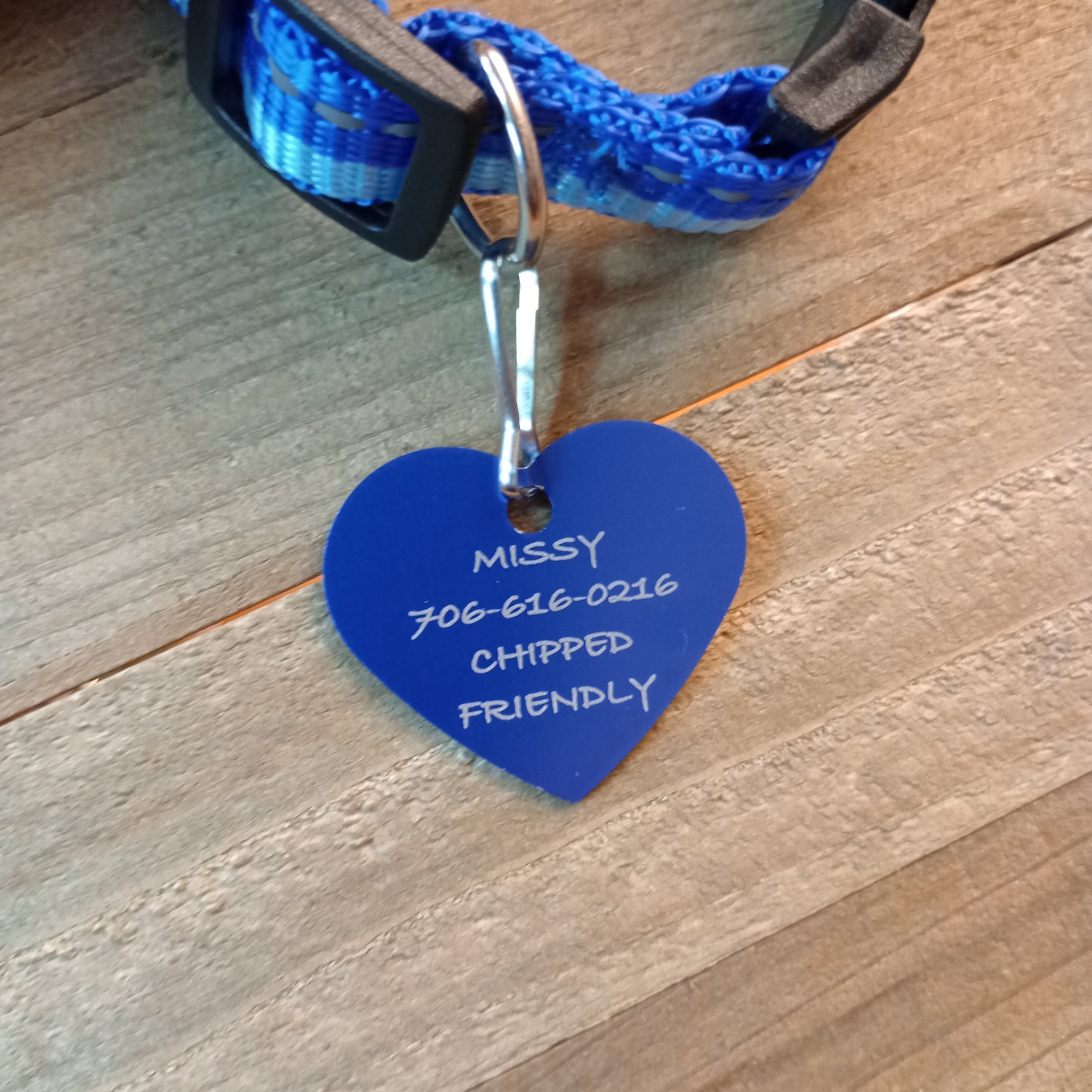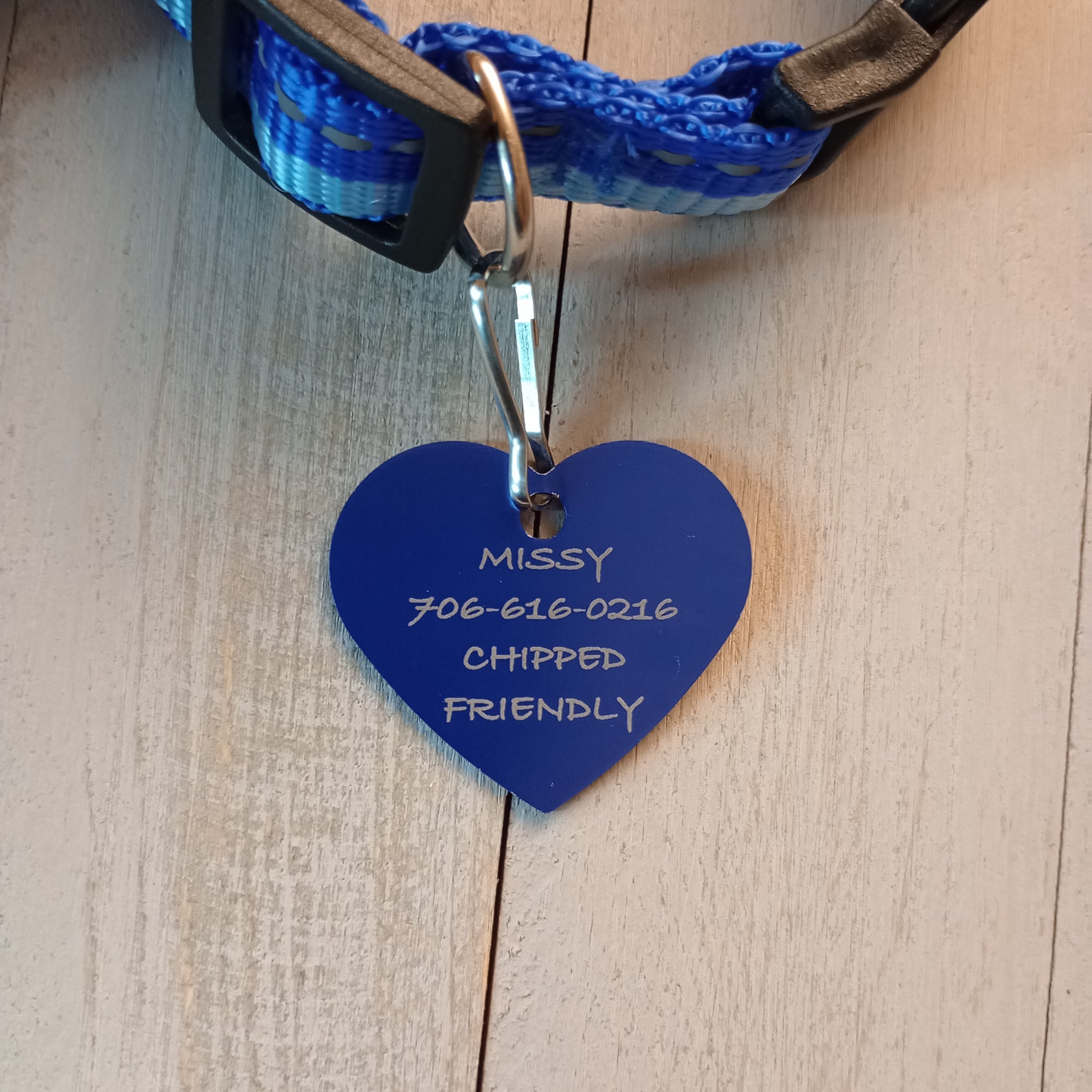 This Dark Blue Heart Shaped Pet Tag is anodized aluminum that allows for 4 lines of text to be engraved on the front and lines of text to be engraved on the back.