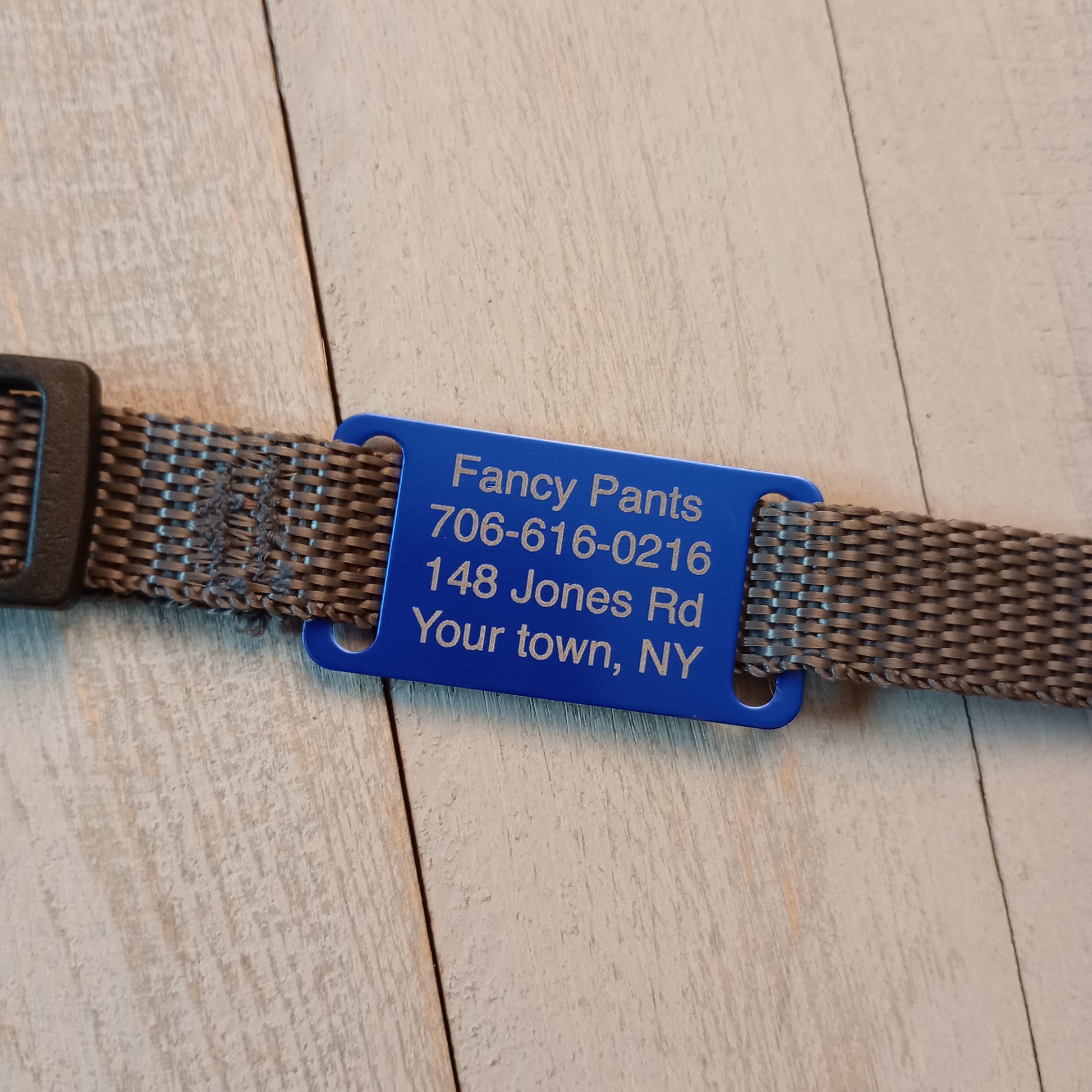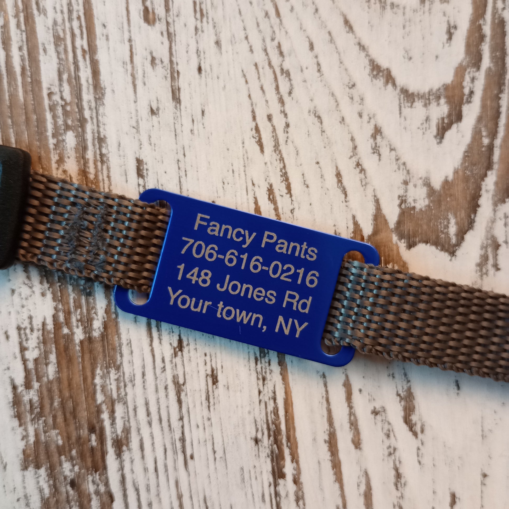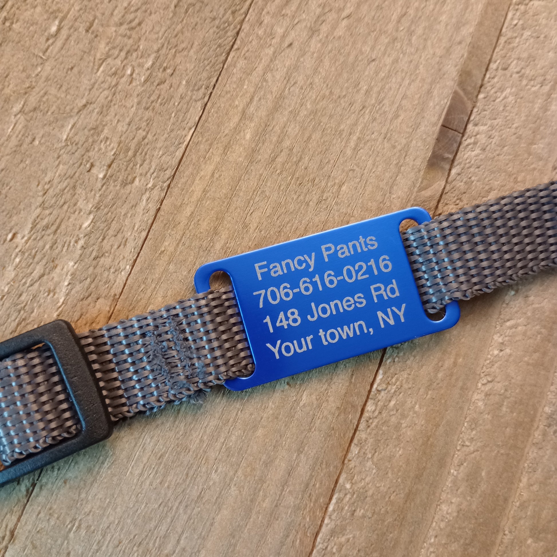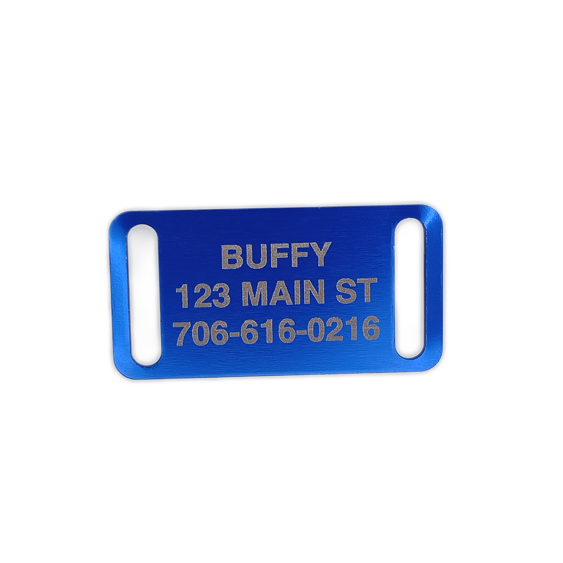 This Dark Blue Slide-On Pet Tag is anodized aluminum that allows for 4 lines of text on the front. This tag will slide on a collar that is 3/4 inch wide or less.