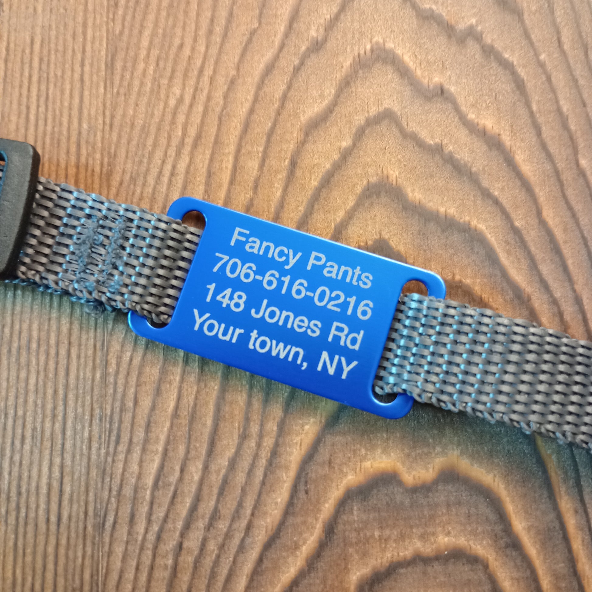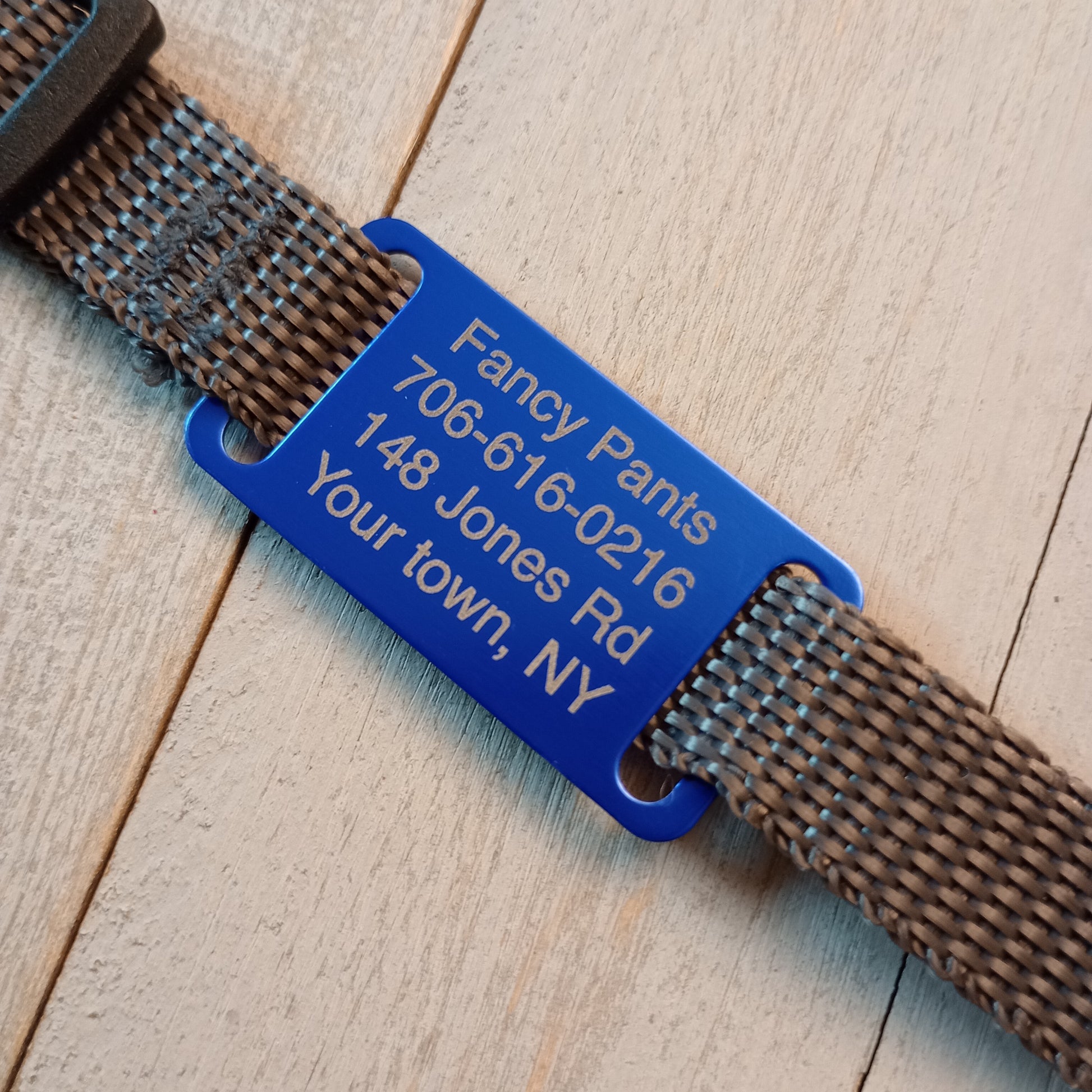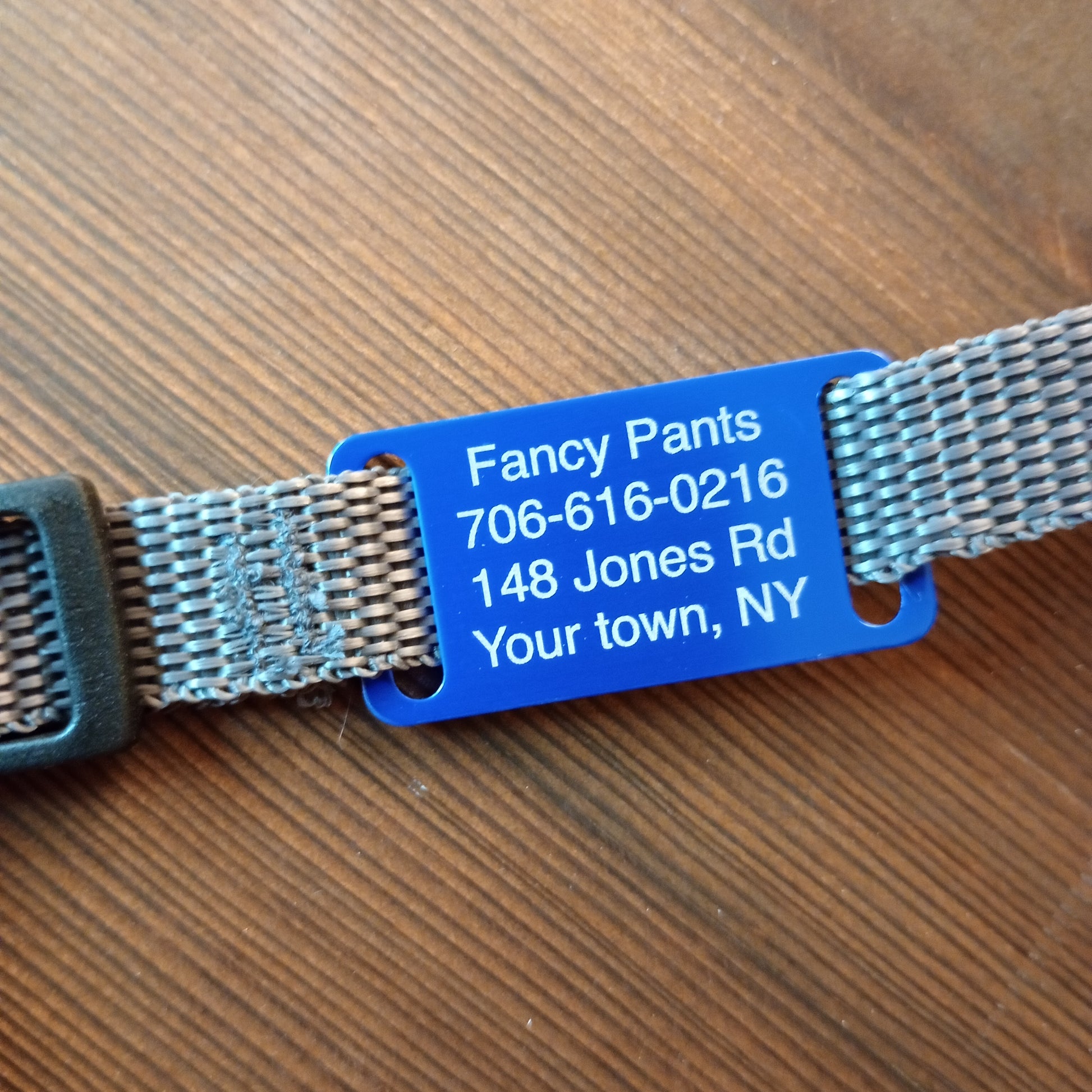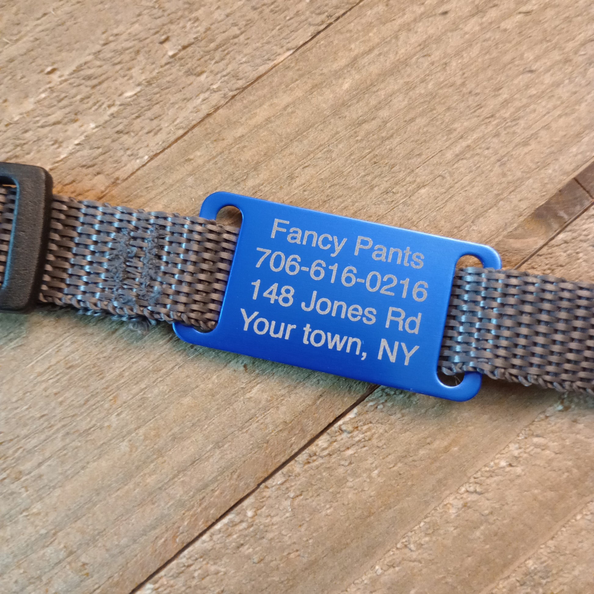 This Dark Blue Slide-On Pet Tag is anodized aluminum that allows for 4 lines of text on the front. This tag will slide on a collar that is 3/4 inch wide or less.