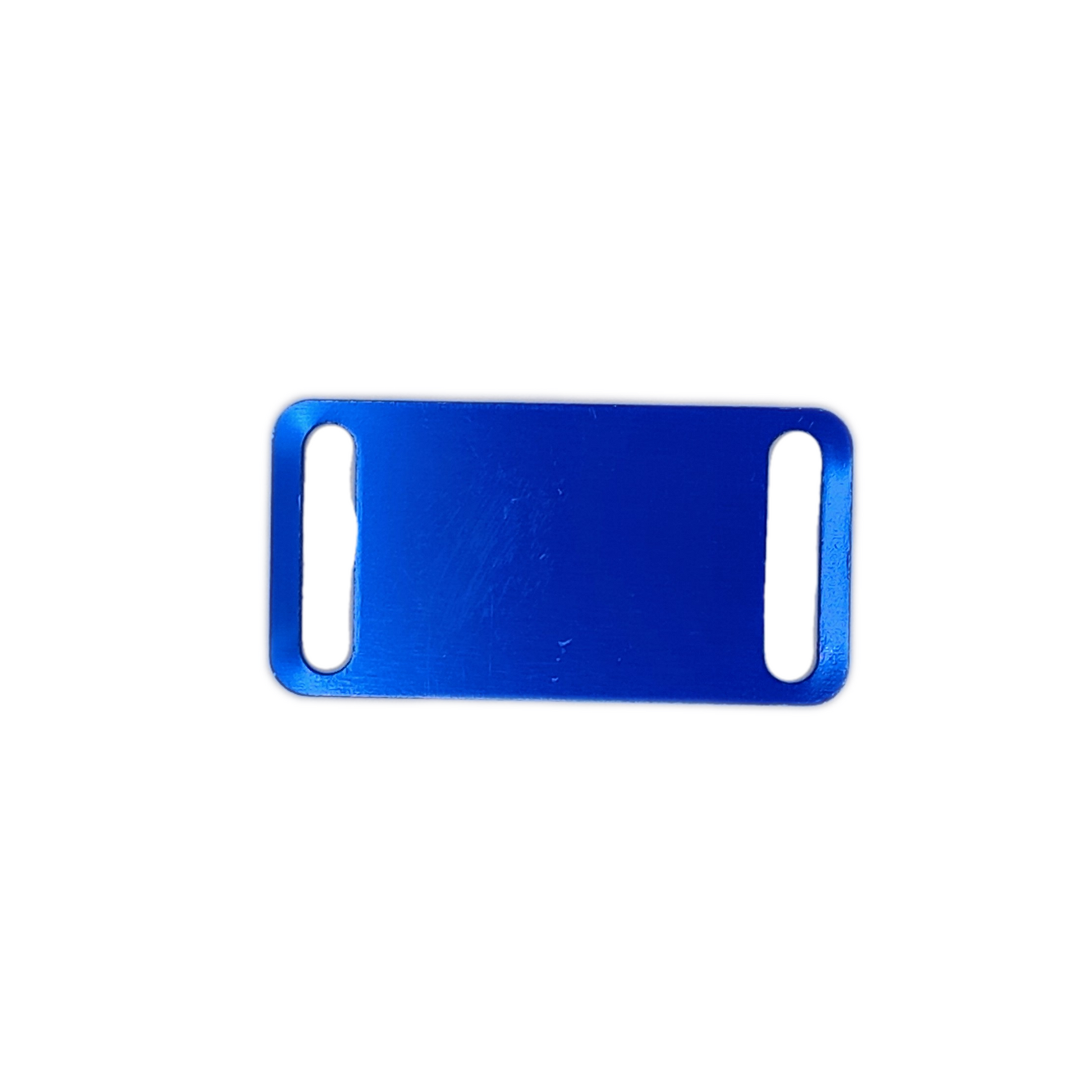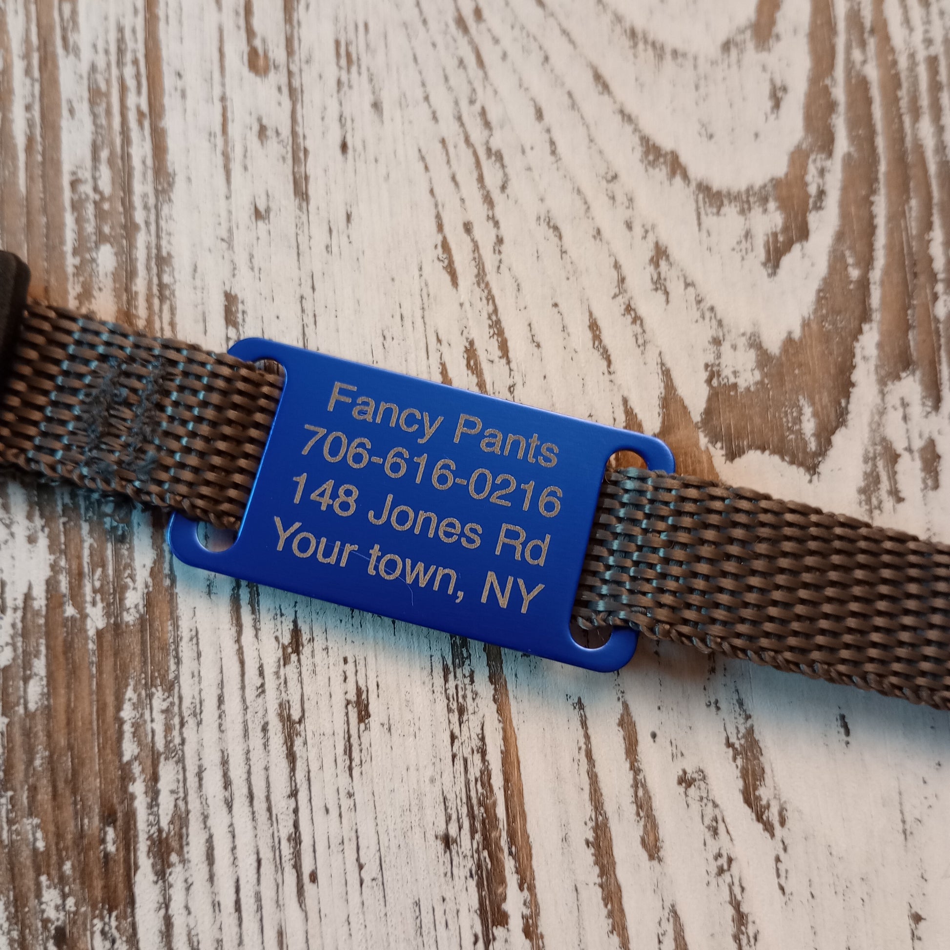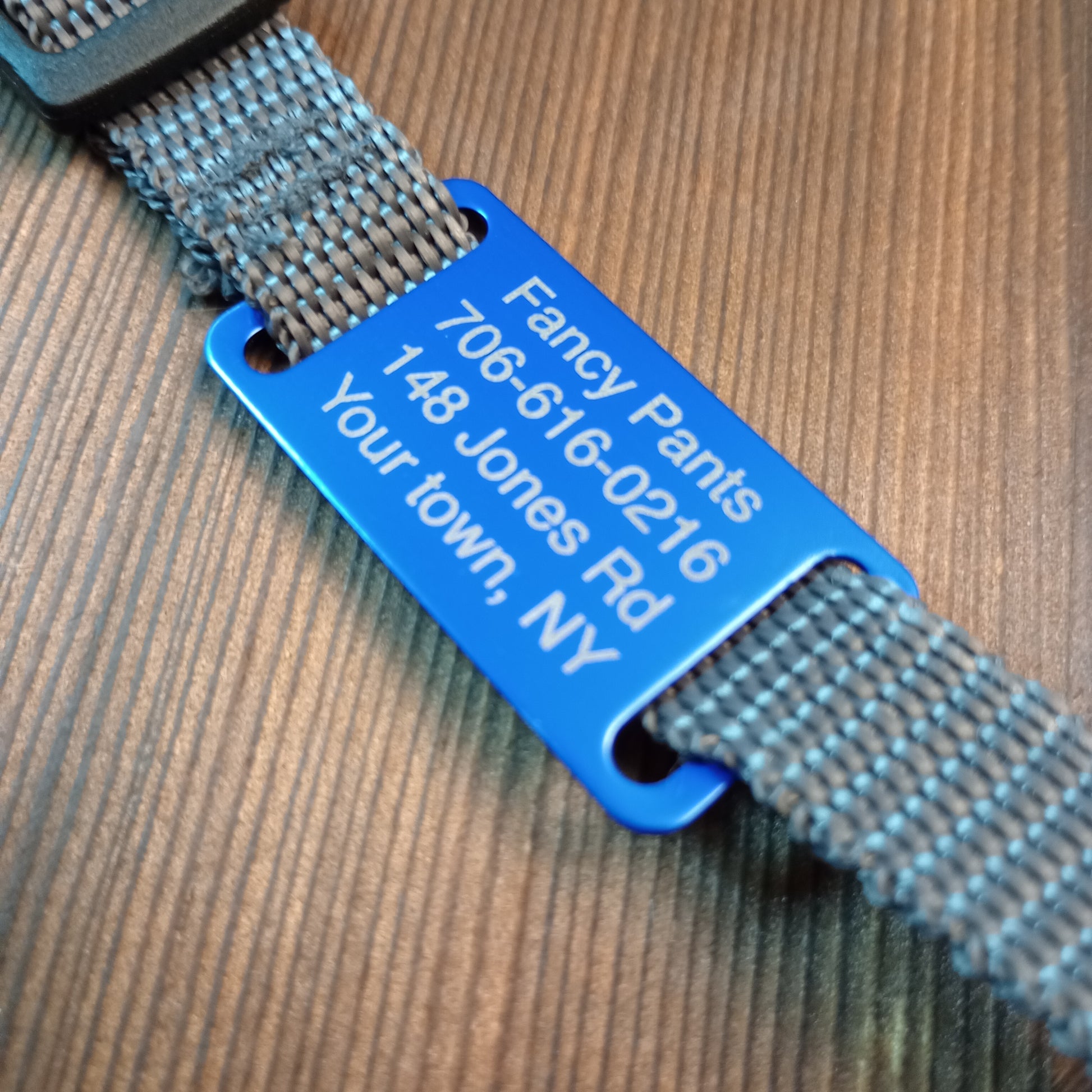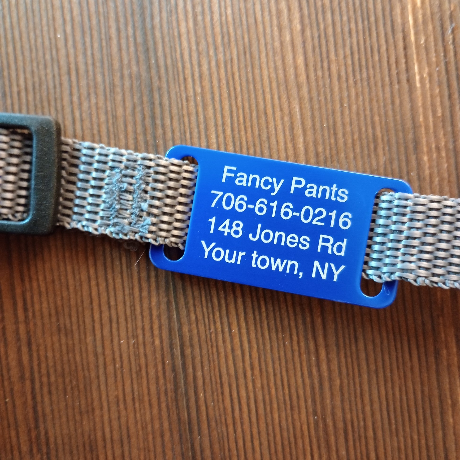 This Dark Blue Slide-On Pet Tag is anodized aluminum that allows for 4 lines of text on the front. This tag will slide on a collar that is 3/4 inch wide or less.