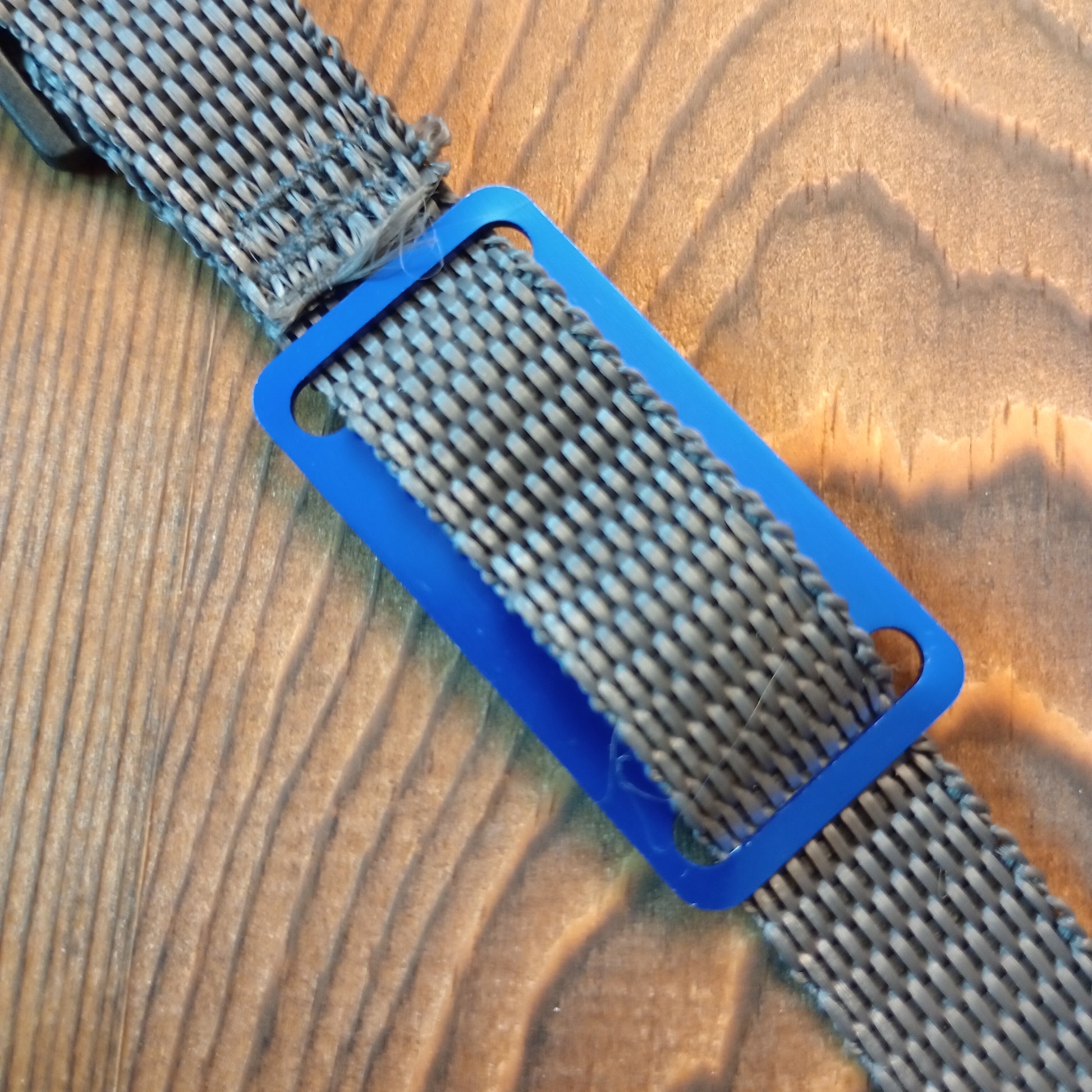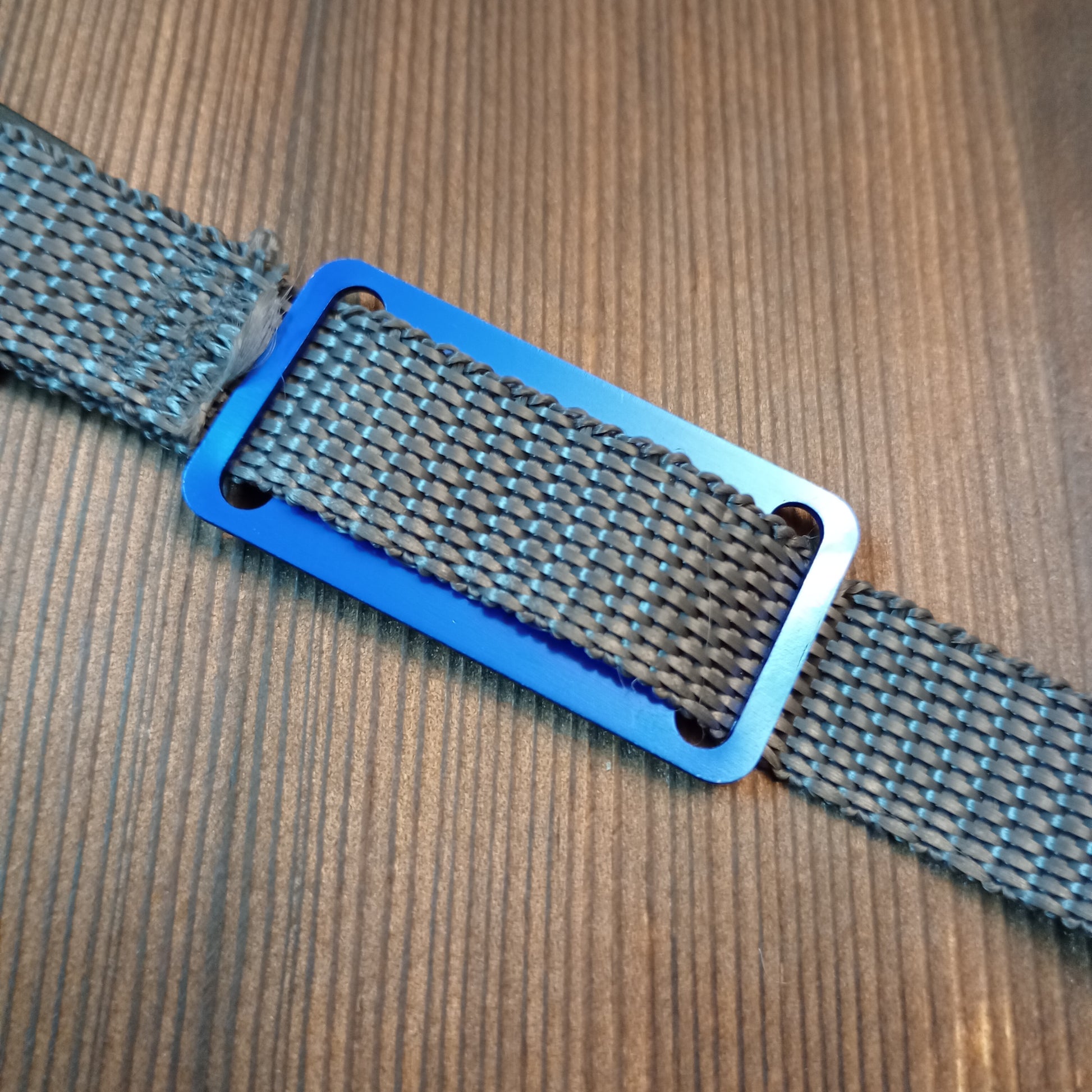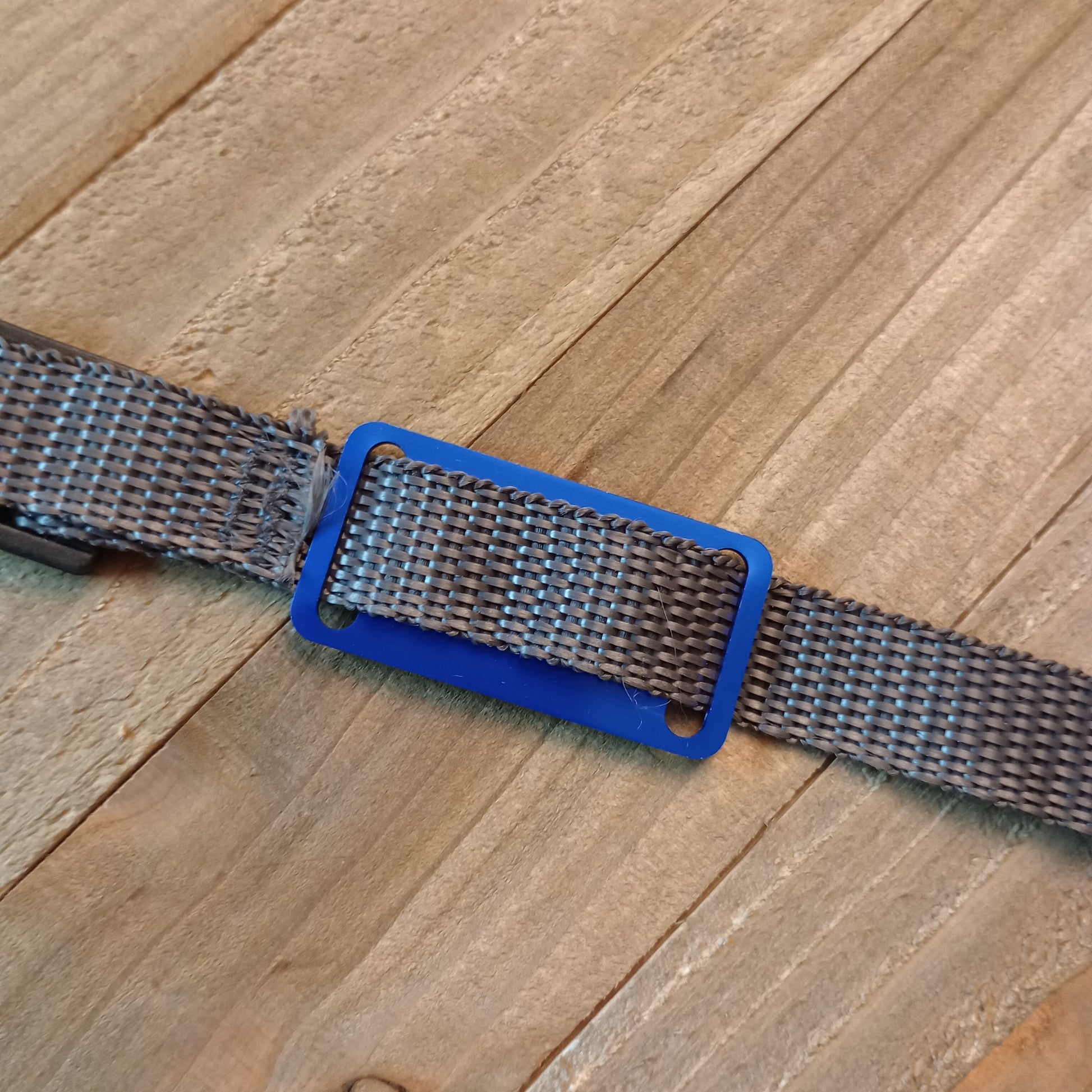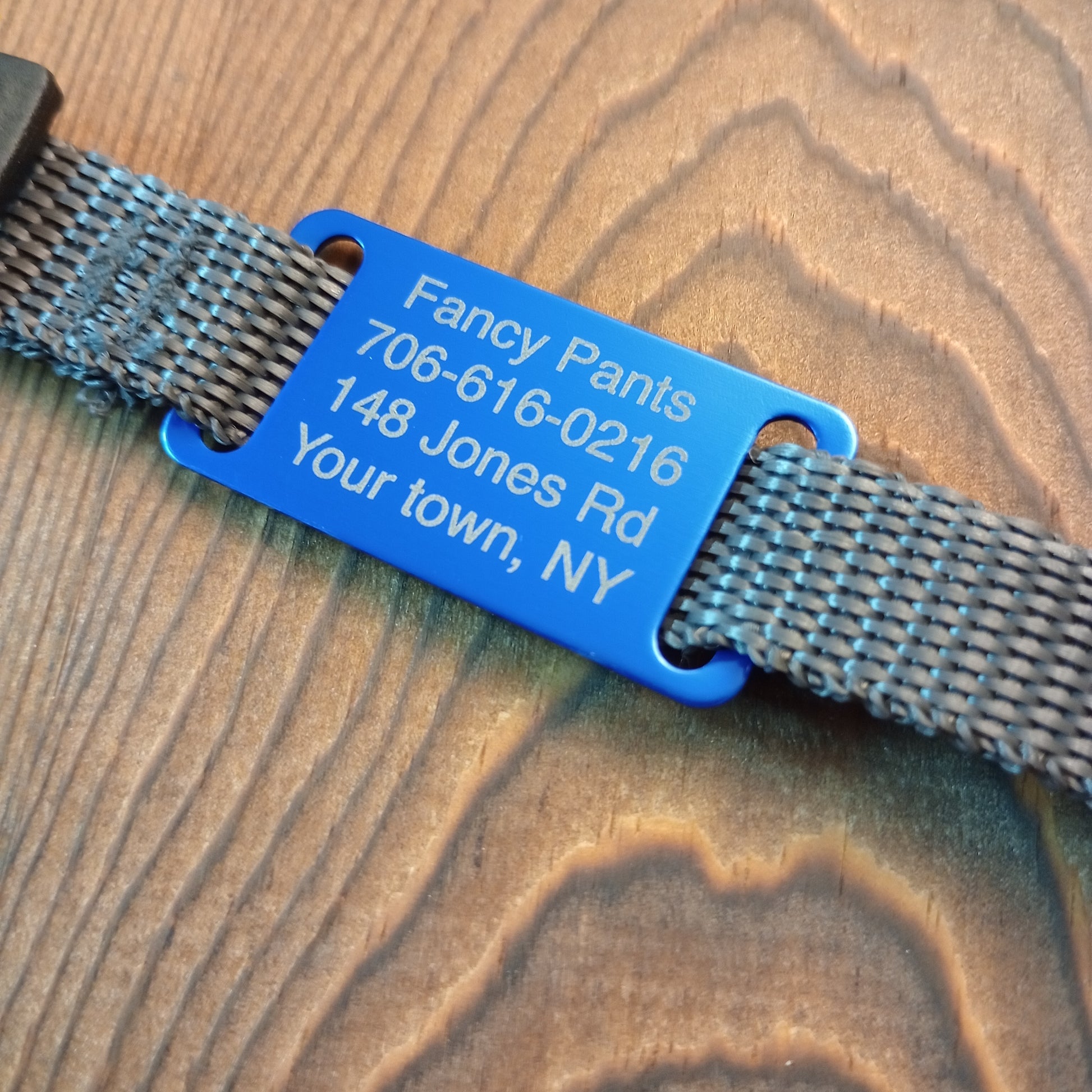 This Dark Blue Slide-On Pet Tag is anodized aluminum that allows for 4 lines of text on the front. This tag will slide on a collar that is 3/4 inch wide or less.