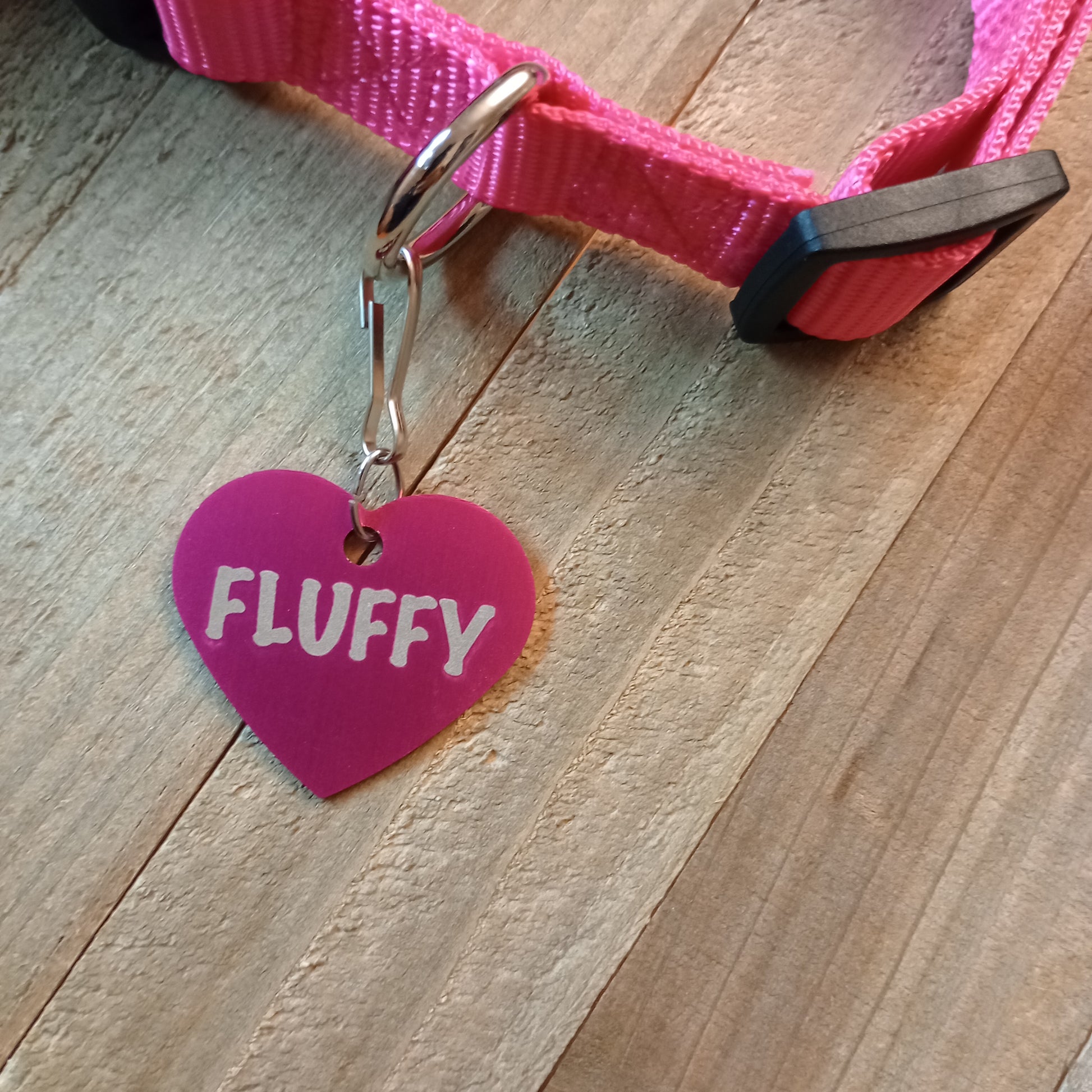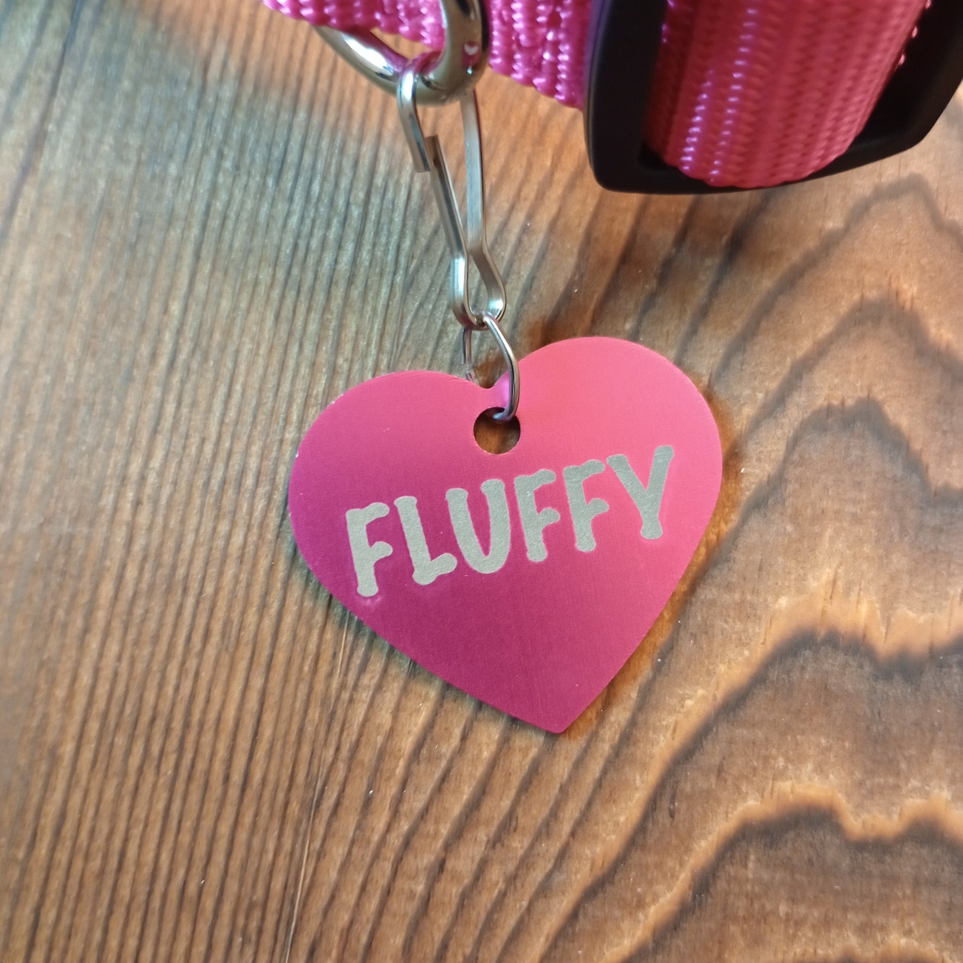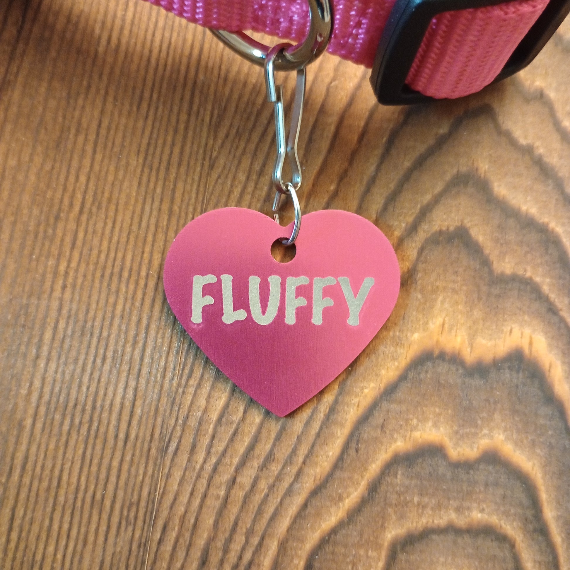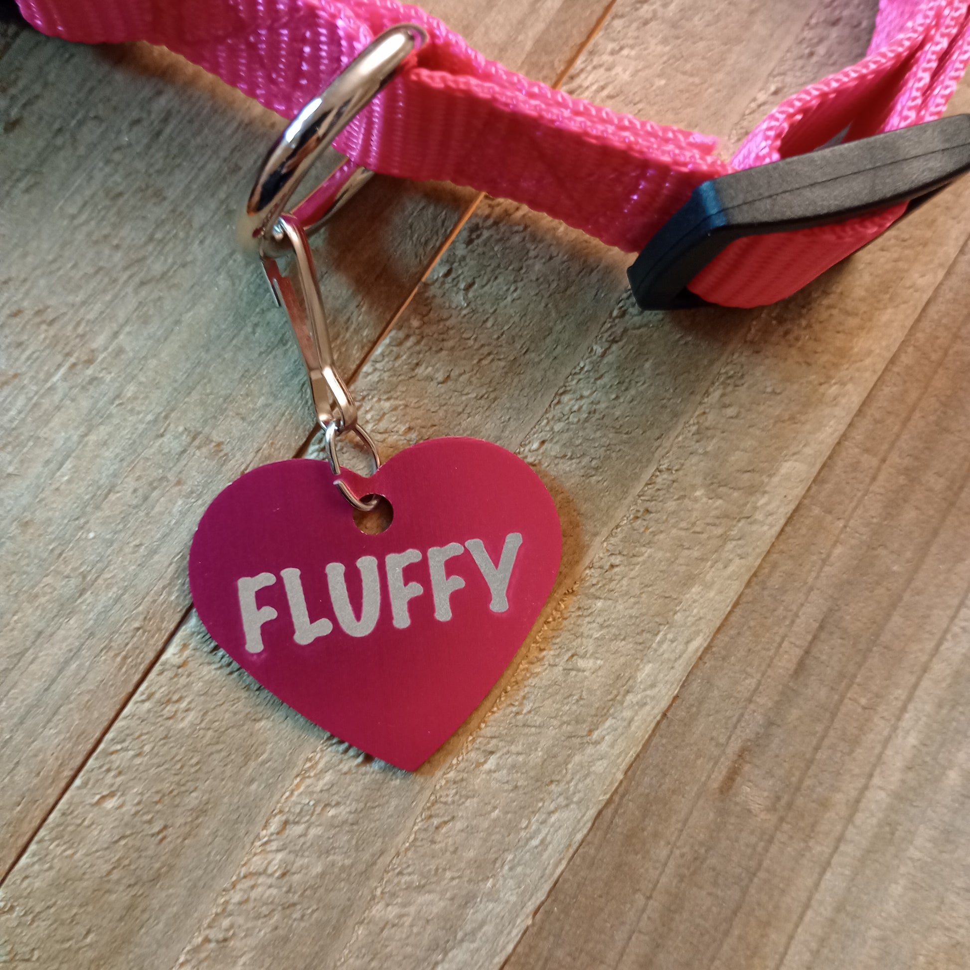 This Dark Pink Heart Shaped Pet Tag is anodized aluminum that allows for 4 lines of text to be engraved on the front and lines of text to be engraved on the back.