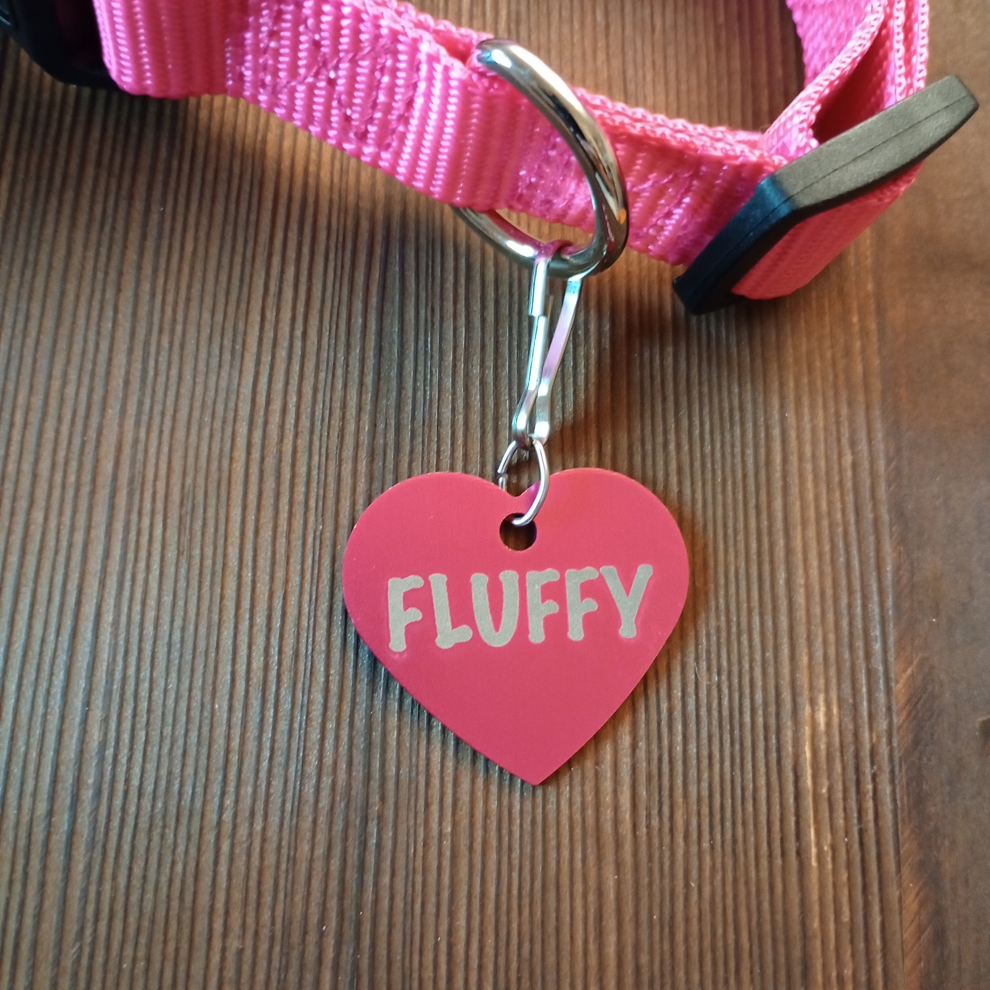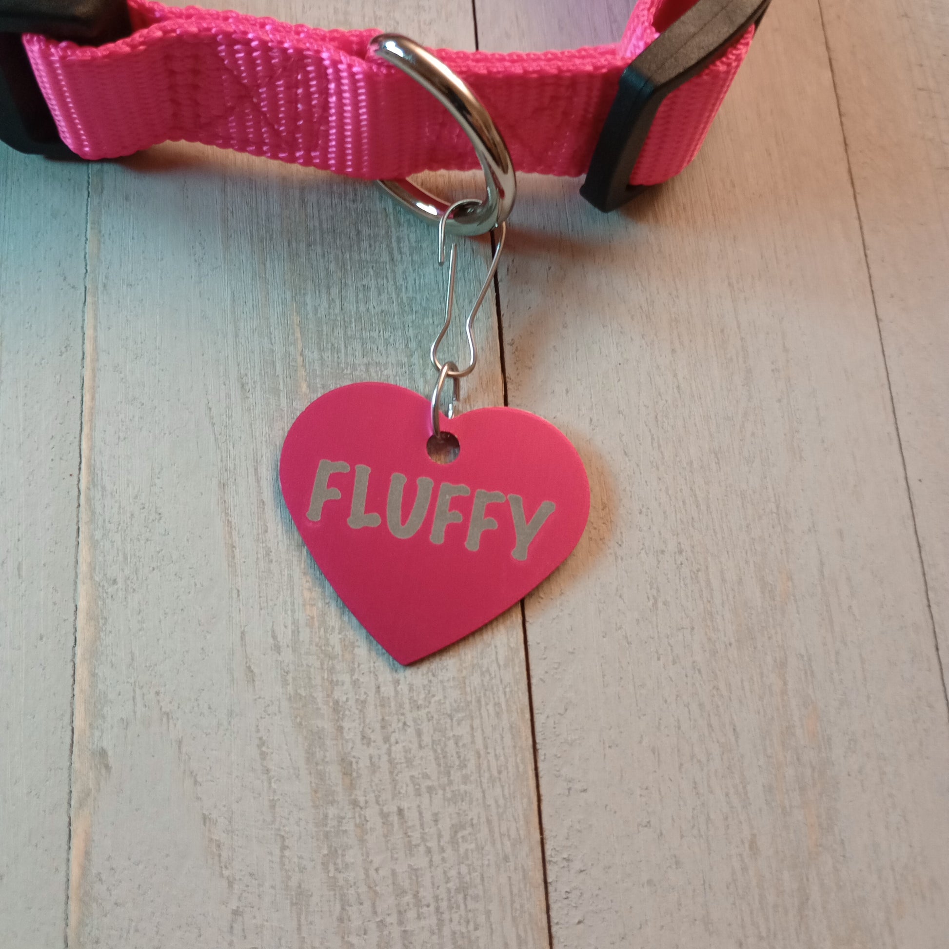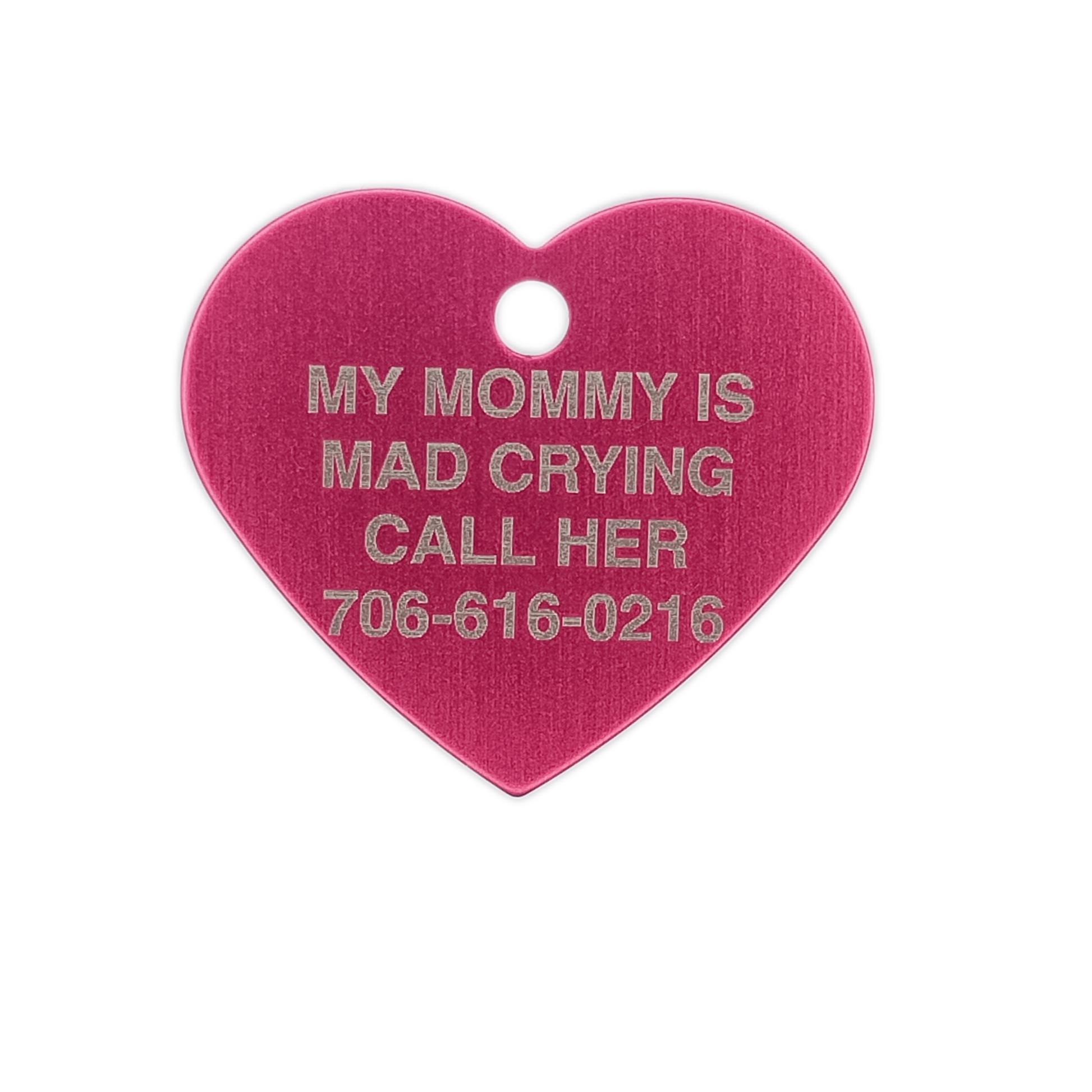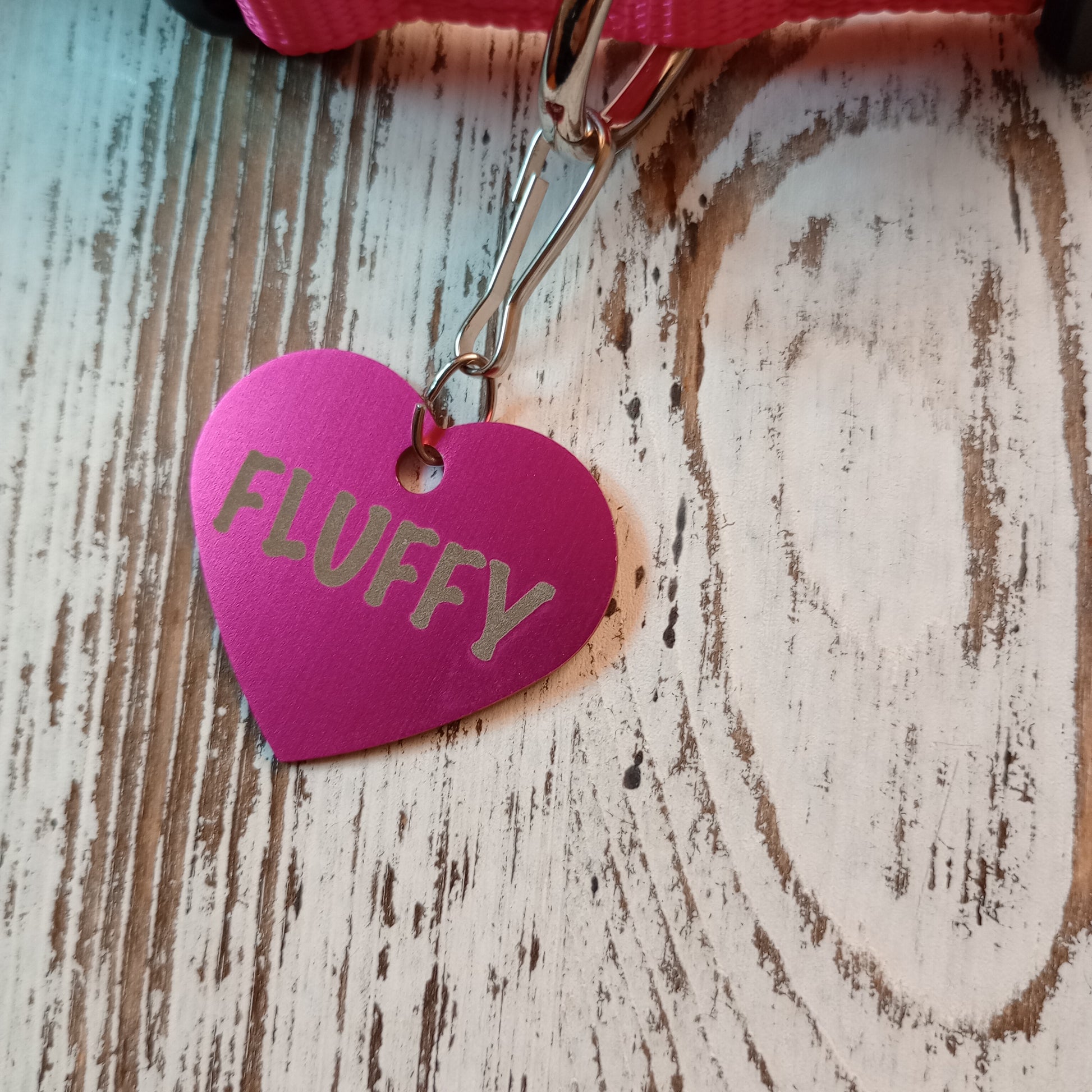 This Dark Pink Heart Shaped Pet Tag is anodized aluminum that allows for 4 lines of text to be engraved on the front and lines of text to be engraved on the back.
