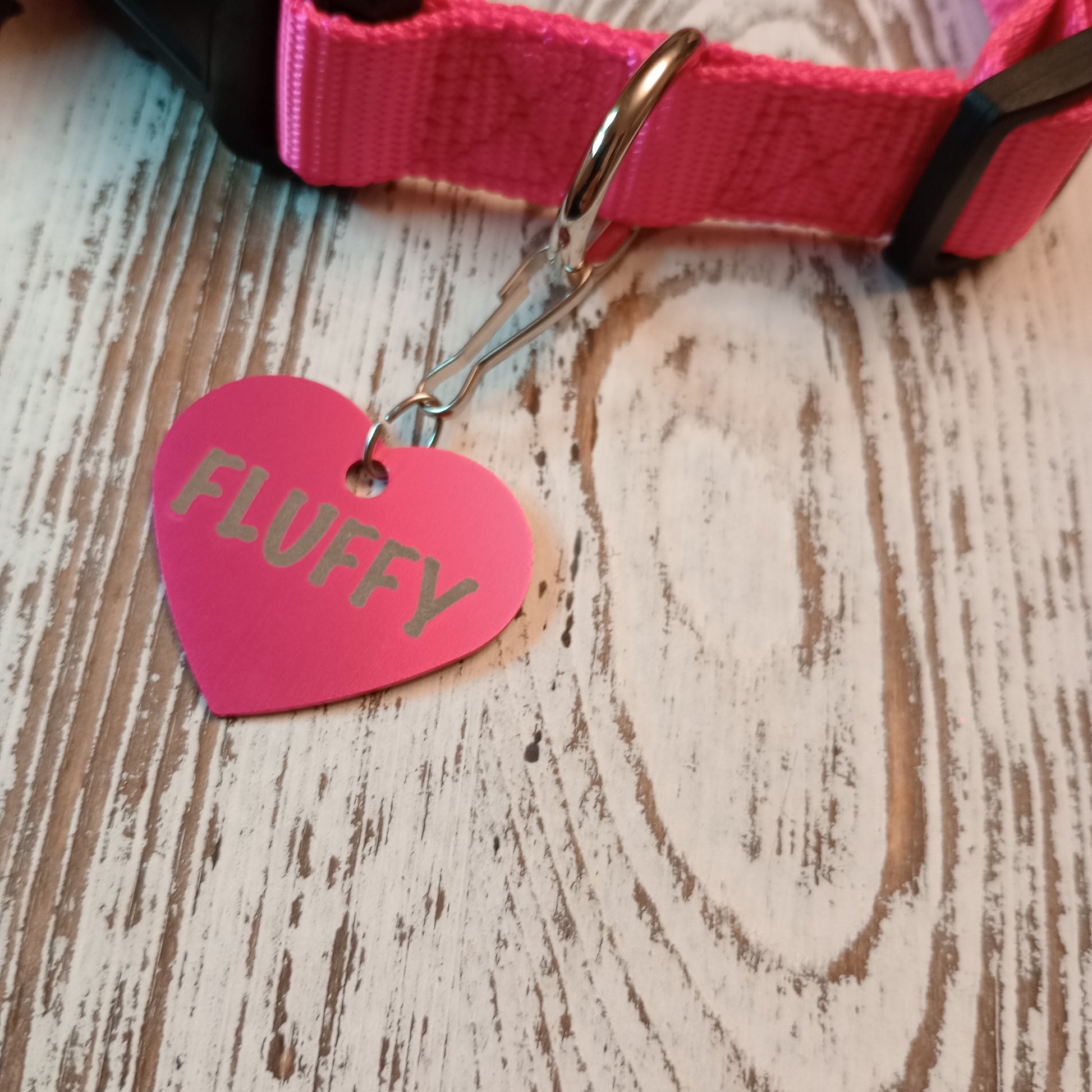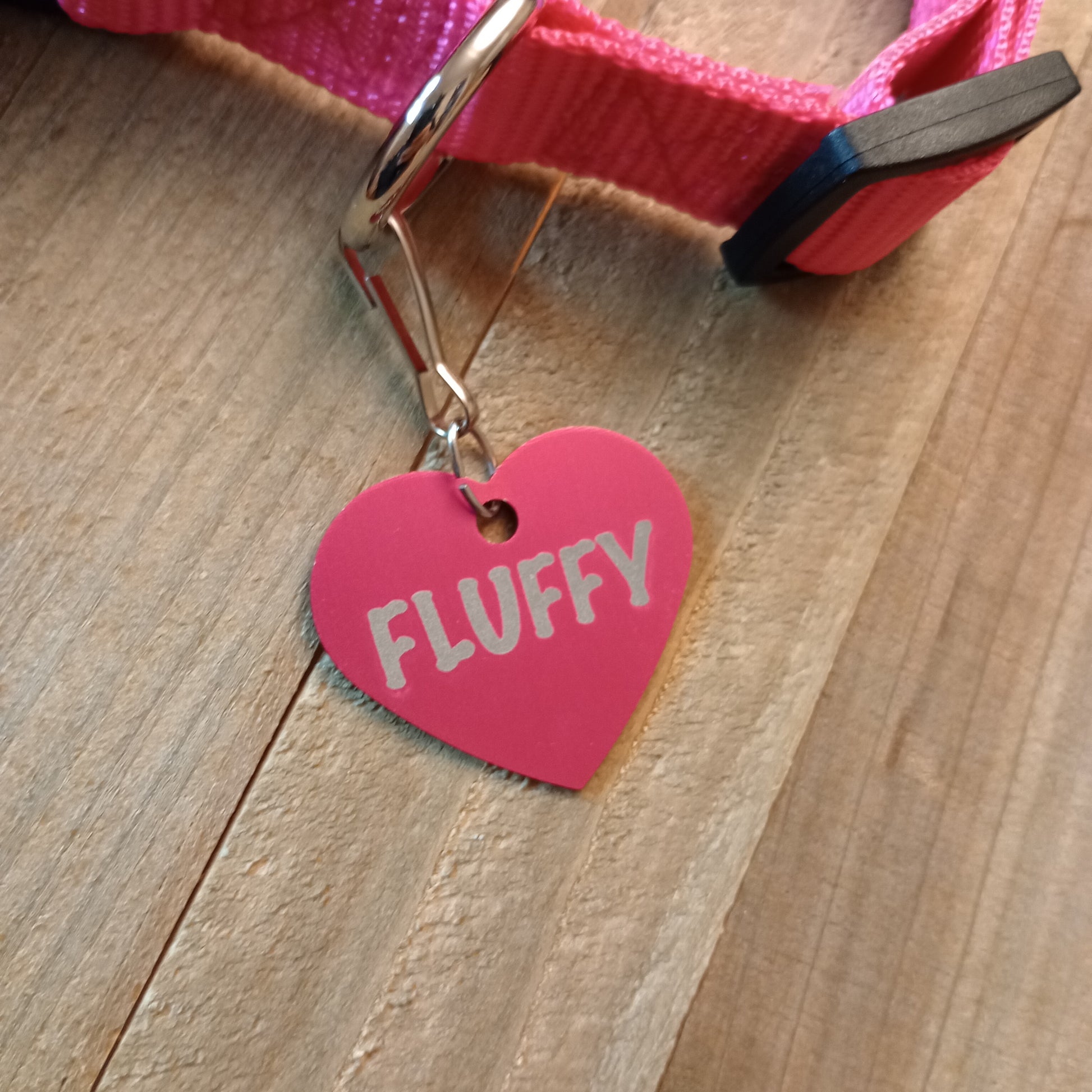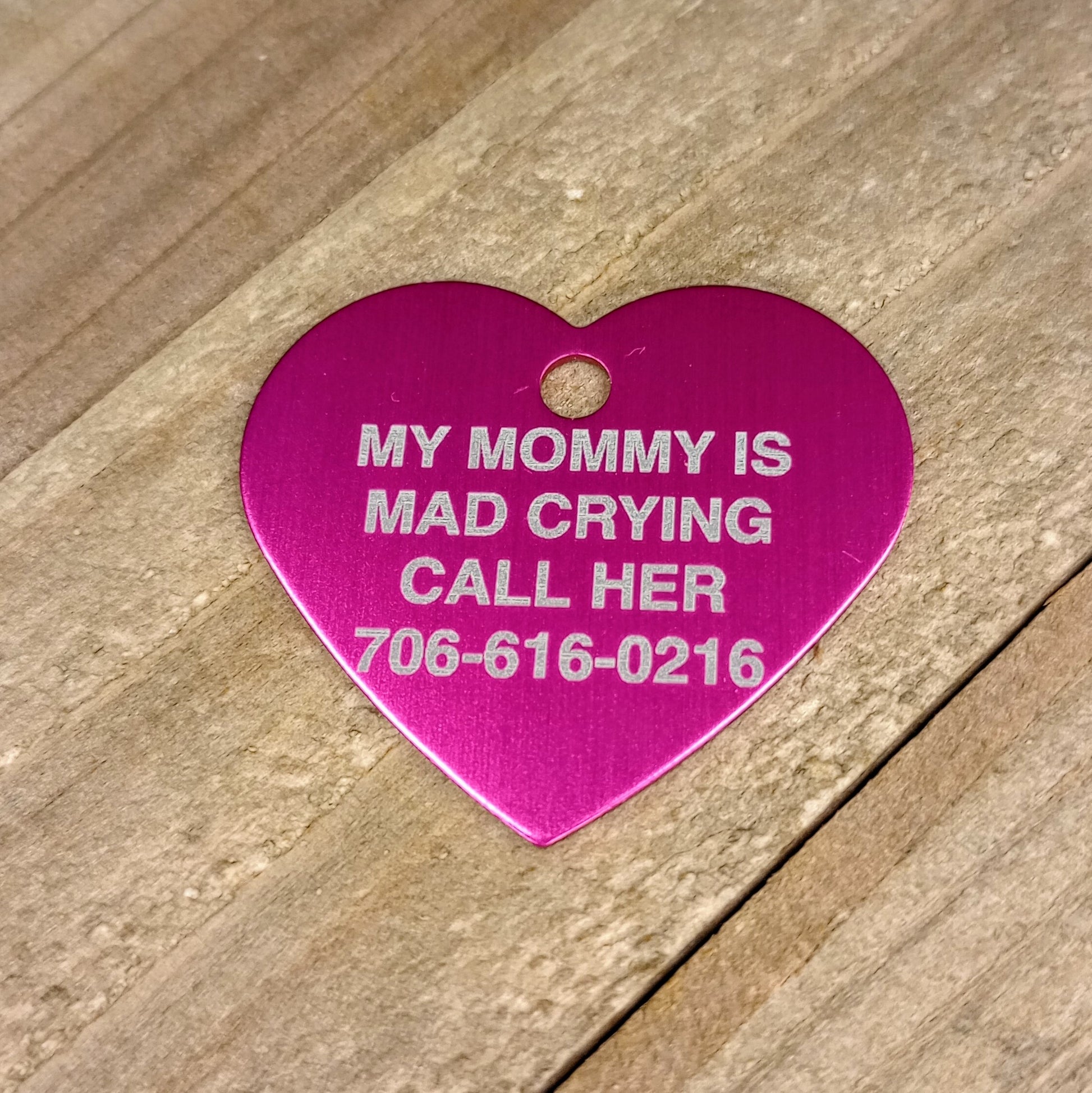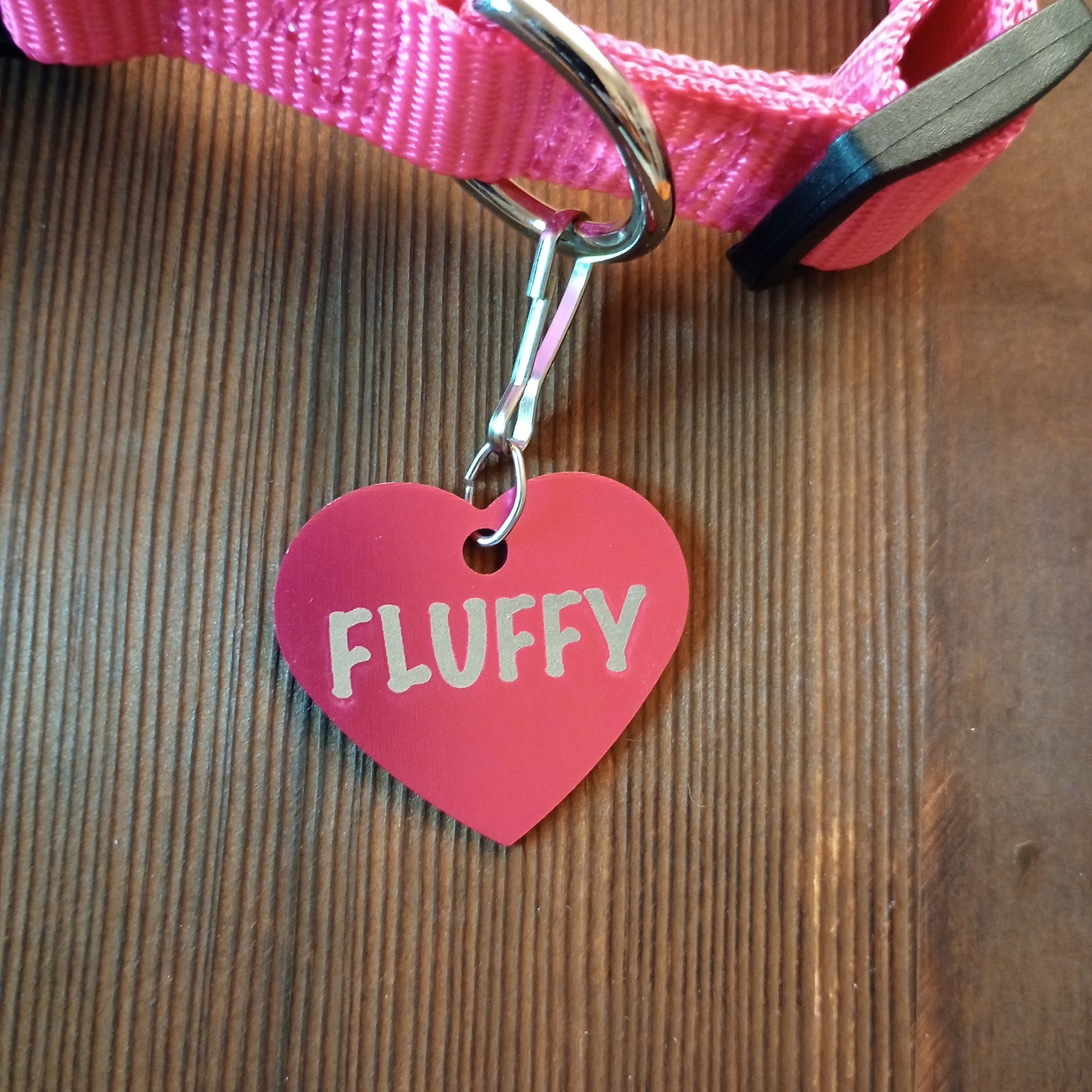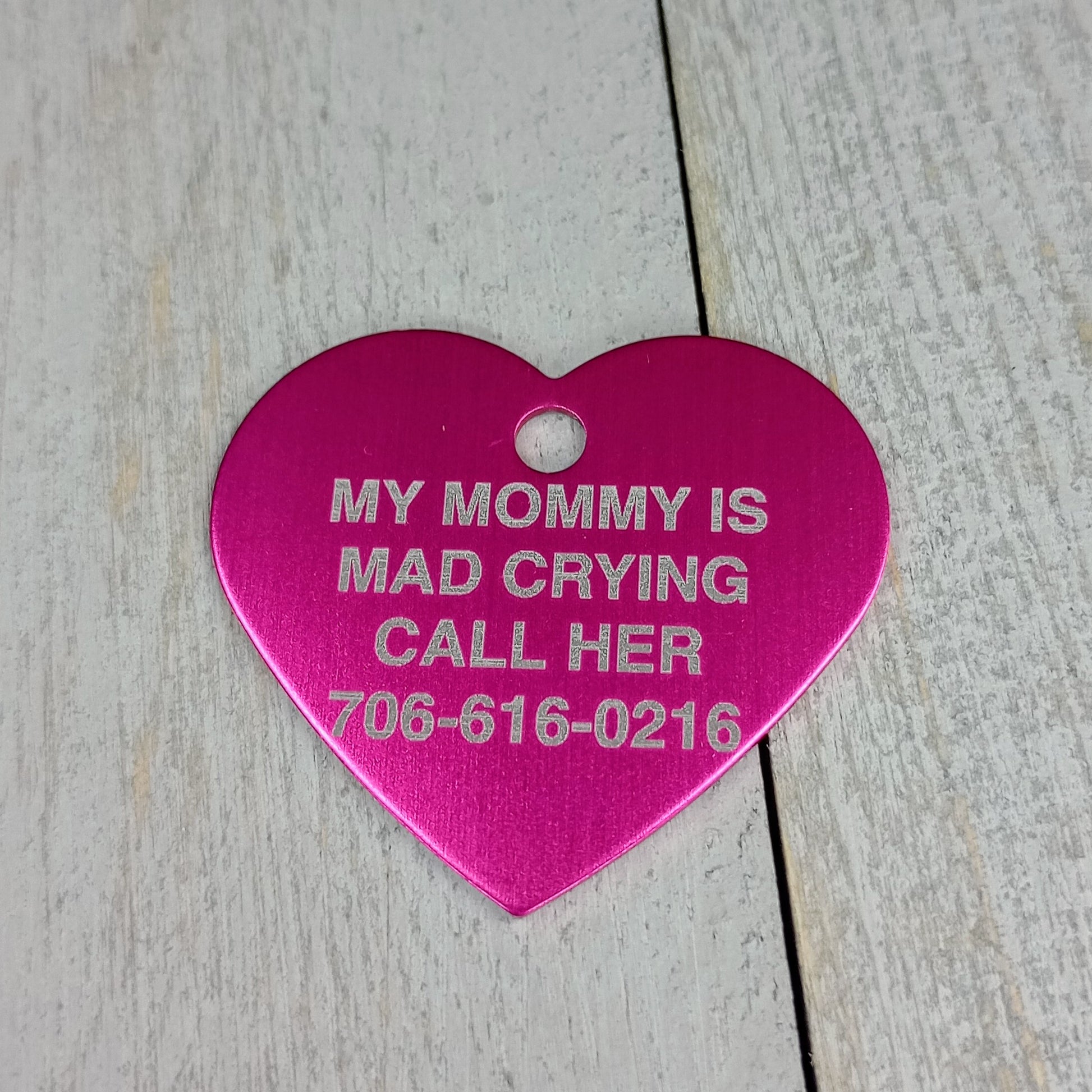 This Dark Pink Heart Shaped Pet Tag is anodized aluminum that allows for 4 lines of text to be engraved on the front and lines of text to be engraved on the back.