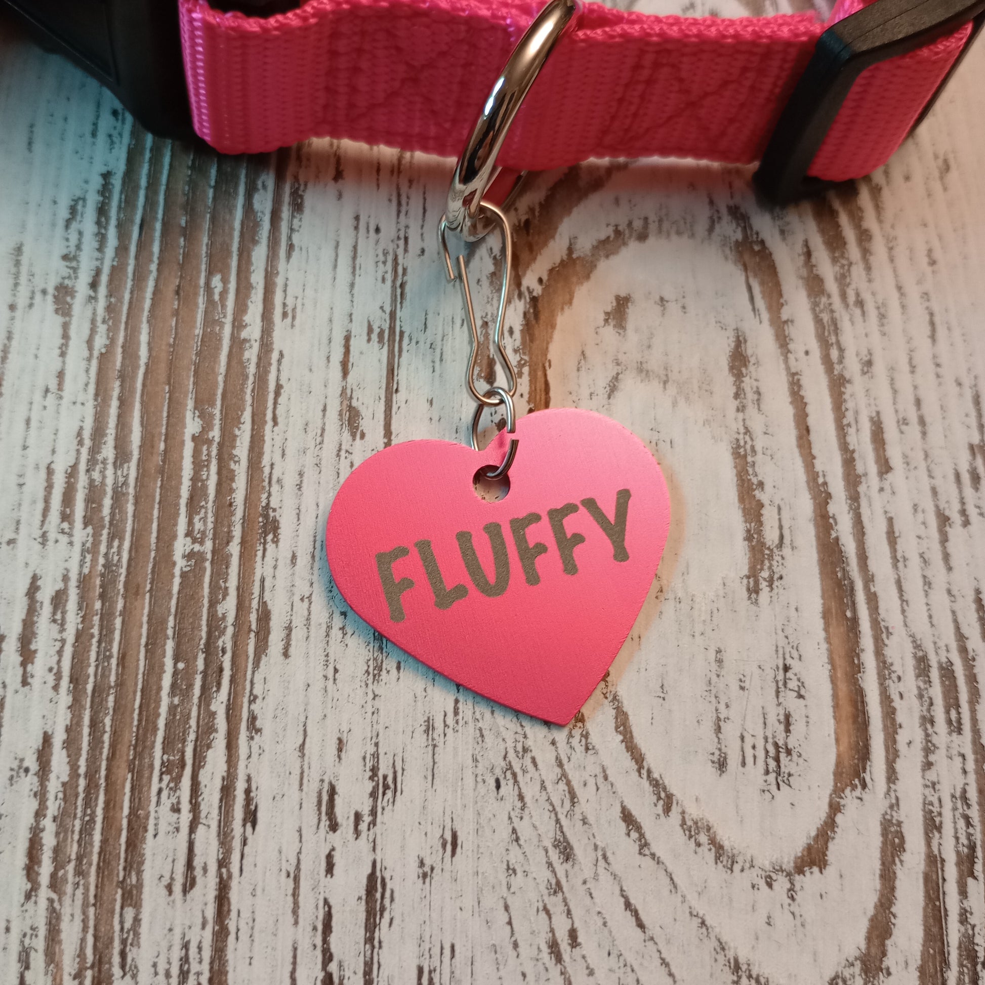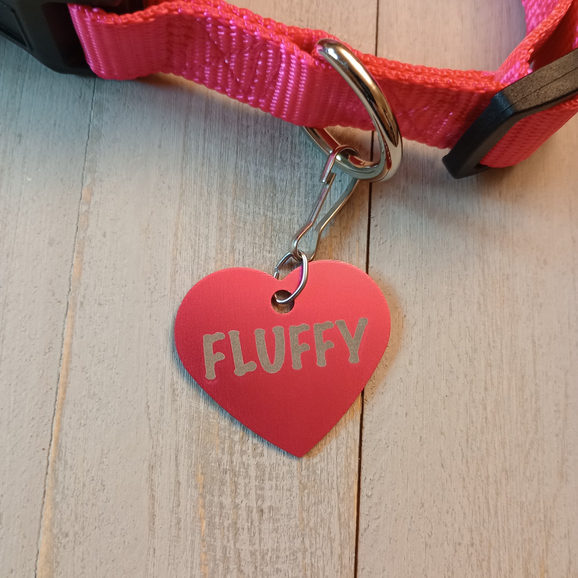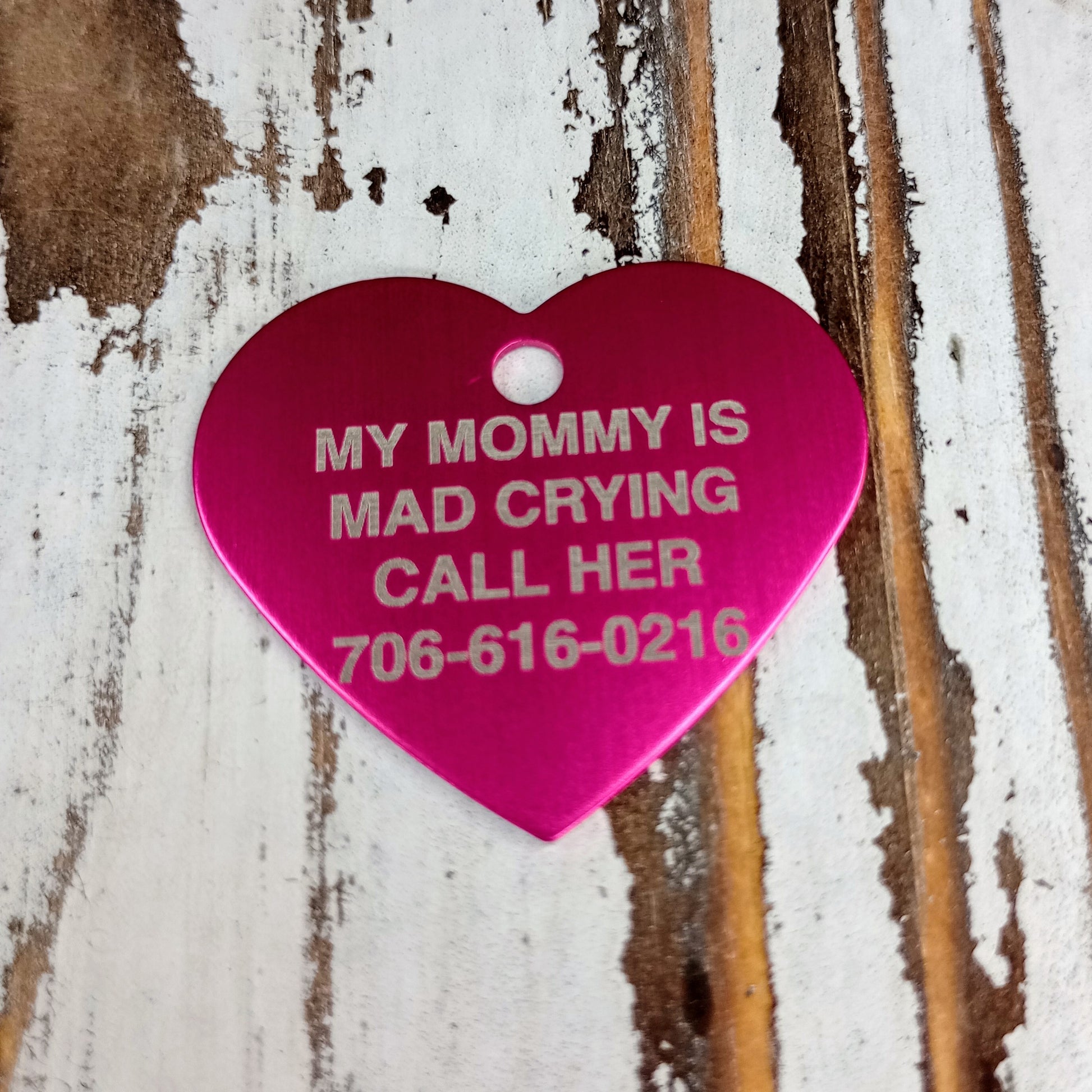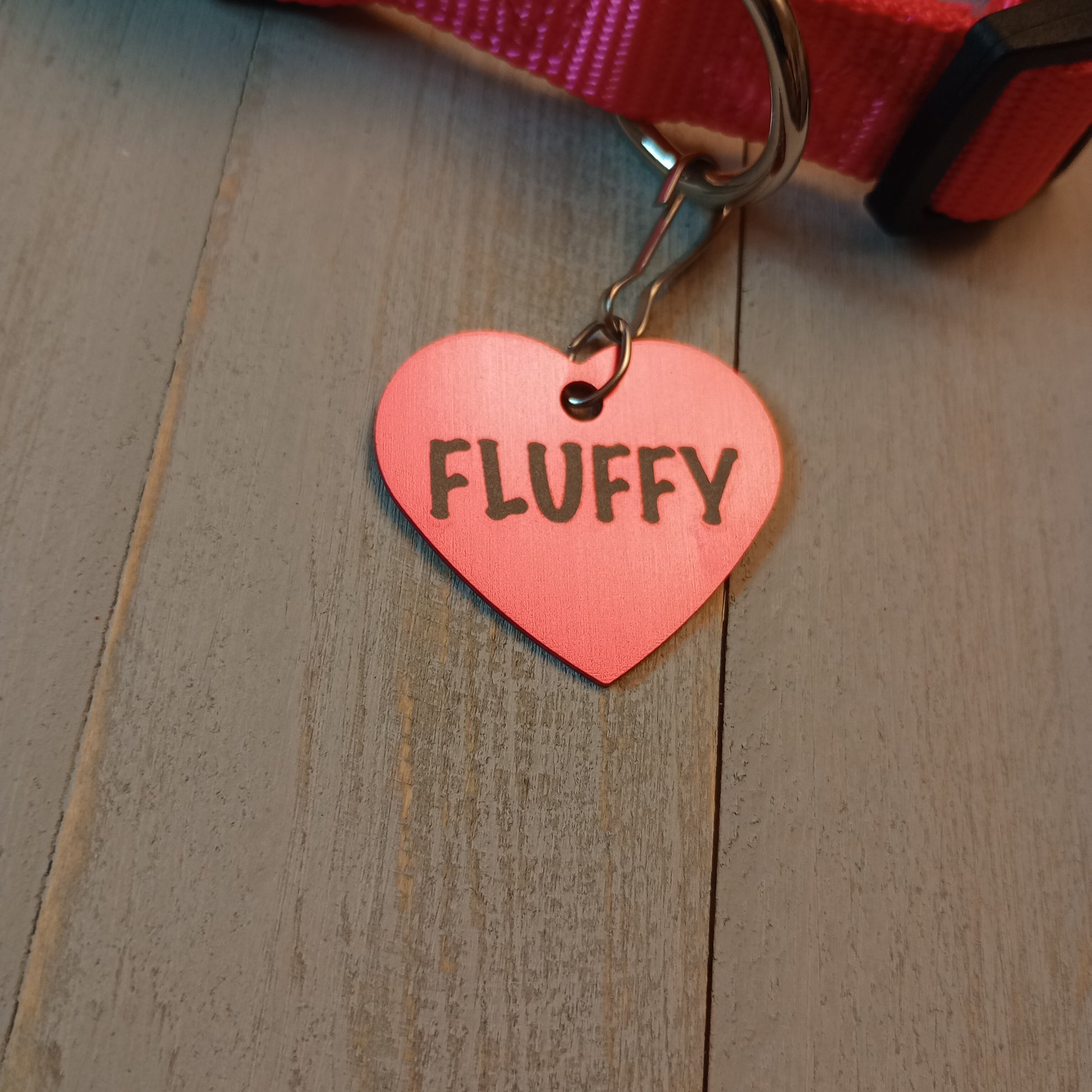 This Dark Pink Heart Shaped Pet Tag is anodized aluminum that allows for 4 lines of text to be engraved on the front and lines of text to be engraved on the back.