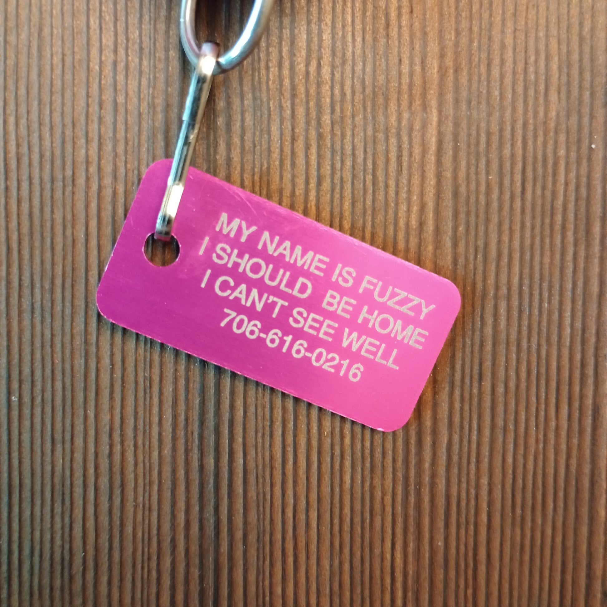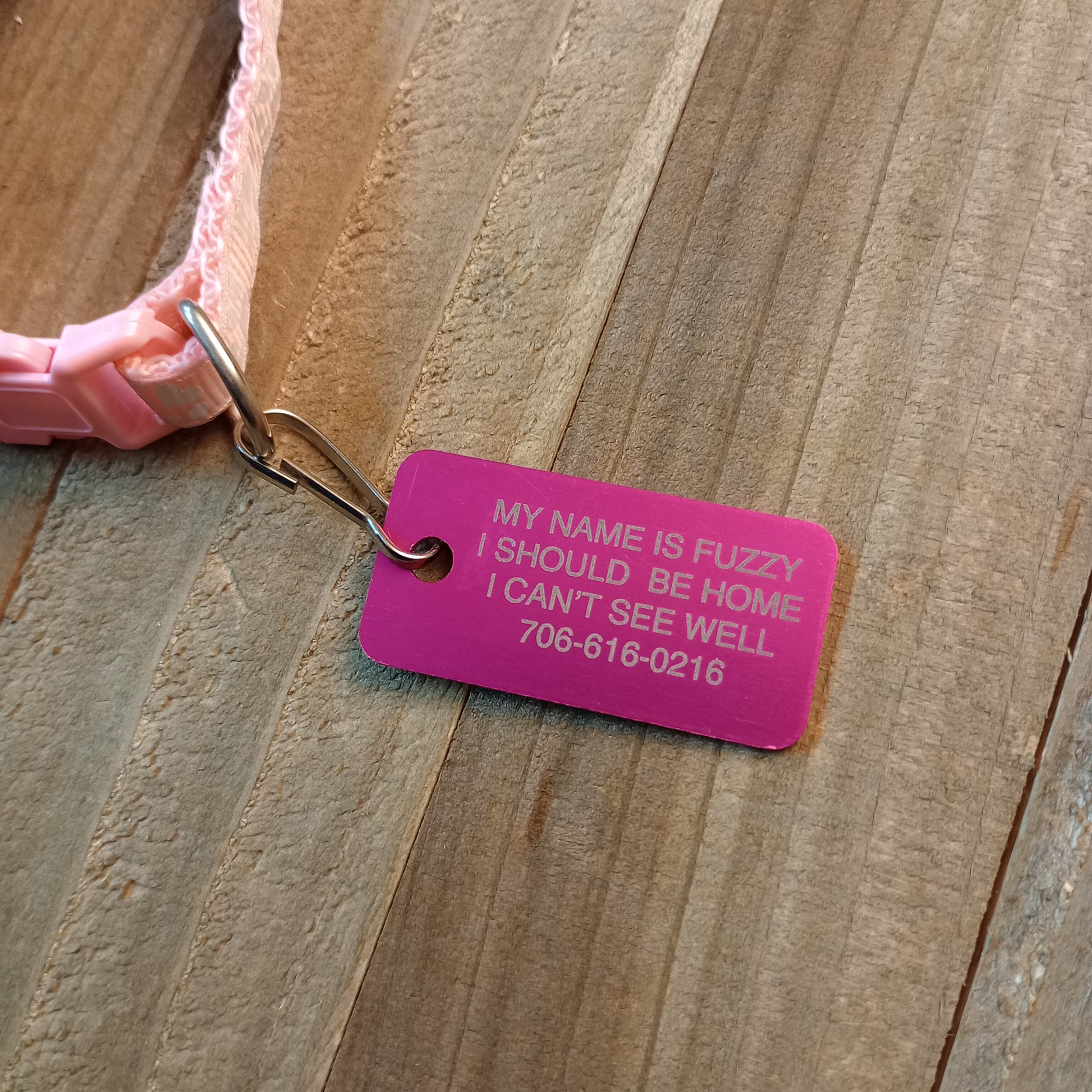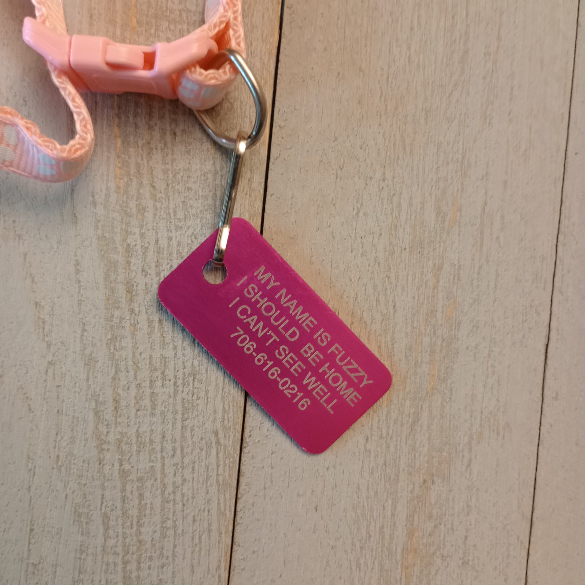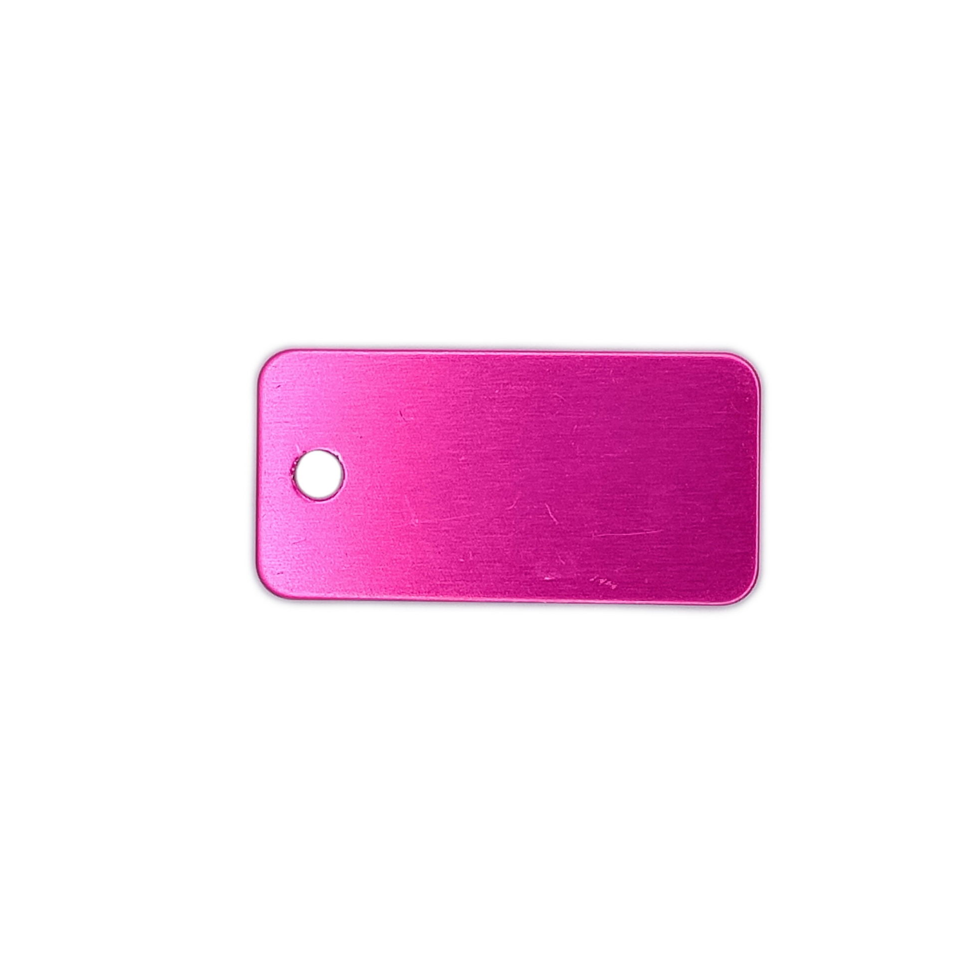 This Dark Pink Rectangular Pet Tag is anodized aluminum that allows for 4 lines of text to be engraved lengthwise on the front and 4 lines of text to be engraved lengthwise on the back.