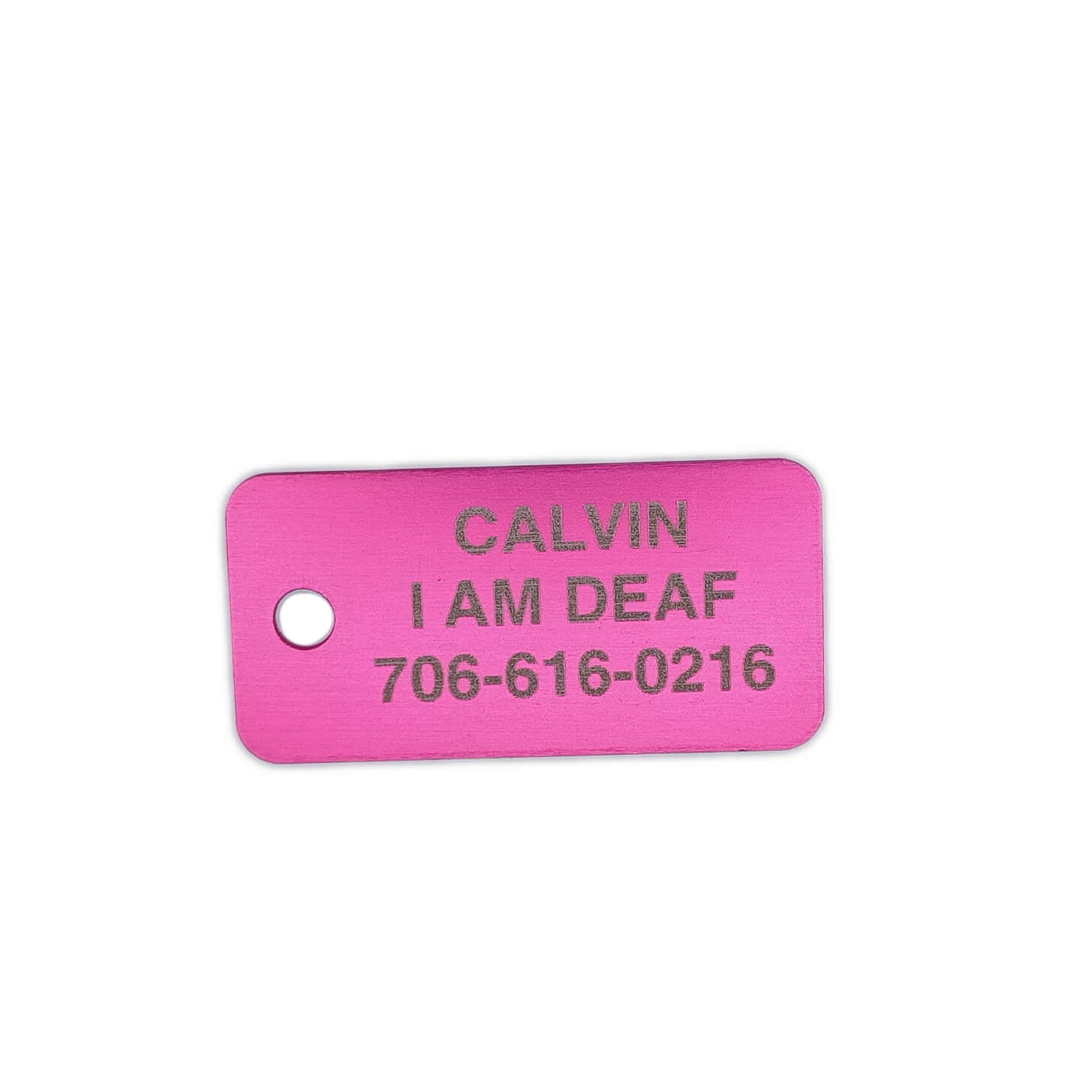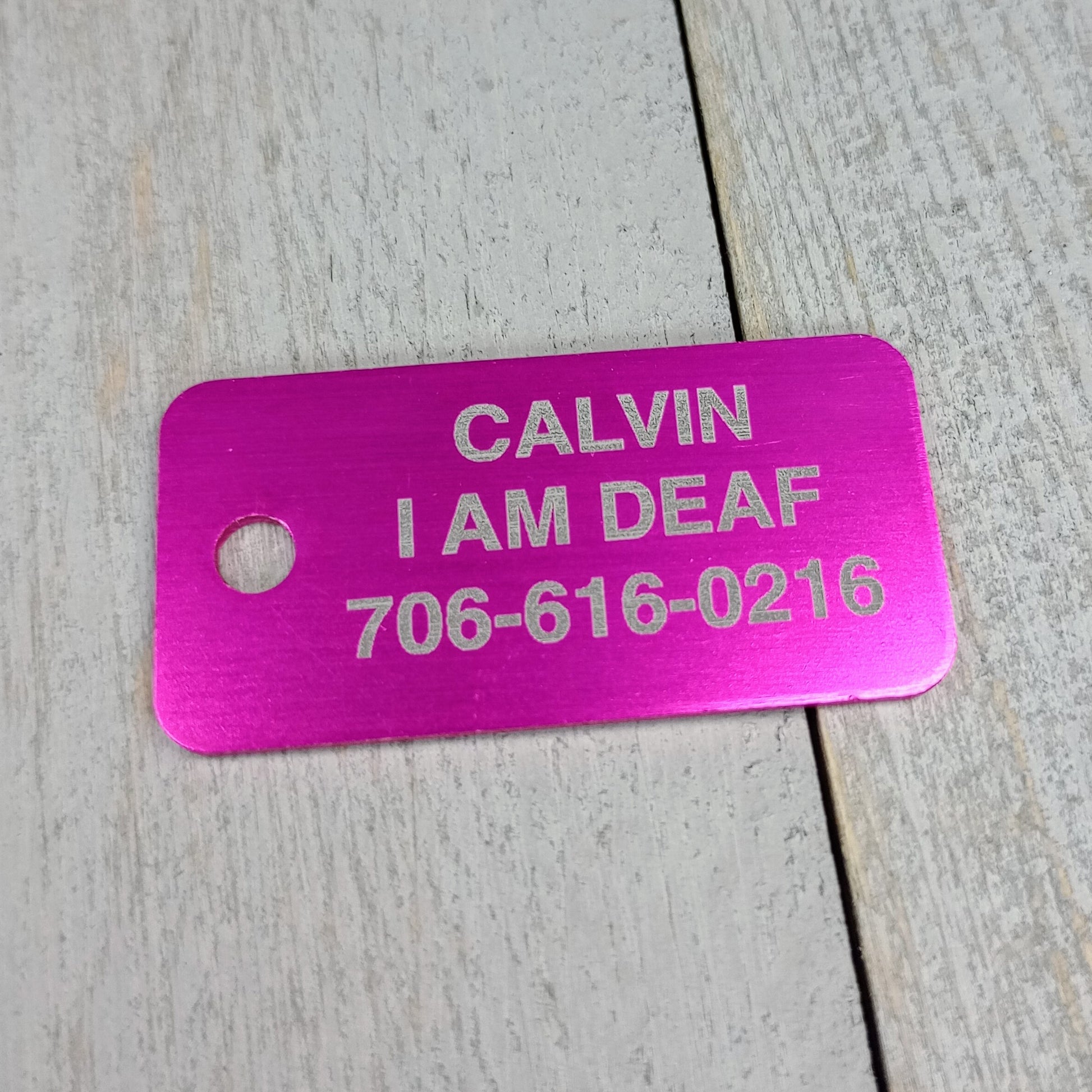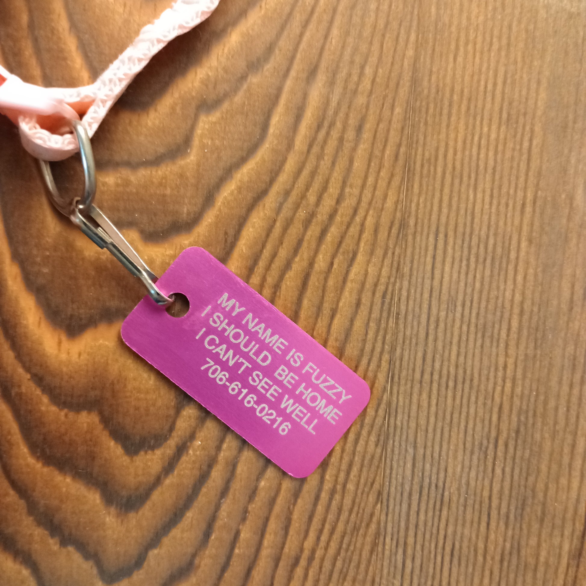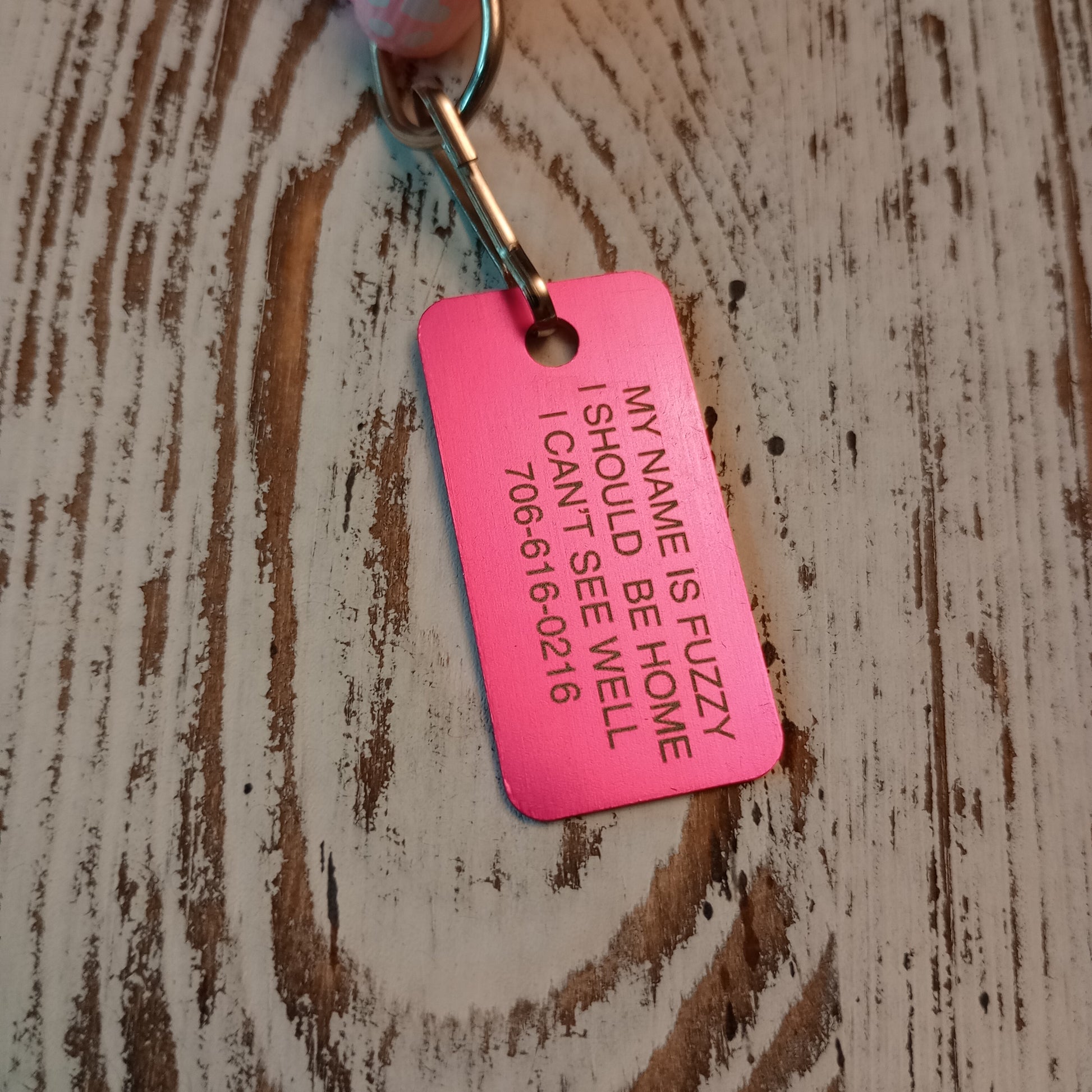 This Dark Pink Rectangular Pet Tag is anodized aluminum that allows for 4 lines of text to be engraved lengthwise on the front and 4 lines of text to be engraved lengthwise on the back.