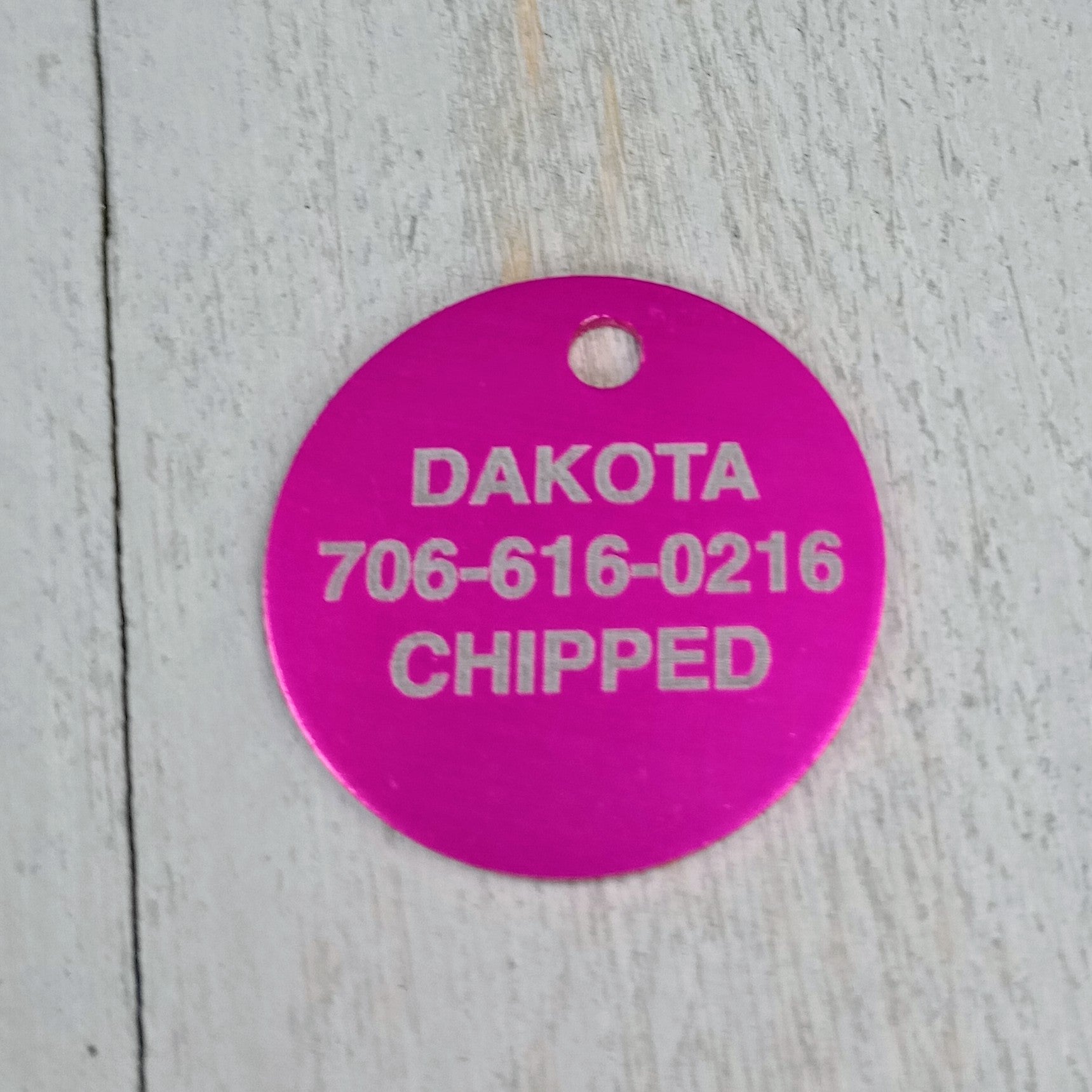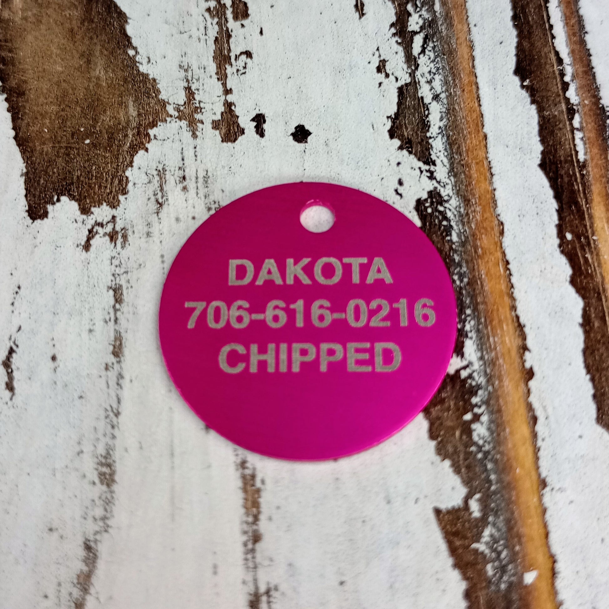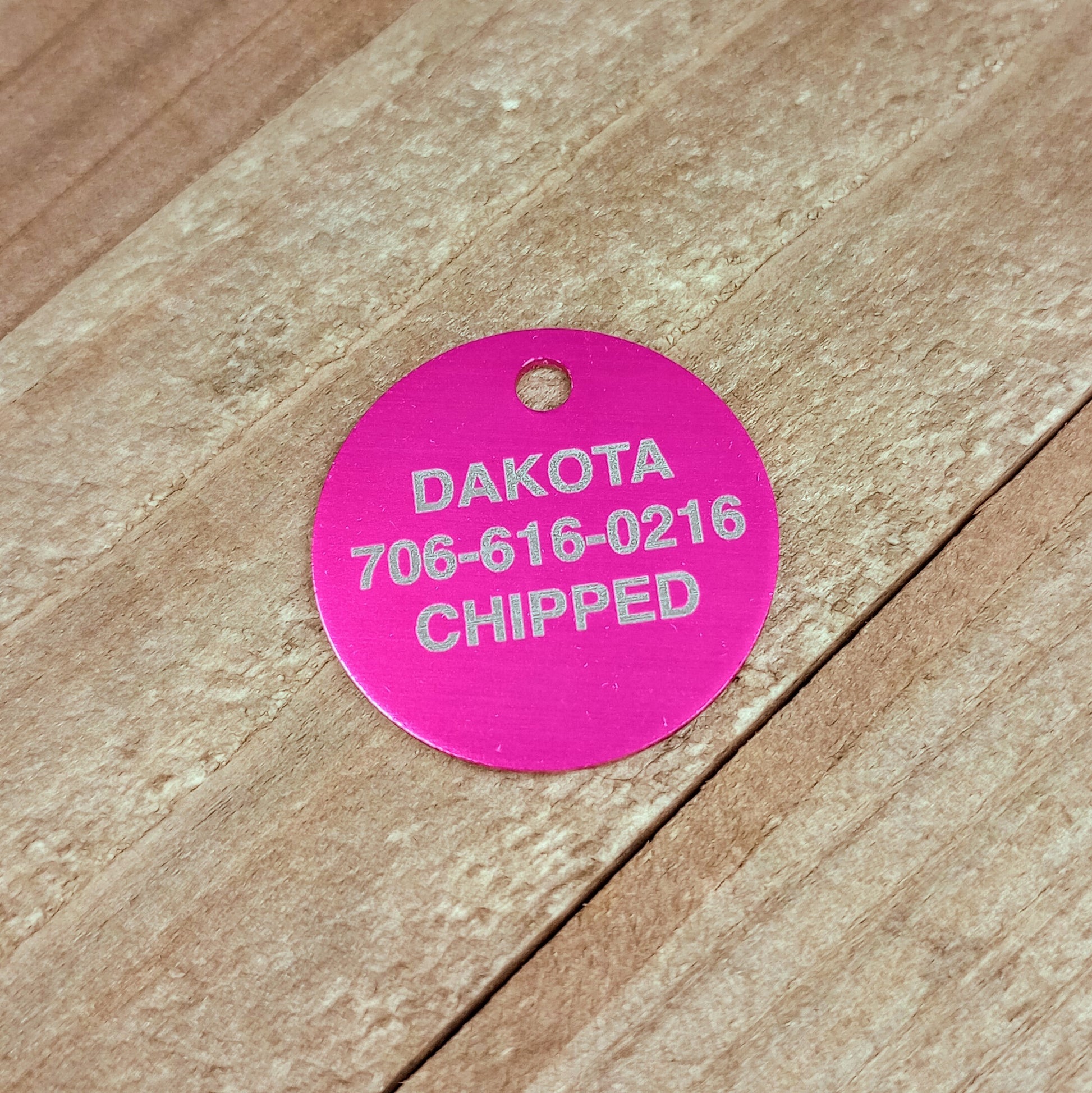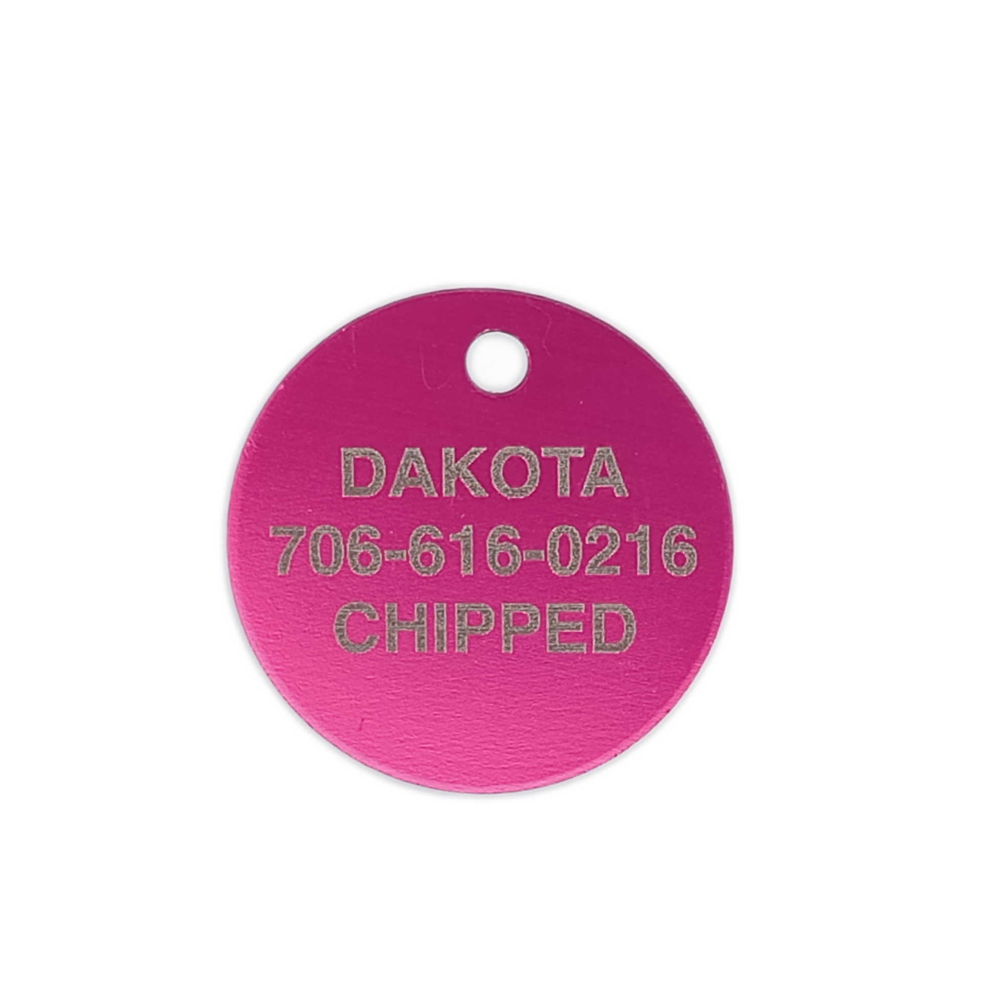 This Dark Pink Round Pet Tag is anodized aluminum that allows for 4 lines of text to be engraved on the front and 4 lines of text to be engraved on the back.