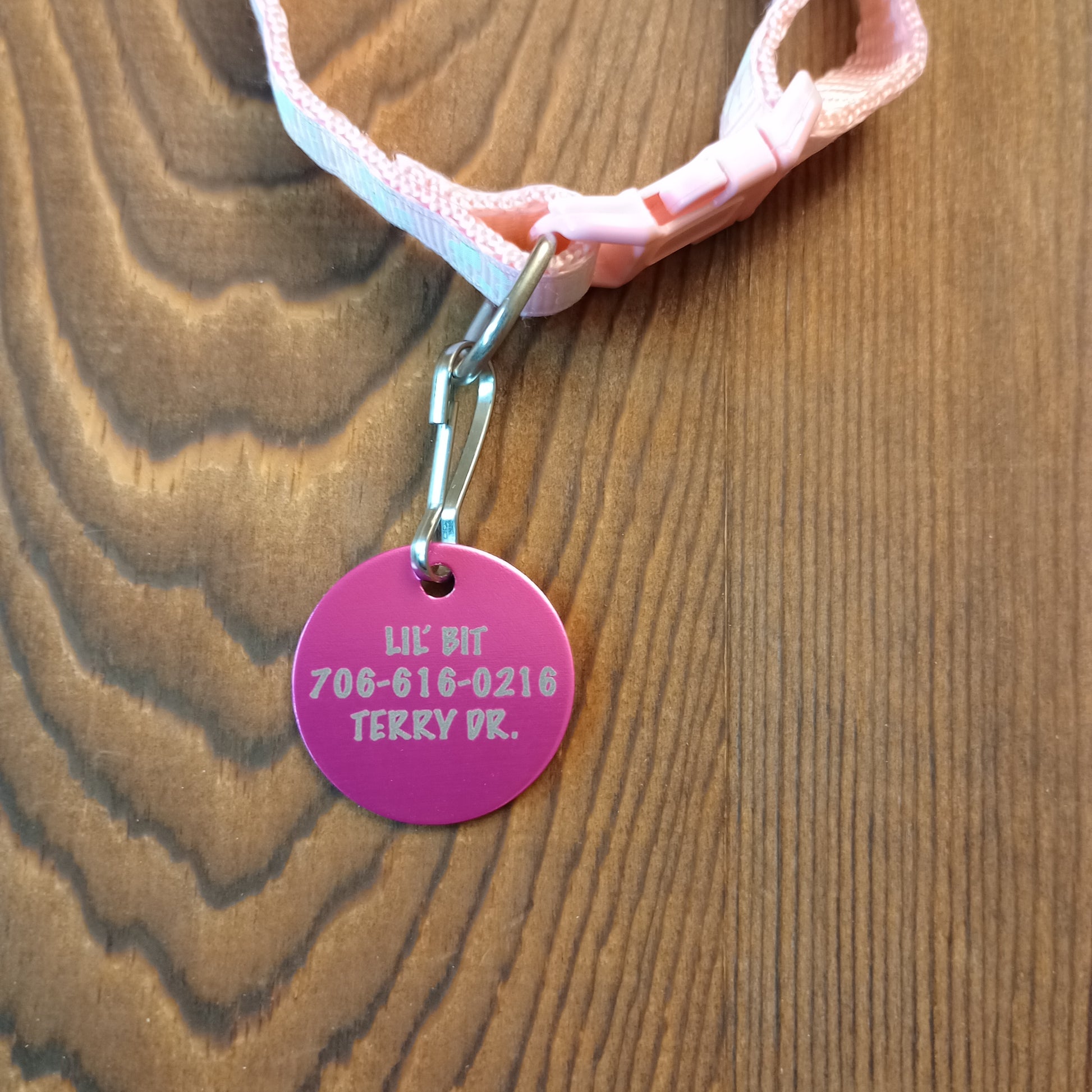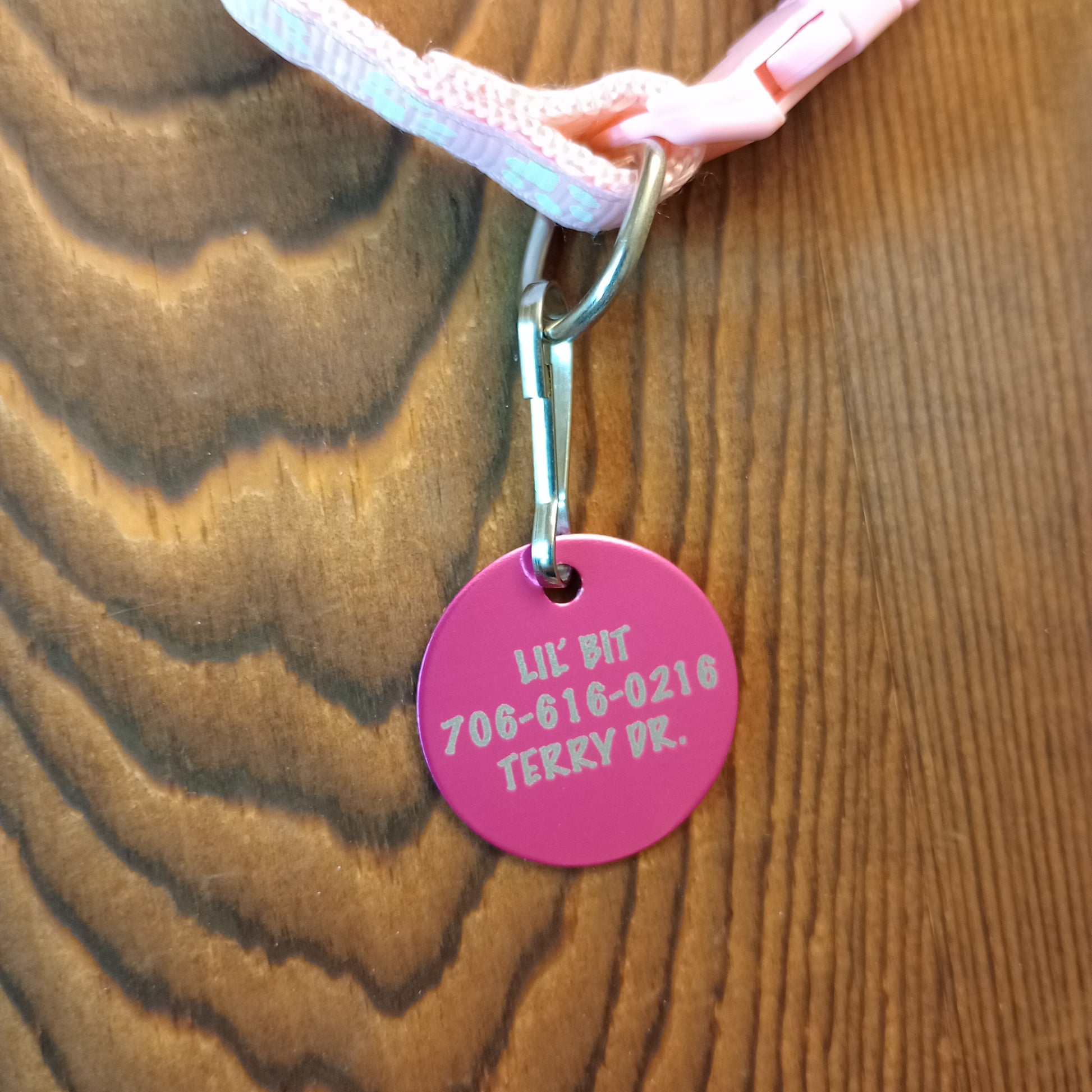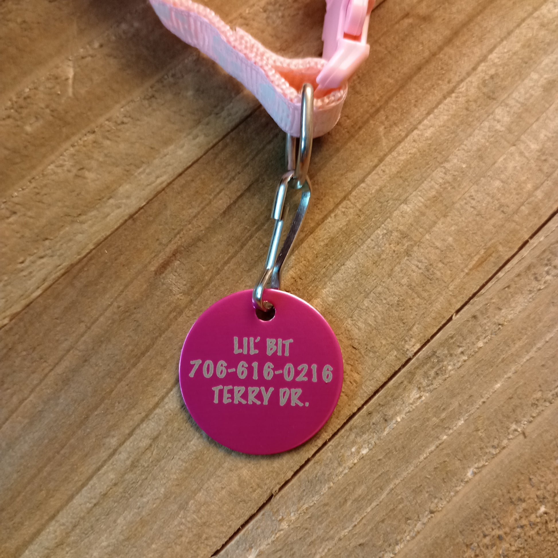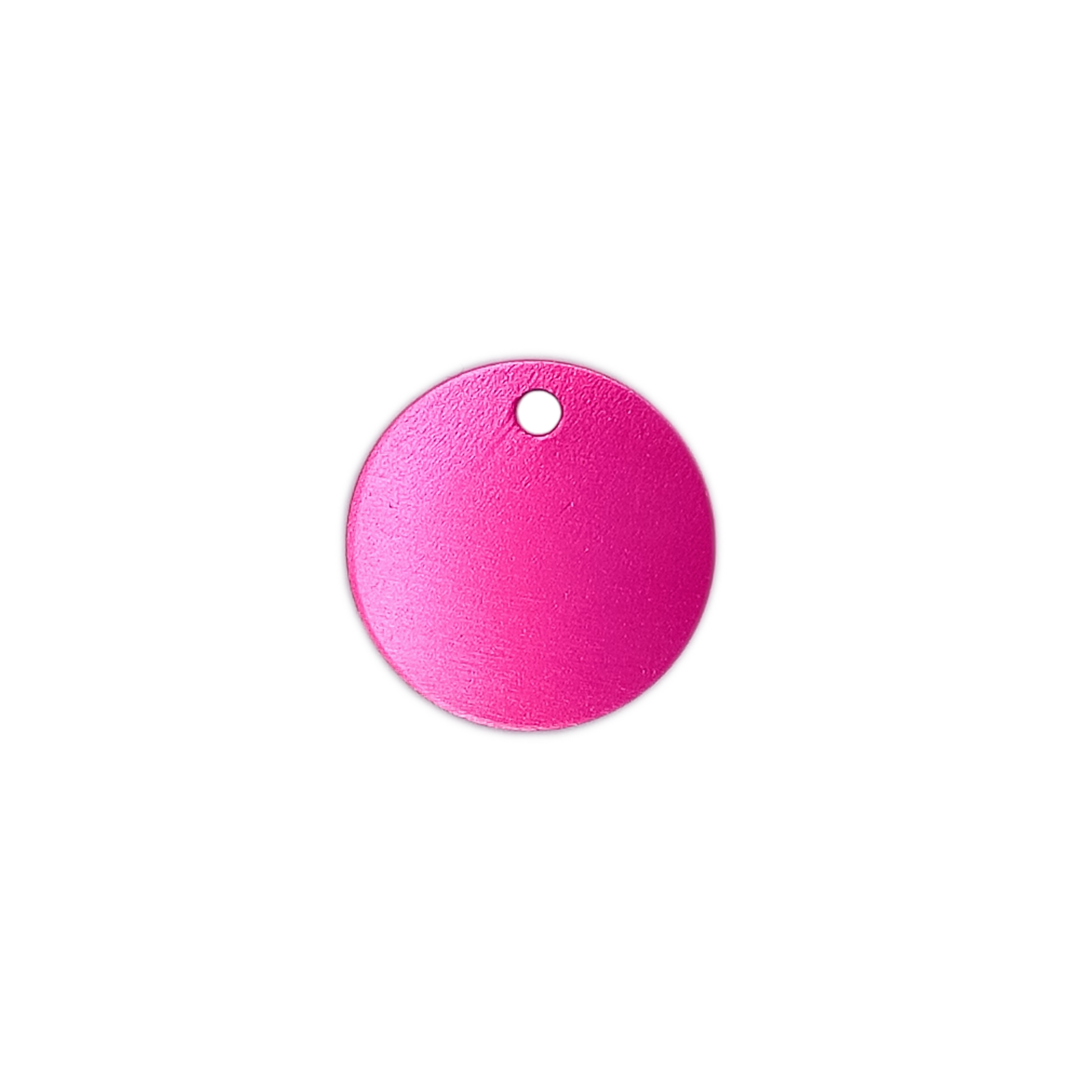 This Dark Pink Round Pet Tag is anodized aluminum that allows for 4 lines of text to be engraved on the front and 4 lines of text to be engraved on the back.