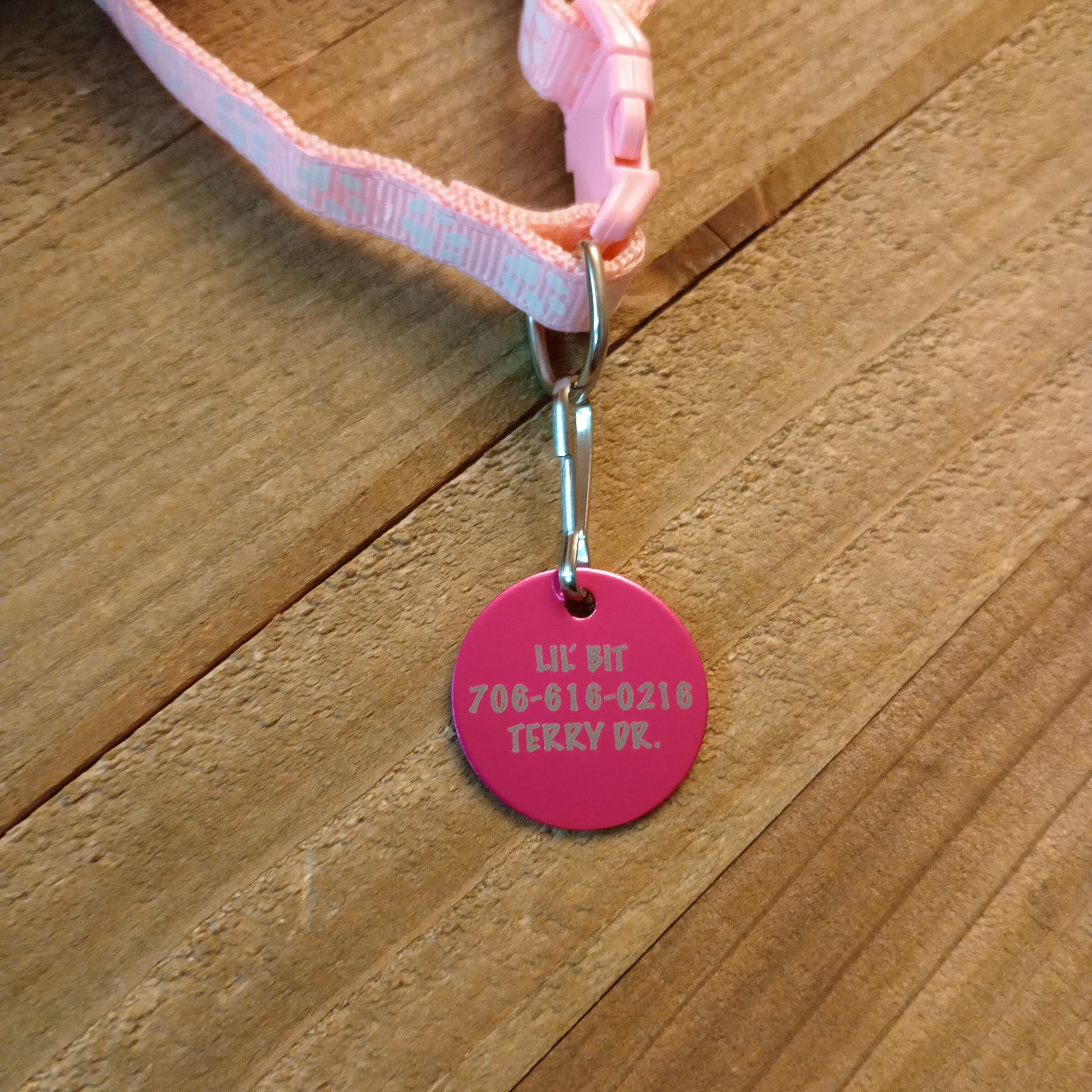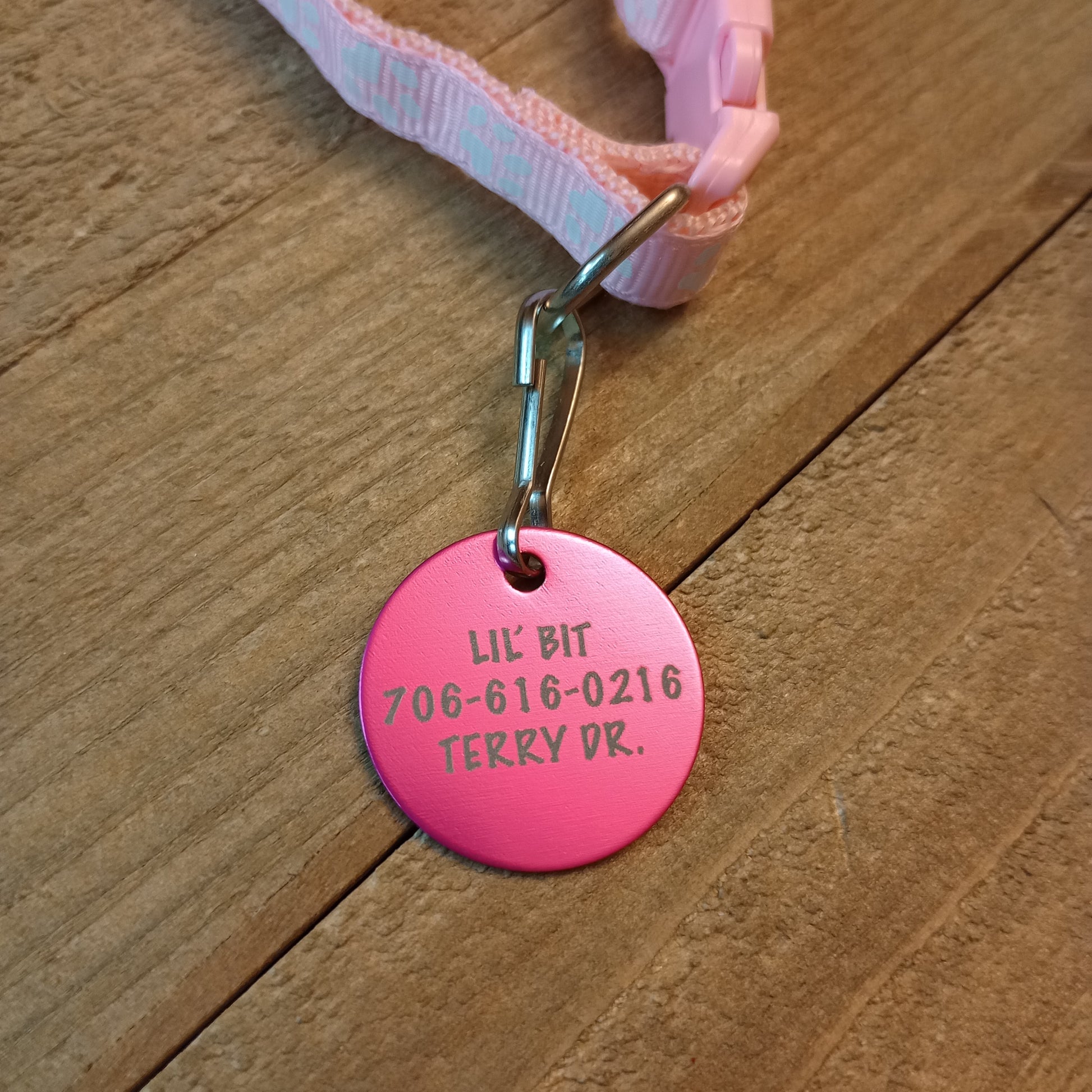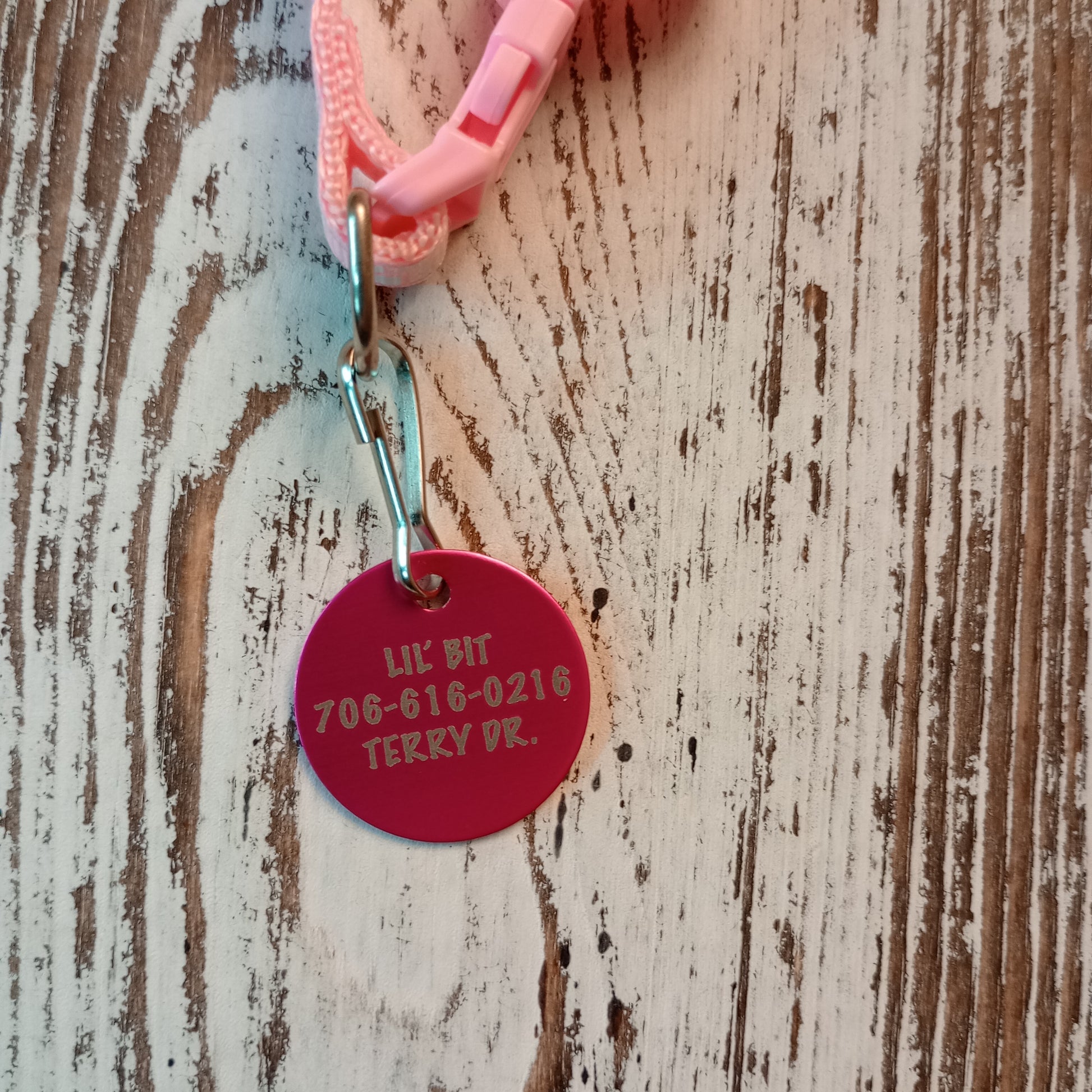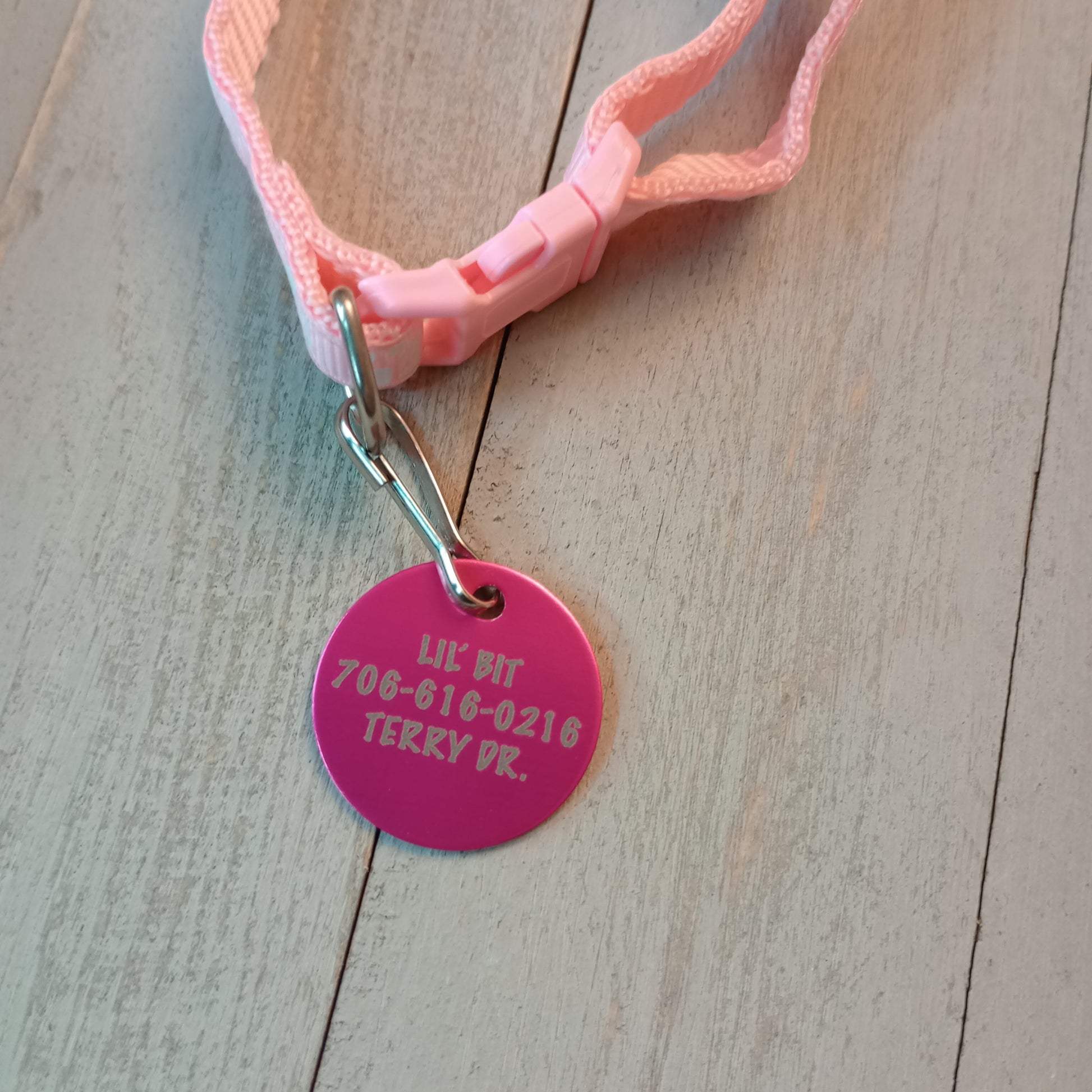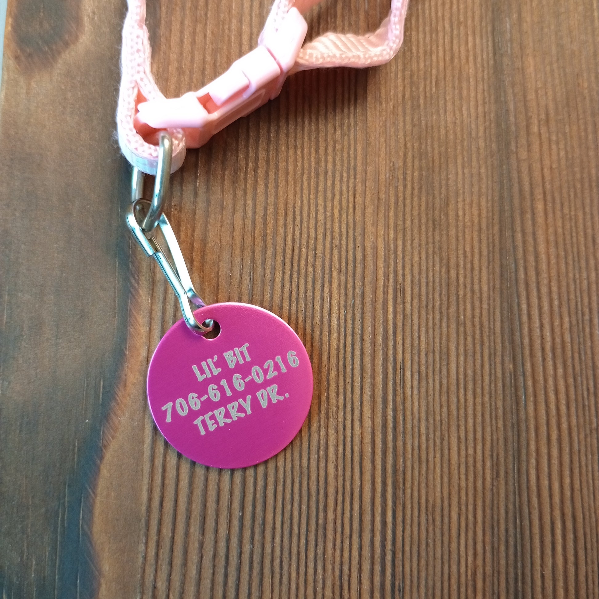 This Dark Pink Round Pet Tag is anodized aluminum that allows for 4 lines of text to be engraved on the front and 4 lines of text to be engraved on the back.
