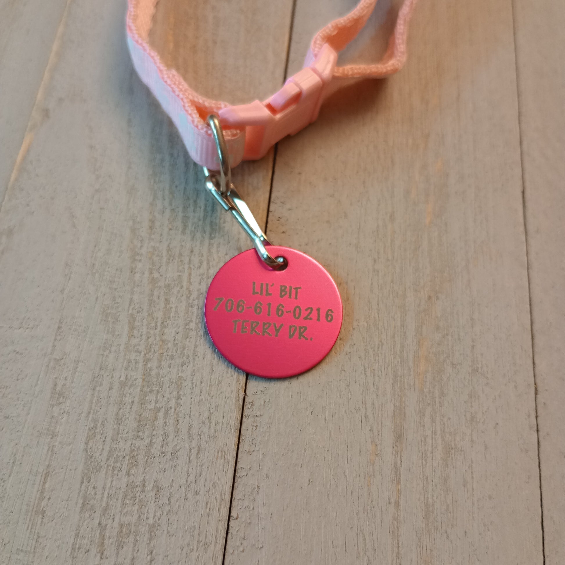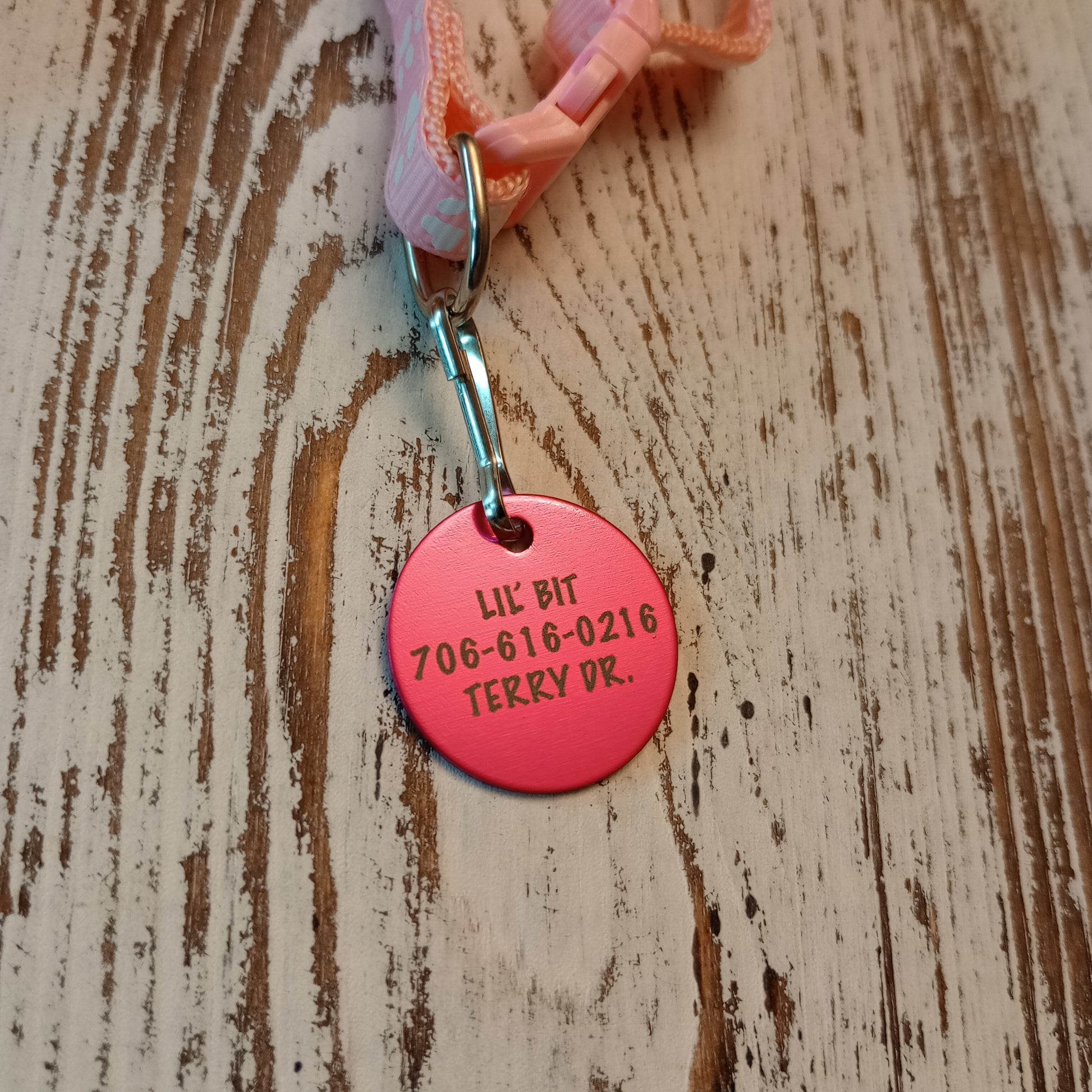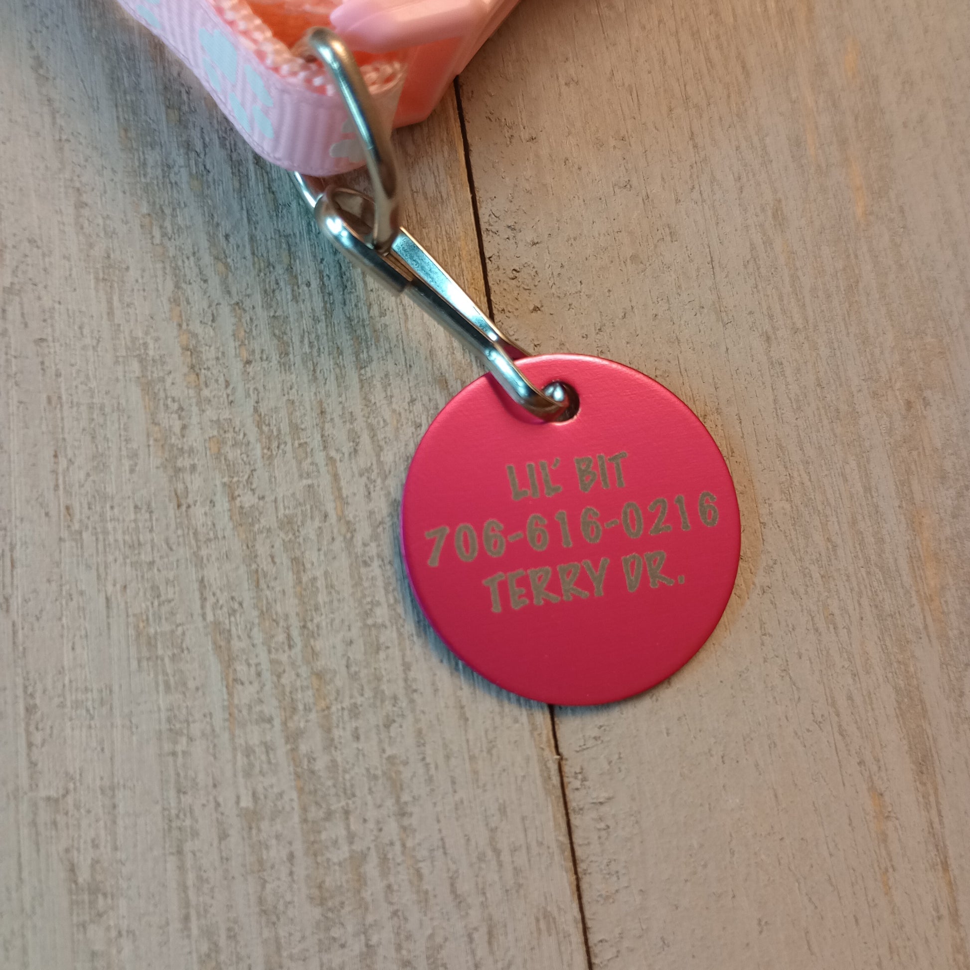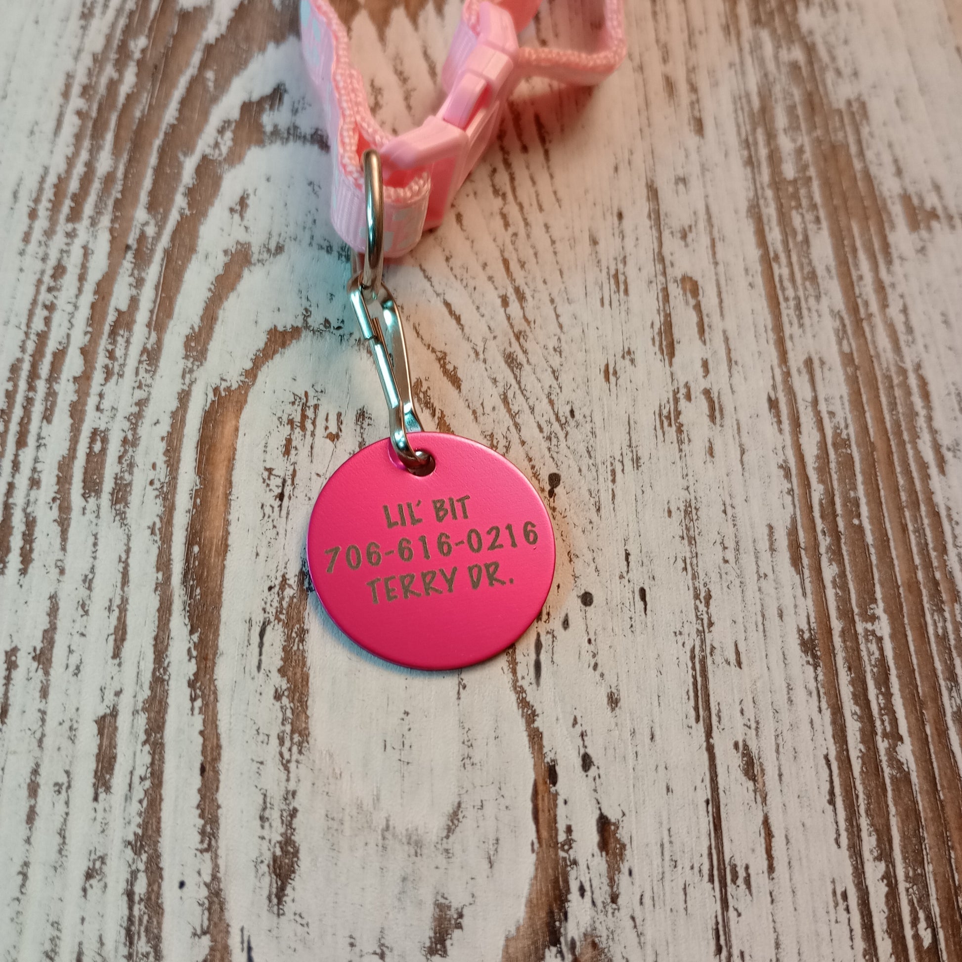 This Dark Pink Round Pet Tag is anodized aluminum that allows for 4 lines of text to be engraved on the front and 4 lines of text to be engraved on the back.