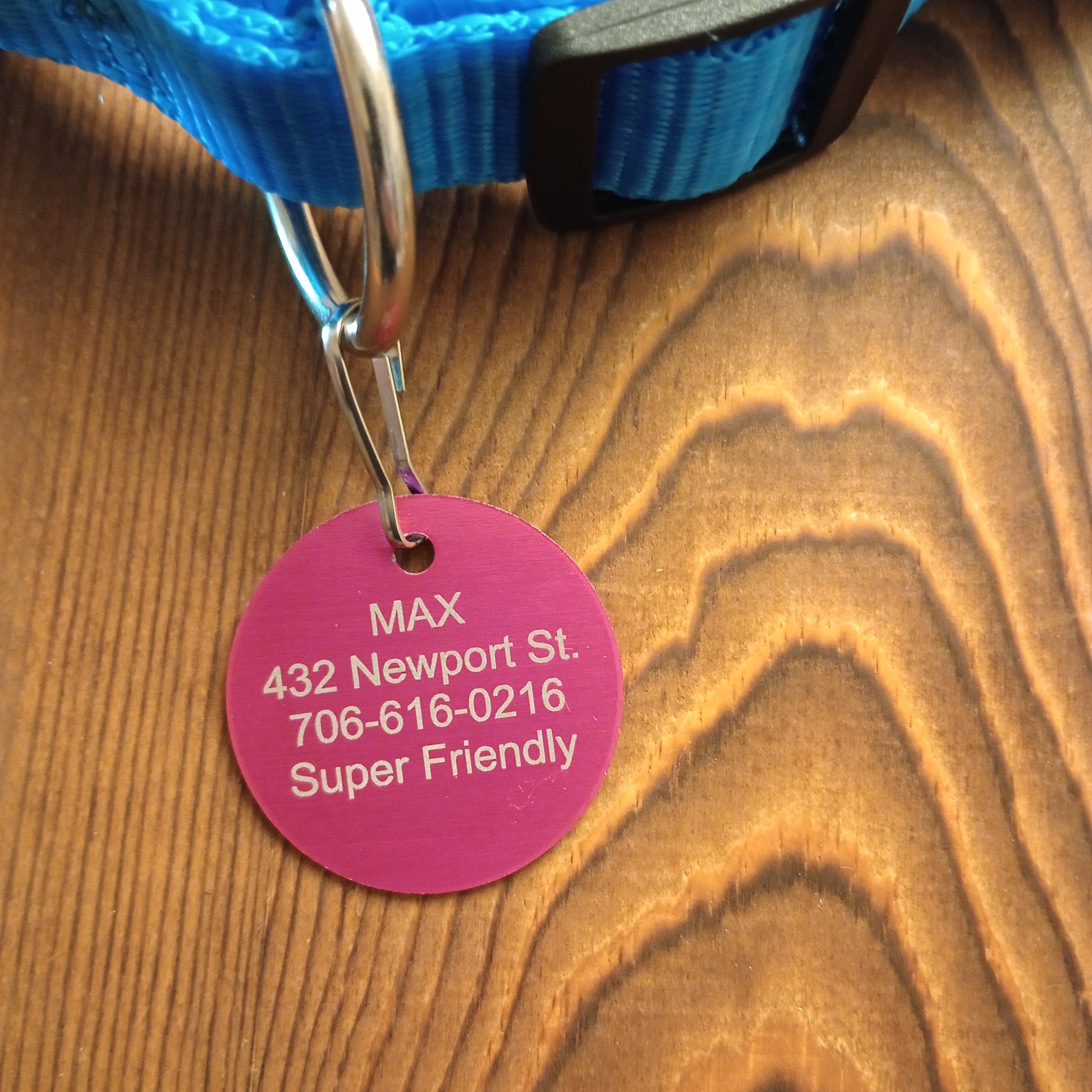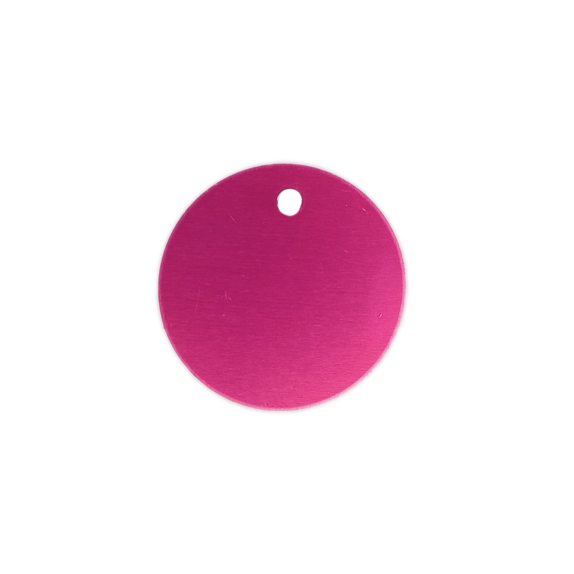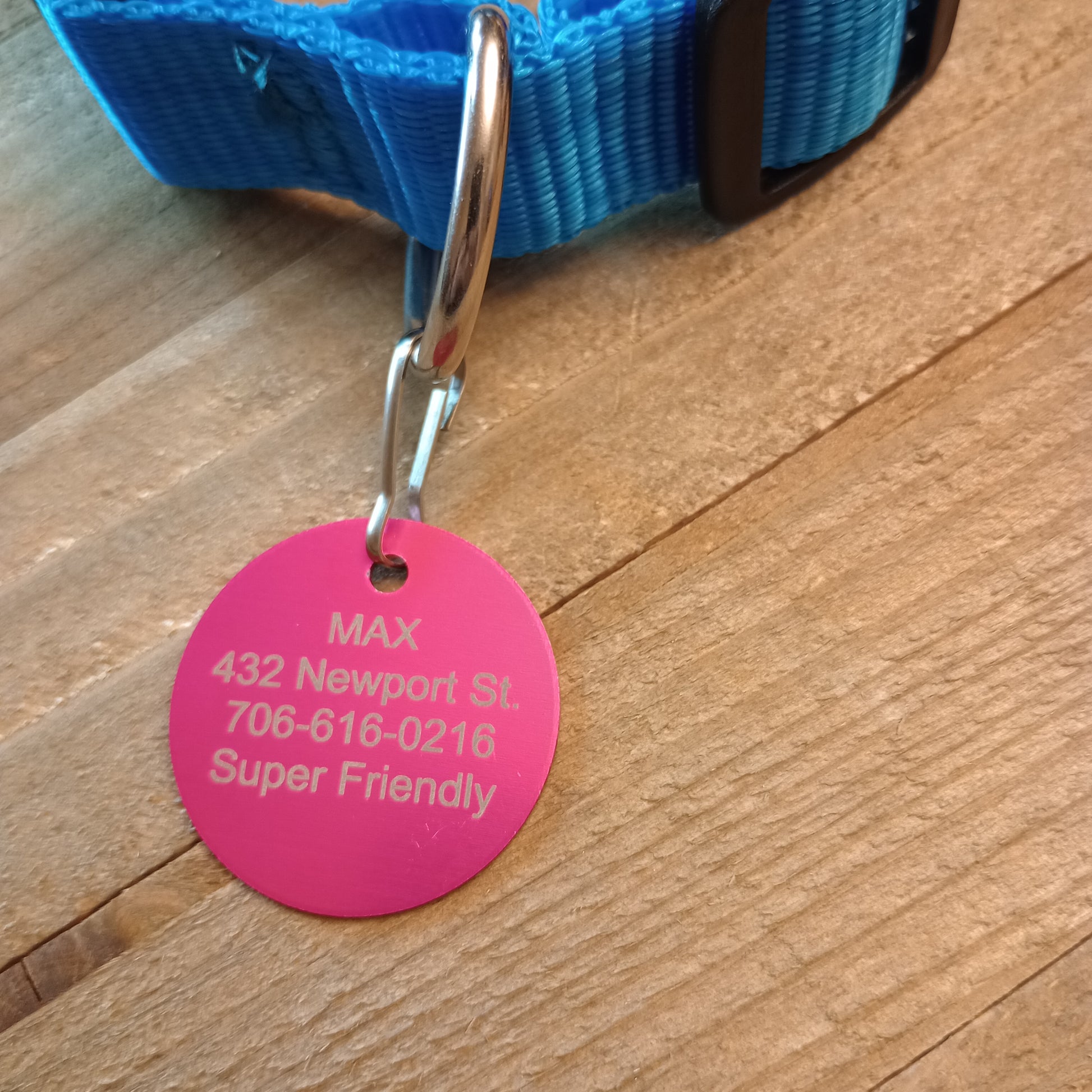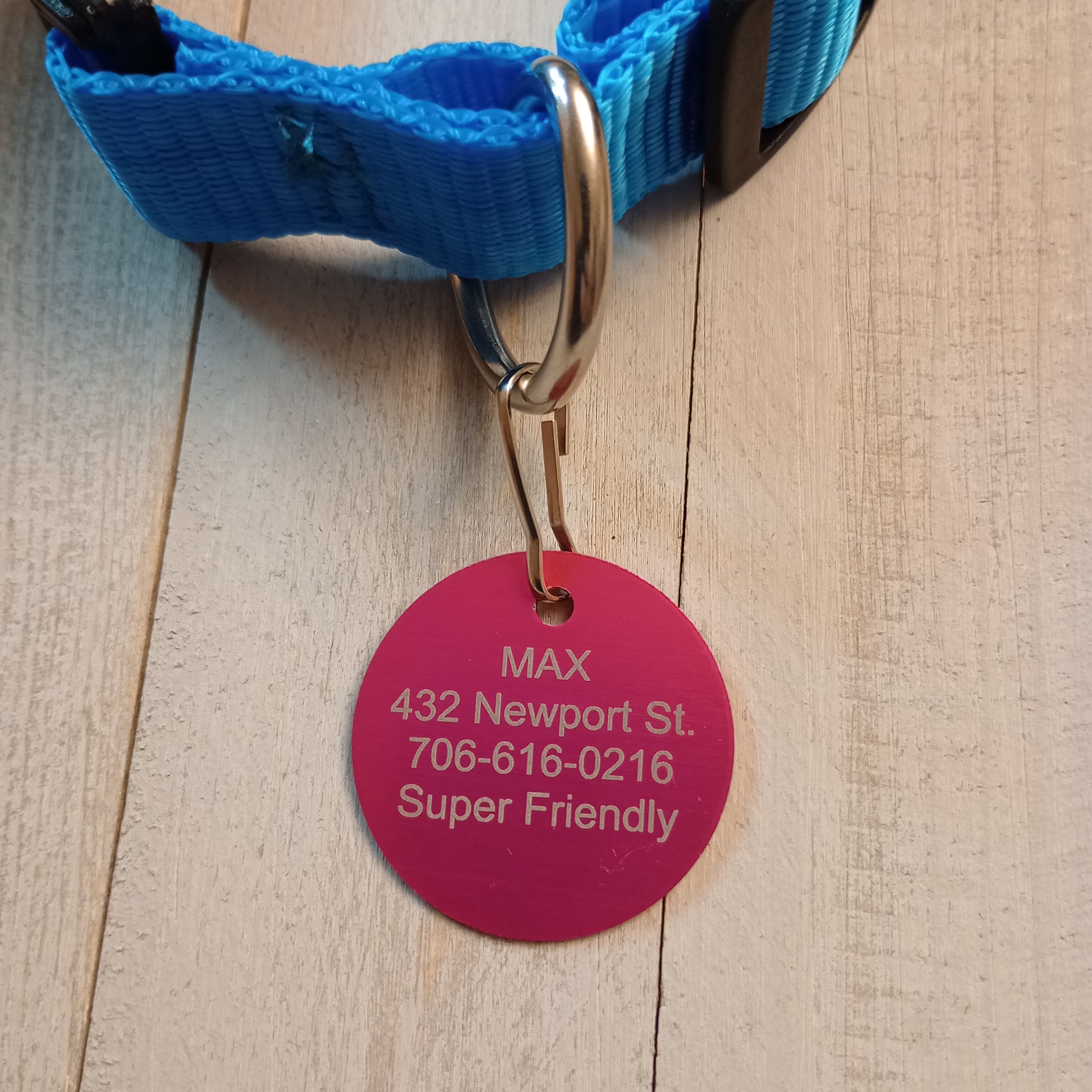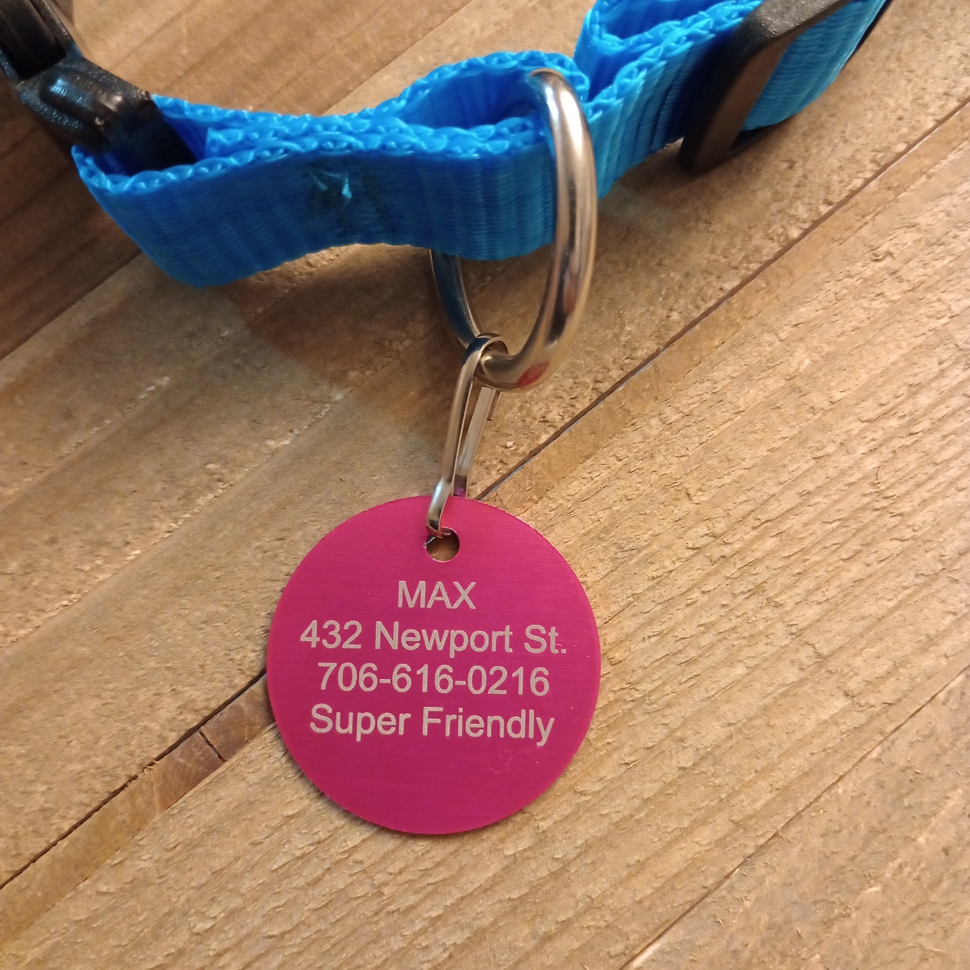 This Dark Pink Round Pet Tag is anodized aluminum that allows for 4 lines of text to be engraved on the front and 4 lines of text to be engraved on the back.