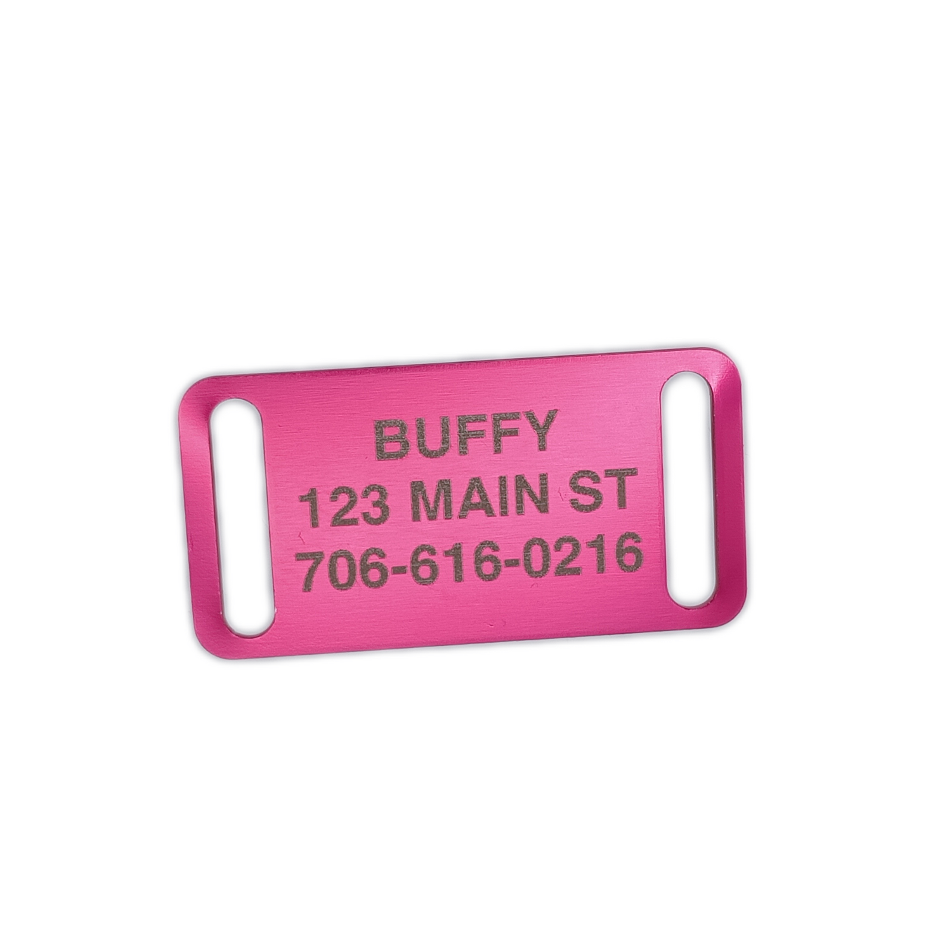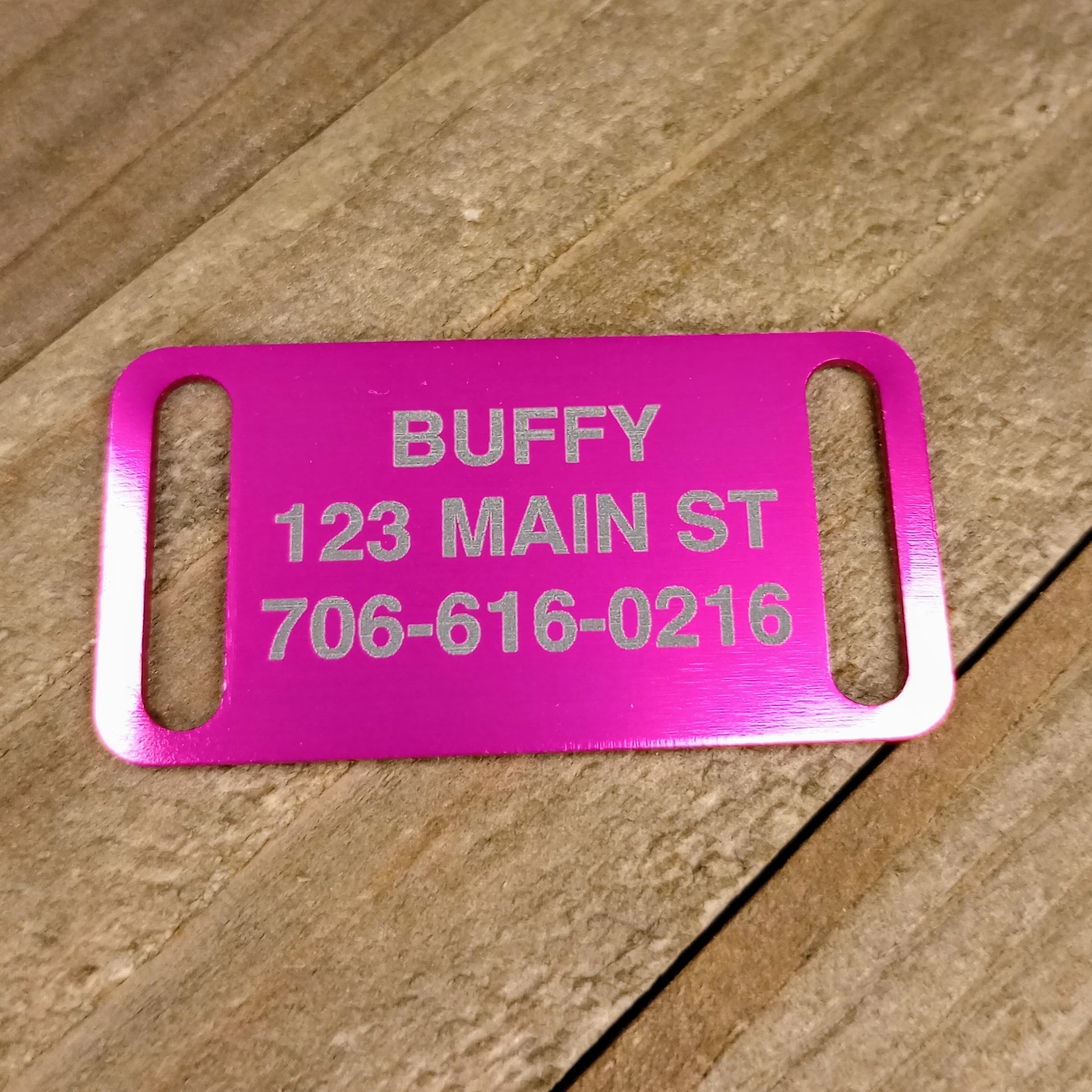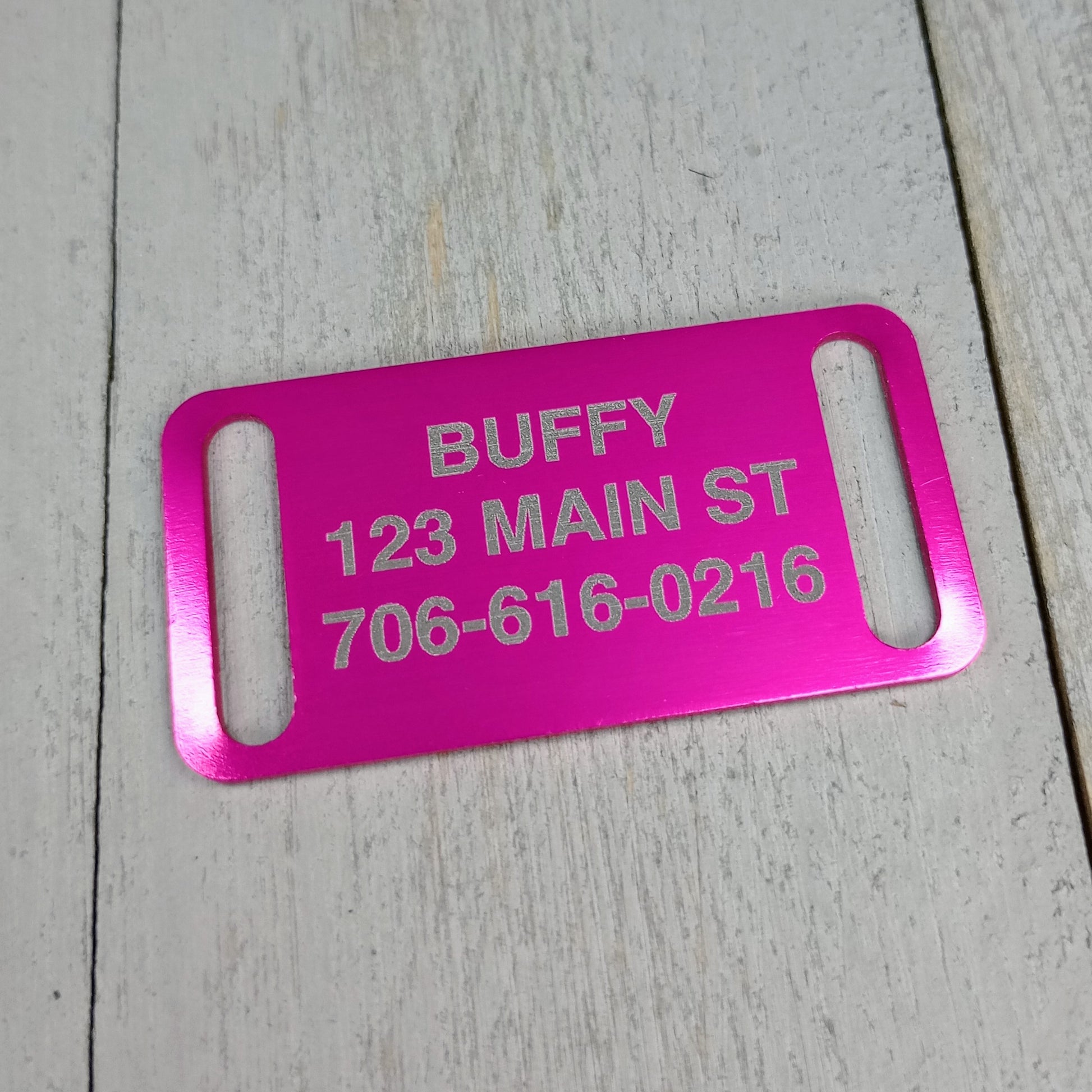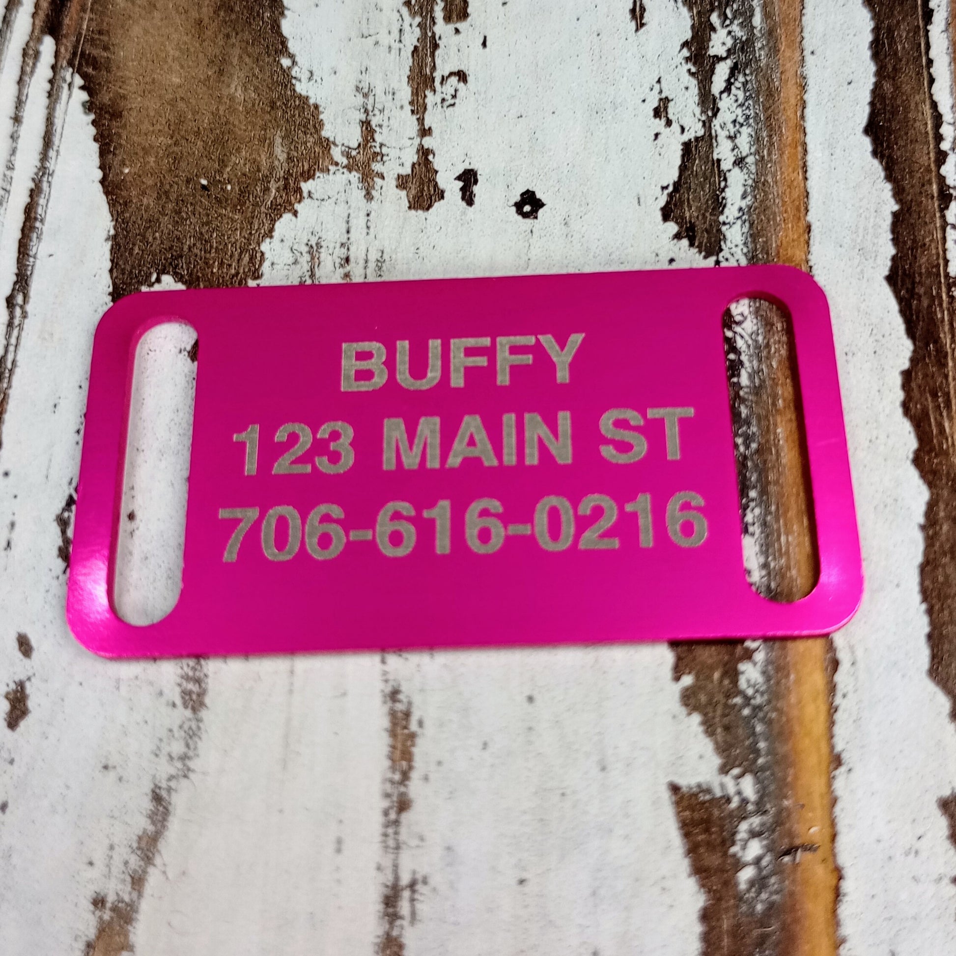 This Dark Pink Slide-On Pet Tag is anodized aluminum that allows for 4 lines of text on the front. This tag will slide on a collar that is 3/4 inch wide or less.