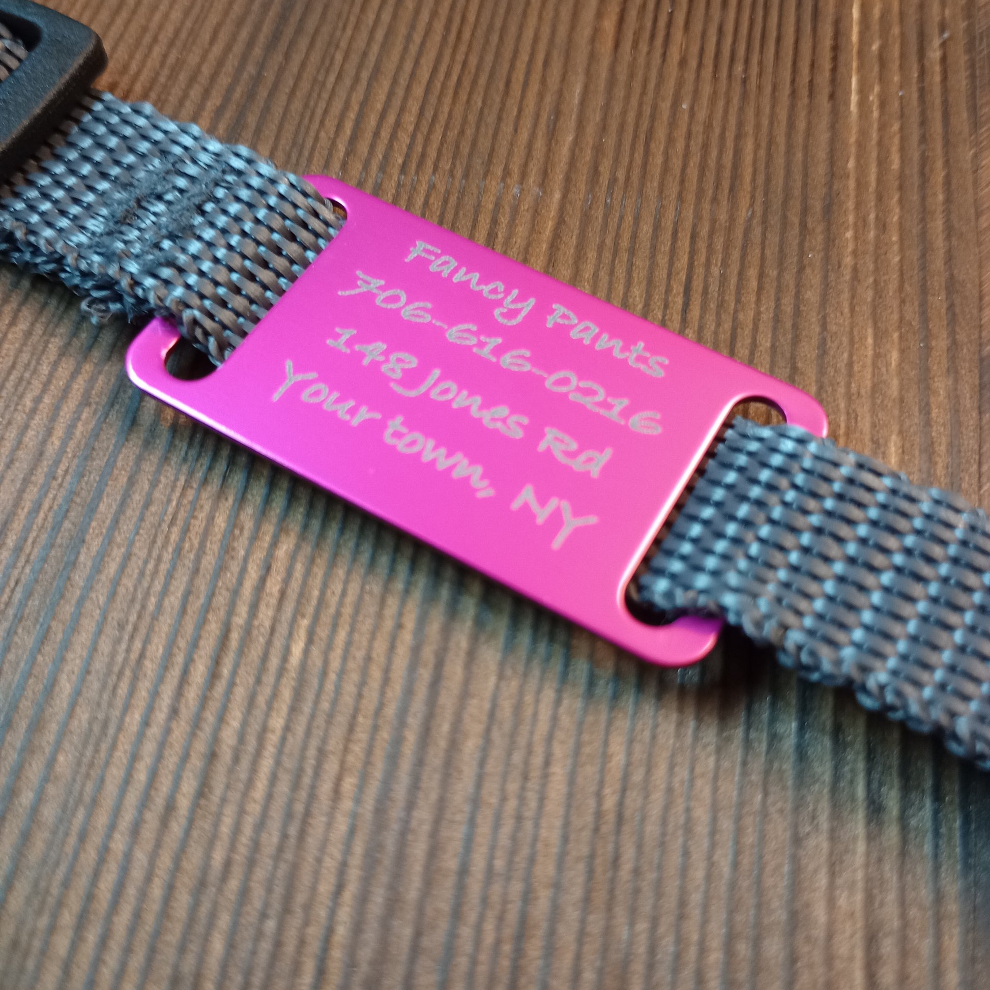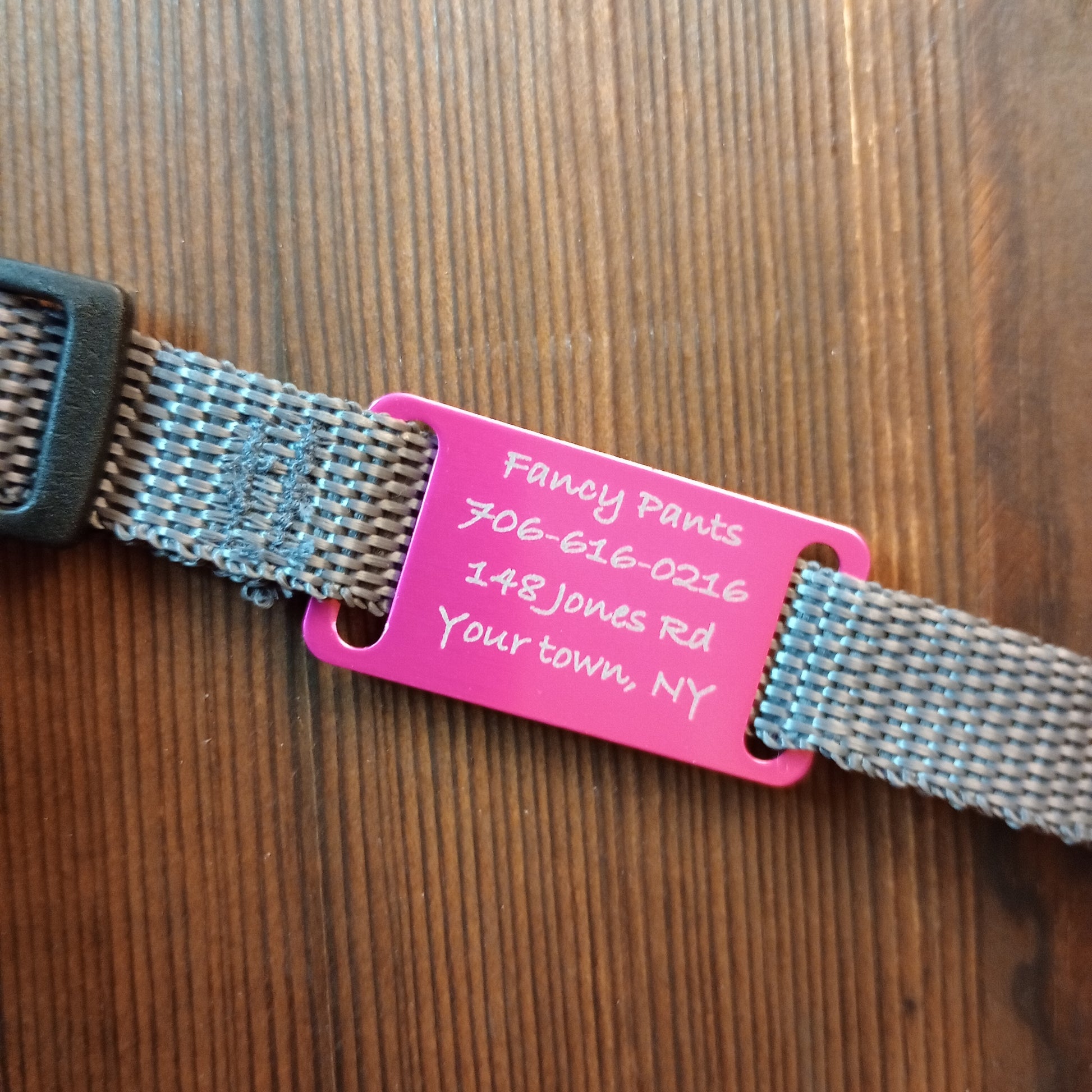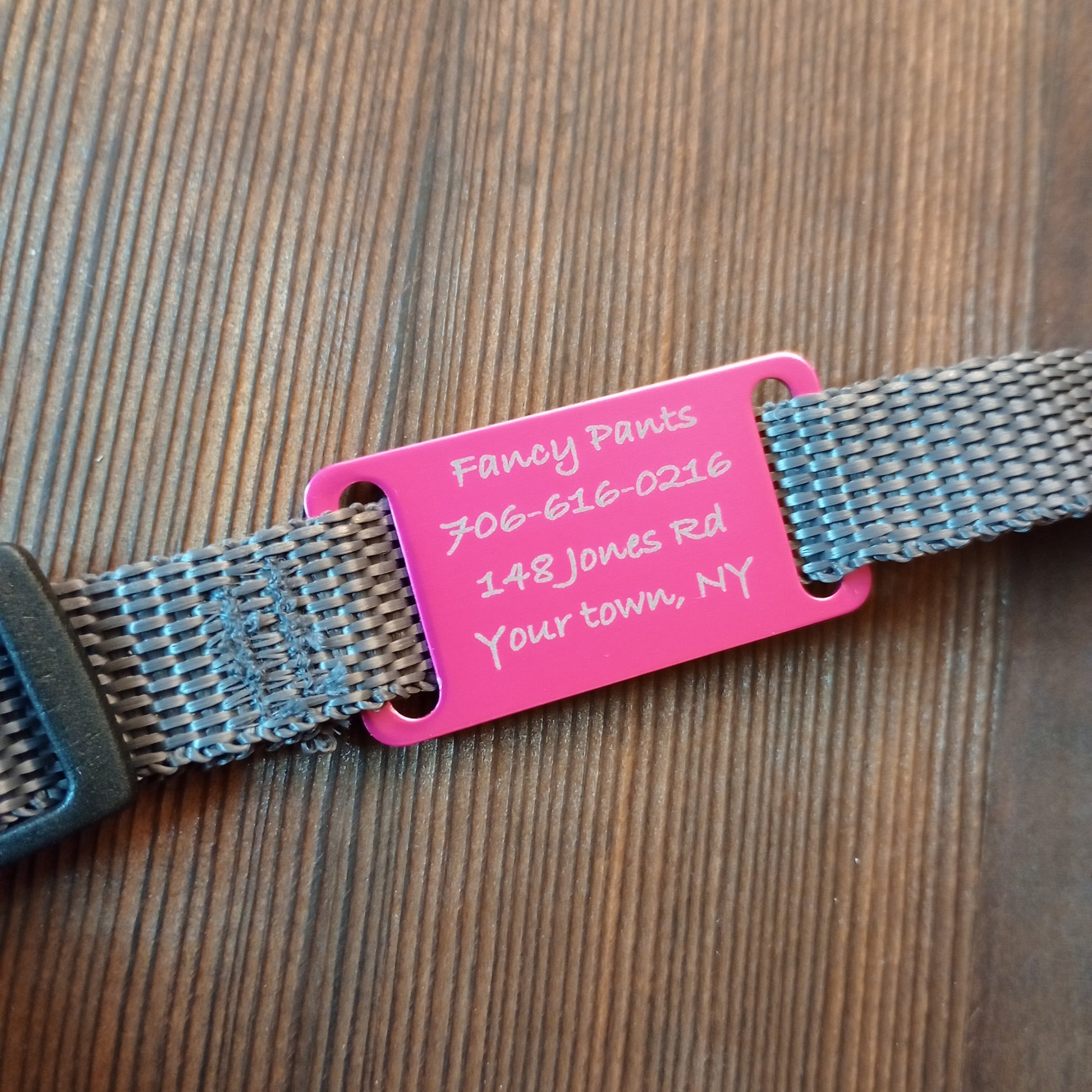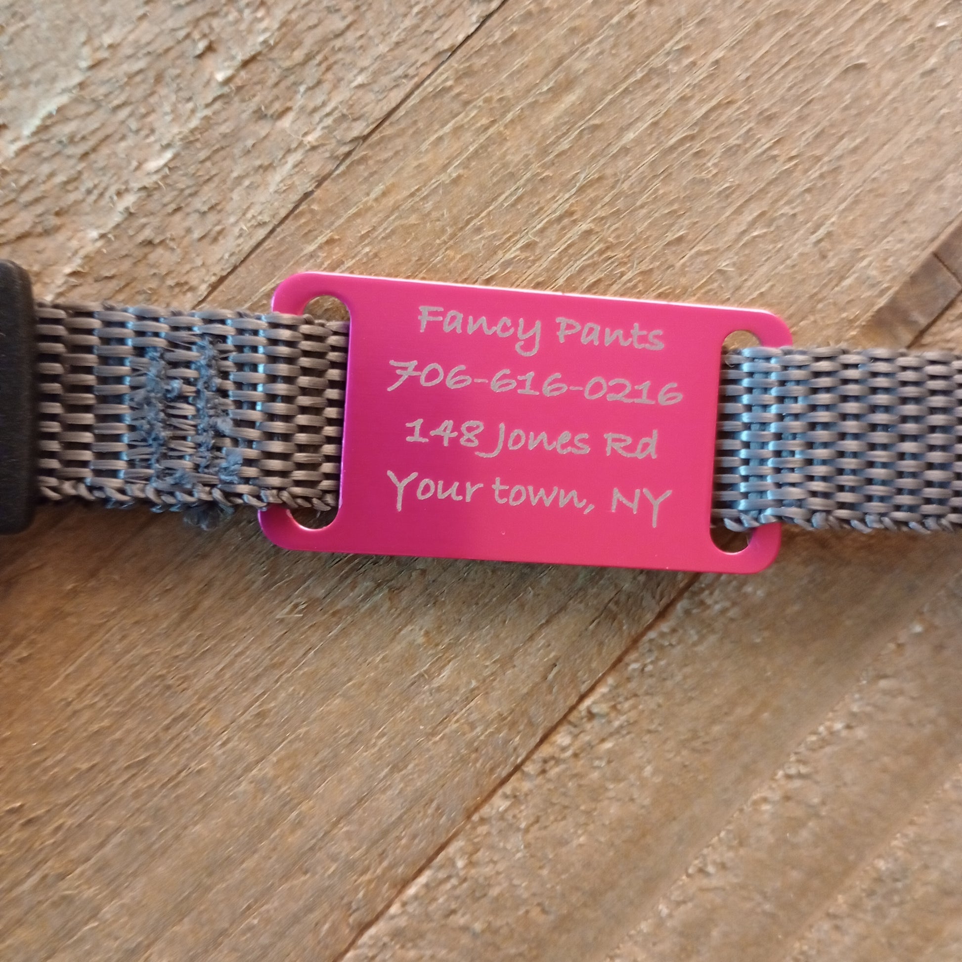 This Dark Pink Slide-On Pet Tag is anodized aluminum that allows for 4 lines of text on the front. This tag will slide on a collar that is 3/4 inch wide or less.