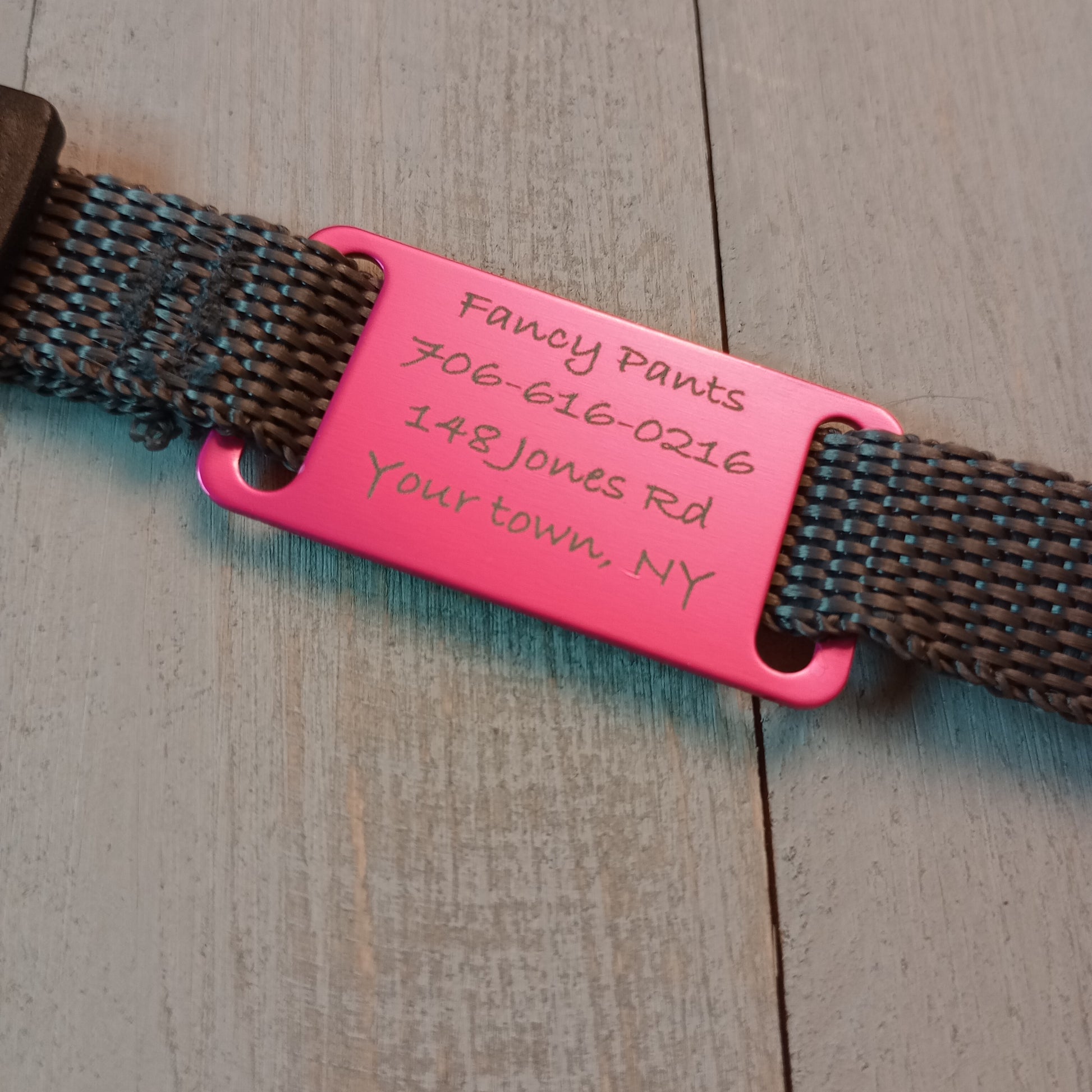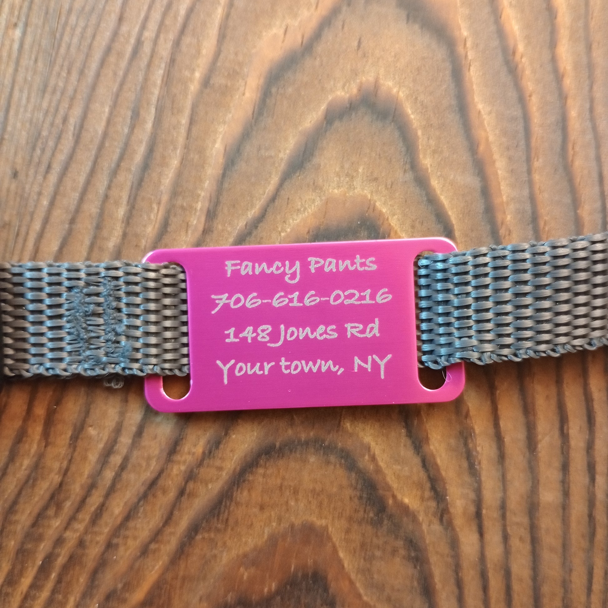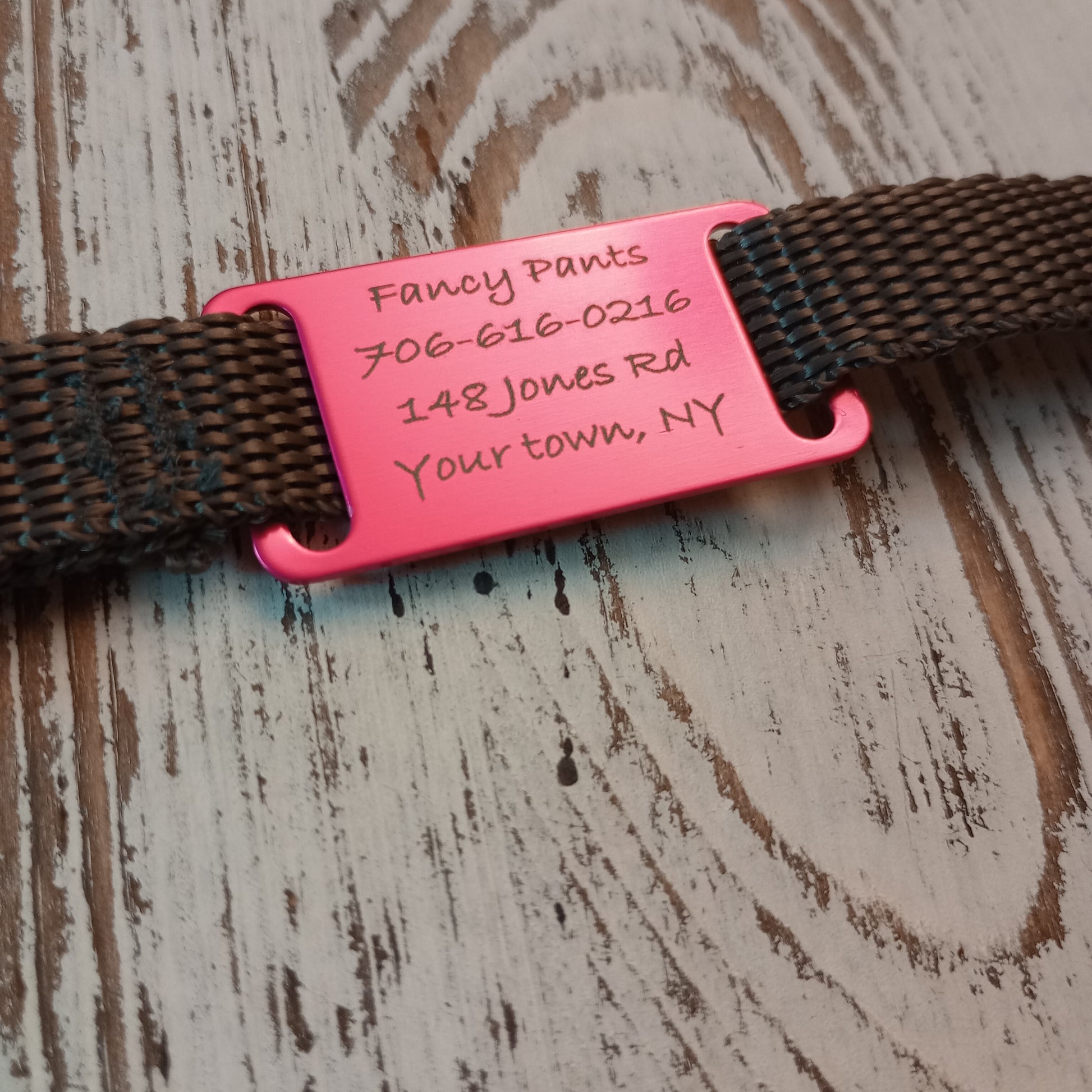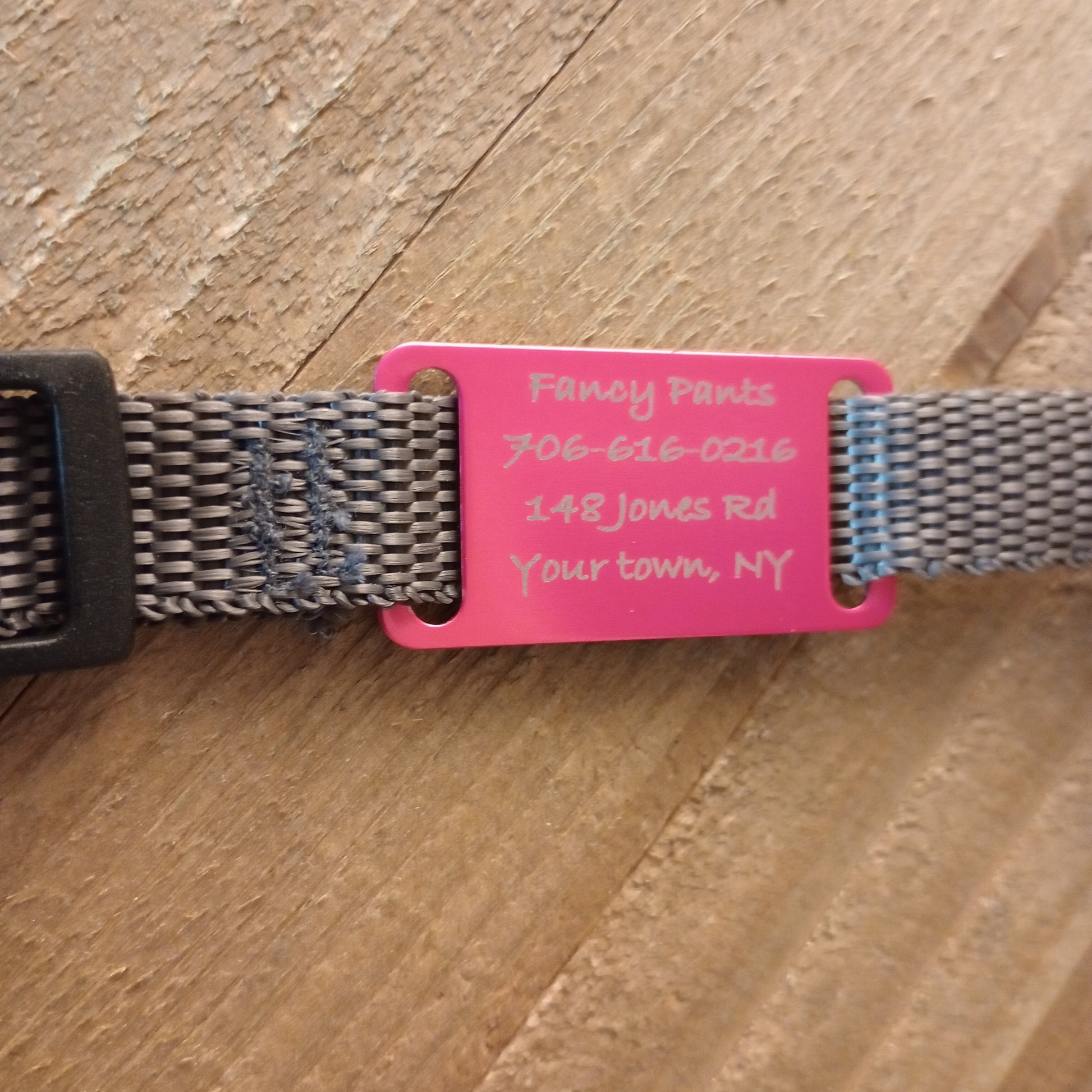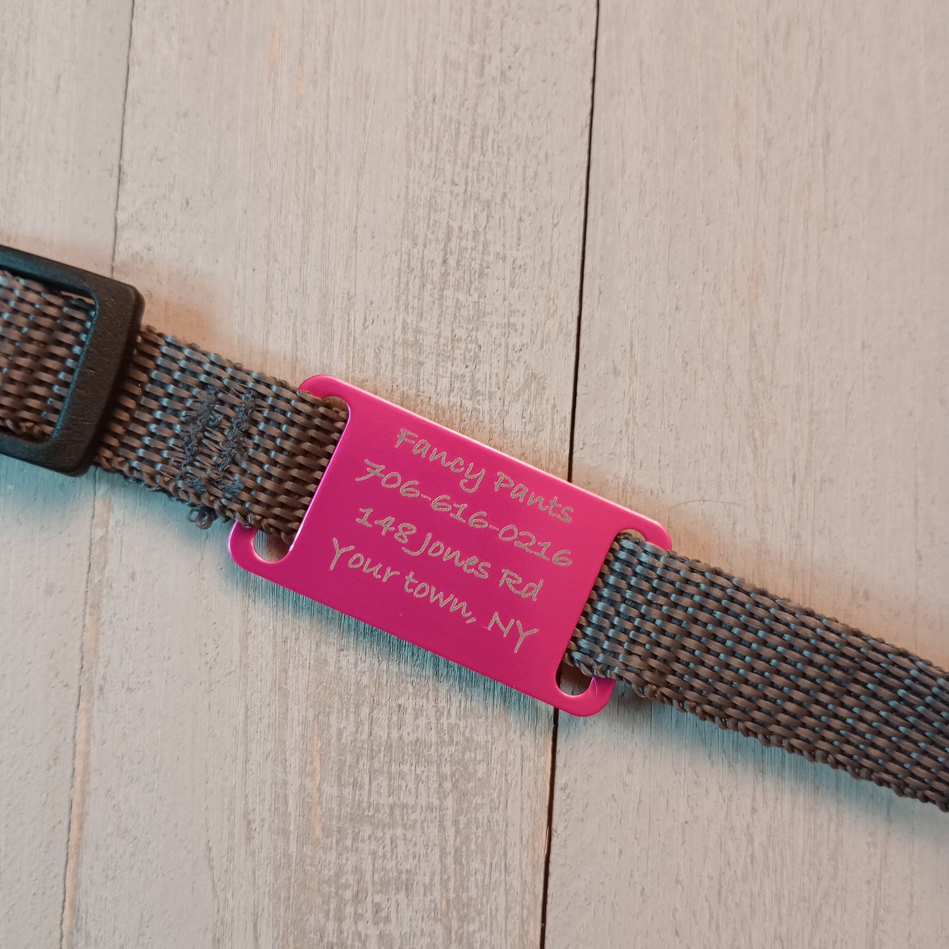 This Dark Pink Slide-On Pet Tag is anodized aluminum that allows for 4 lines of text on the front. This tag will slide on a collar that is 3/4 inch wide or less.