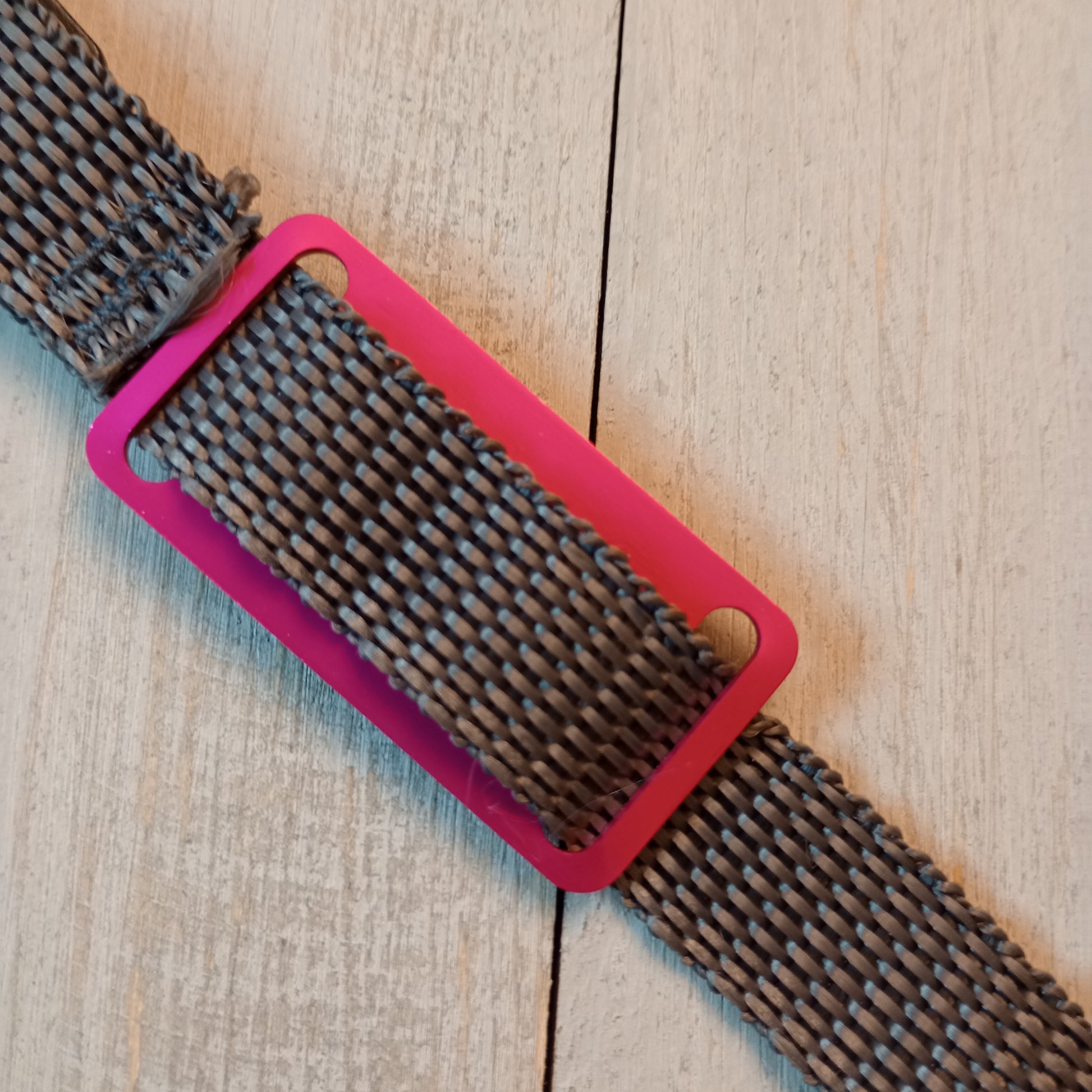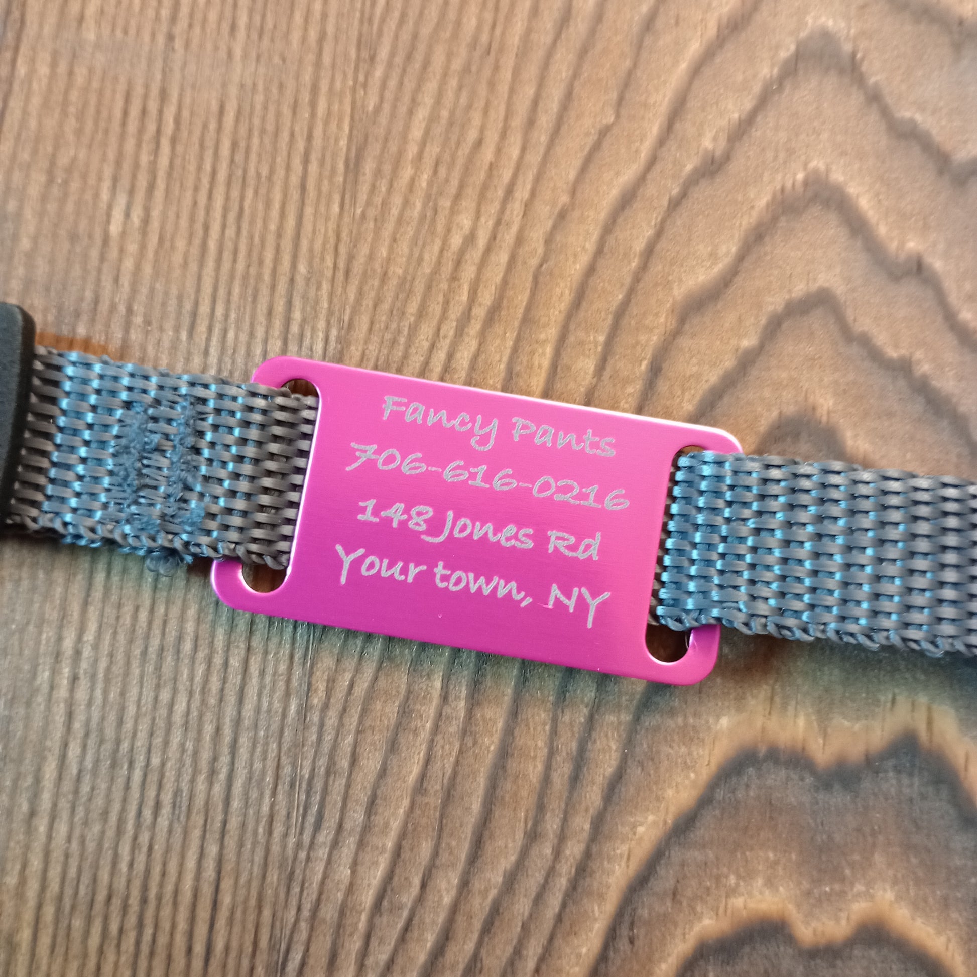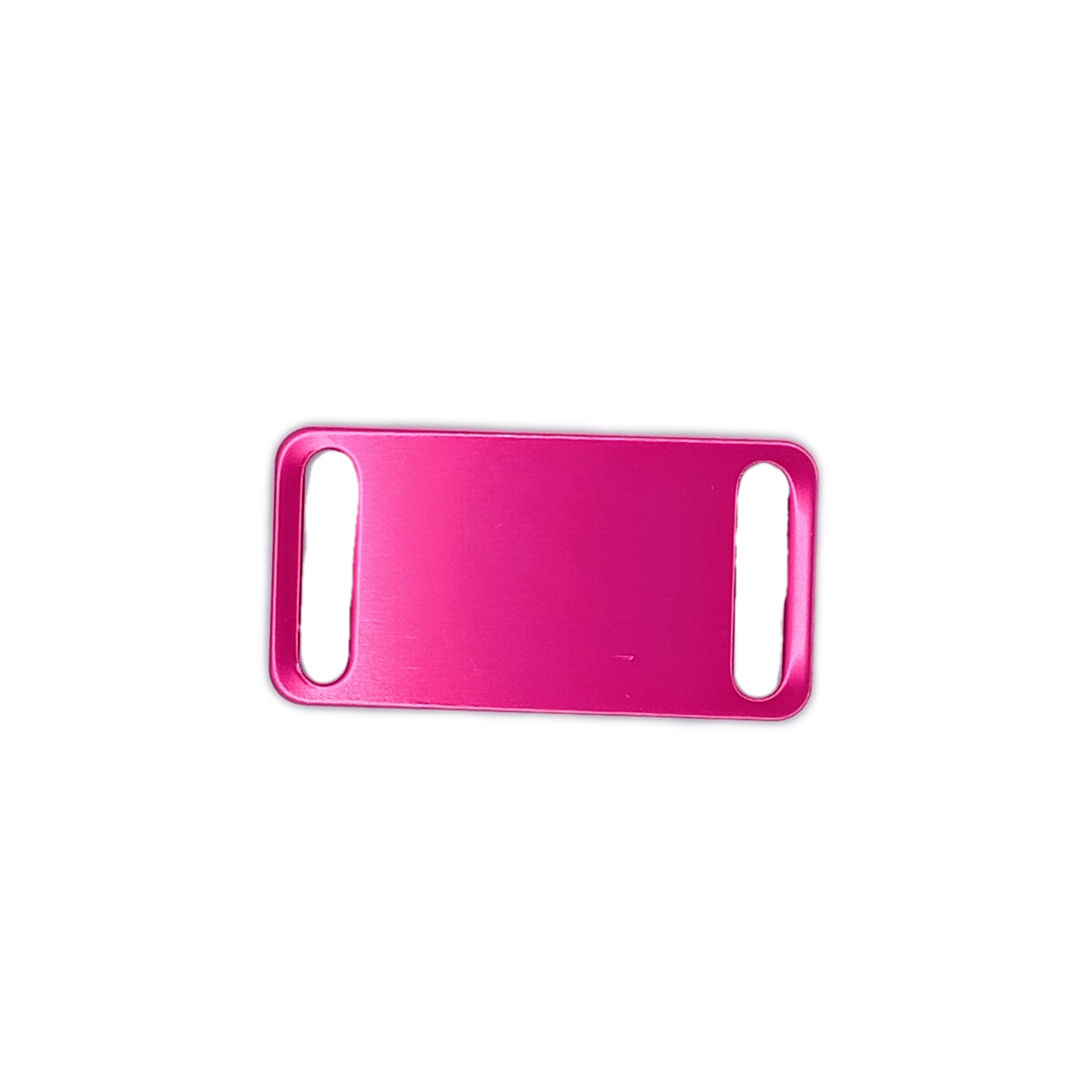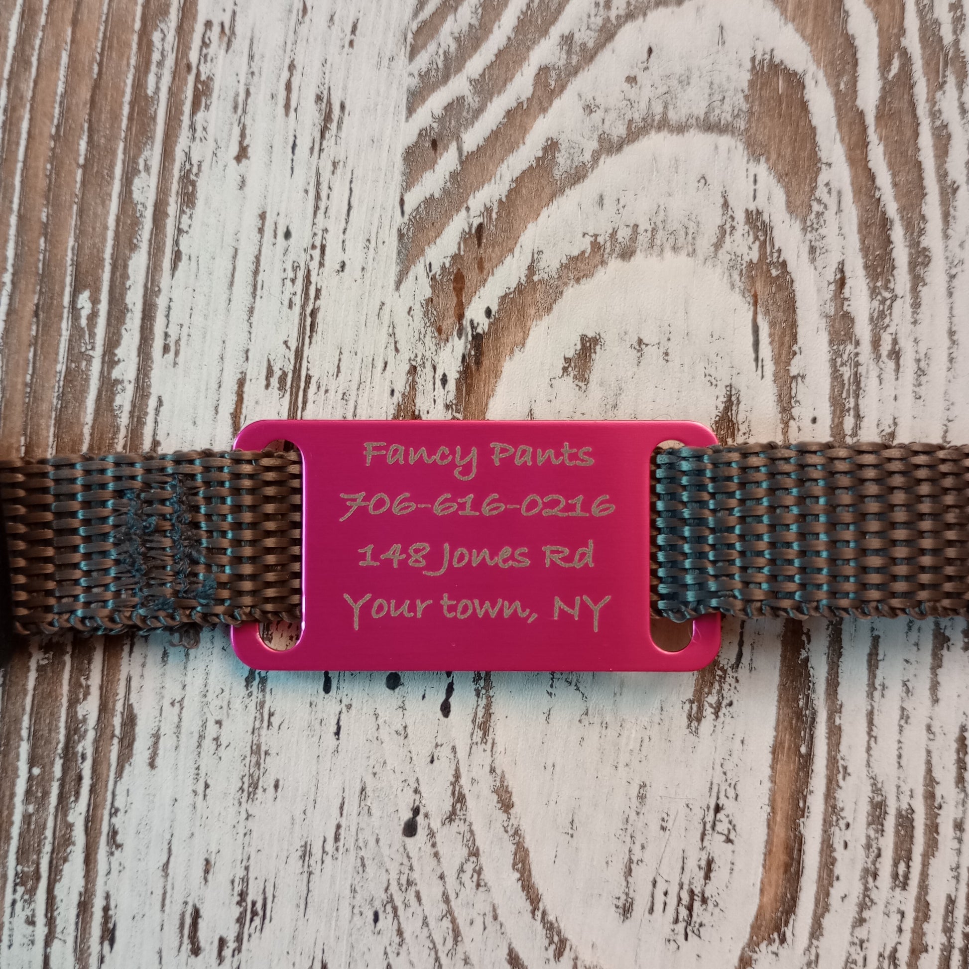 This Dark Pink Slide-On Pet Tag is anodized aluminum that allows for 4 lines of text on the front. This tag will slide on a collar that is 3/4 inch wide or less.