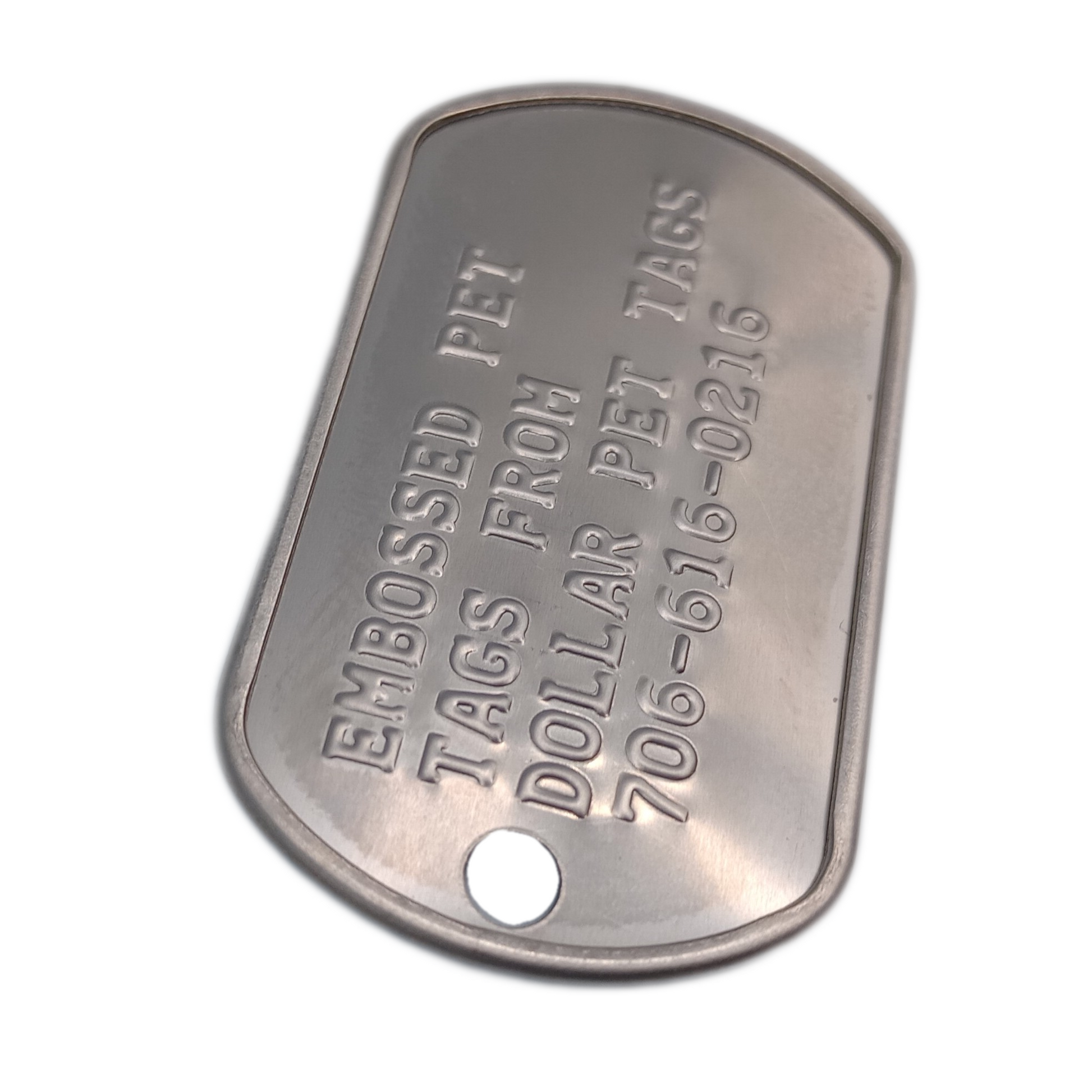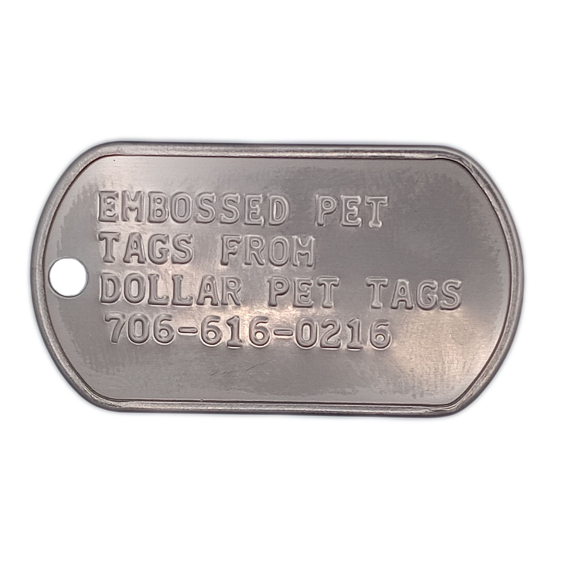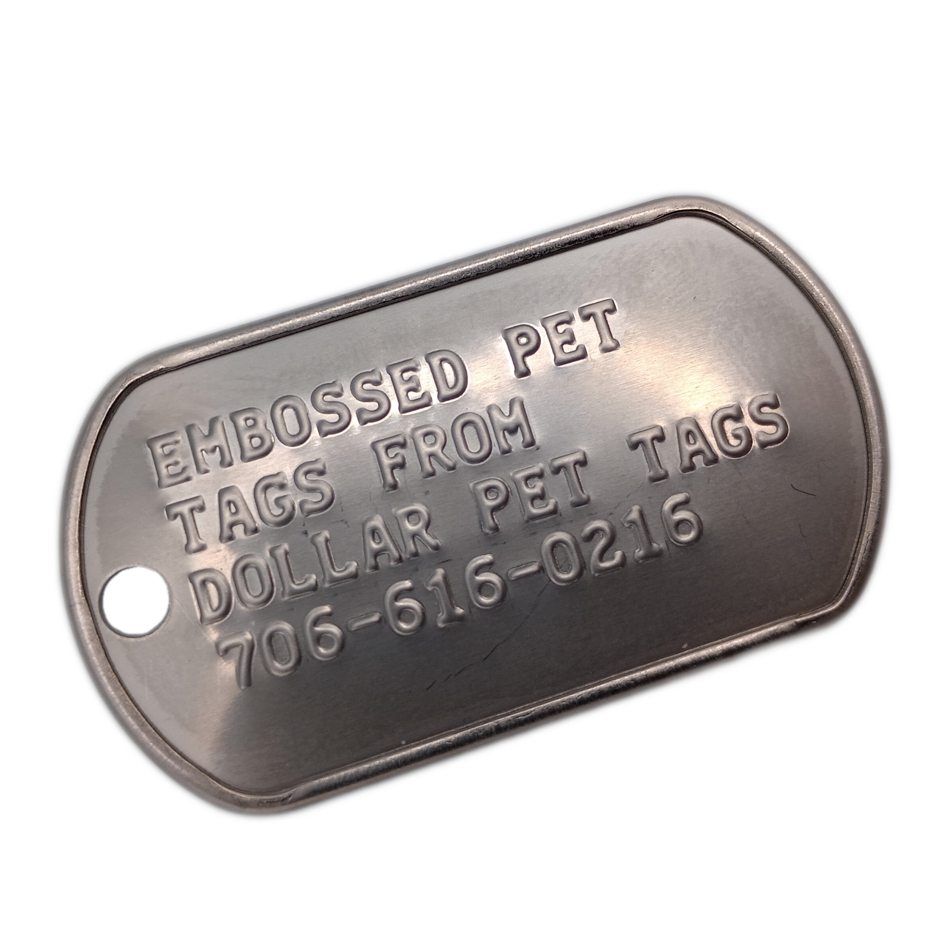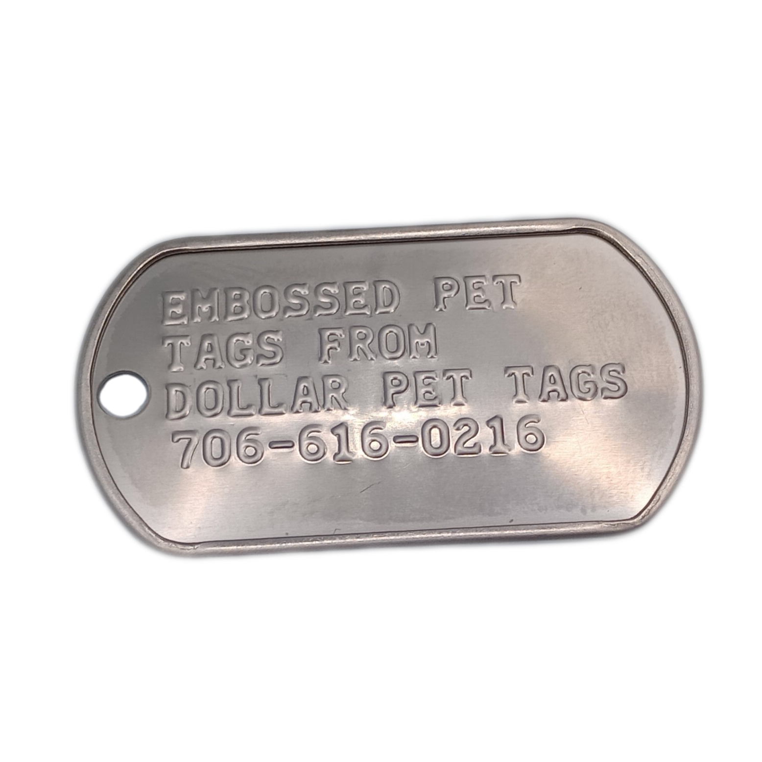 This is a standard sized stainless steel Military Identification Tag (Dog Tag) made to U.S. Military Specs. The dog tag is embossed with up to 5 lines of text. If you are looking for a tough pet tag, these have lasted more than 20 plus years for U.S. Military Personnel and are still readable.