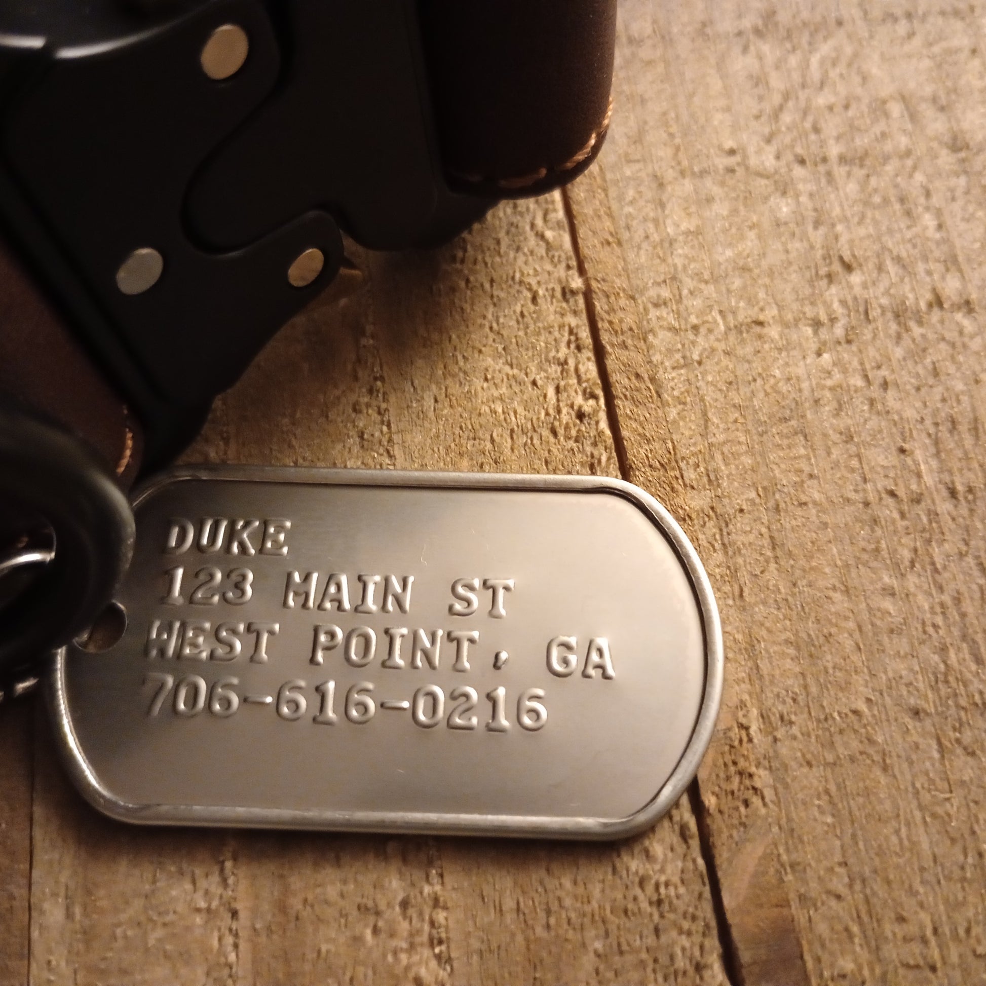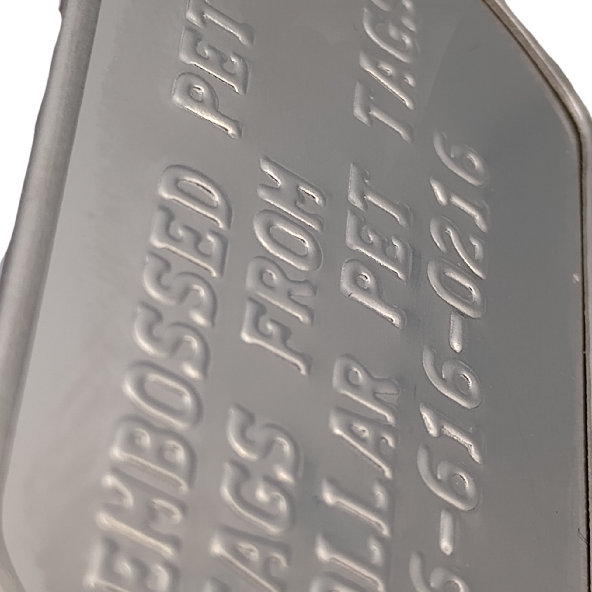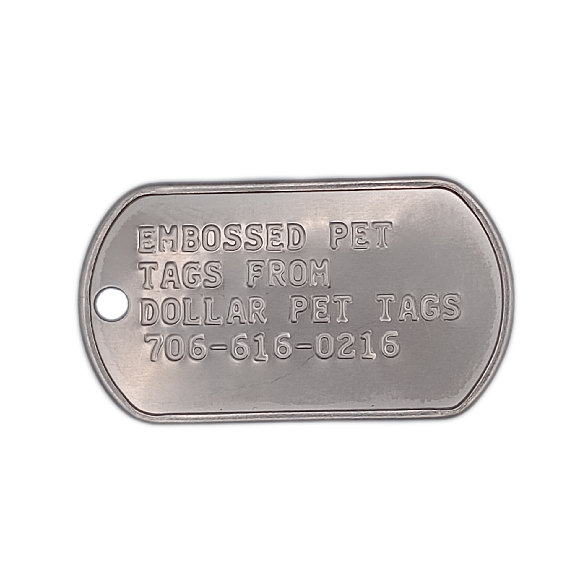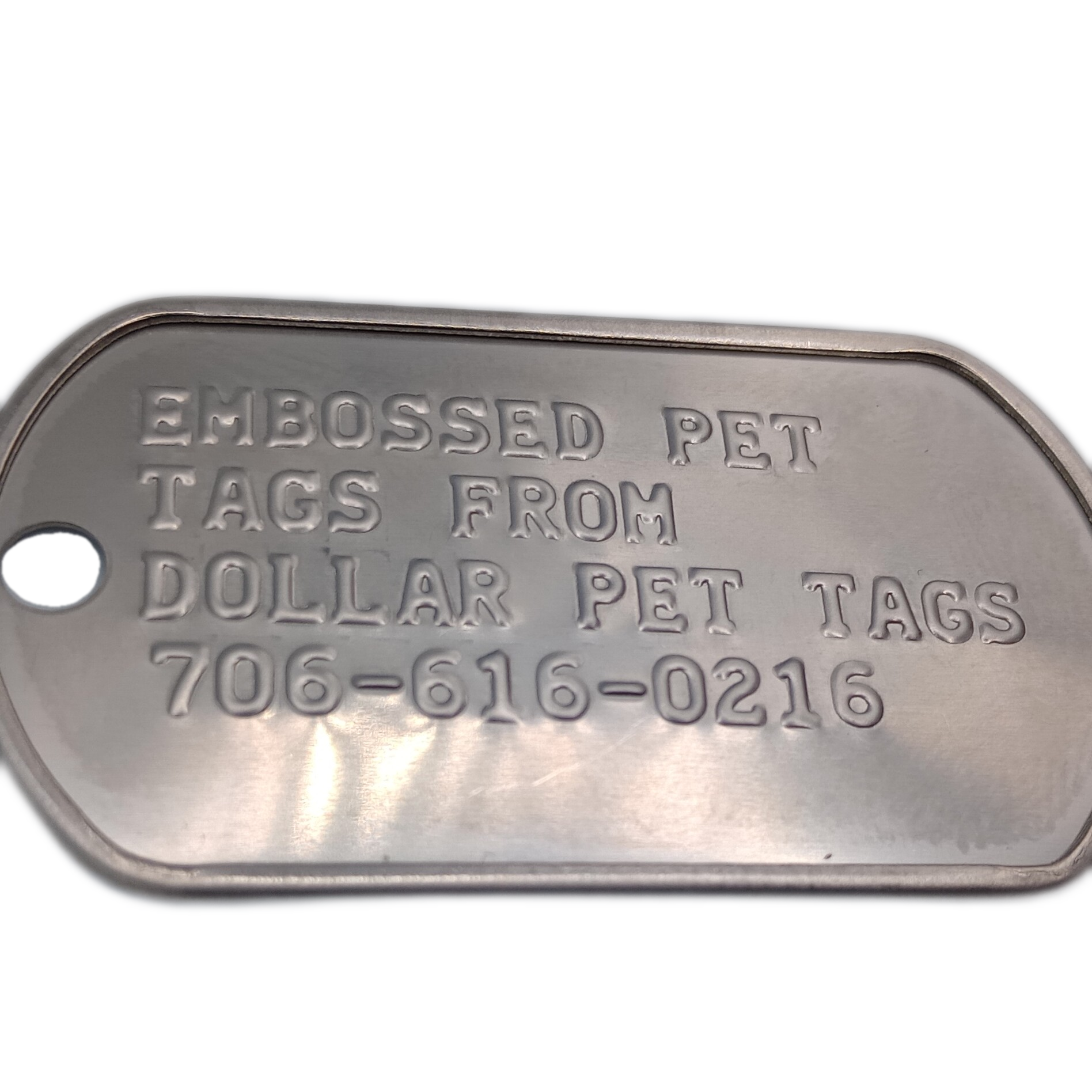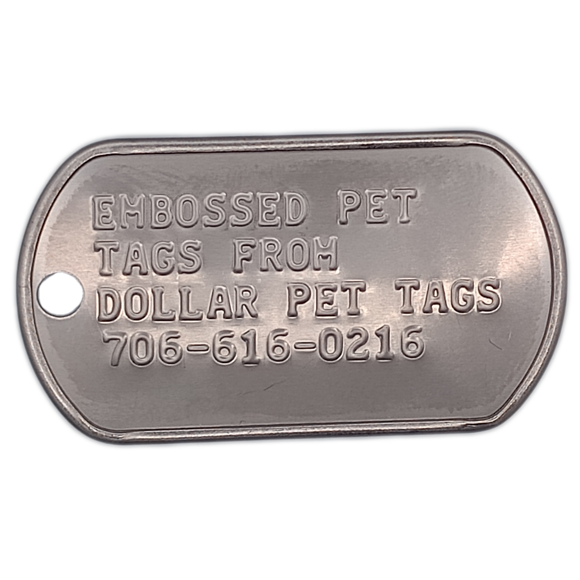 This is a standard sized stainless steel Military Identification Tag (Dog Tag) made to U.S. Military Specs. The dog tag is embossed with up to 5 lines of text. If you are looking for a tough pet tag, these have lasted more than 20 plus years for U.S. Military Personnel and are still readable.
